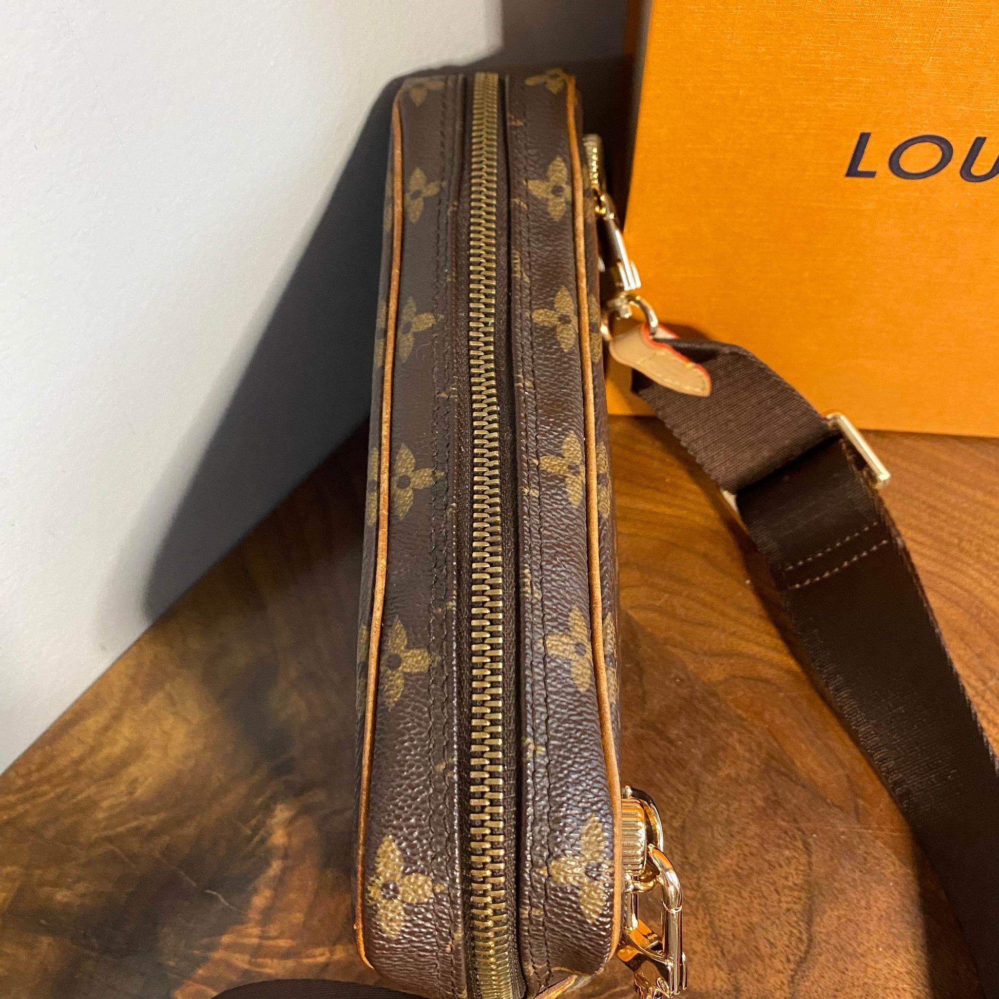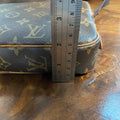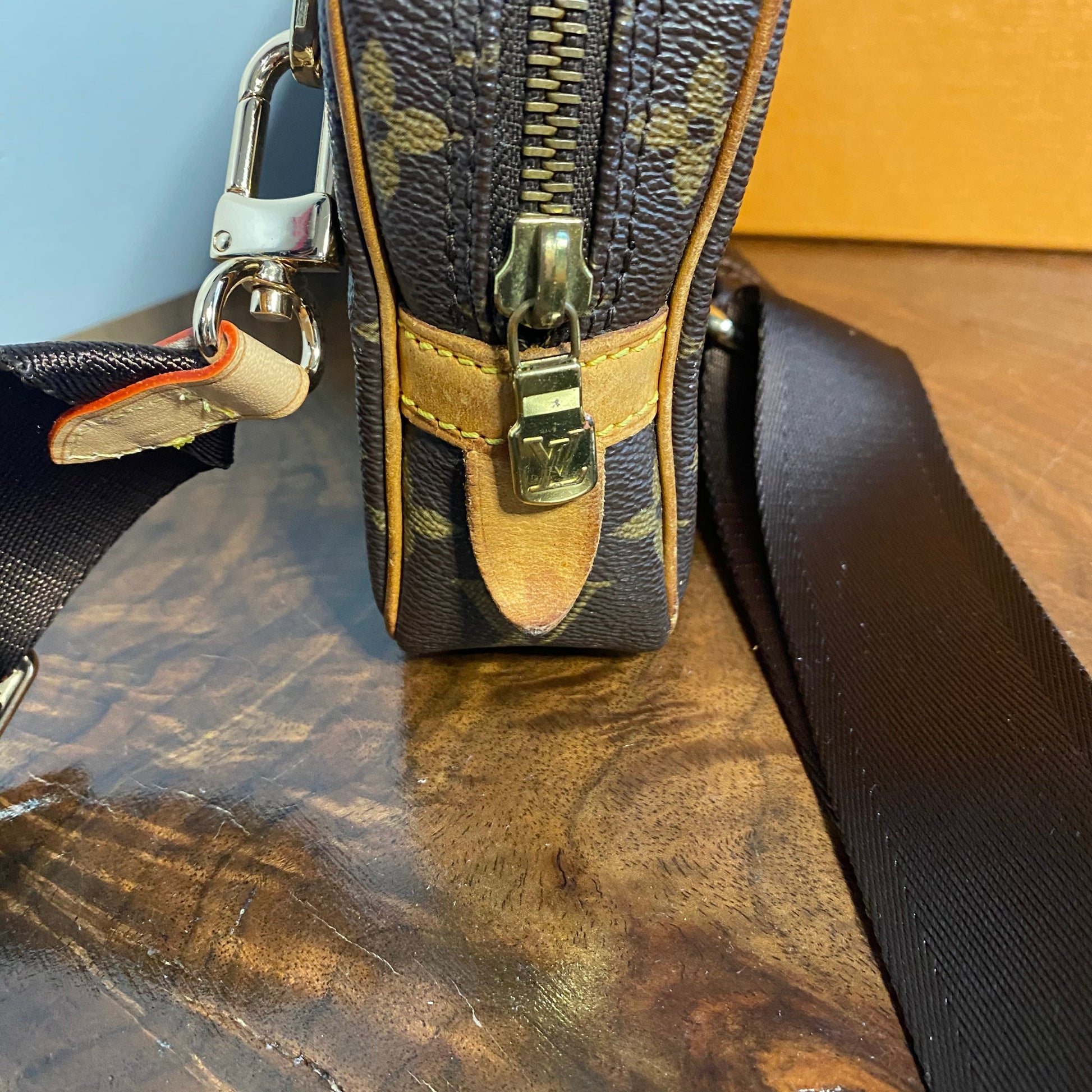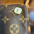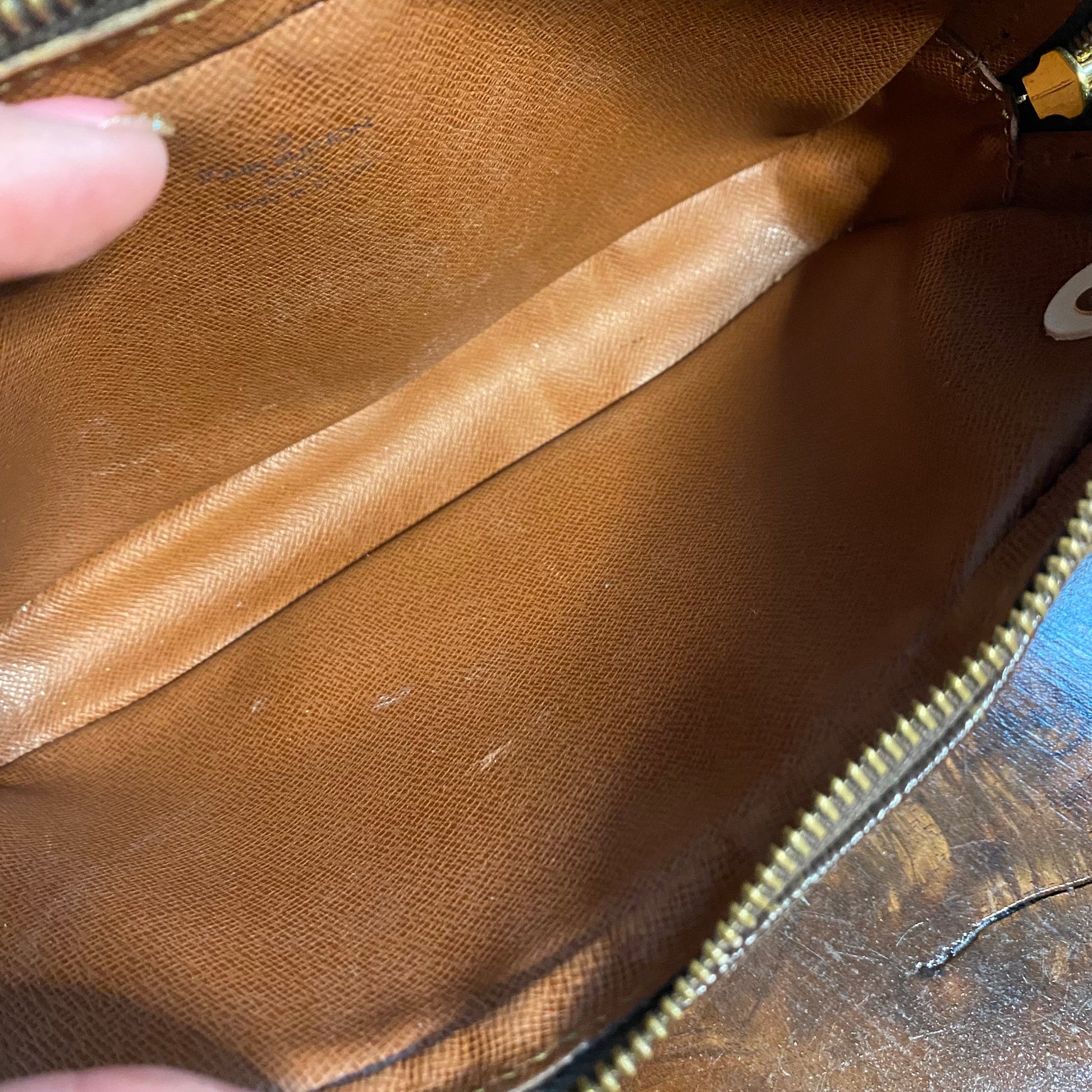 This bag's Monogram is clean and is in good shape. This bag typically has the strap holders on either side of the bag, but the strap was missing, so I removed the holders, leaving tiny sew holes (see pics!!). On the front I've covered that up with aPrestige Totes button. The back contains the new D-rings to hold the adjustable canvas strap. The zipper has been cleaned and polished and works great. The inside is clean leather. I love how she turned out!!!