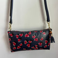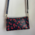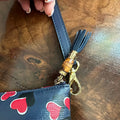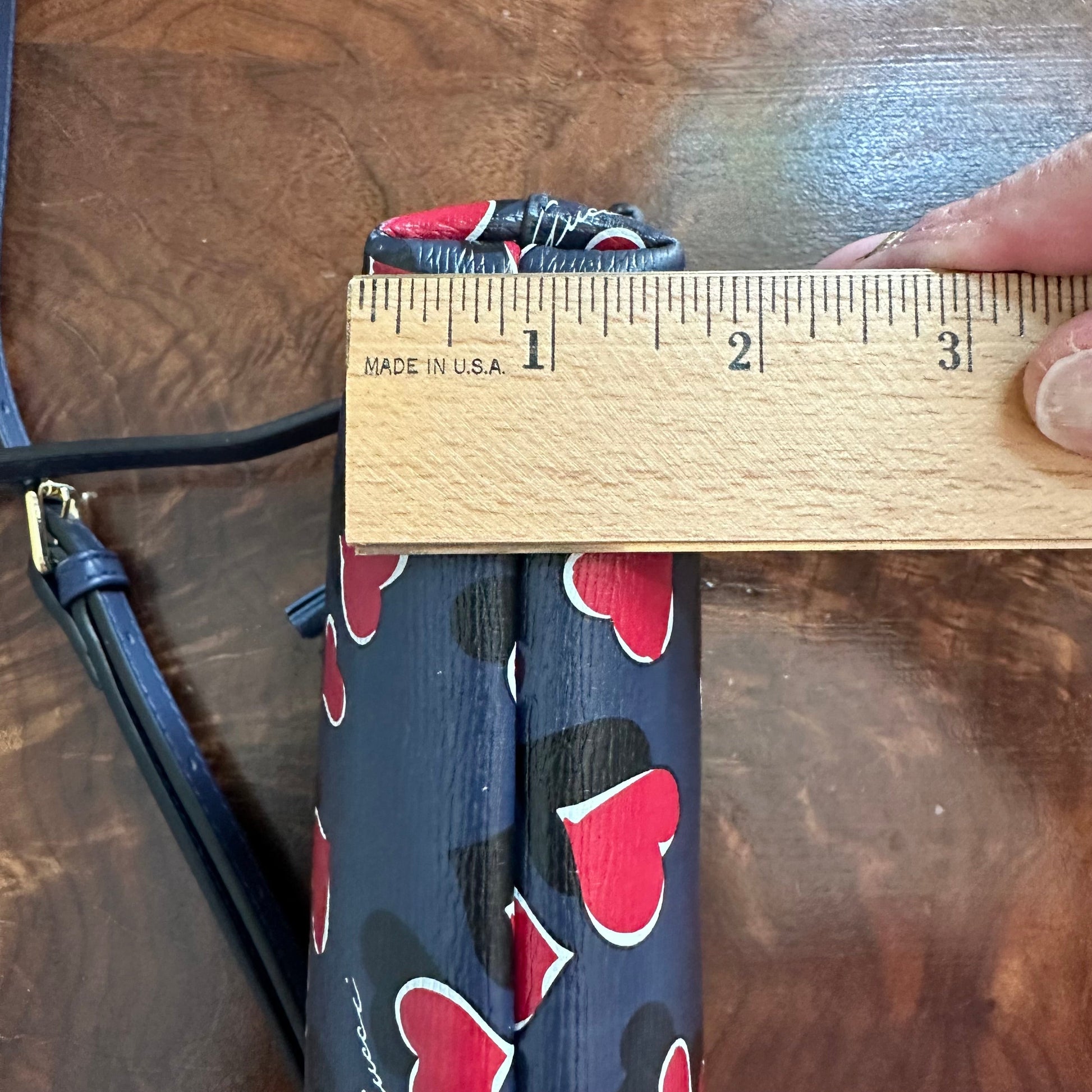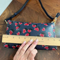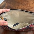 The interior has been cleaned, however there are some marks inside (please see pics). I've added gold D-rings to the back side of this clutch to hold the navy leather adjustable strap. She also looks good with a red strap, so if you'd like me to switch it out, I certainly can! Or if you want both, I can invoice you after purchase for $30. She's a decent size and comes in at W9 x H5.3 x D1.5 inches, so definitely room for your phone, keys, lipstick and a small wallet or card case!