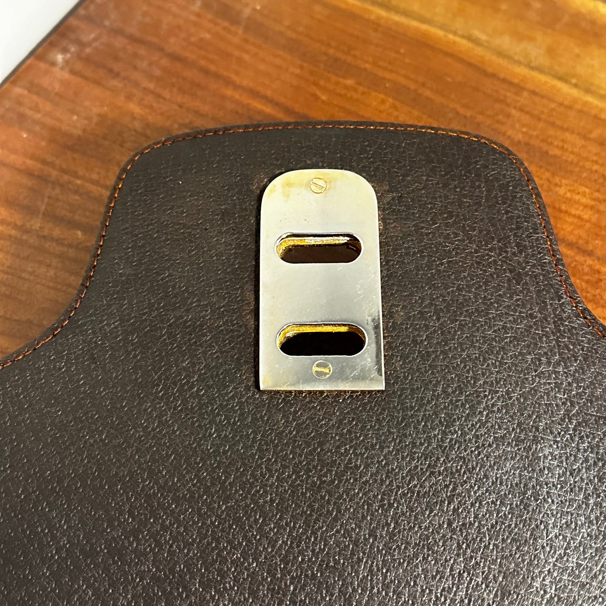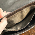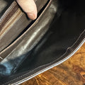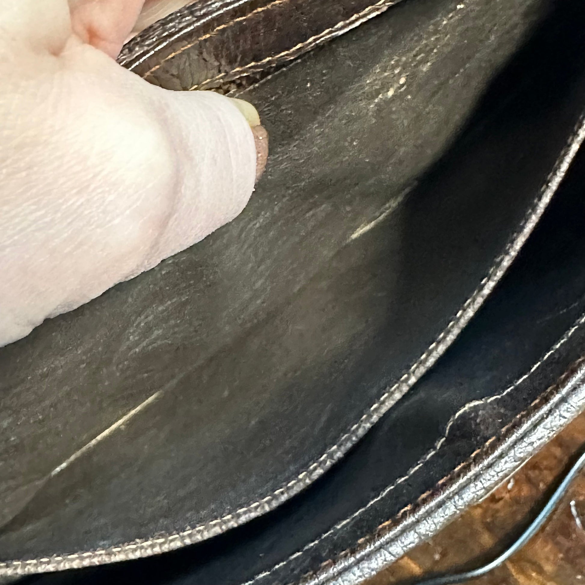 The bag opens and closes by sliding the metal insert into (or out of) the two lock tabs. The hardware on the bag has all been polished. The interior is leather and is clean. There's a large roomy interior with a handy pocket, in addition to a zippered pocket.