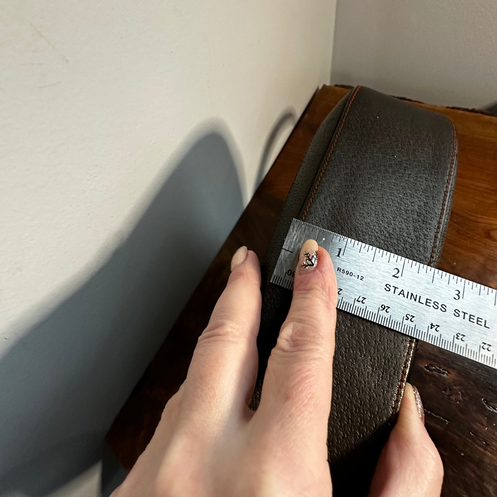 This bag just needed to be cleaned up and the leather redyed. The exterior coated canvas has very little wear and is so easy to maintain! I also recoated the edges of the strap and now she looks almost new! The drop length on the strap is 12 inches.
