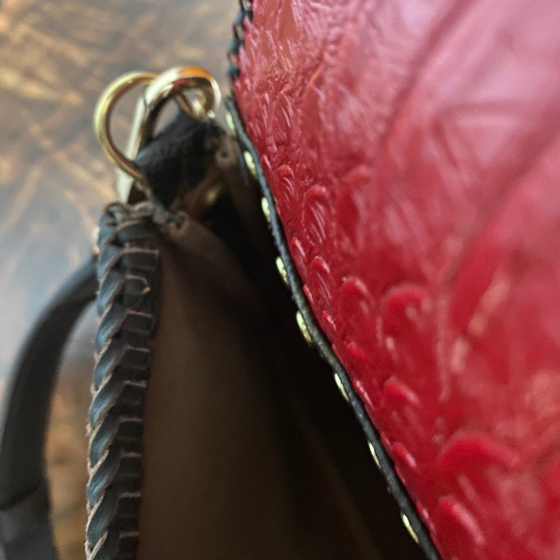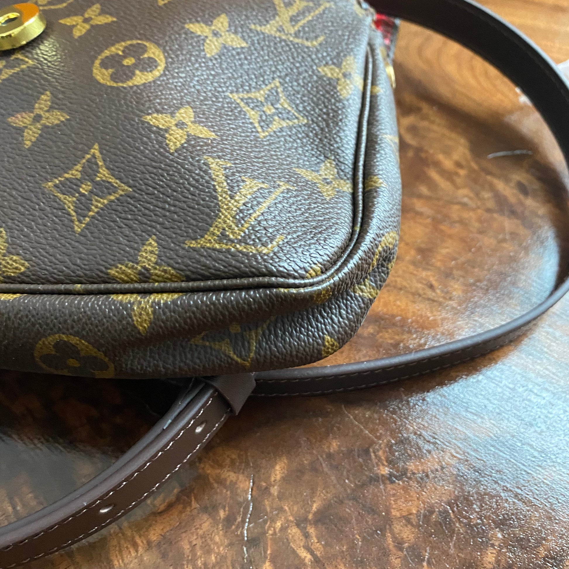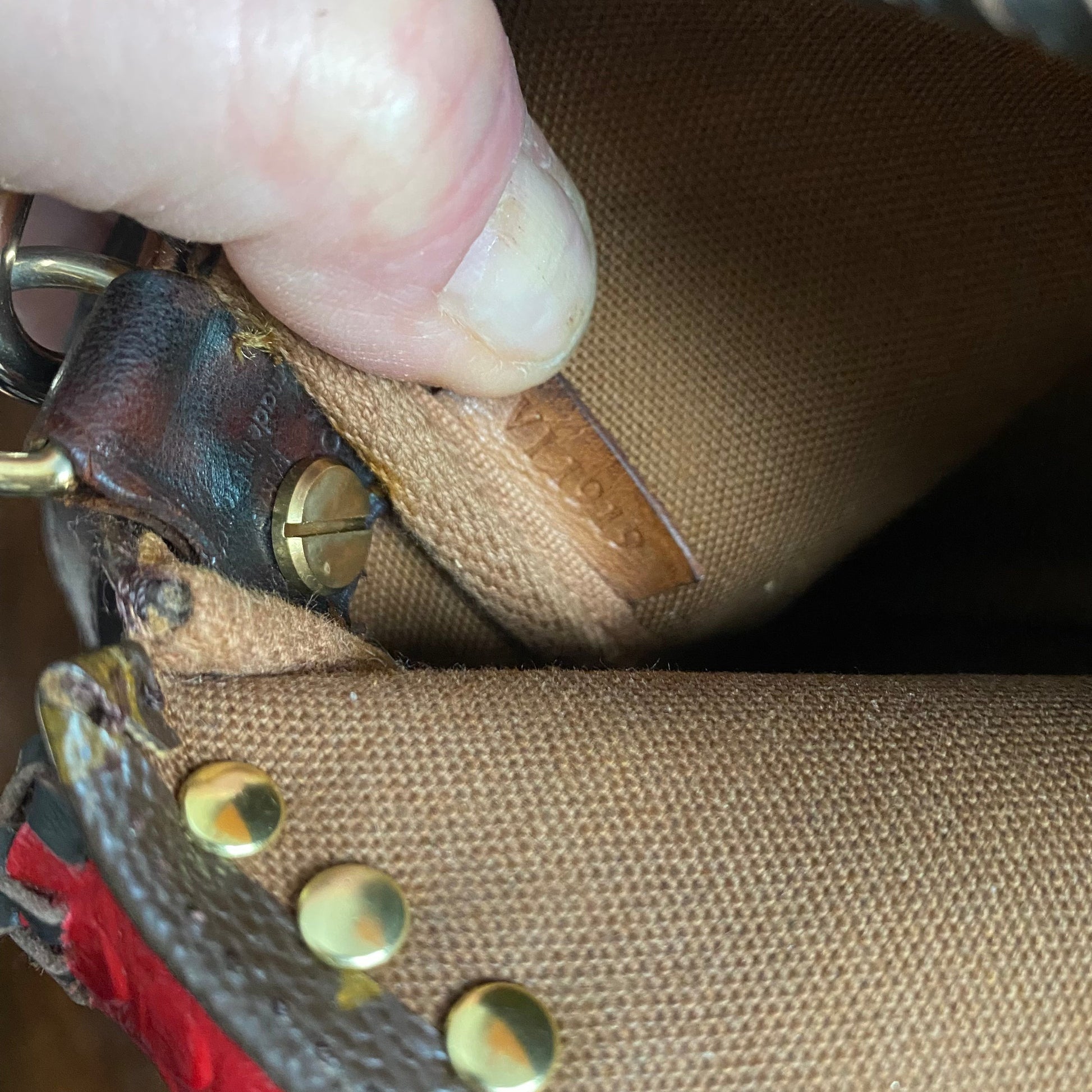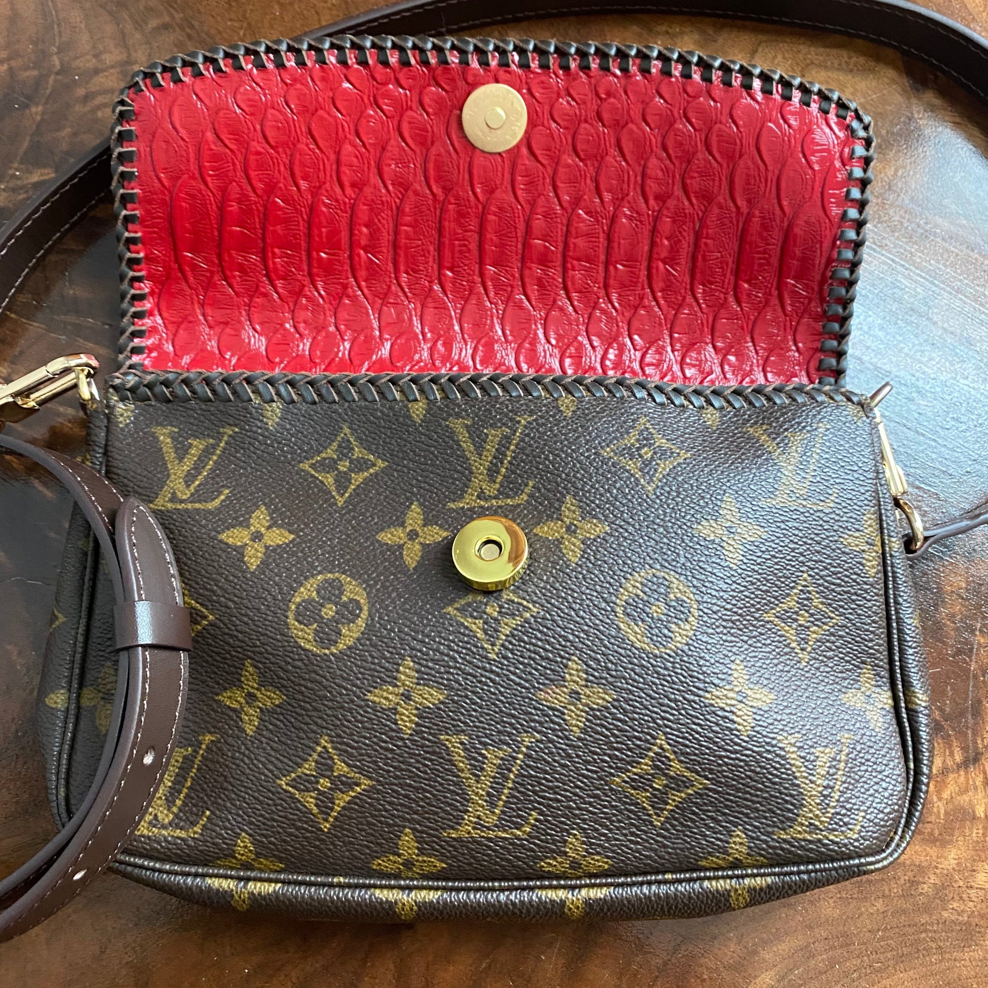 The zipper was broken on this bag, so it had to be removed. I used the end of the zipper part with the leather and D-ring and reattached it on the other side of the bag, making this into a crossbody bag. I've added a flap made out of another LV Damier Ebene bag and lined it with a fun red vegan leather to give it some substance. I also added beautiful brown leather braiding along the edge. The flap has been riveted on the bag with brass rivets, and I've added a simple magnetic snap to keep your belongings safe. To hide the magnetic snap, I've added aPrestige Totes LV button to the front, making this bag a one-of-a-kind. I love how she turned out!!! The beautiful brown leather strap is about 3/4" wide and is adjustable from 41-49". The original shorter vachetta strap is also included with bag; it has been re-dyed and conditioned to match the leather stitching.