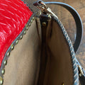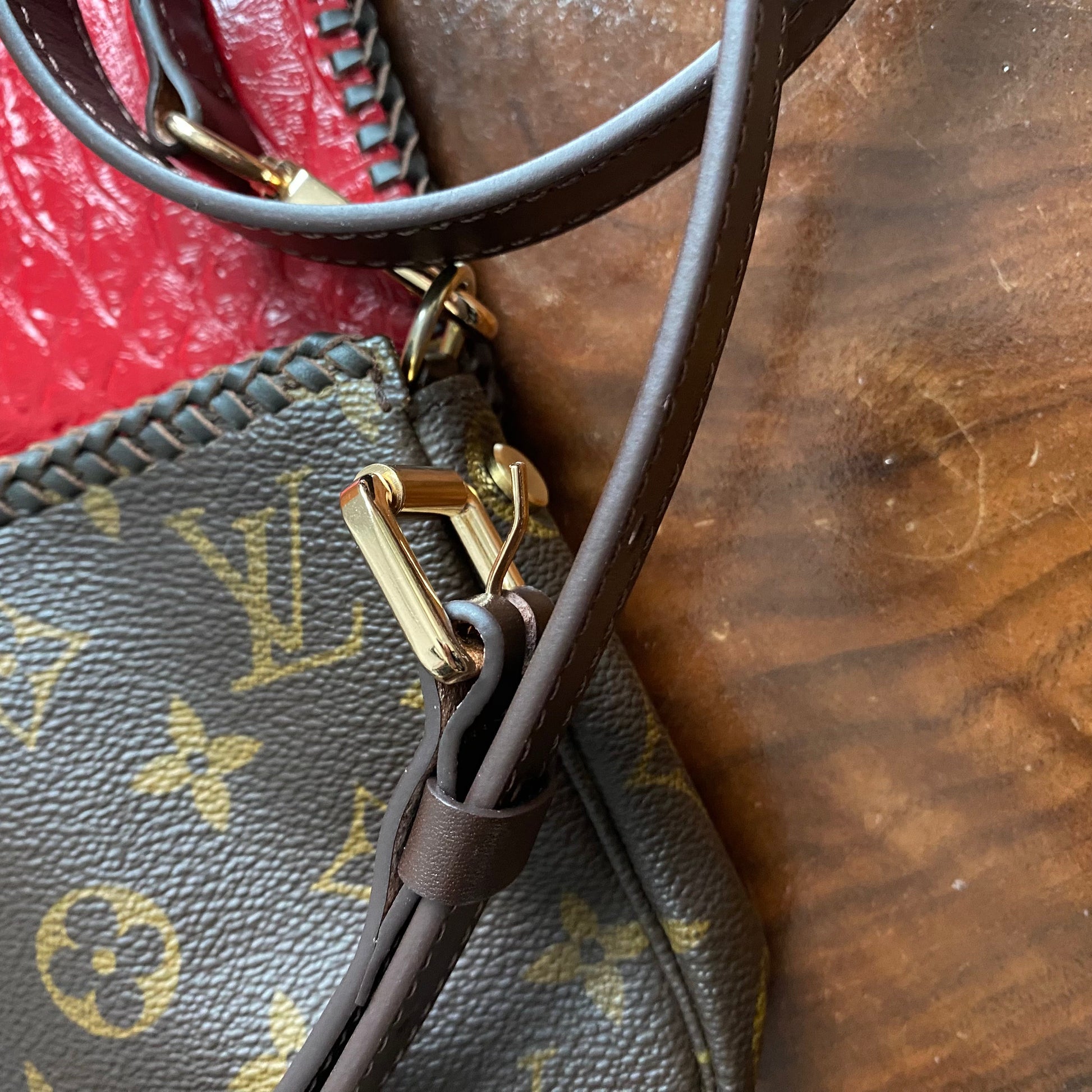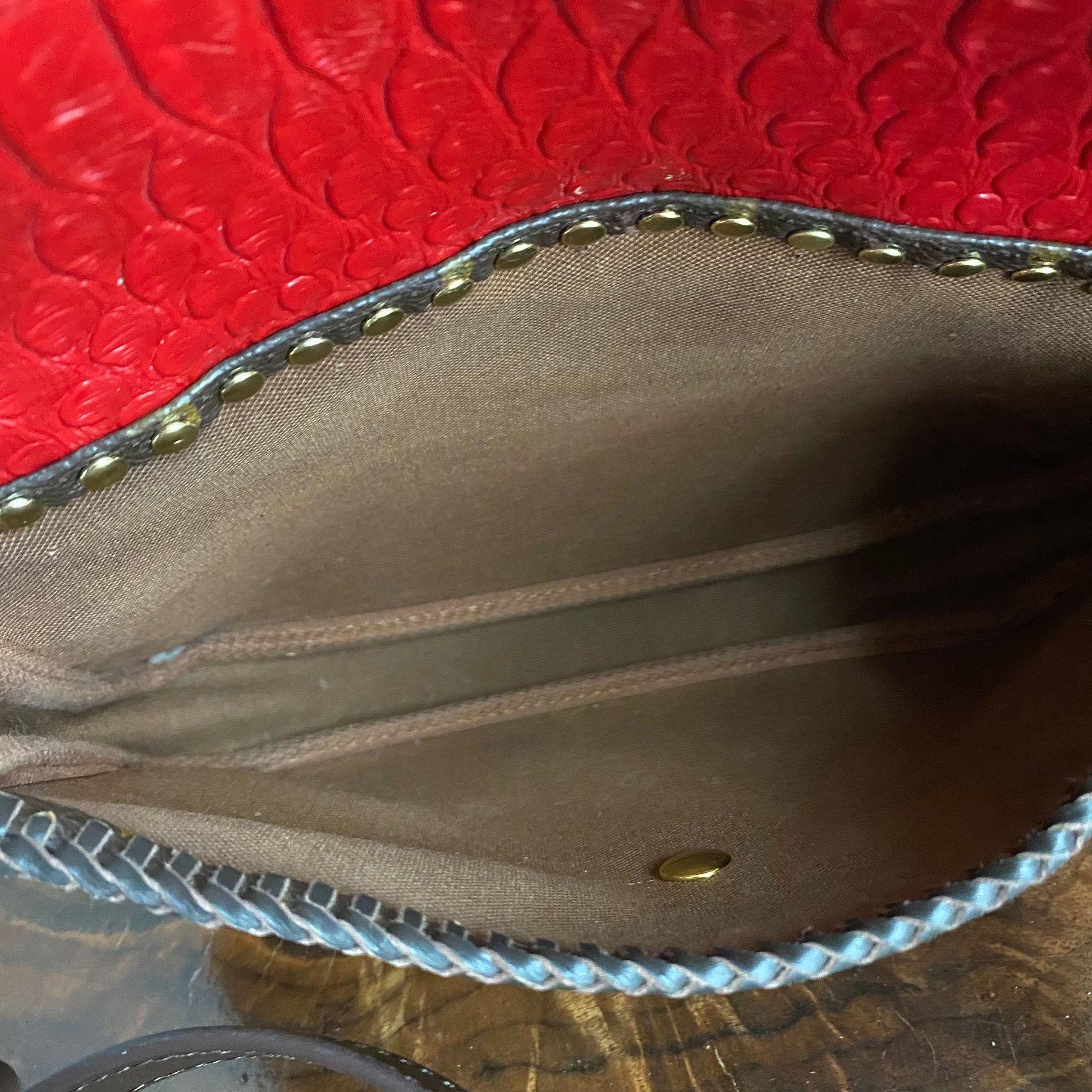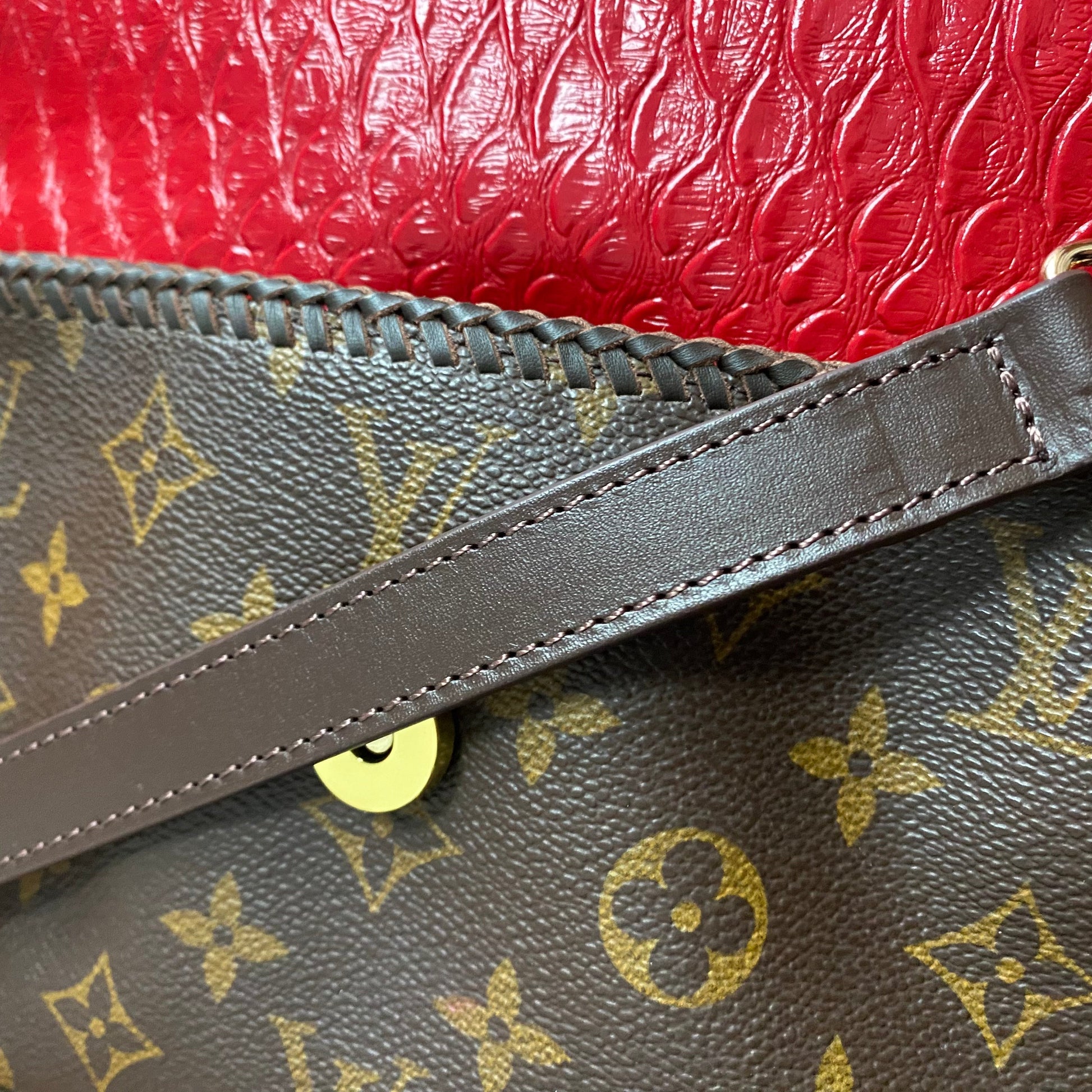 The zipper was broken on this bag, so it had to be removed. I used the end of the zipper part with the leather and D-ring and reattached it on the other side of the bag, making this into a crossbody bag. I've added a flap made out of another LV Damier Ebene bag and lined it with a fun red vegan leather to give it some substance. I also added beautiful brown leather braiding along the edge. The flap has been riveted on the bag with brass rivets, and I've added a simple magnetic snap to keep your belongings safe. To hide the magnetic snap, I've added aPrestige Totes LV button to the front, making this bag a one-of-a-kind. I love how she turned out!!! The beautiful brown leather strap is about 3/4" wide and is adjustable from 41-49". The original shorter vachetta strap is also included with bag; it has been re-dyed and conditioned to match the leather stitching.