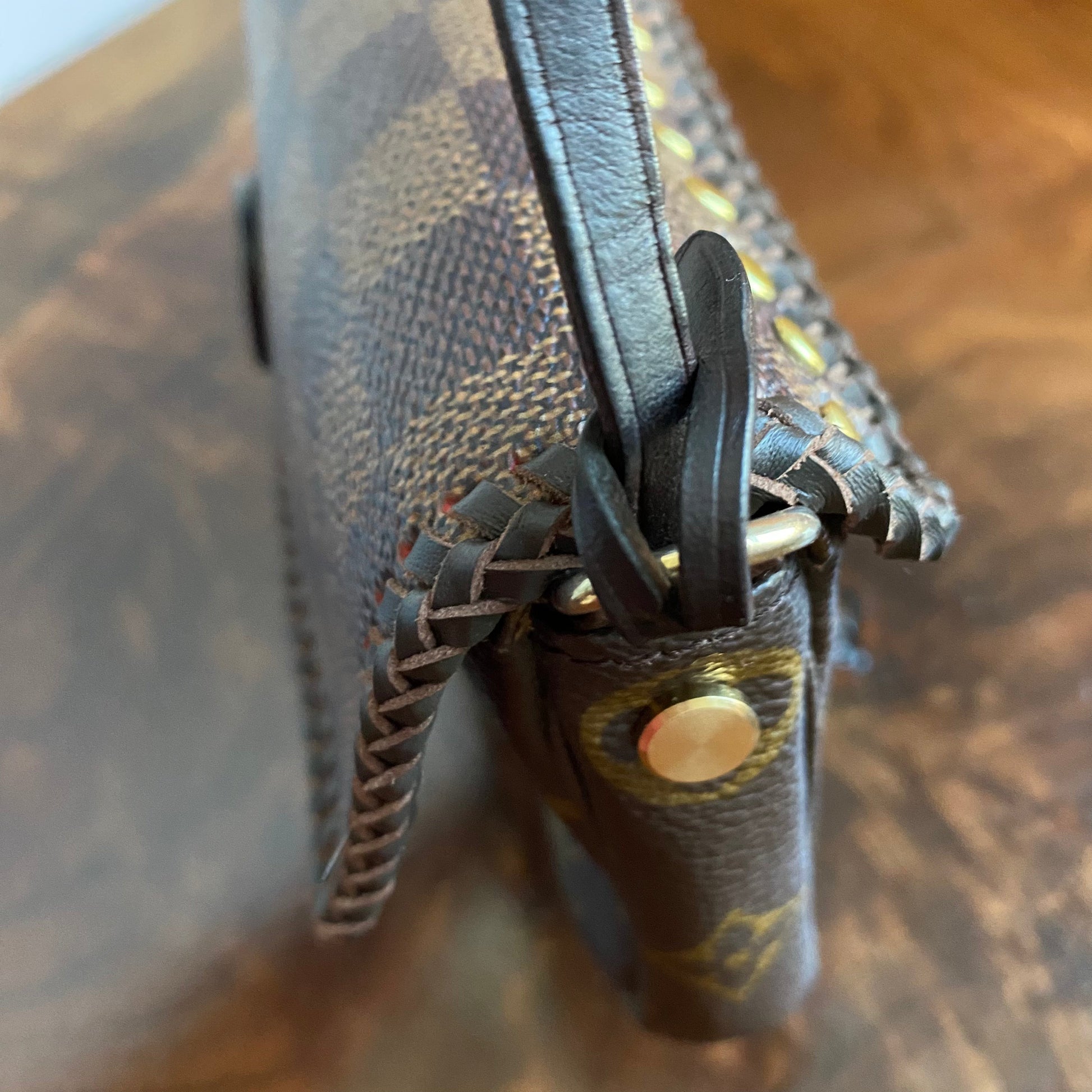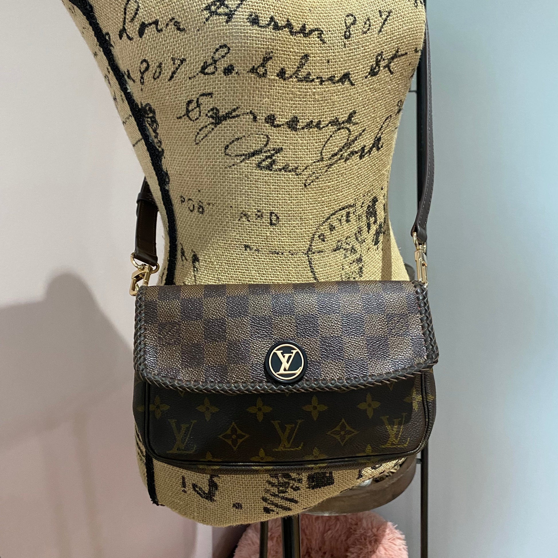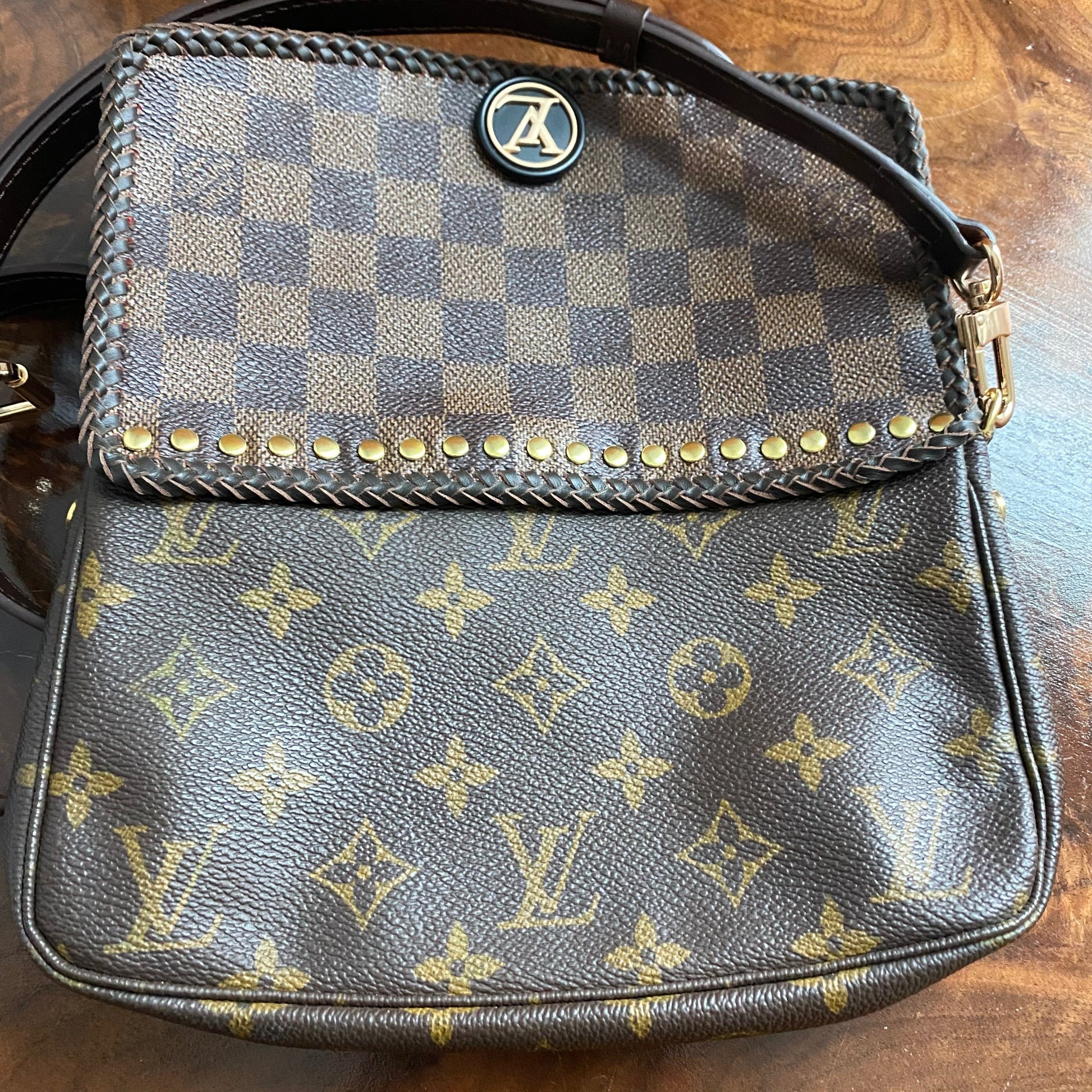 Here is a beautiful and unique Junco that's been made from an Louis Vuitton Monogram Pochette Accessories, including a flap made from an Damier Ebene bag!! I love mixing the patterns!