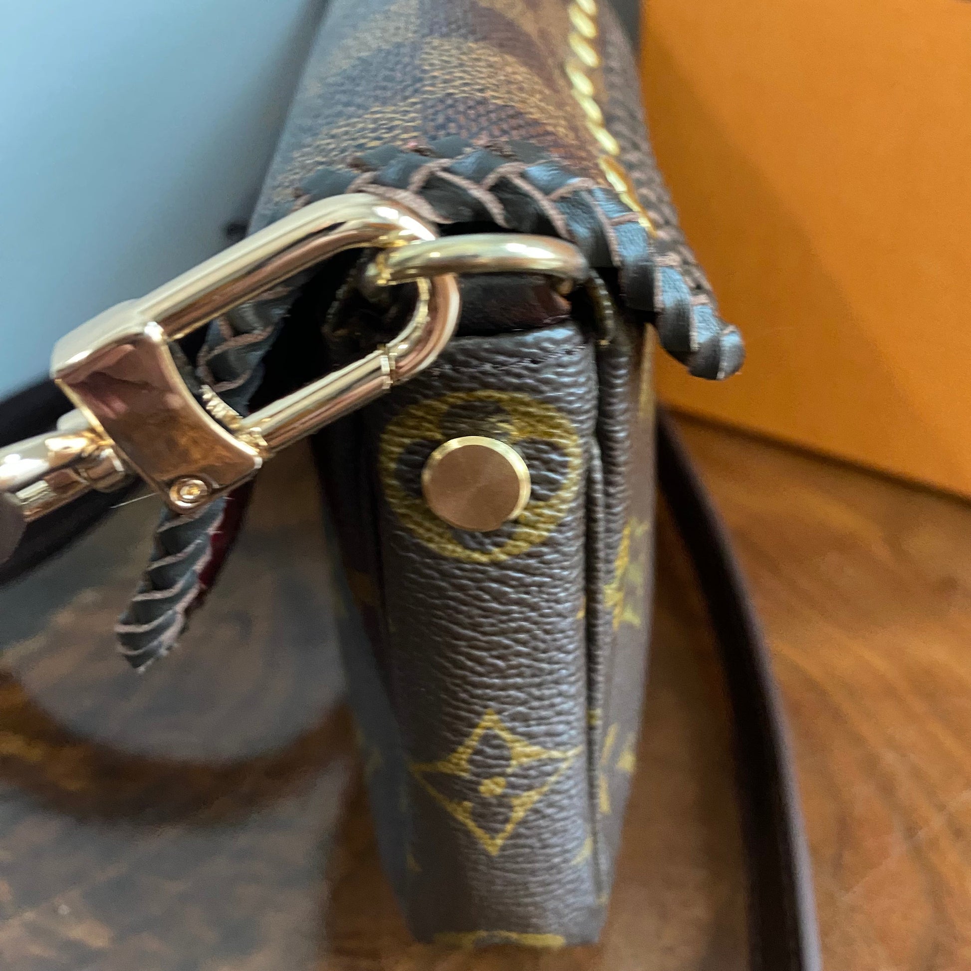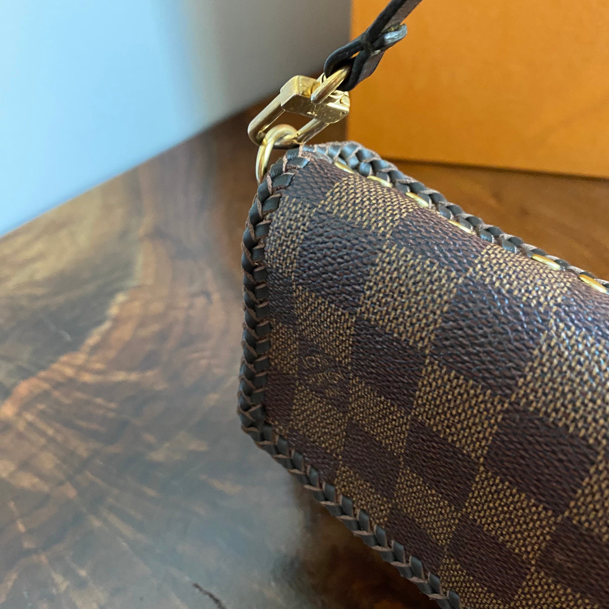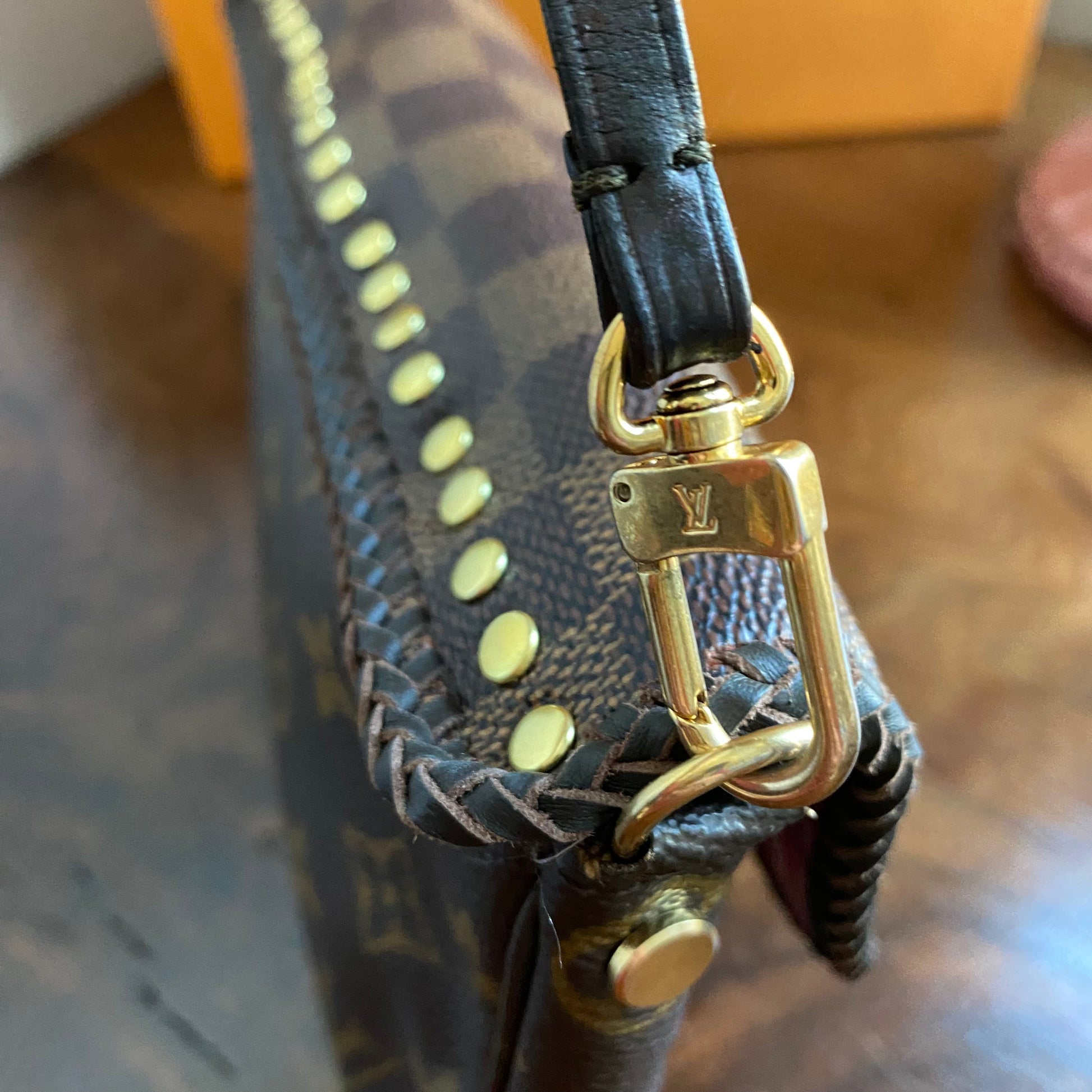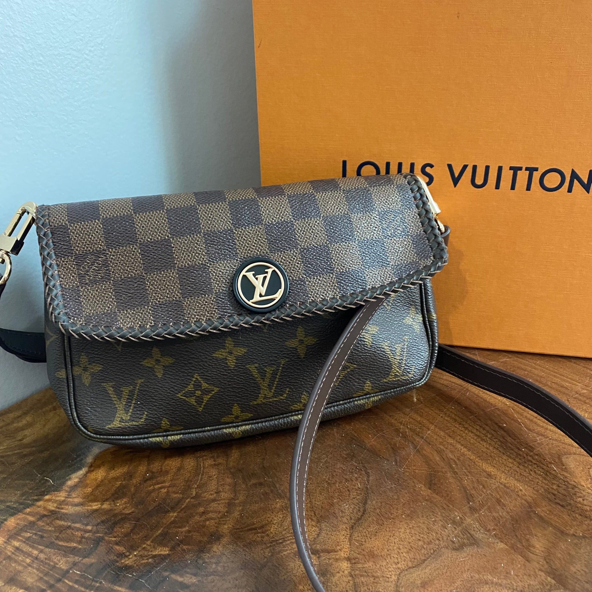 Here is a beautiful and unique Junco that's been made from an Louis Vuitton Monogram Pochette Accessories, including a flap made from an Damier Ebene bag!! I love mixing the patterns!