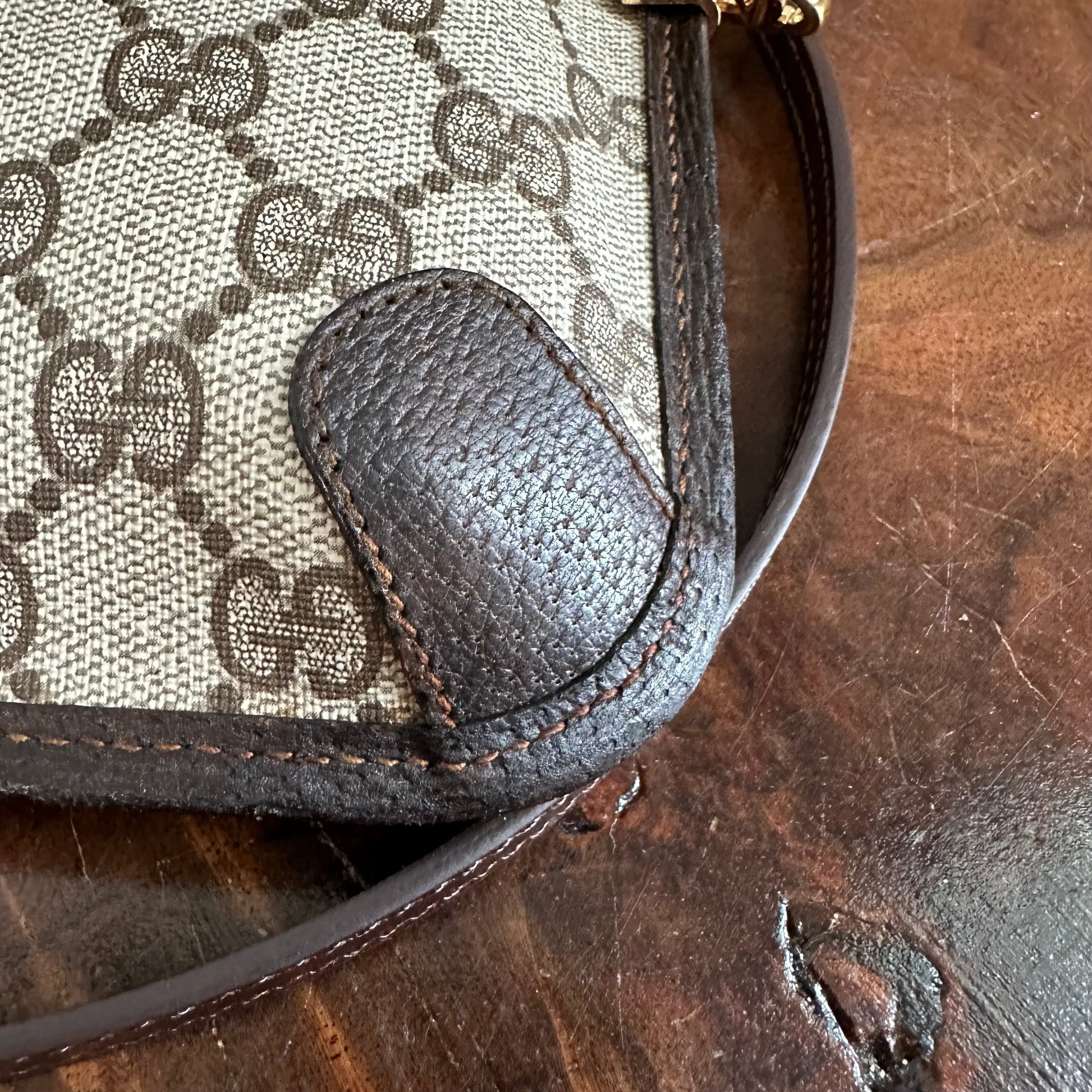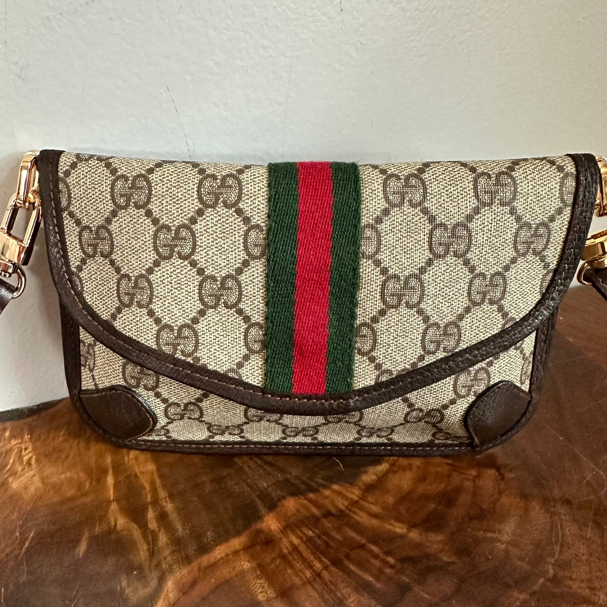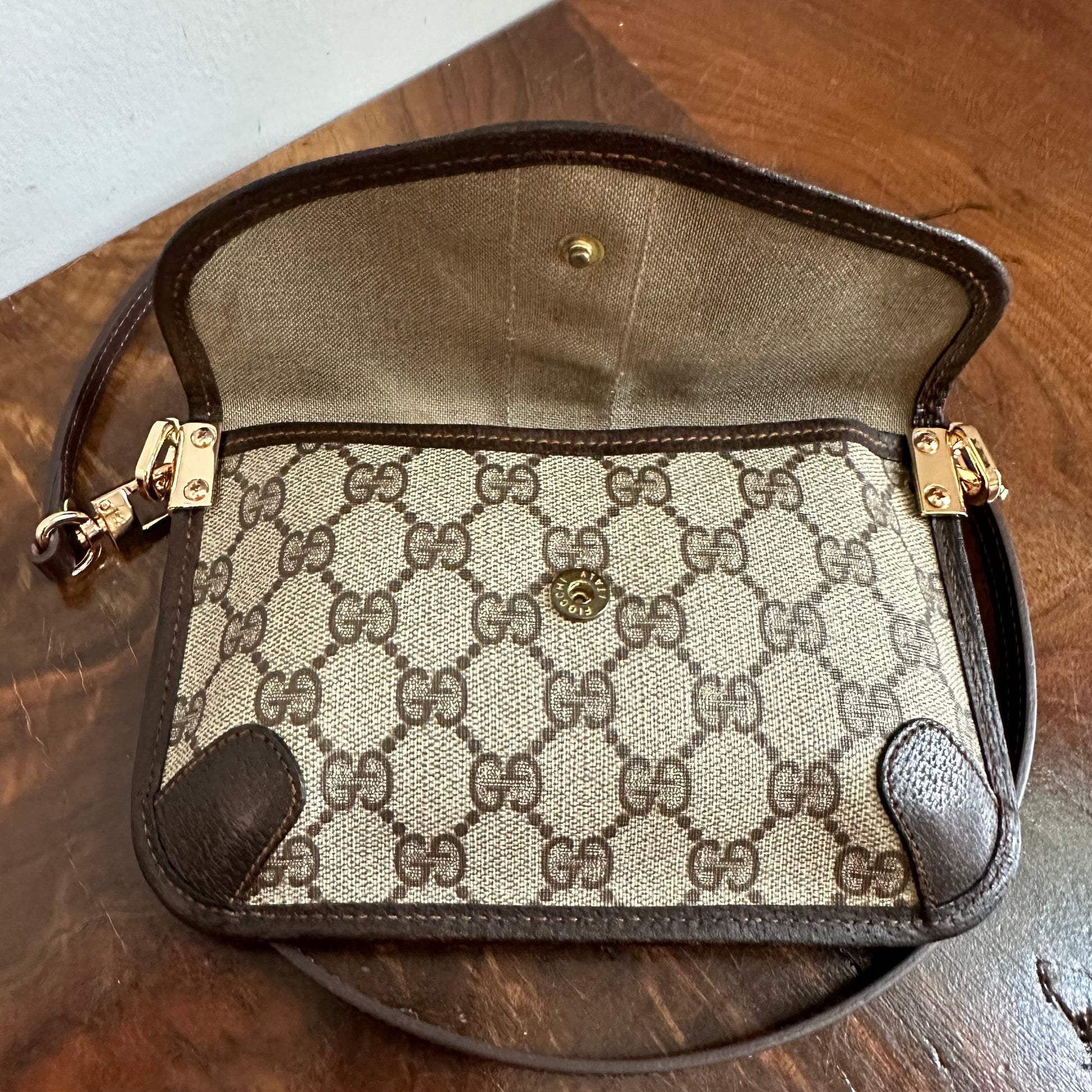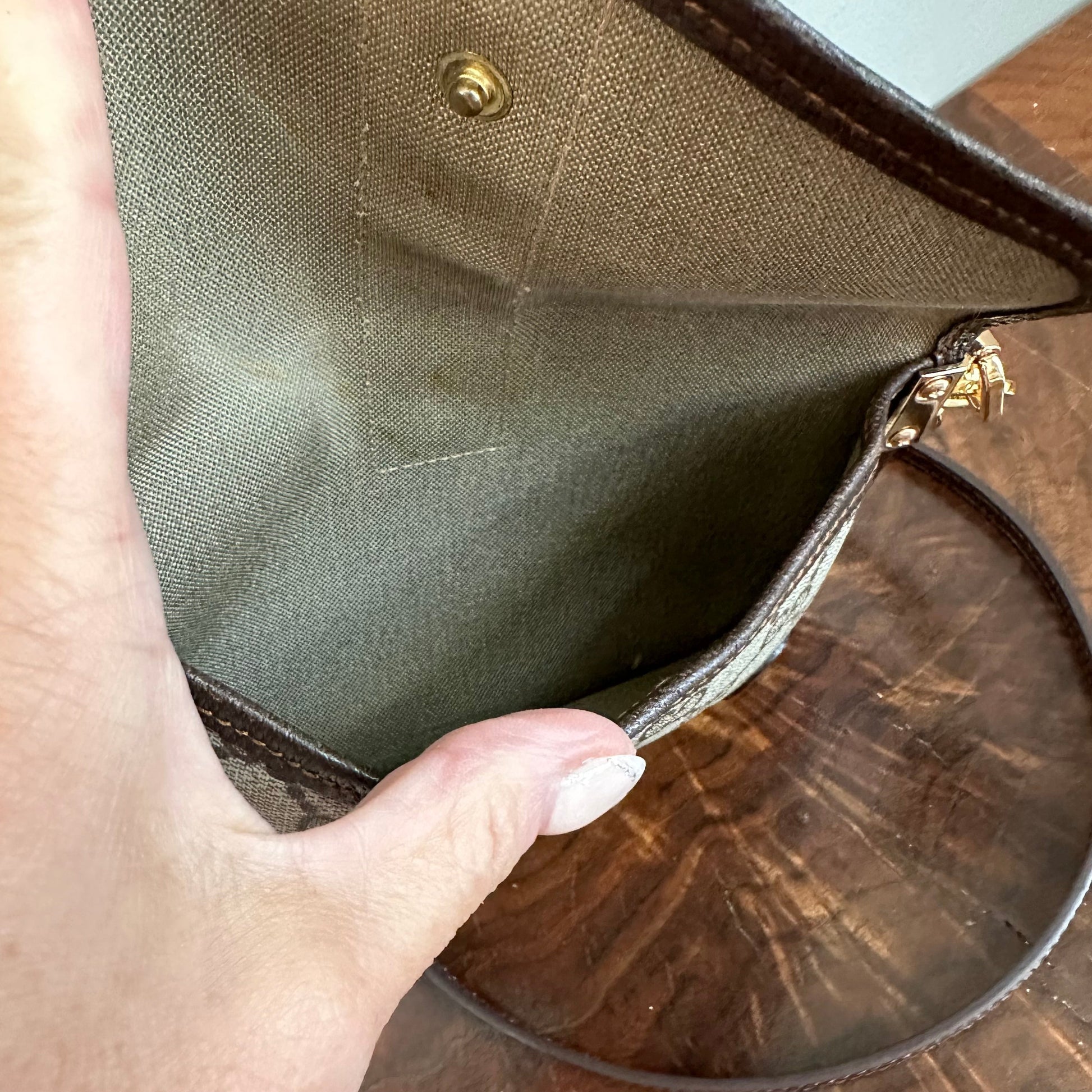 This adorable Junco is a small bag that is the perfect accessory and will go with any outfit! This bag was part of Gucci's Sherry Line and was part of their Accessory collection. In order to make it more useable, I've added side D-rings in order to hold the matching dark brown leather strap that is 40" long. Both the exterior and interior have been fully cleaned. The exterior is coated canvas, which is super easy to keep clean! There's a small dark mark on the back of the bag and a few marks on the inside (see pics). All of the leather has been redyed and an acrylic protector added on top of that. This is a smaller bag that can carry just a few important things, coming in at W7.5 x H4.5x D1 inches.