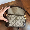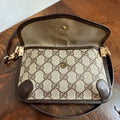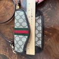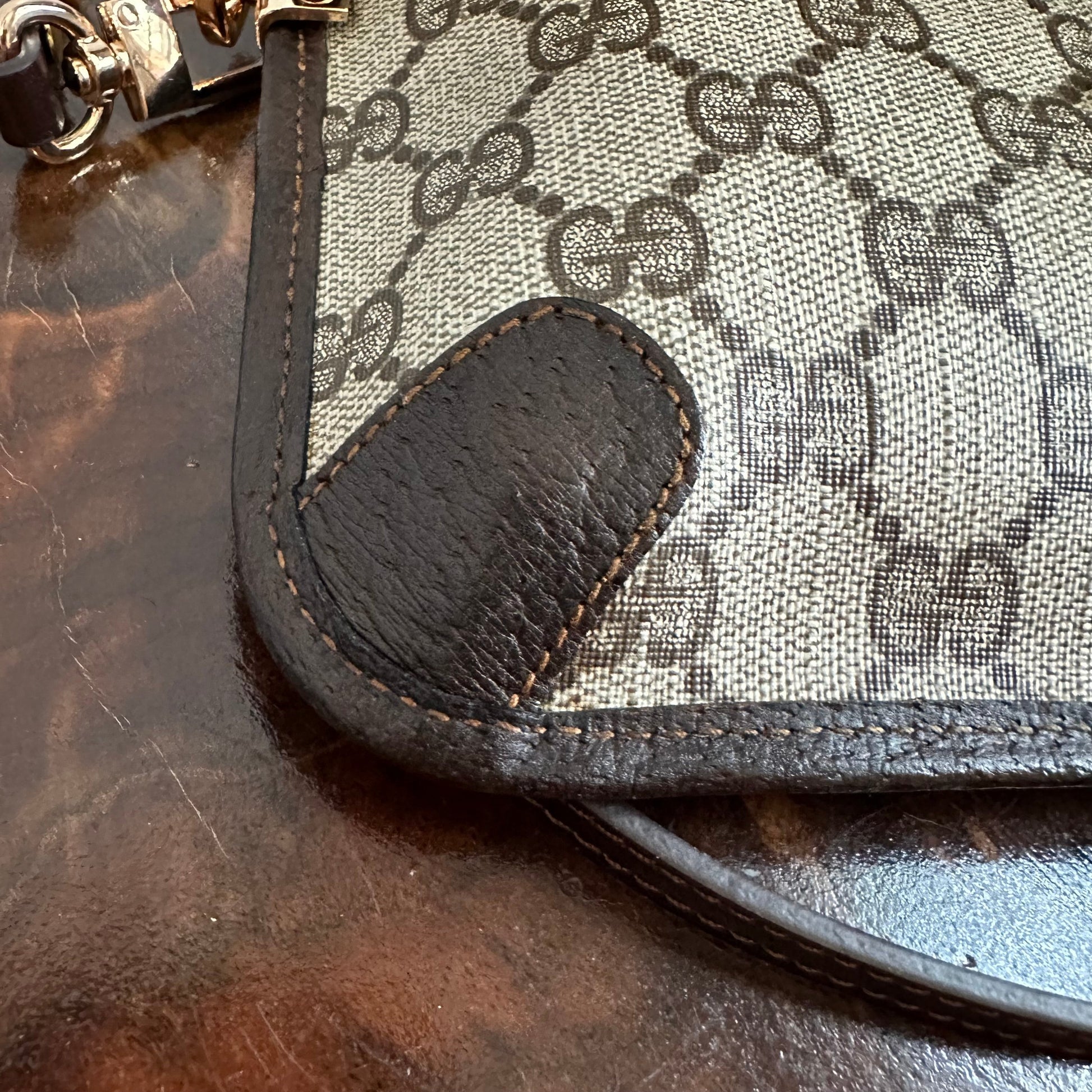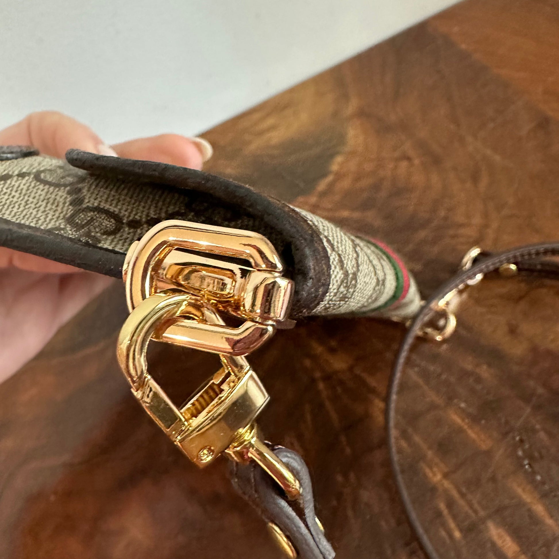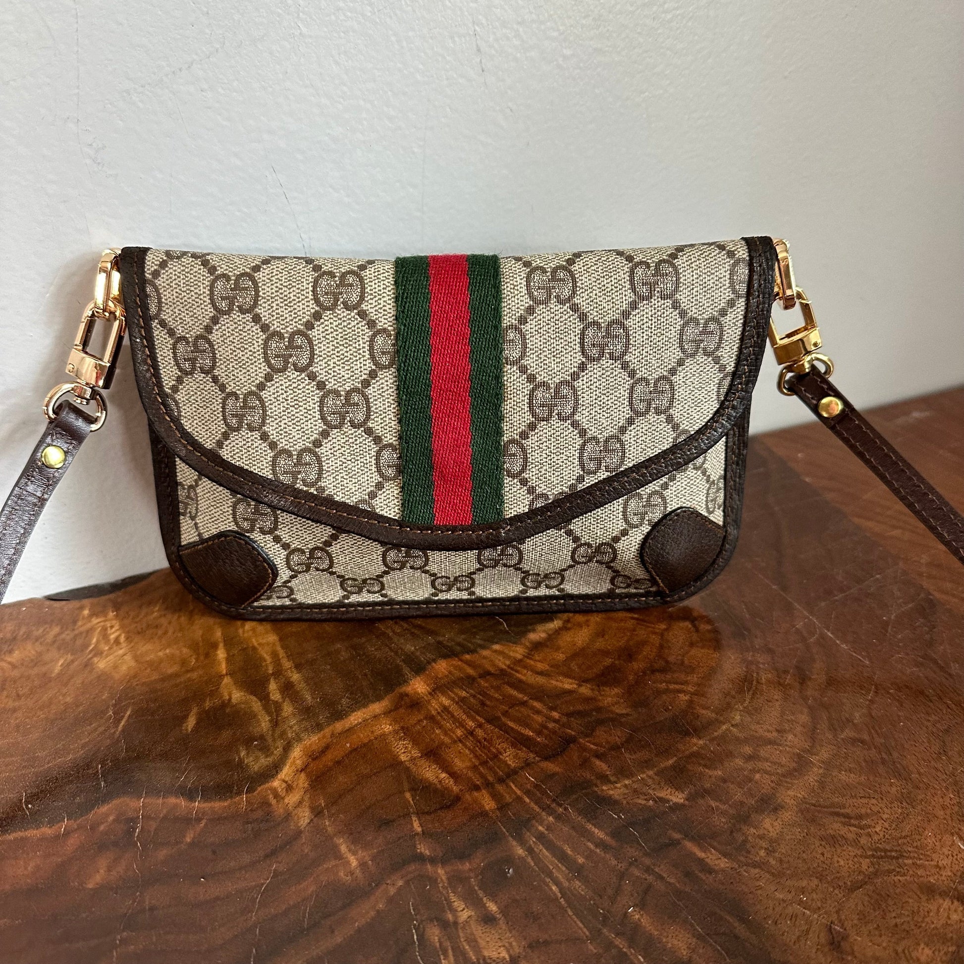 This adorable Junco is a small bag that is the perfect accessory and will go with any outfit! This bag was part of Gucci's Sherry Line and was part of their Accessory collection. In order to make it more useable, I've added side D-rings in order to hold the matching dark brown leather strap that is 40" long. Both the exterior and interior have been fully cleaned. The exterior is coated canvas, which is super easy to keep clean! There's a small dark mark on the back of the bag and a few marks on the inside (see pics). All of the leather has been redyed and an acrylic protector added on top of that. This is a smaller bag that can carry just a few important things, coming in at W7.5 x H4.5x D1 inches.
