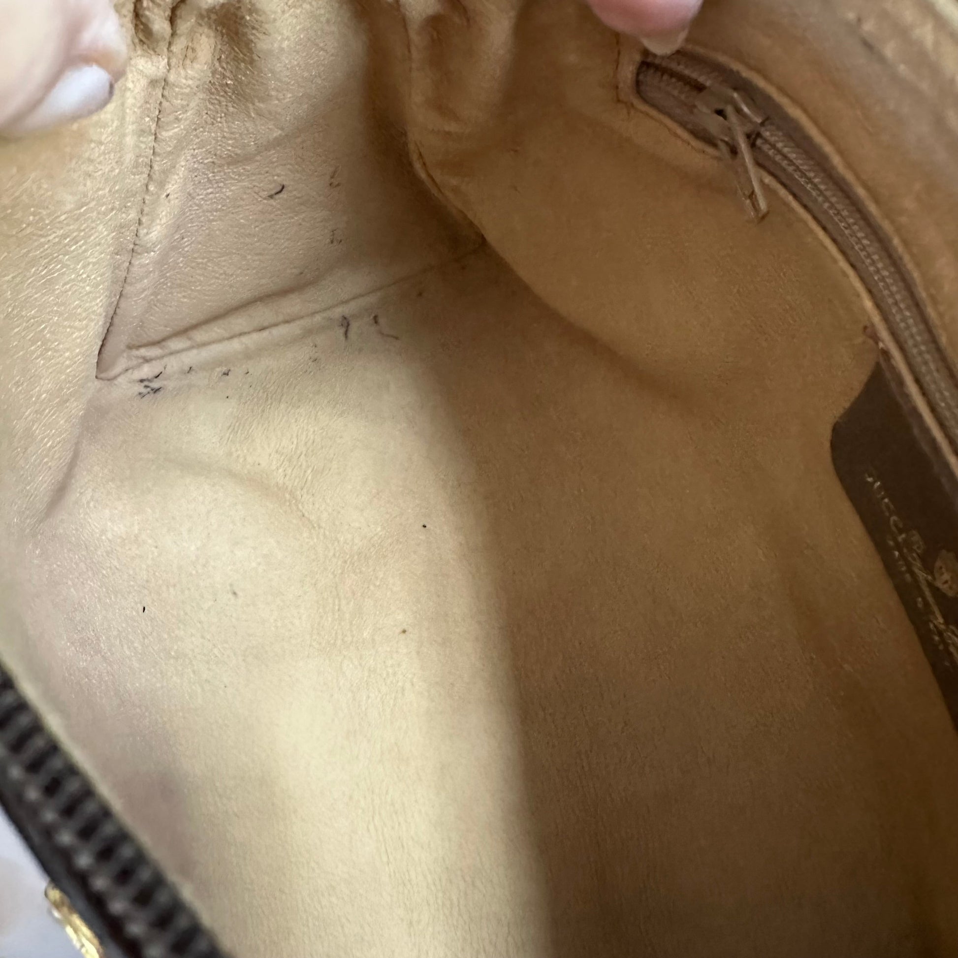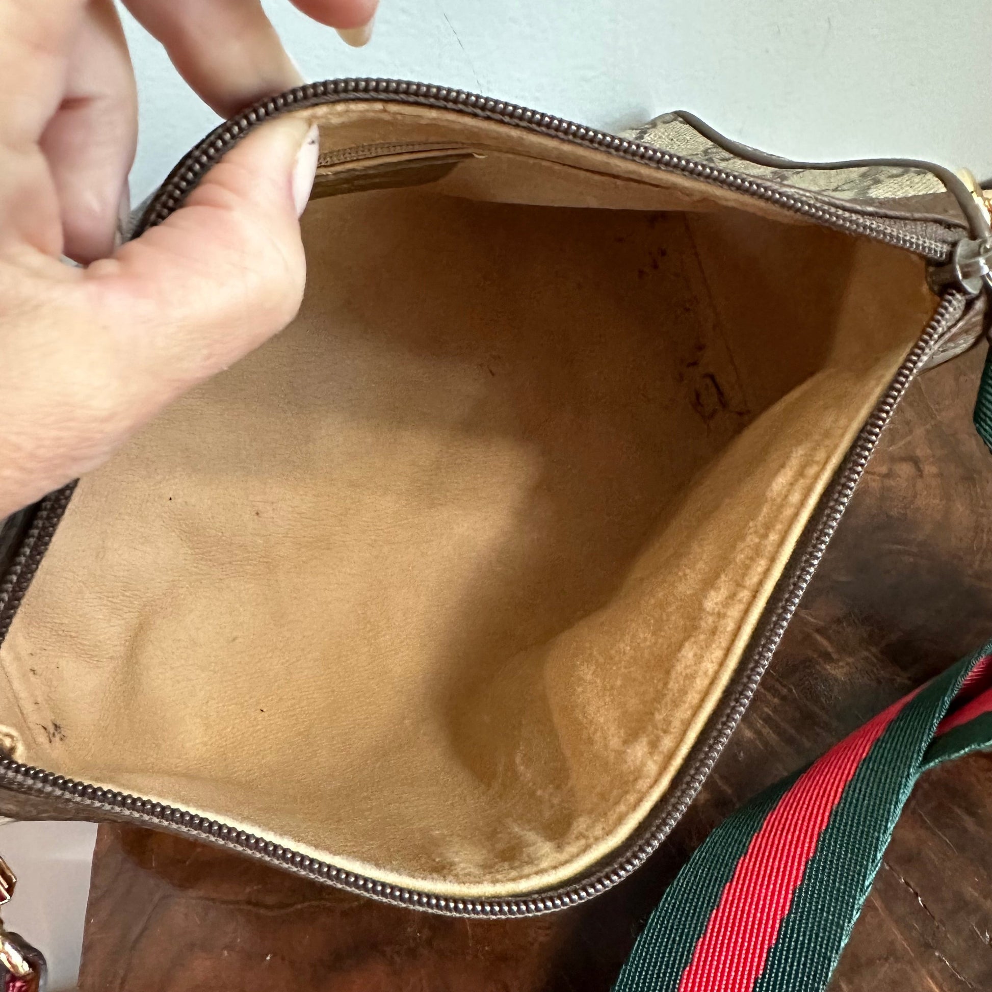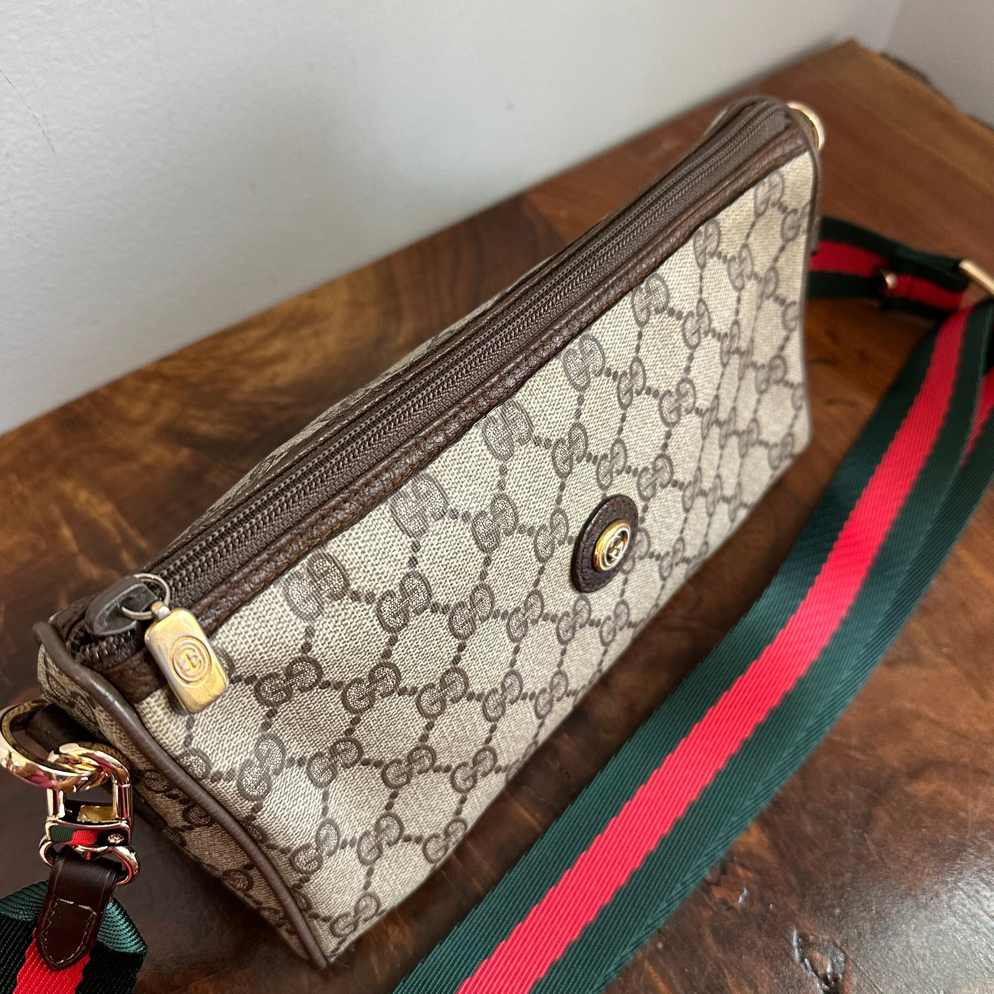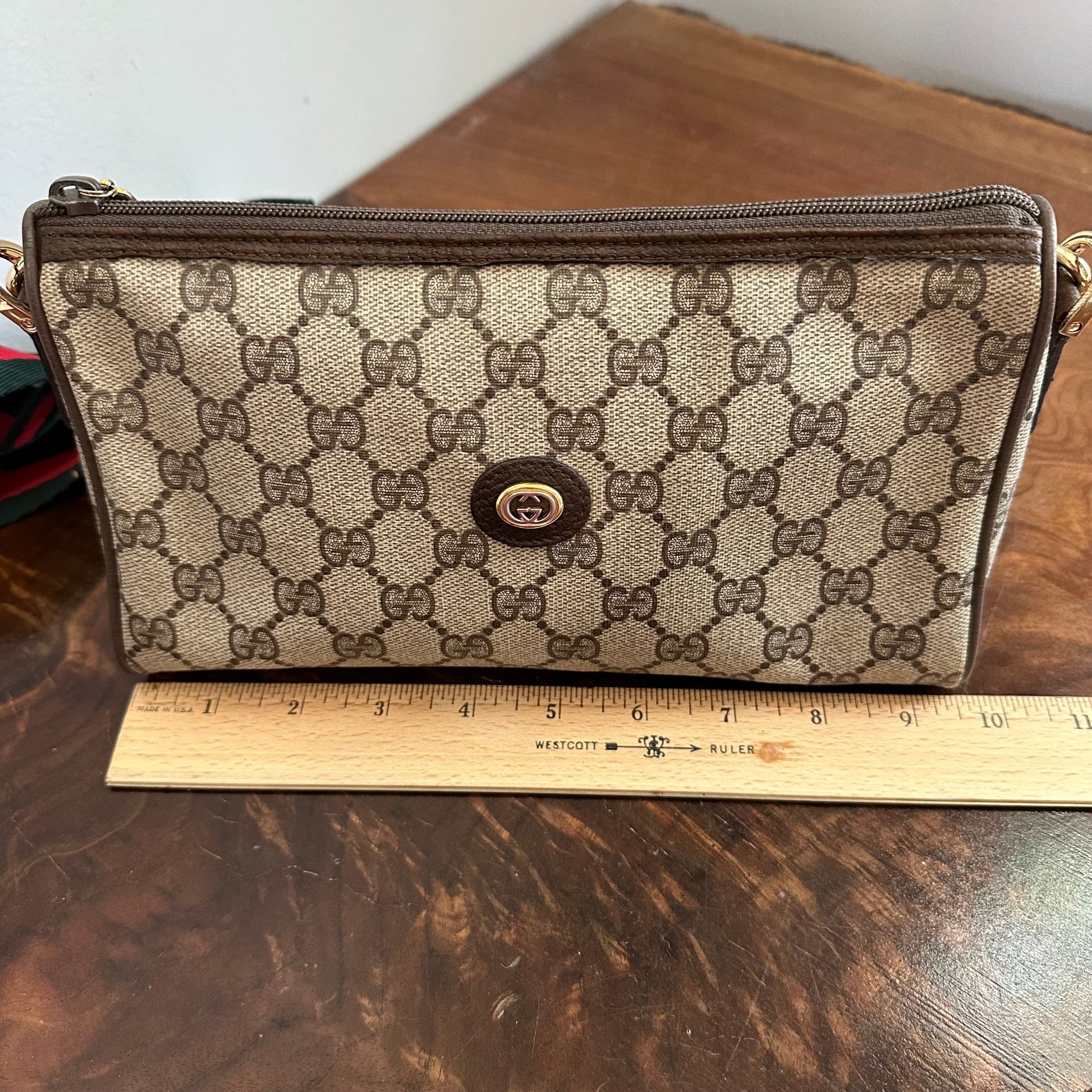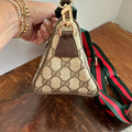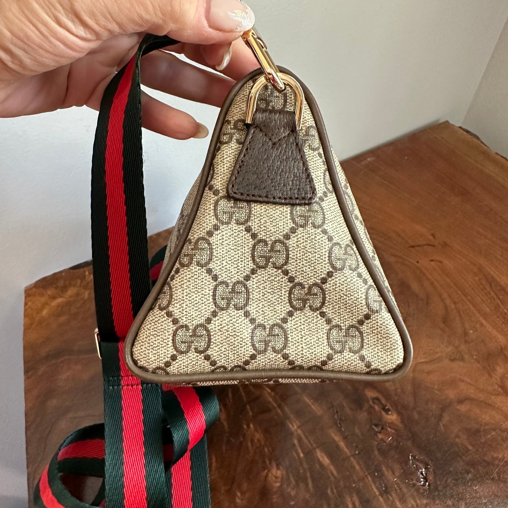 Here's another Junco in a classic GG print that is in greatPrestige Totes condition! This coated canvas Gucci bag is part of Gucci's accessory line and is in really great shape. I re-dyed and used protectant on the dark brown leather, which really brought her to life. The interior is a soft material that CAN flake off, but this one has just minor rubbing at the top. The interior has some pen stains (see pics) and also has a small zippered pocket. The original D-rings had rust on them and the strap was missing, so I've replaced them both. I've added a classic green/red stripe strap that is adjustable from 30-50". This is a triangular shaped bag and will hold plenty of things. It comes in at W9.5 x H5.5x D4.5 inches.