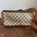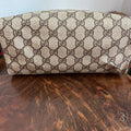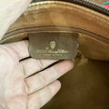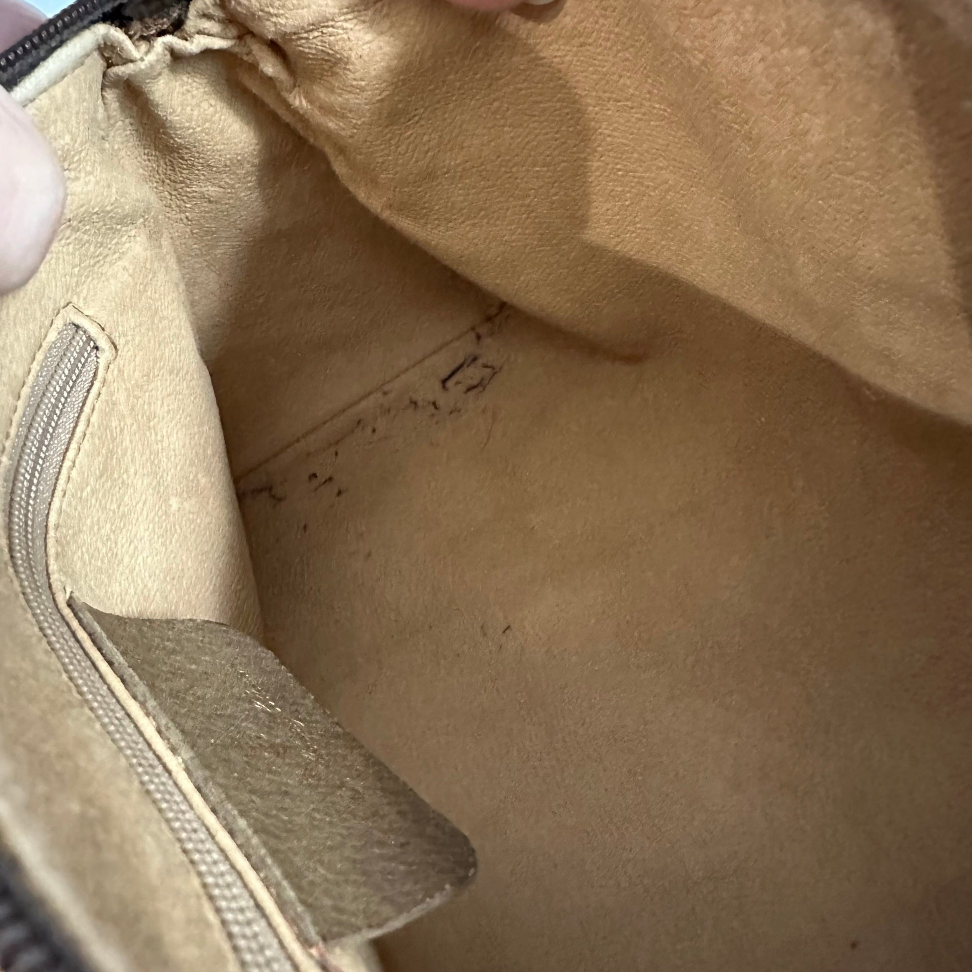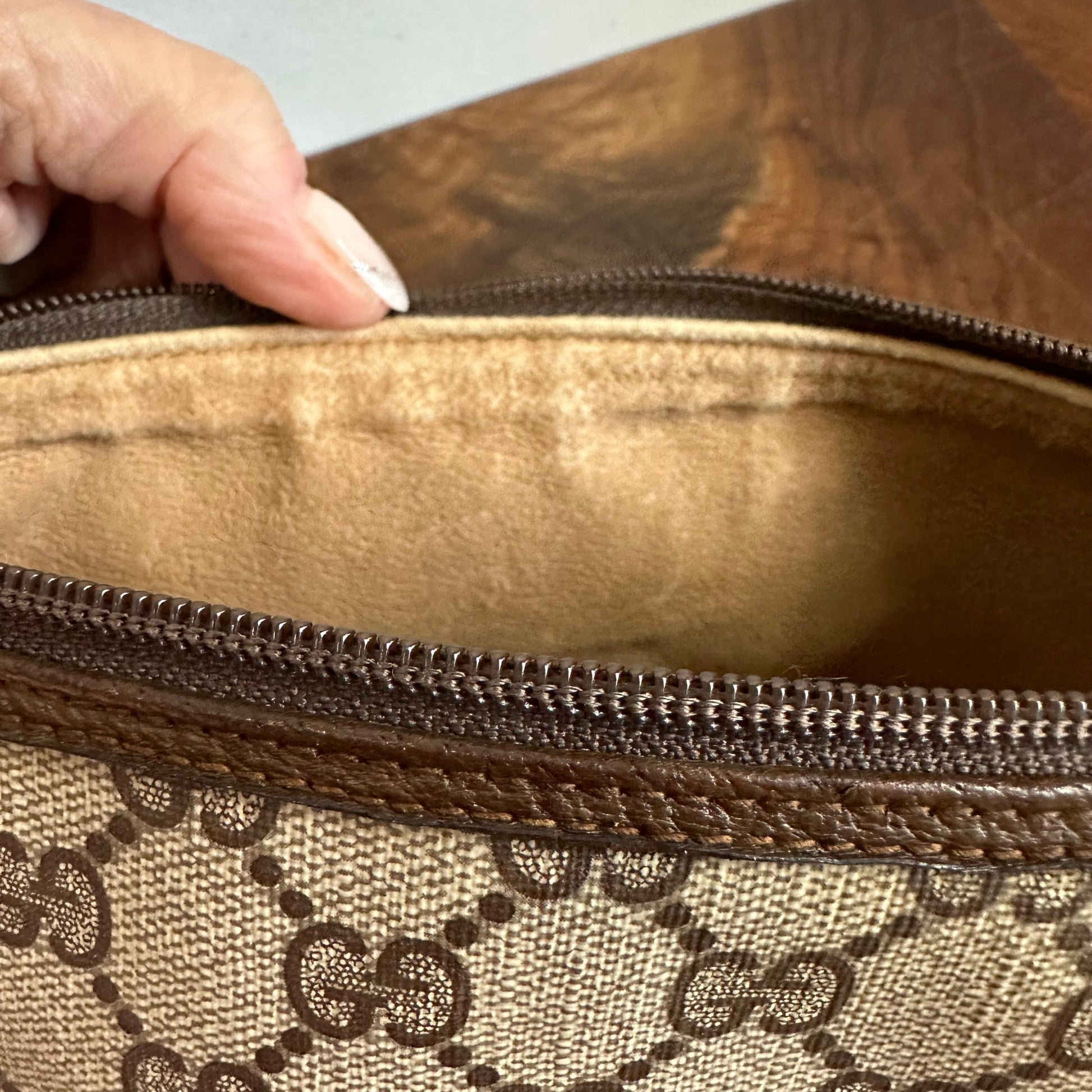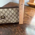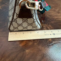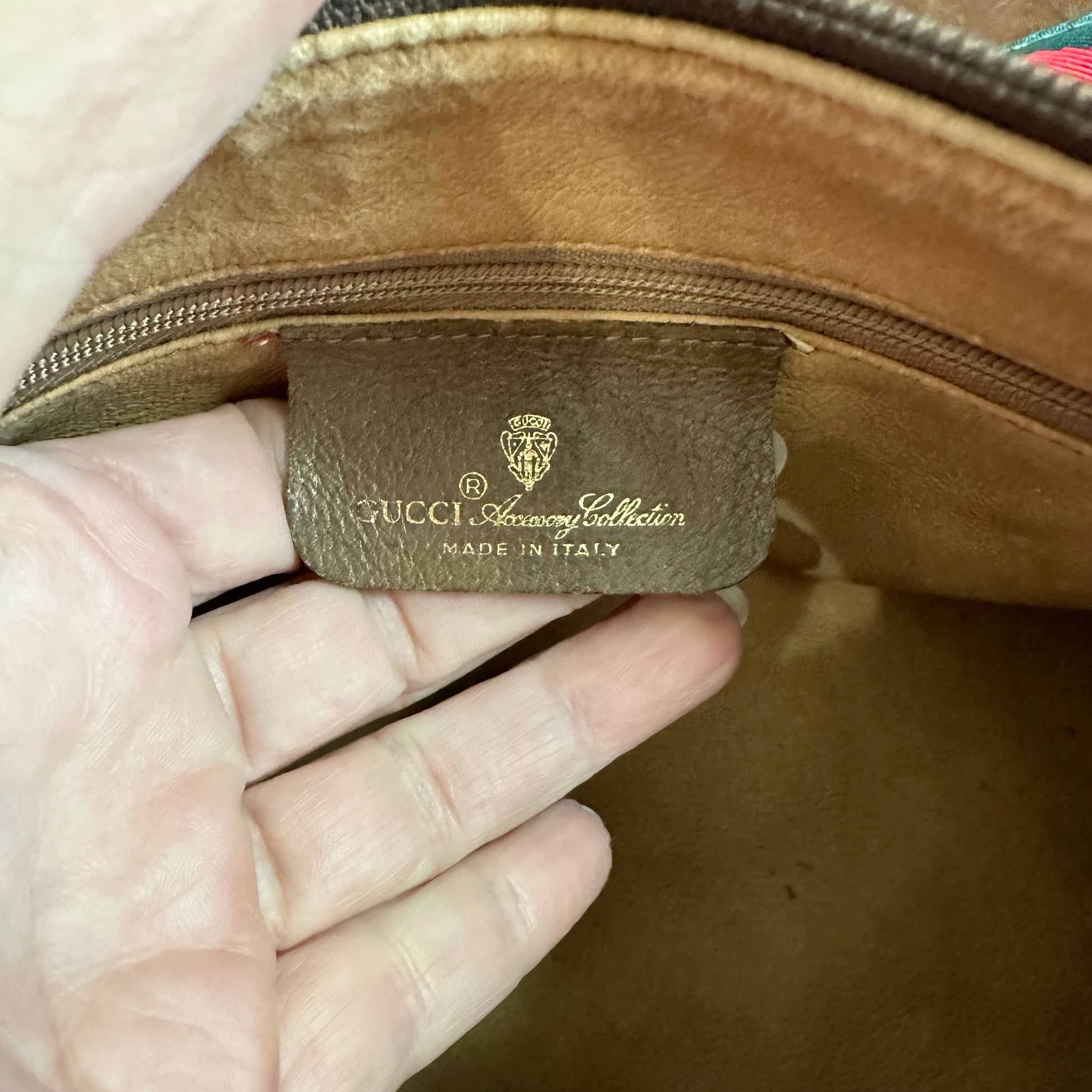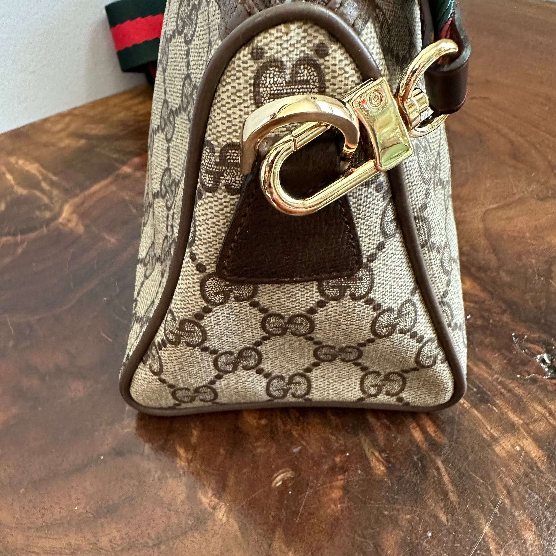 Here's another Junco in a classic GG print that is in greatPrestige Totes condition! This coated canvas Gucci bag is part of Gucci's accessory line and is in really great shape. I re-dyed and used protectant on the dark brown leather, which really brought her to life. The interior is a soft material that CAN flake off, but this one has just minor rubbing at the top. The interior has some pen stains (see pics) and also has a small zippered pocket. The original D-rings had rust on them and the strap was missing, so I've replaced them both. I've added a classic green/red stripe strap that is adjustable from 30-50". This is a triangular shaped bag and will hold plenty of things. It comes in at W9.5 x H5.5x D4.5 inches.