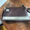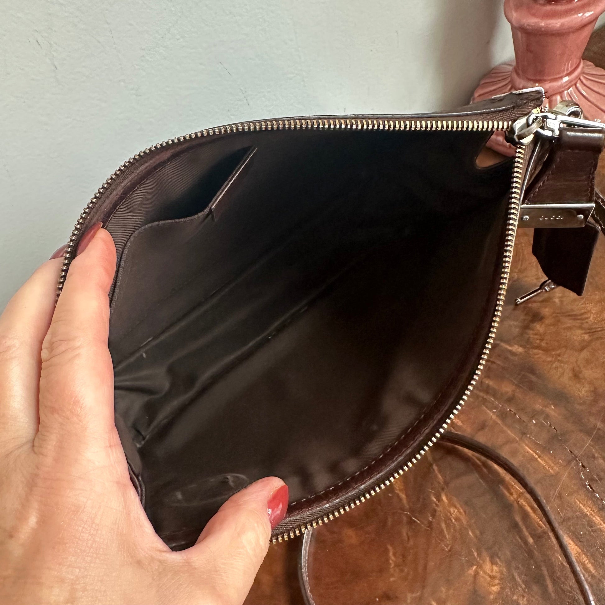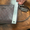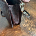This Prestige Totes originally was a wristlet bag and she came to me in pretty rough shape (see last pic). I've given her a good cleaning, redyed the leather and conditioned it. I took my time with this Prestige Totes and she's just GORGEOUS now! I love the silver lock on the front, it easily opens by pushing the button down. It comes with a key as well so that you can lock her. I've added some silver D-rings tot he side so I could add the 44" long brown leather strap. There was also some damage to the back corner, so I added a silver plate to keep it in tact.