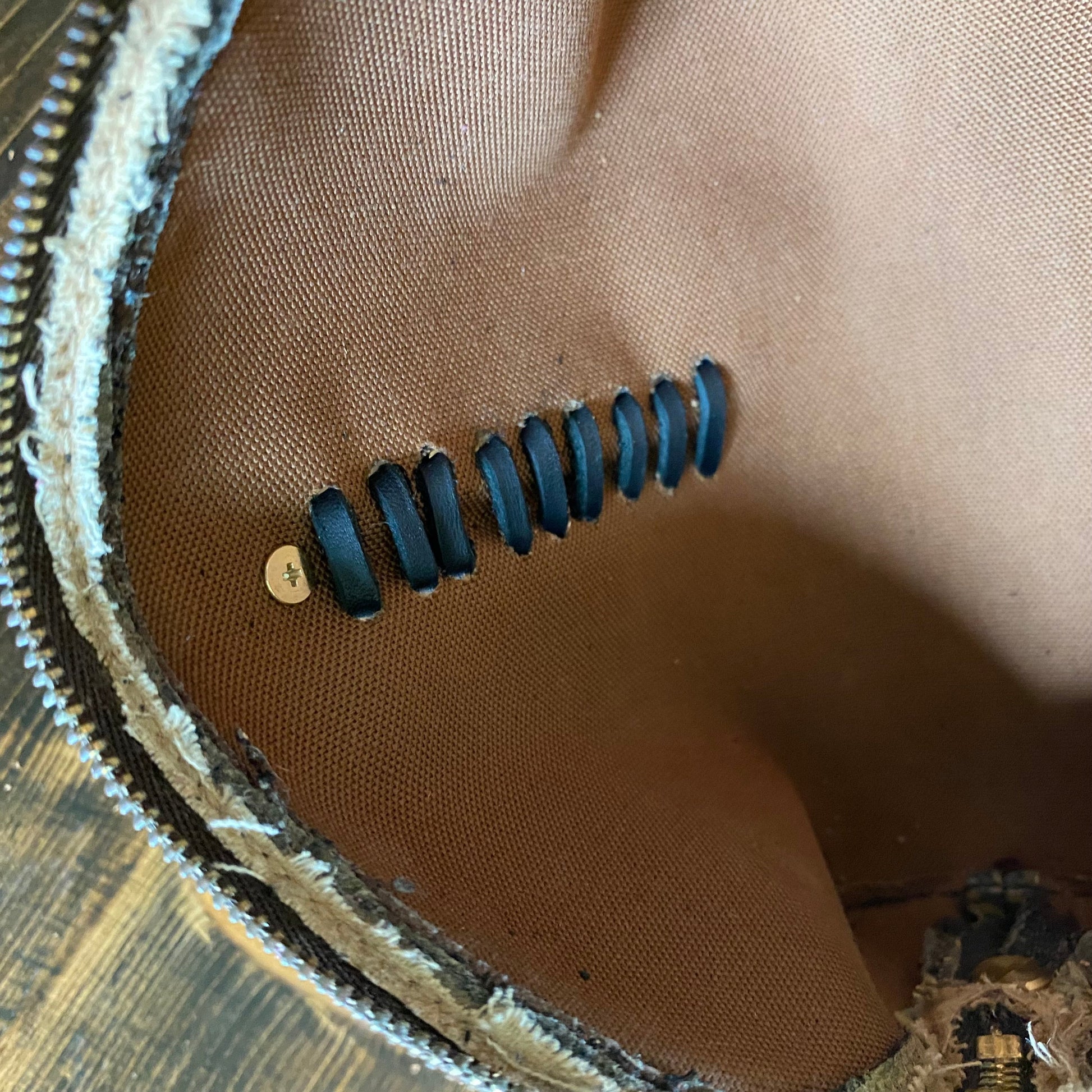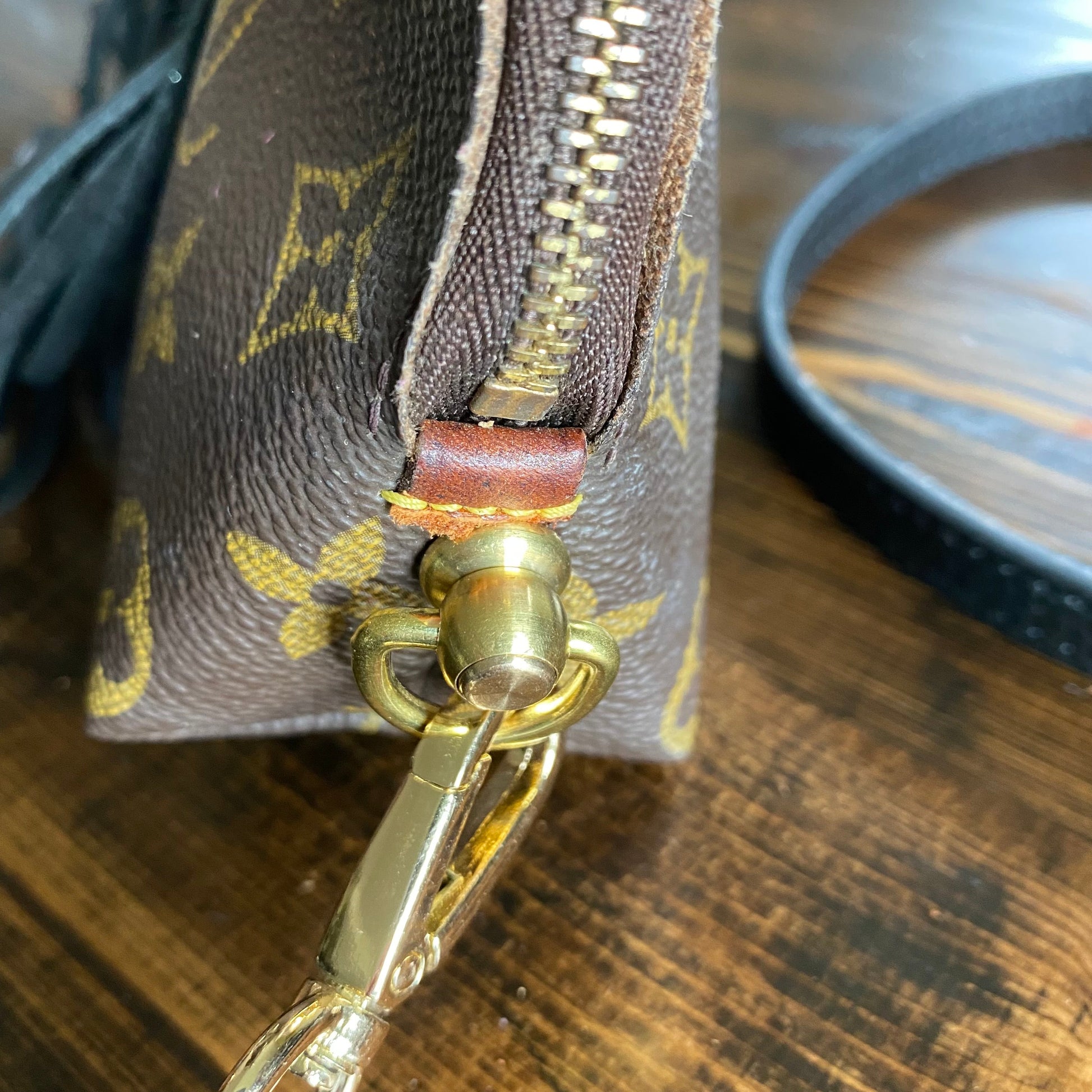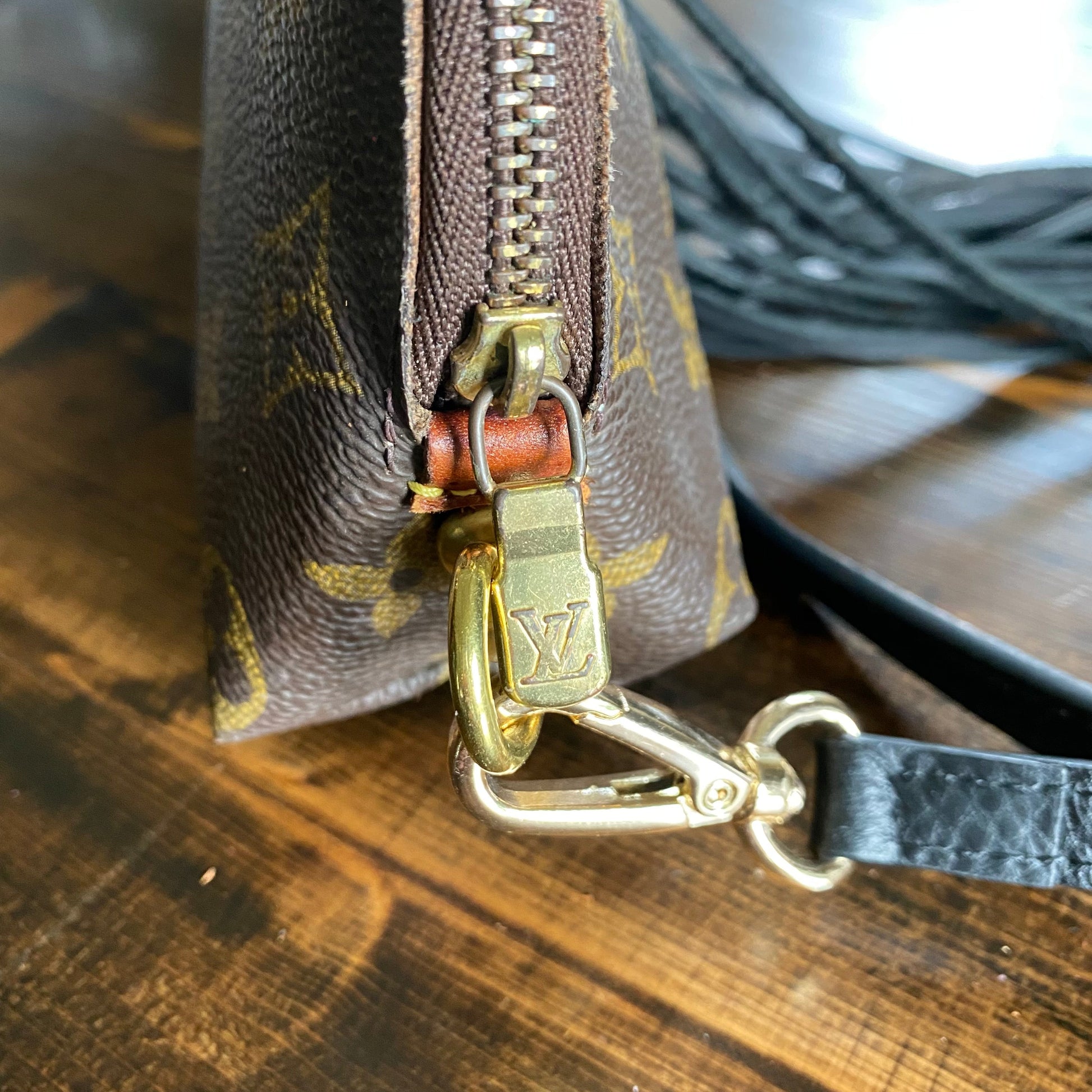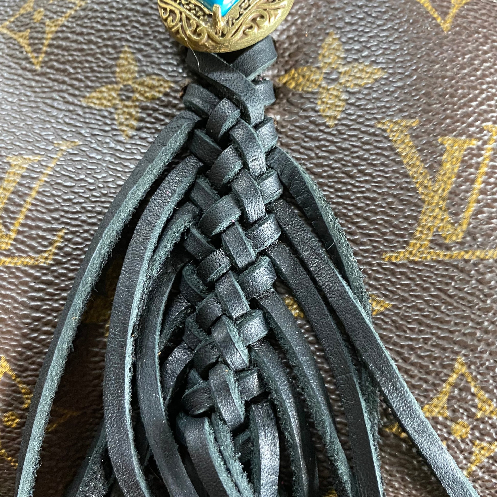 The Vuittonite (see below) inside was in rough shape, so I completely removed it, leaving just the bare canvas. The zipper is fully functional. The leather end tabs have been worn off. I added some braided black fringe to the outside and a beautiful brass and turquoise concho. (The concho can always be switched out for something different, if desired...just contact me for options!!!) I've added brass D-rings to the sides and attached a black leather adjustable strap (39-49").