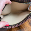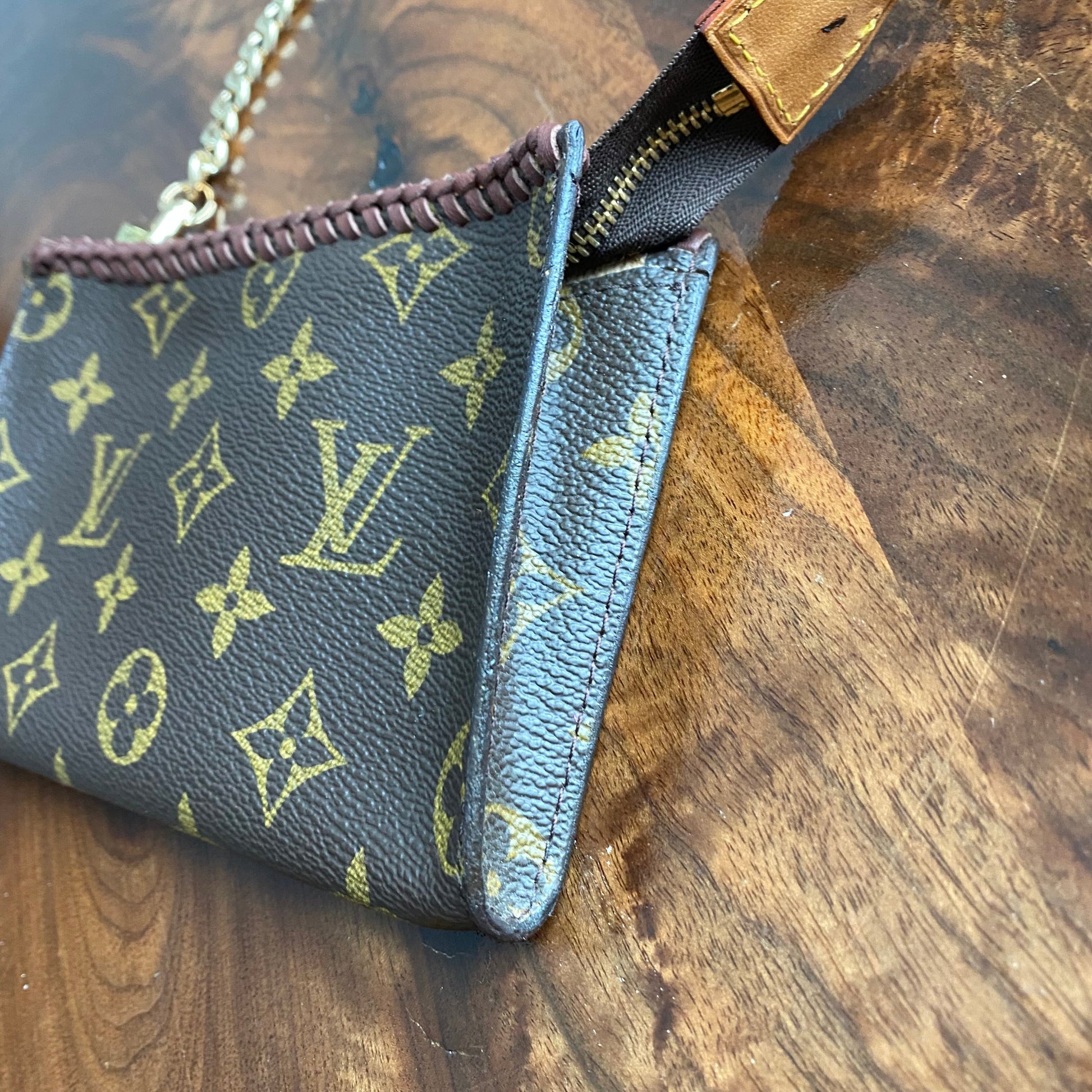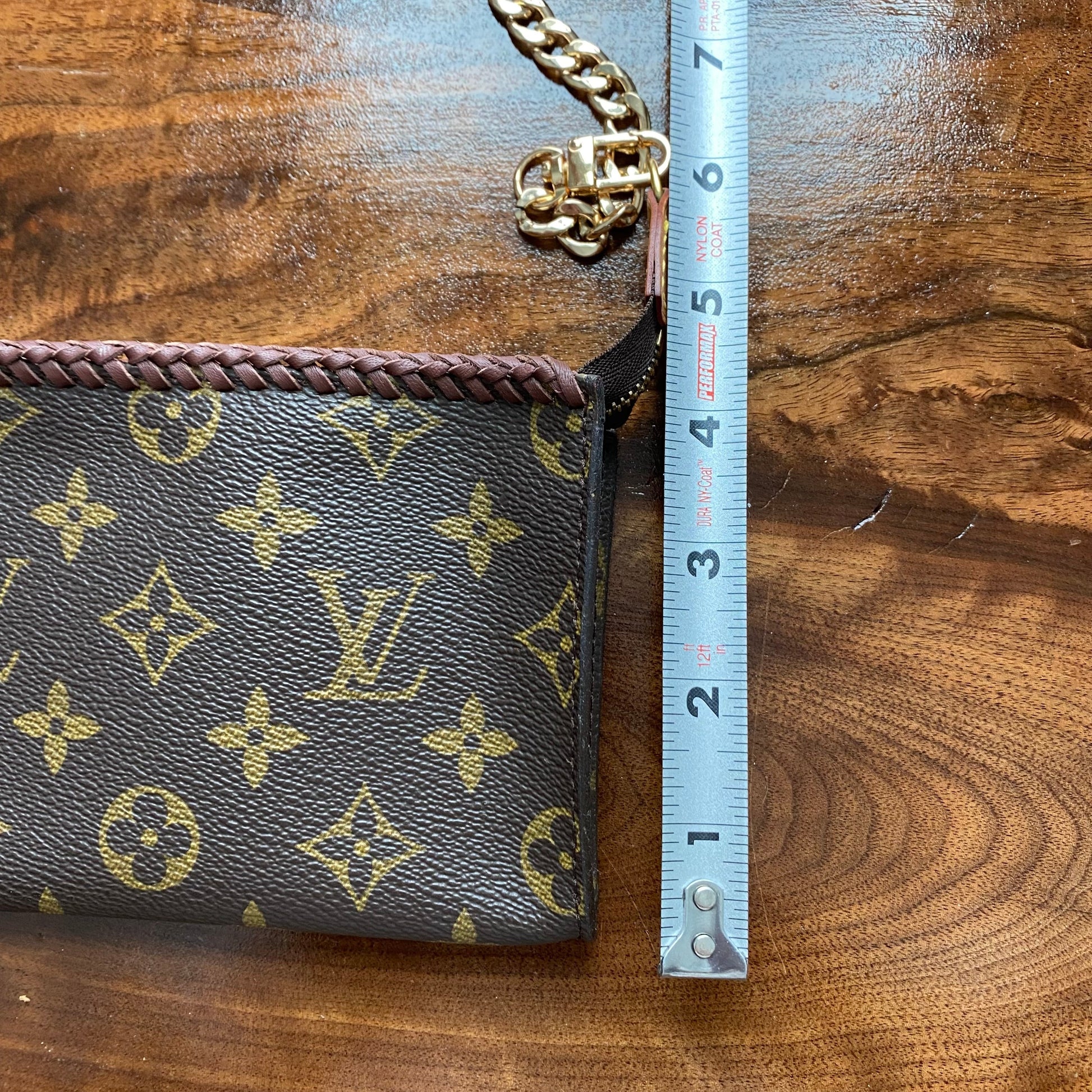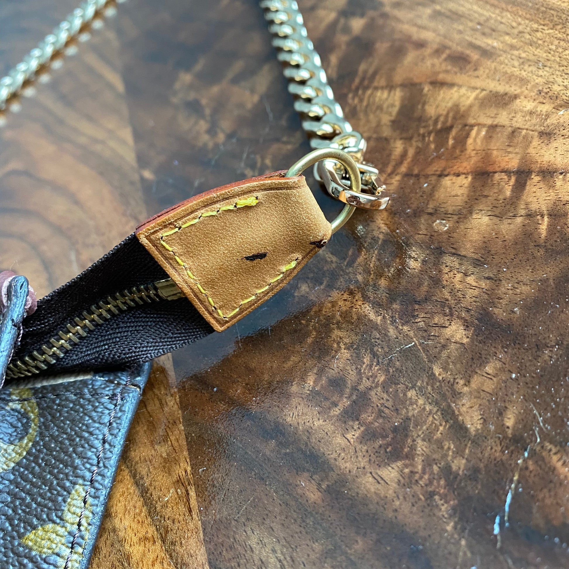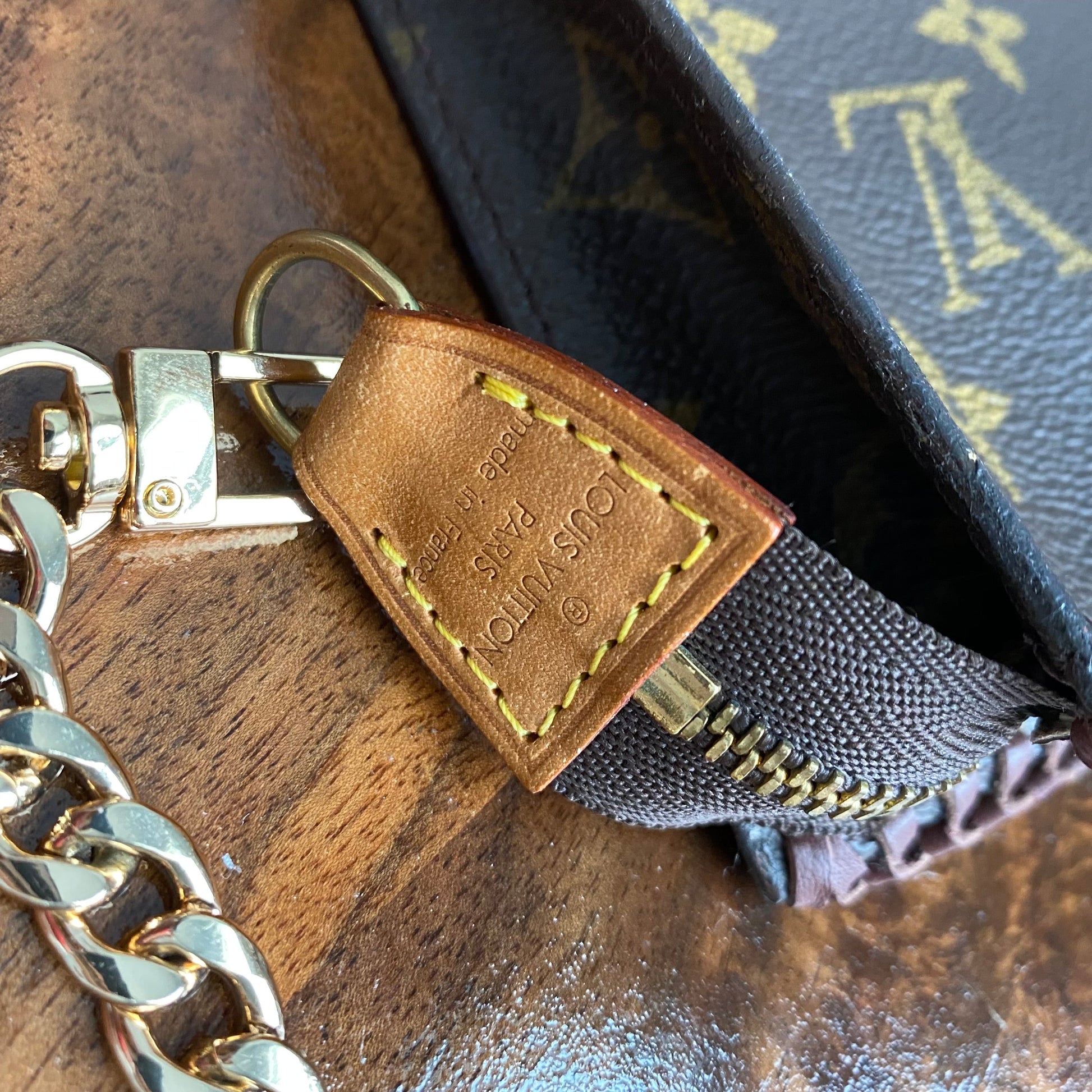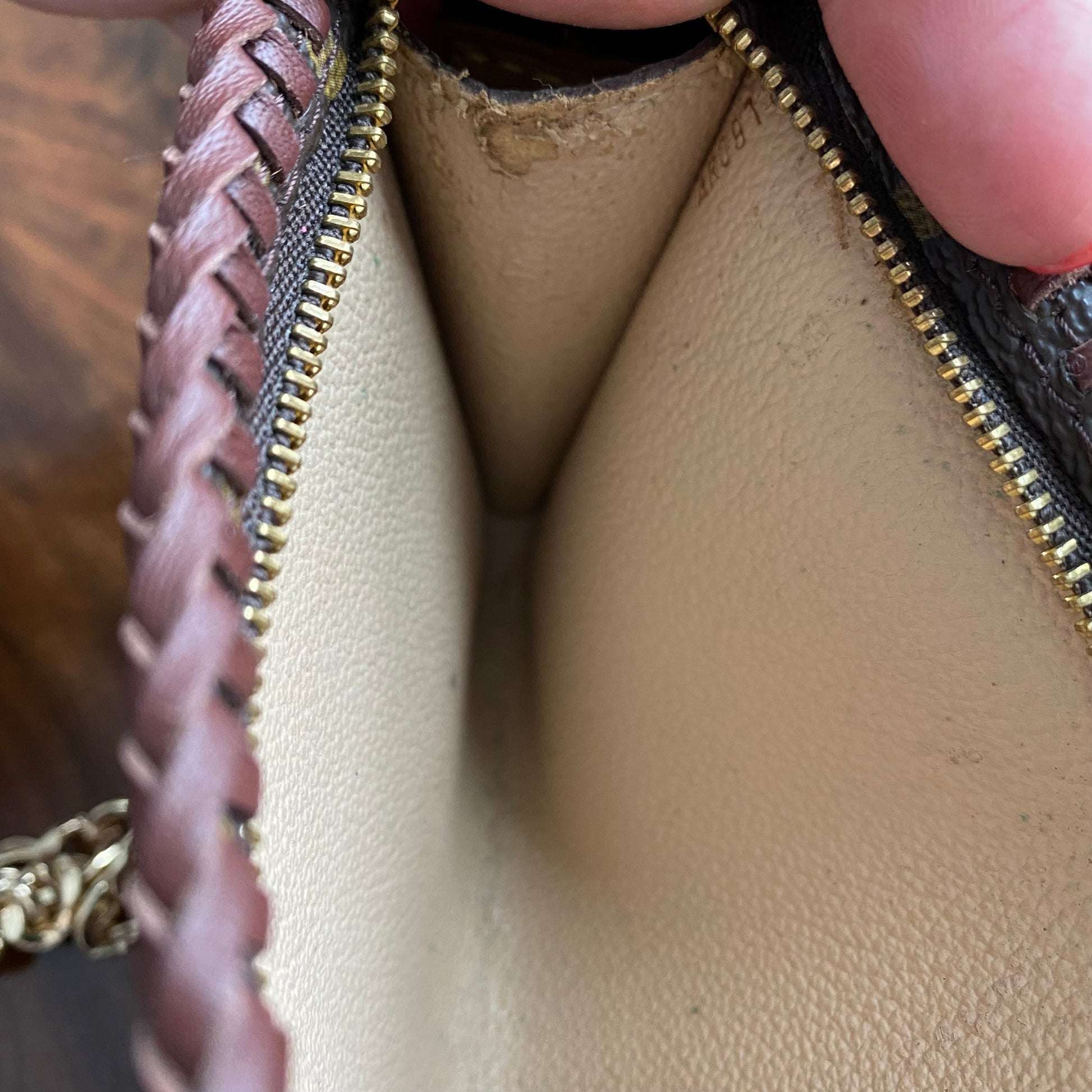 This bag is in GREAT shape, so I added some brandy colored leather braiding to the top to give it a fun and unique look. The inside Vuittonite (see below) is in great shape, so I left it alone. I've also added a 30" gold chain so that you can carry it over your shoulder! I can switch out the chain if you'd like, longer or shorter, just message me with questions!!