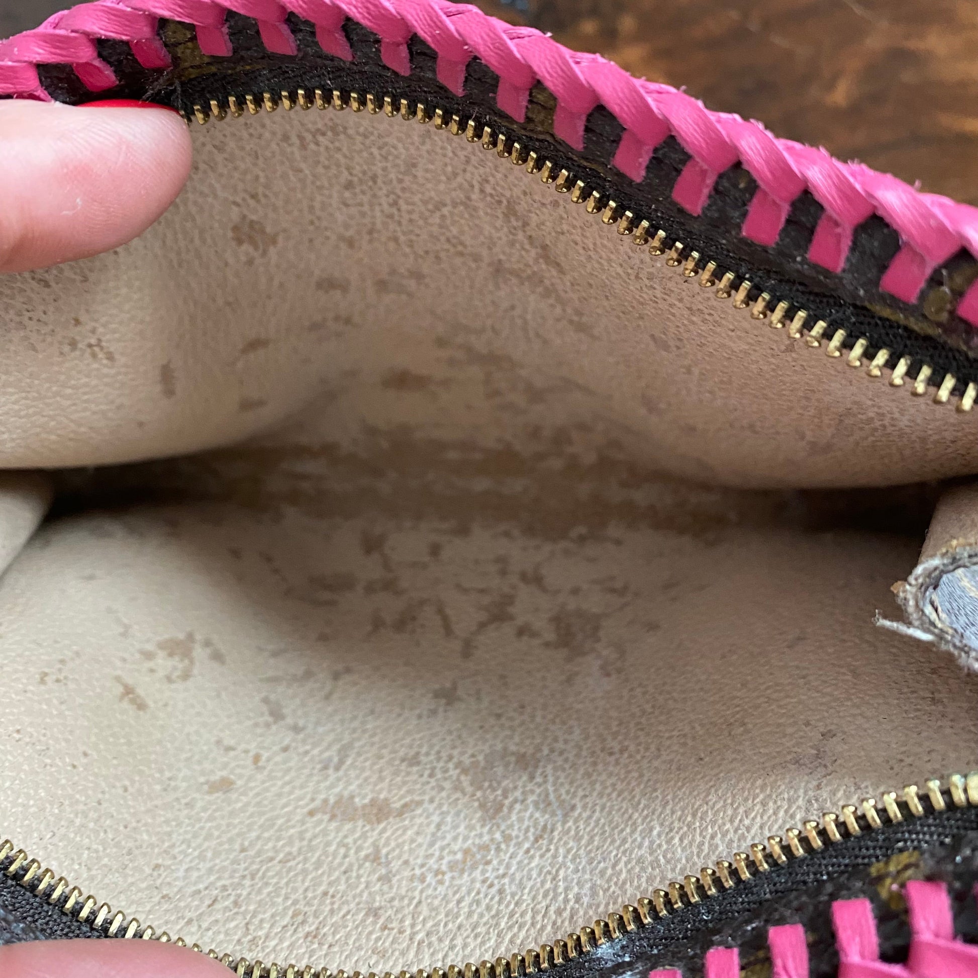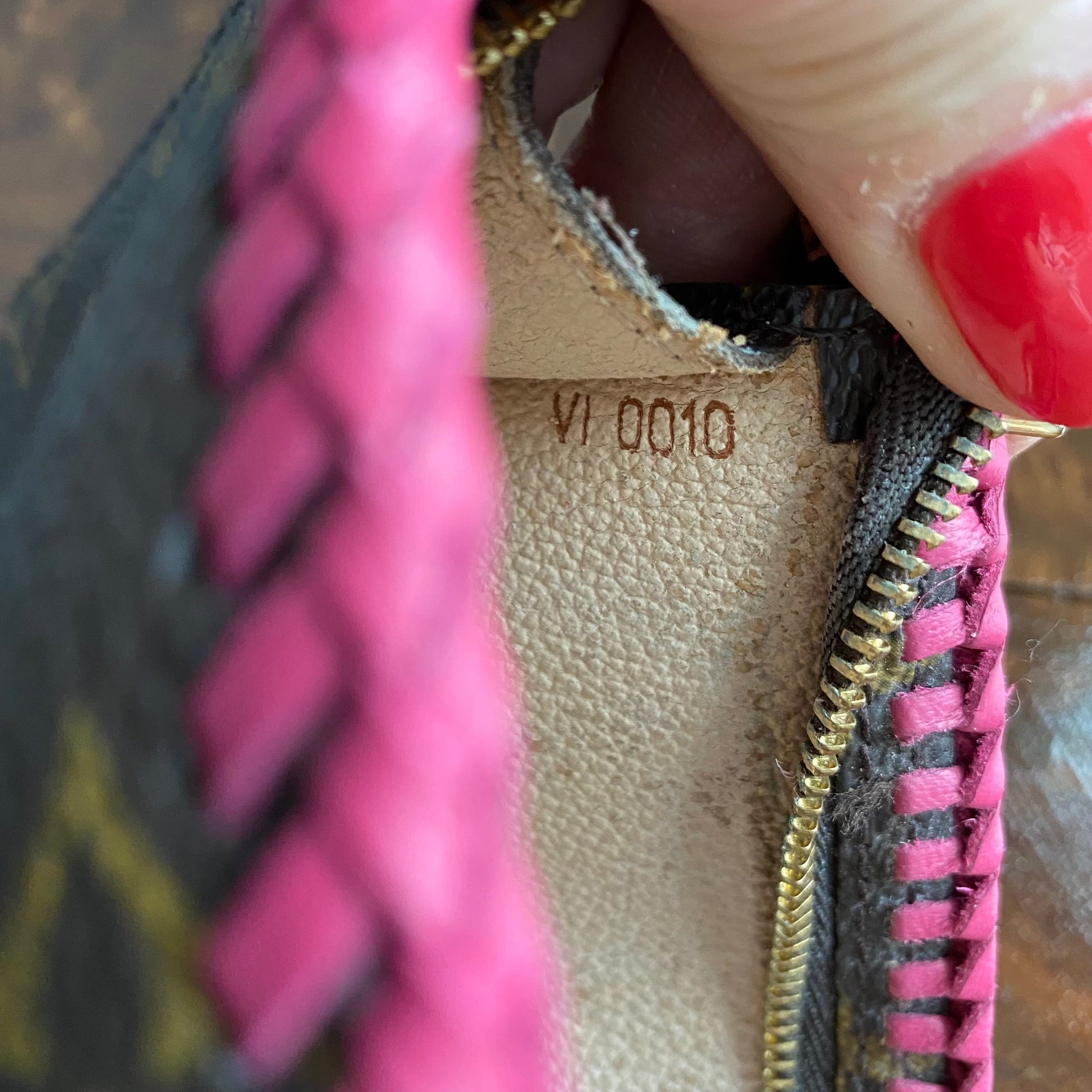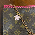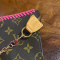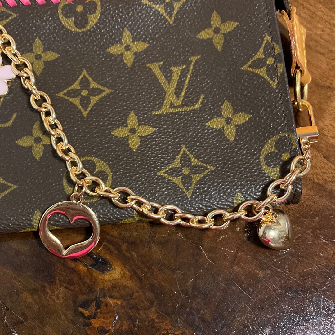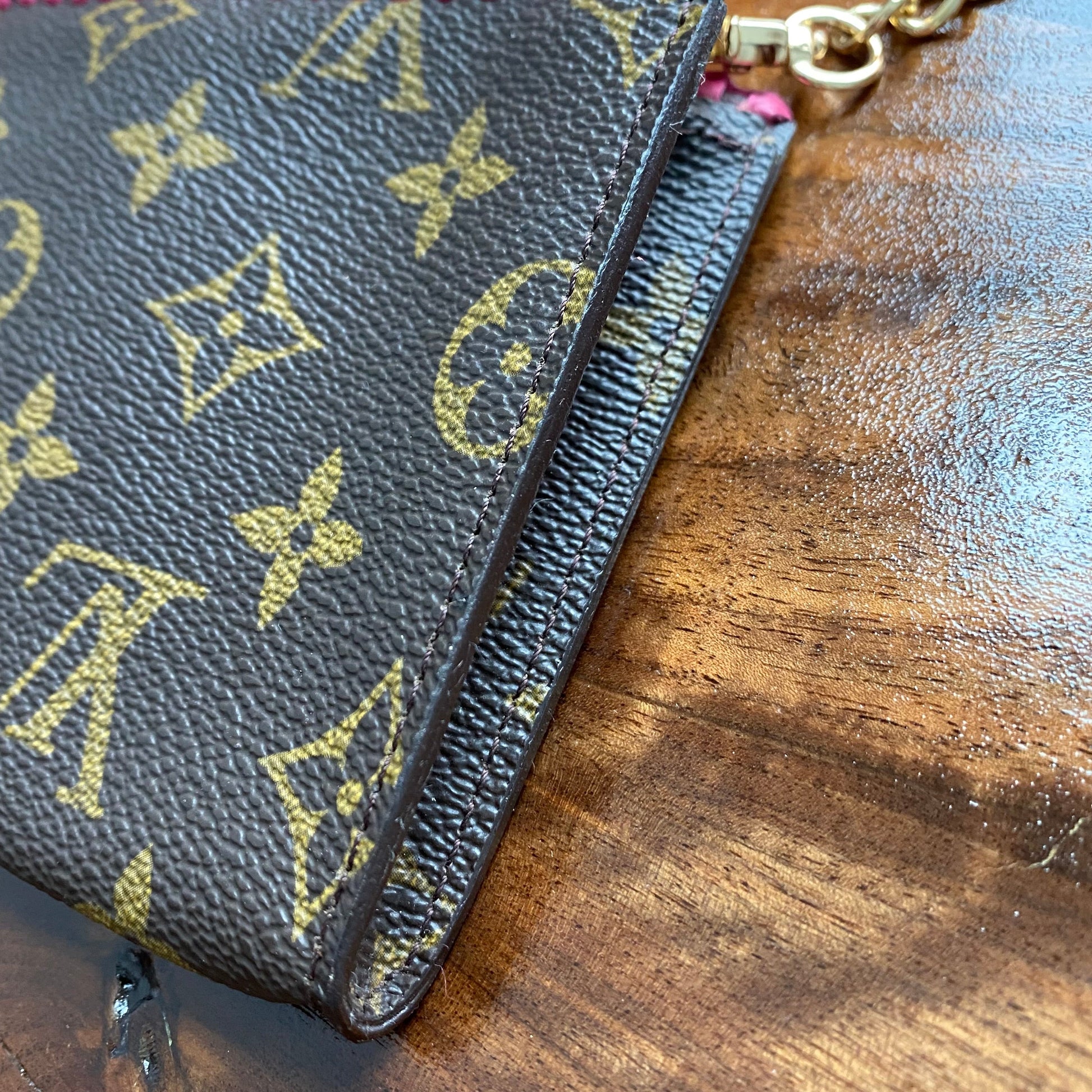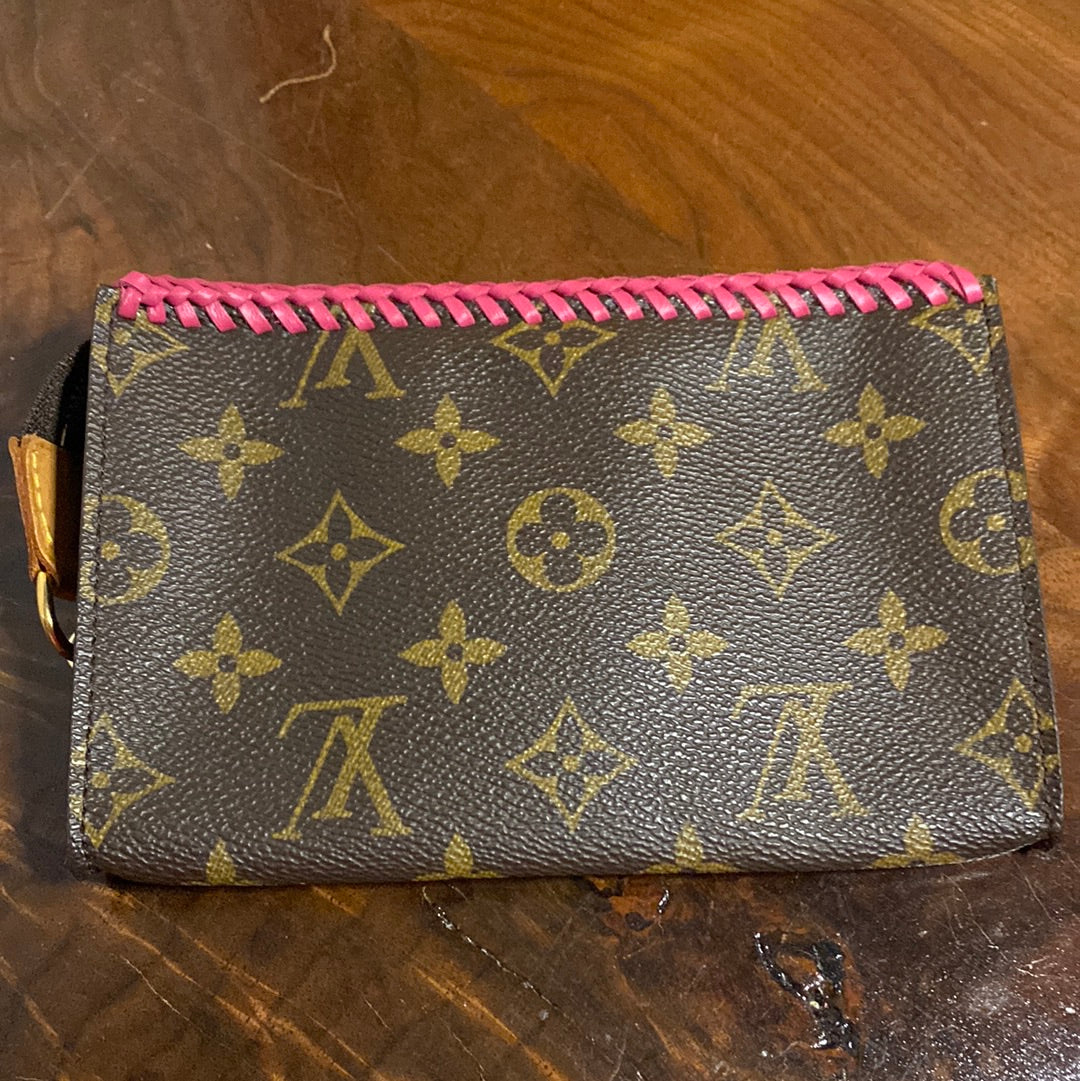 This bag is in GREAT shape, so I added some hot pink leather braiding to the top to give it some flair. The inside Vuittonite (see below) was in decent shape, so I left it alone but added a small amount of talcum powder to keep it from getting sticky. I've also added a 15" gold chain so that you can use it as a wristlet! I can switch out the chain to a longer/different one if you'd like, just message me to get options!!
