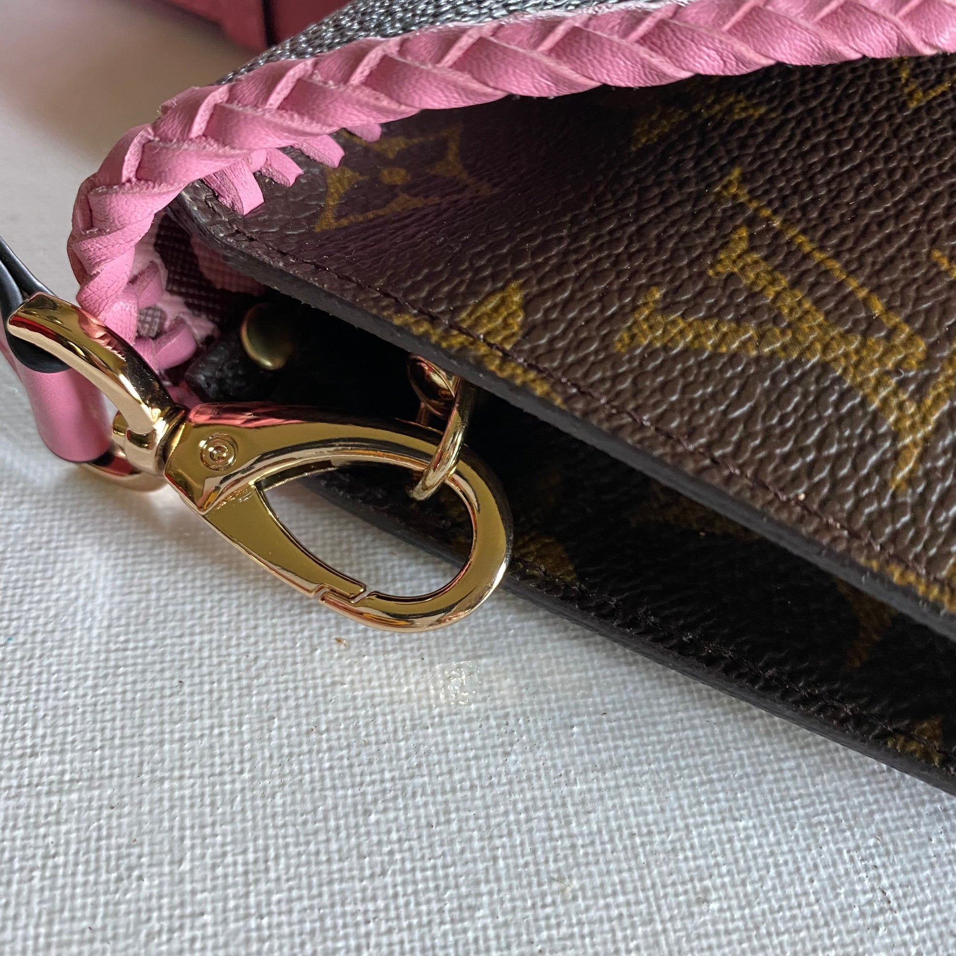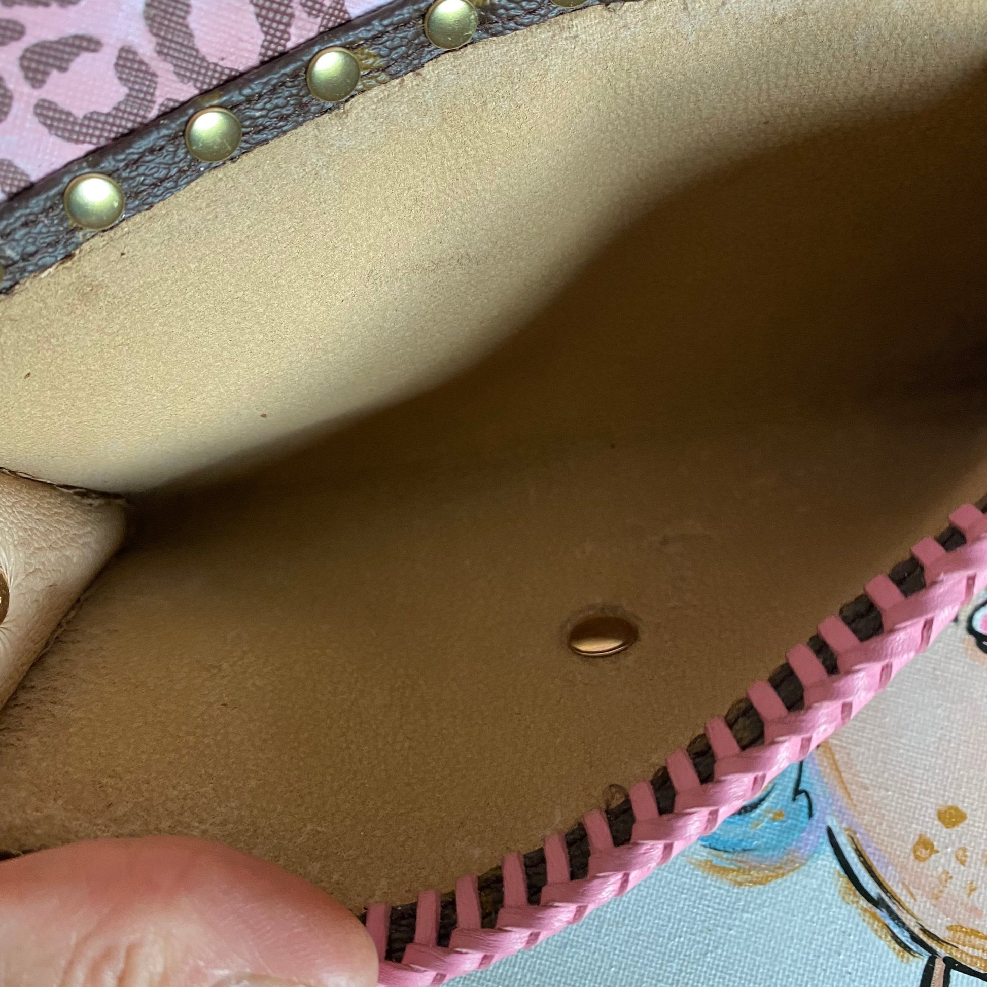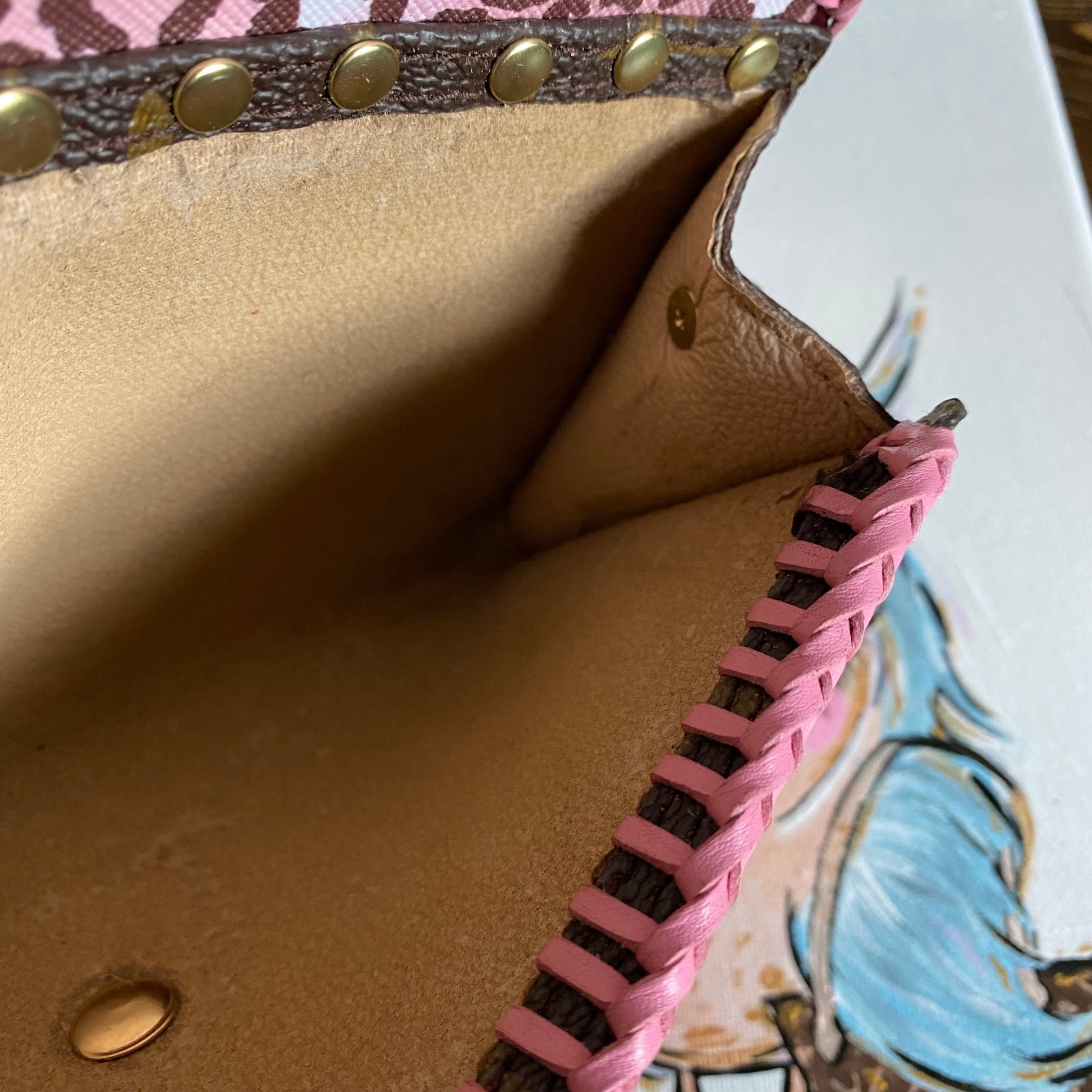 The zipper was missing from this bag, so I added my own flap with pink leather stitching and a fun pop of pink leopard vegan leather inside. The flap has been riveted on the bag with brass rivets. The inside Vuittonite (see below) was in poor shape, so I scrubbed it out, leaving a soft flannel-like liner.