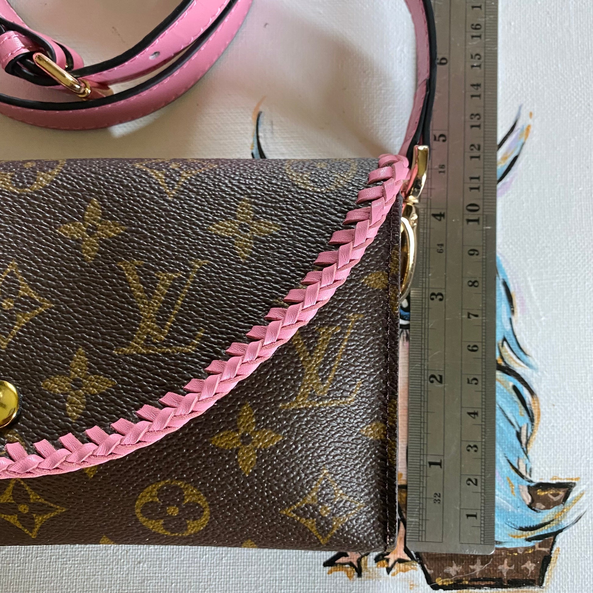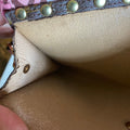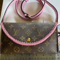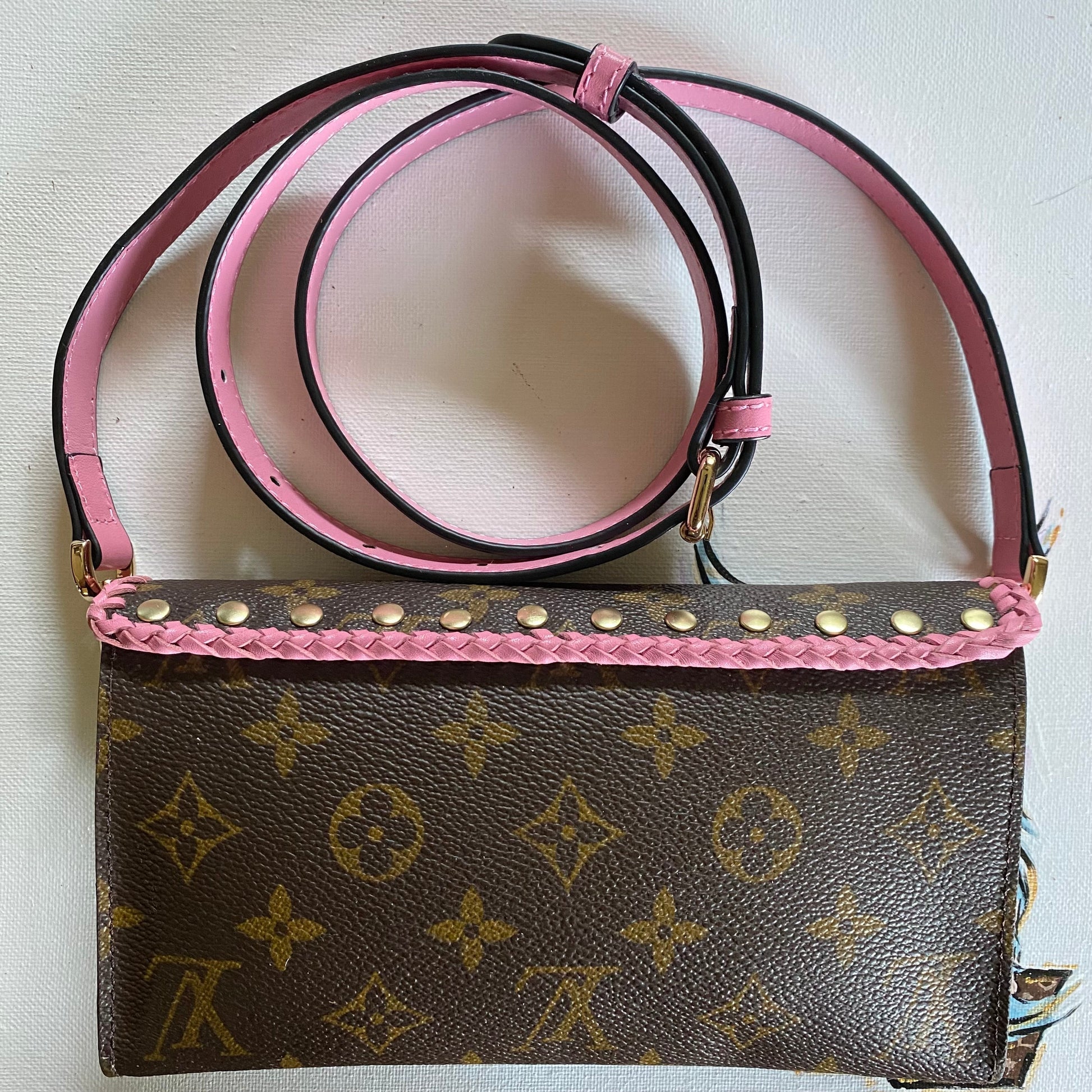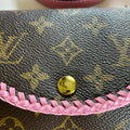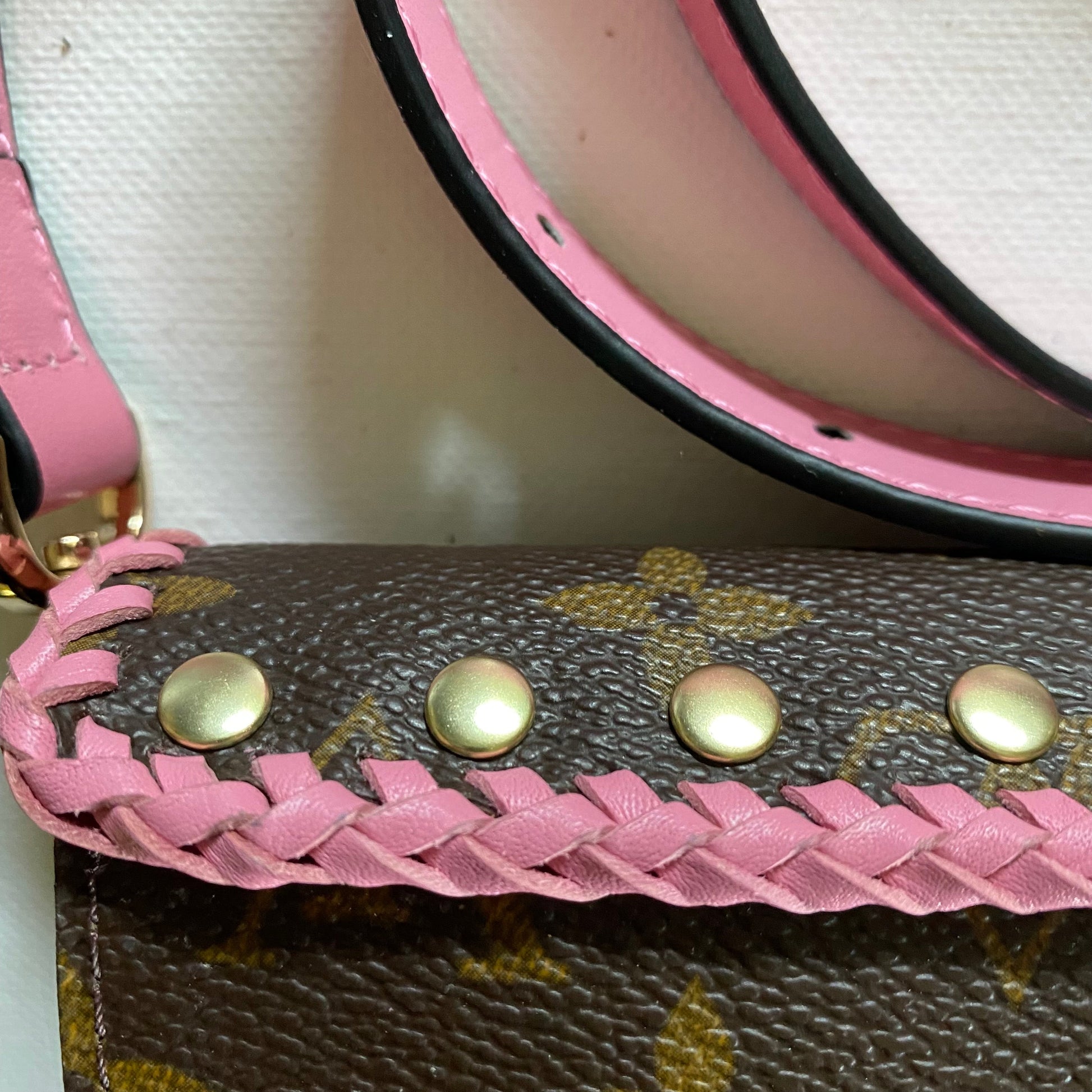 The zipper was missing from this bag, so I added my own flap with pink leather stitching and a fun pop of pink leopard vegan leather inside. The flap has been riveted on the bag with brass rivets. The inside Vuittonite (see below) was in poor shape, so I scrubbed it out, leaving a soft flannel-like liner.