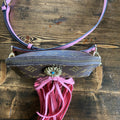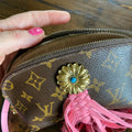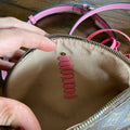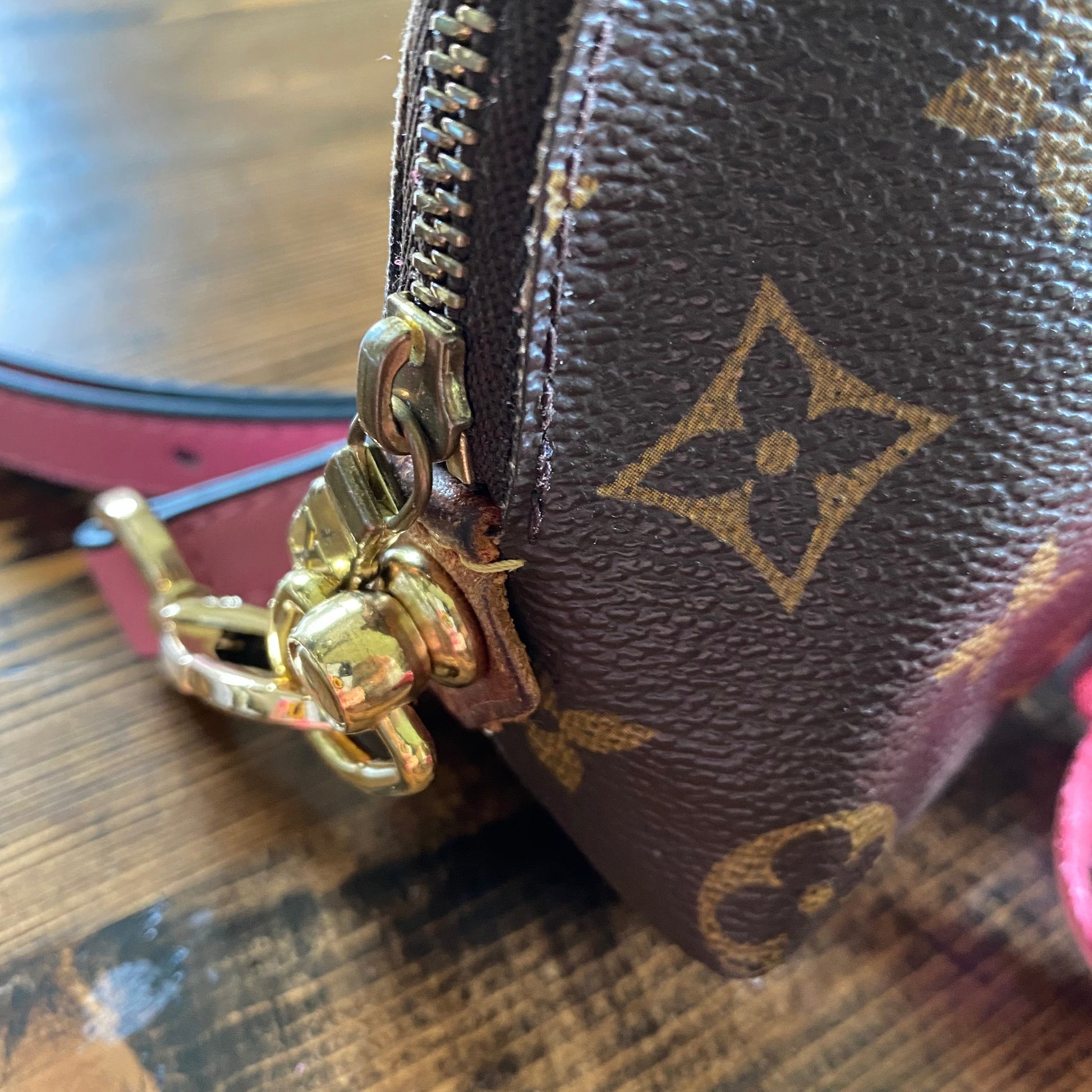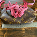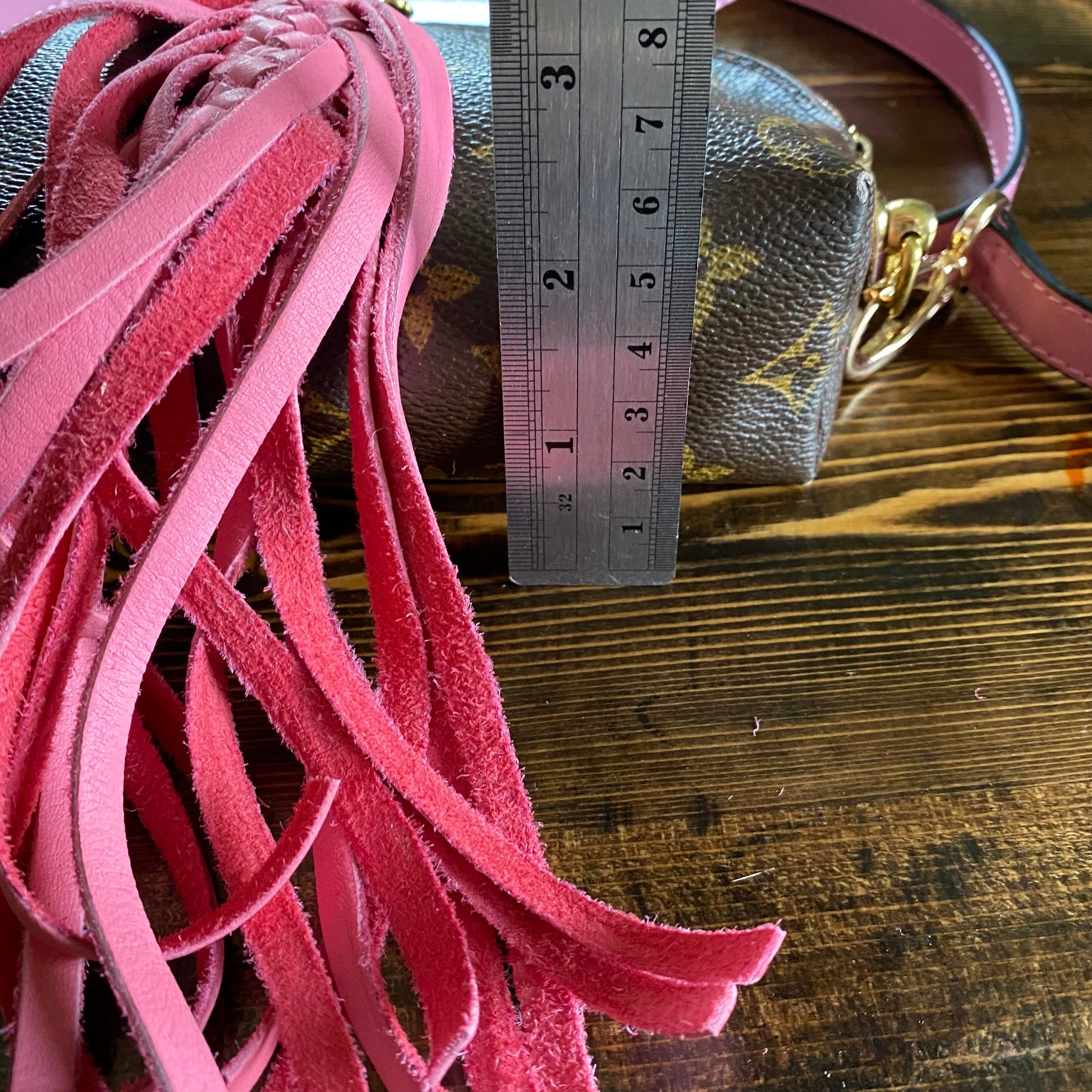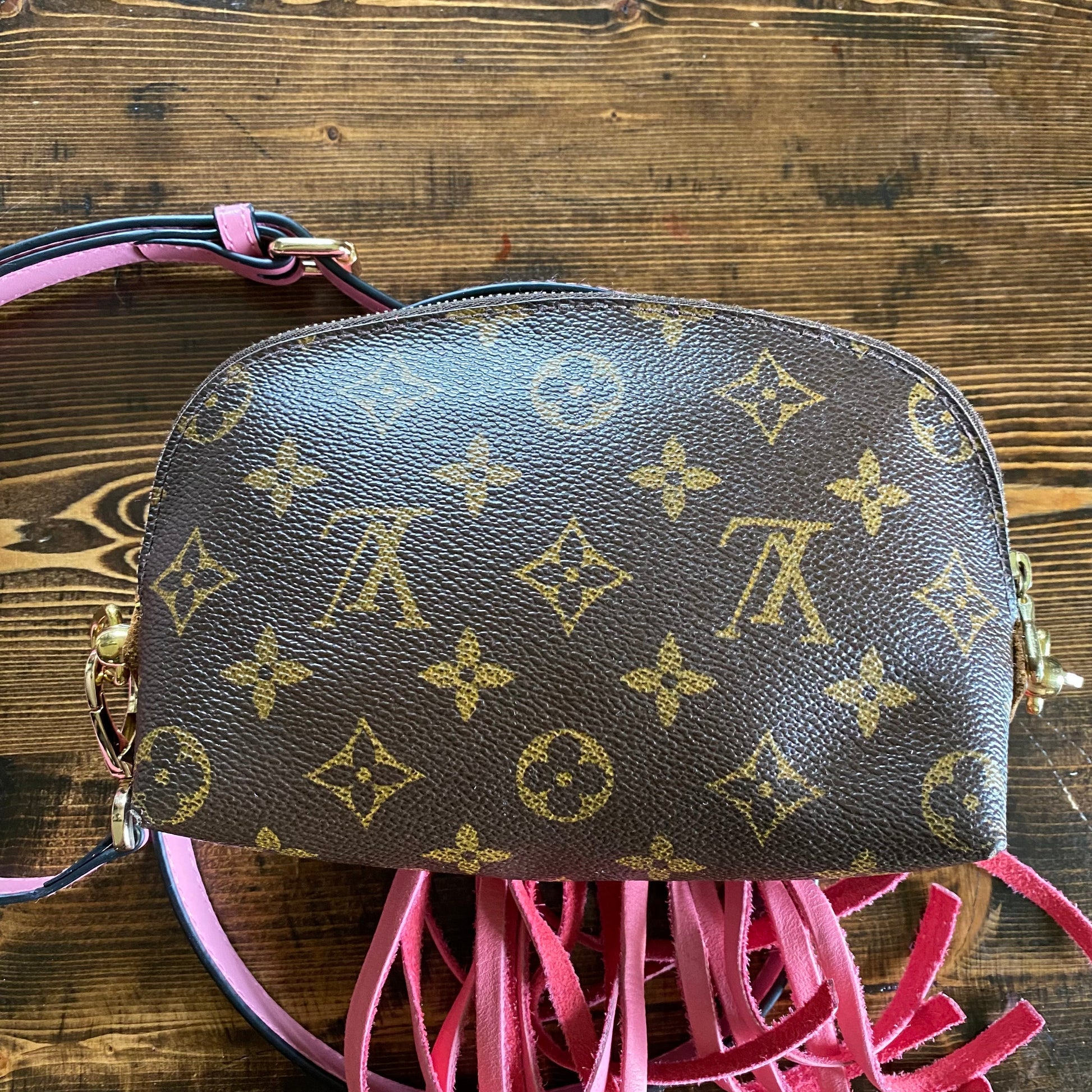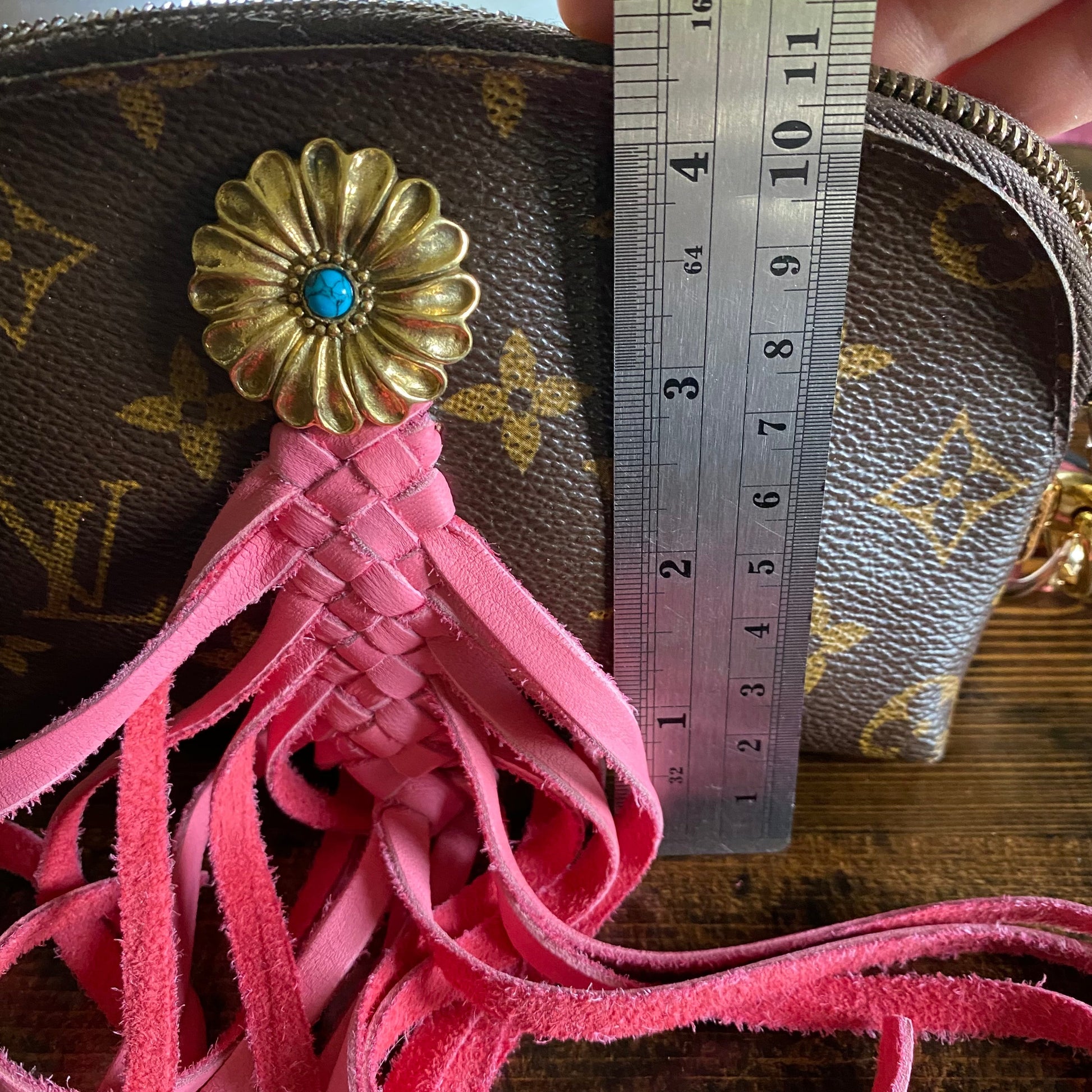 The Vuittonite (see below) inside was in decent shape, so I did a quick cleaning, but some of the marks didn't come out. It doesn't seem to be sticky at all. The zipper is fully functional. I added some braided pink fringe to the outside and a beautiful brass flower concho with a turquoise stone center. (The concho can always be switched out for something different, if desired...just contact me for options!!!) I've added brass D-rings to the sides and attached a pink leather adjustable strap (39-49").