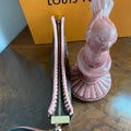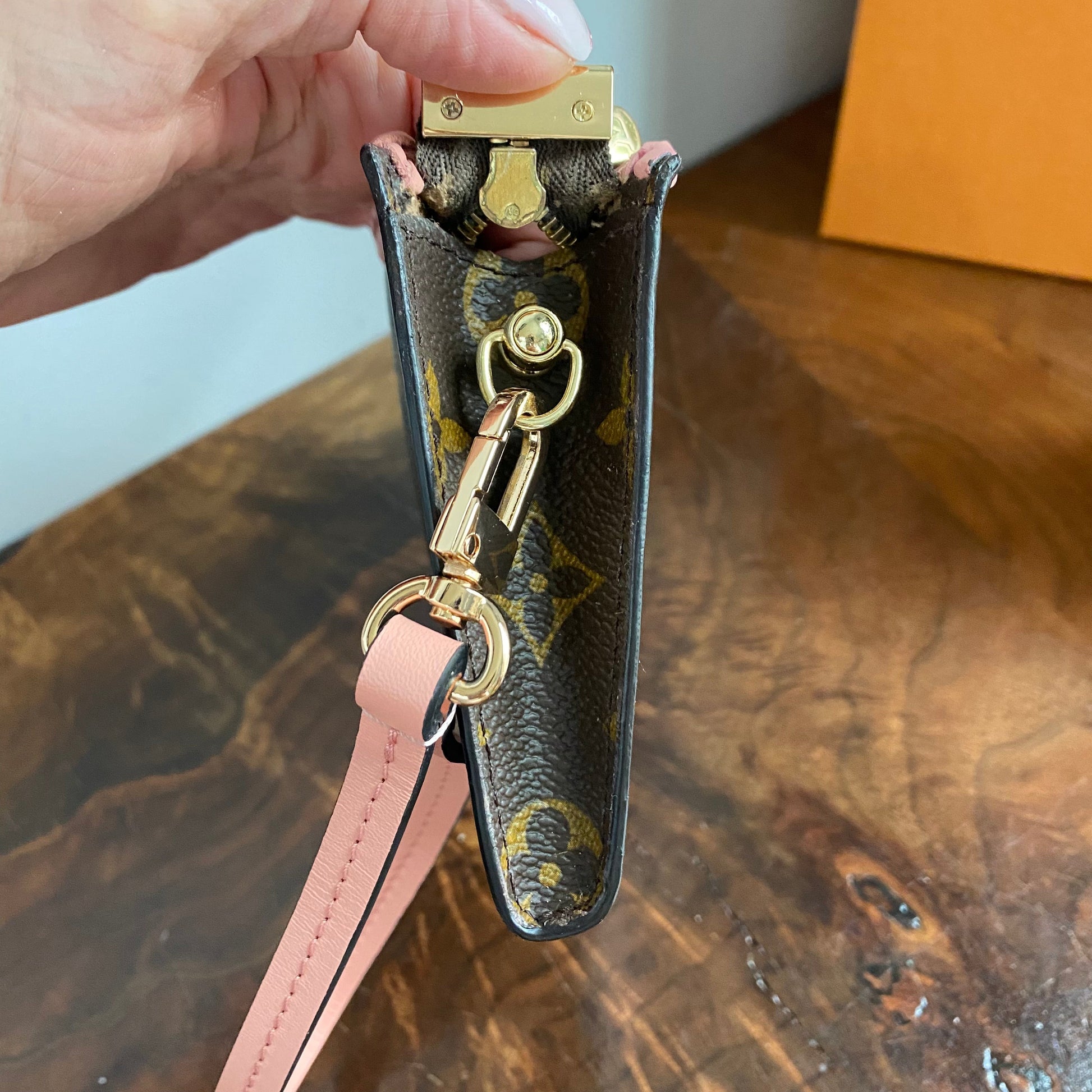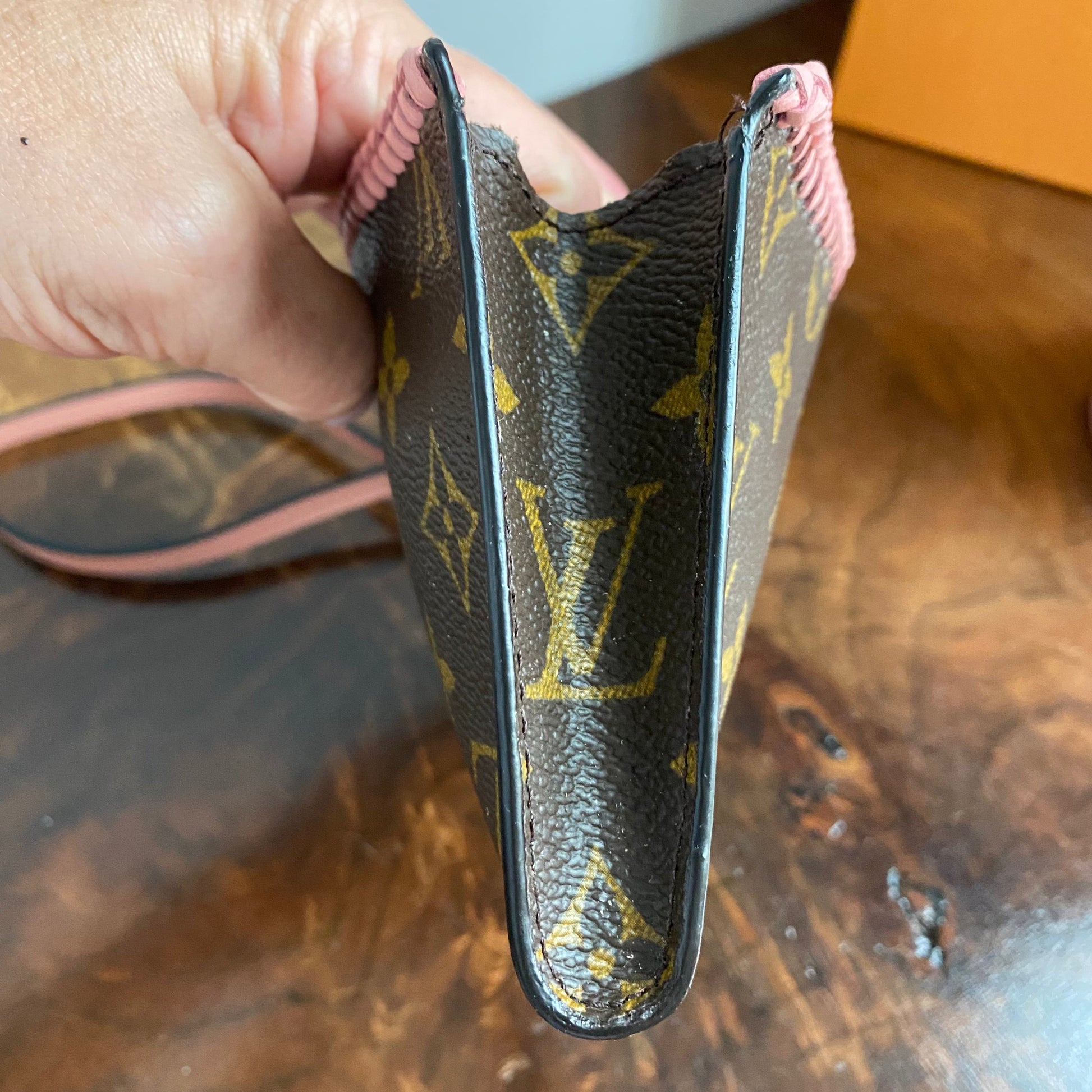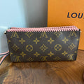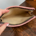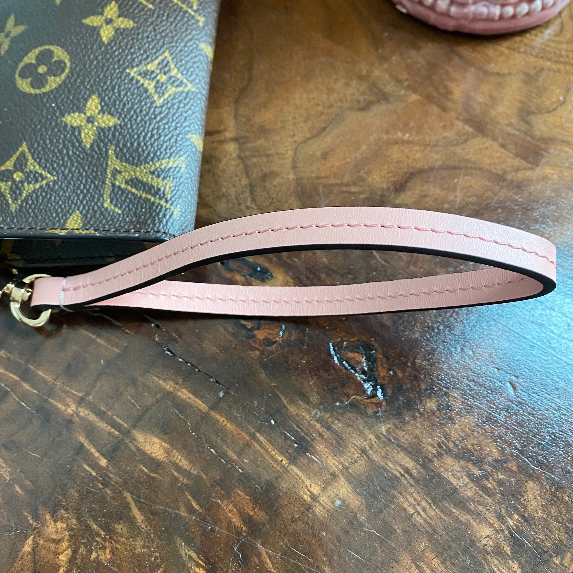 This canvas on this bag is in great shape, so I added some pale pink leather braiding to the top to give it some flair. The inside Vuittonite (see below) was a sticky mess, so I scrubbed it out, leaving a soft flannel interior. The zipper pull and end leather pull was missing, so I added another LV pull, and capped the end of the zipper with a brass bar. The zipper has been polished and now functions great. I re-coated the sides of the bag so that it now looks brand new!! I also added a small D-ring to the end so that I could attach the matching pale pink wristlet strap.