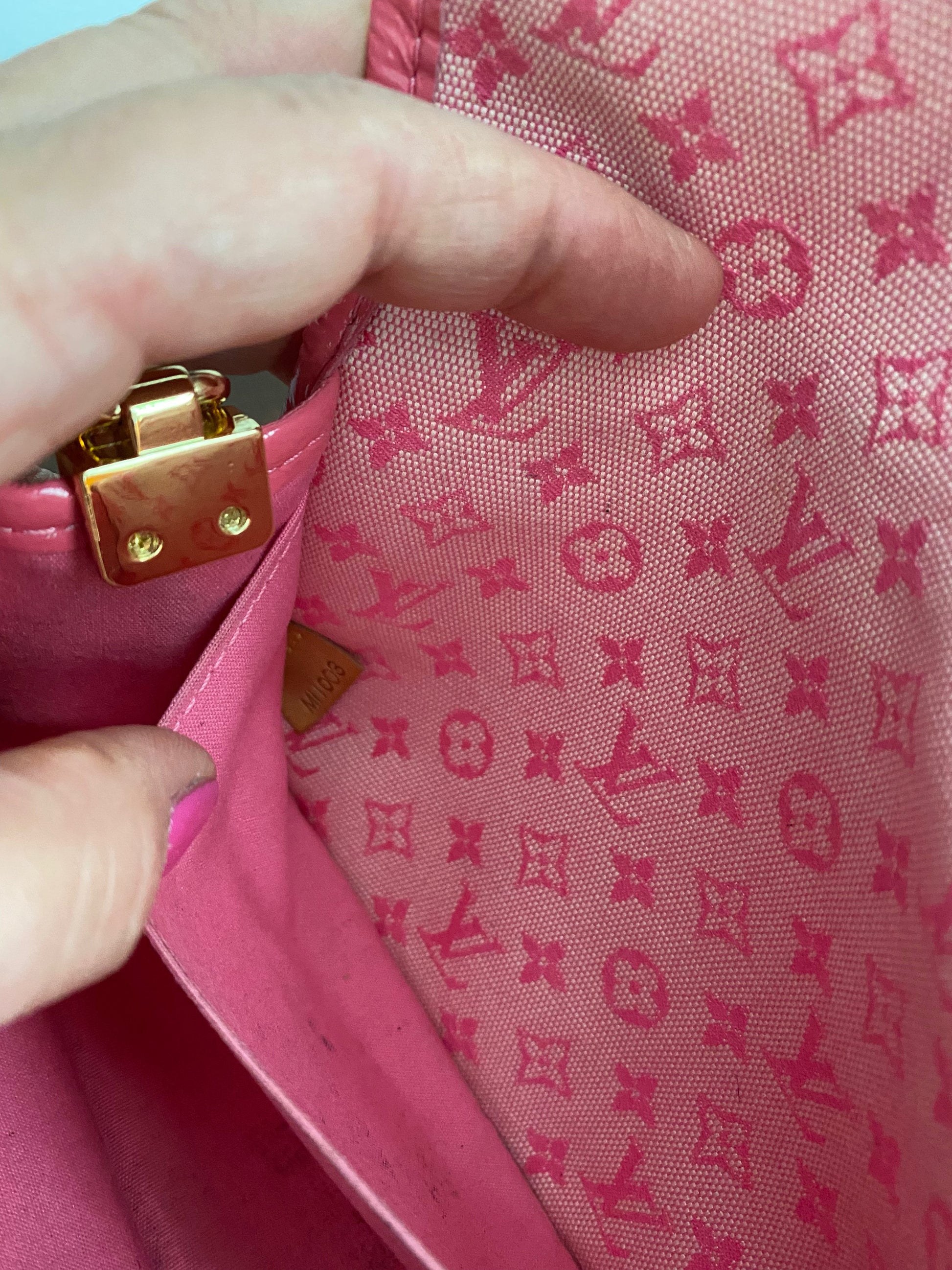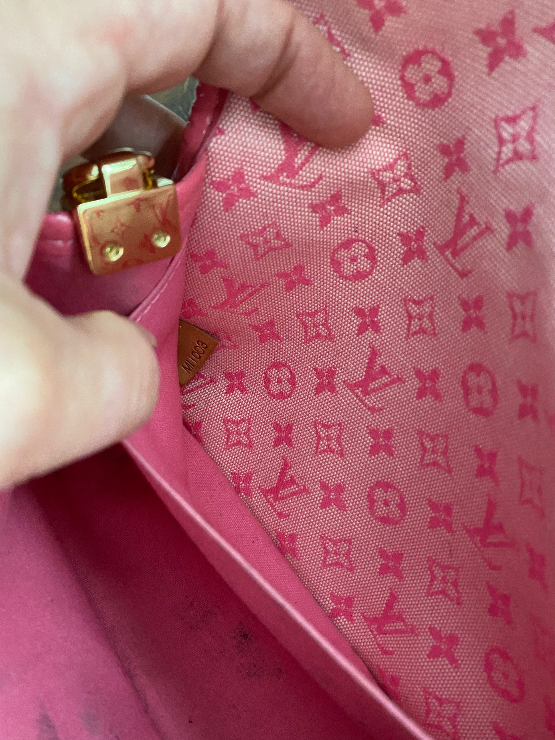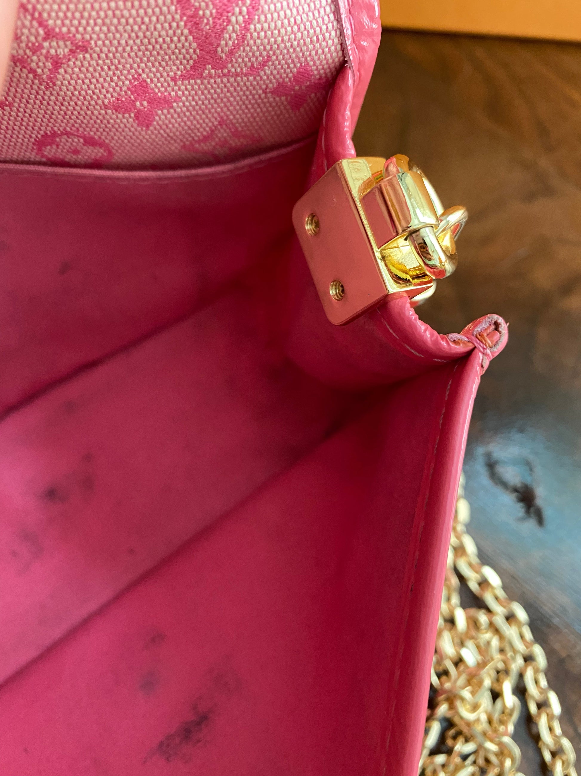 The pink exterior canvas is super clean, and the pink patent leather piping is perfect. There is a slight discoloration of the pink snap in the front, but only if you study it very closely. The interior has been scrubbed and cleaned up, however, there are some marks that remain inside. In order to make this bag a little more useable, I added D-rings to the sides of the bag. Now, when I added them, I screwed them into another piece of leather, pinching the sides of the bag, but essentially leaving the bag intact. This means, the D-rings can be removed and the bag can be sold as original.