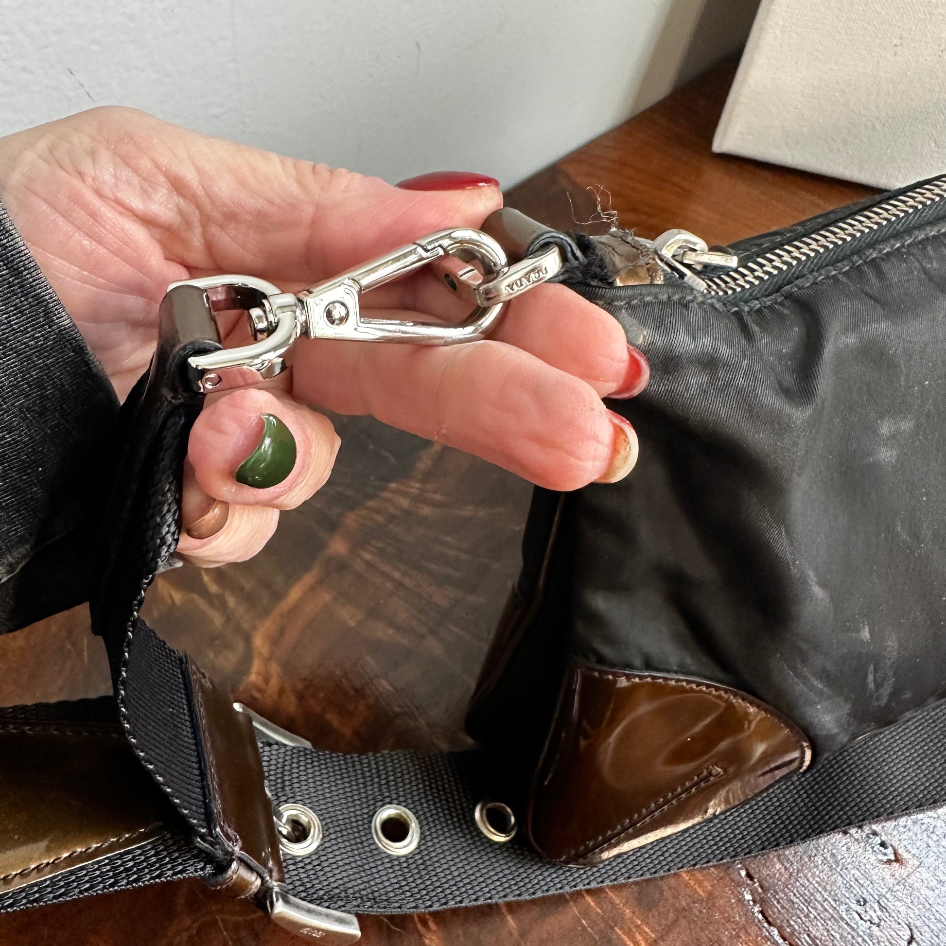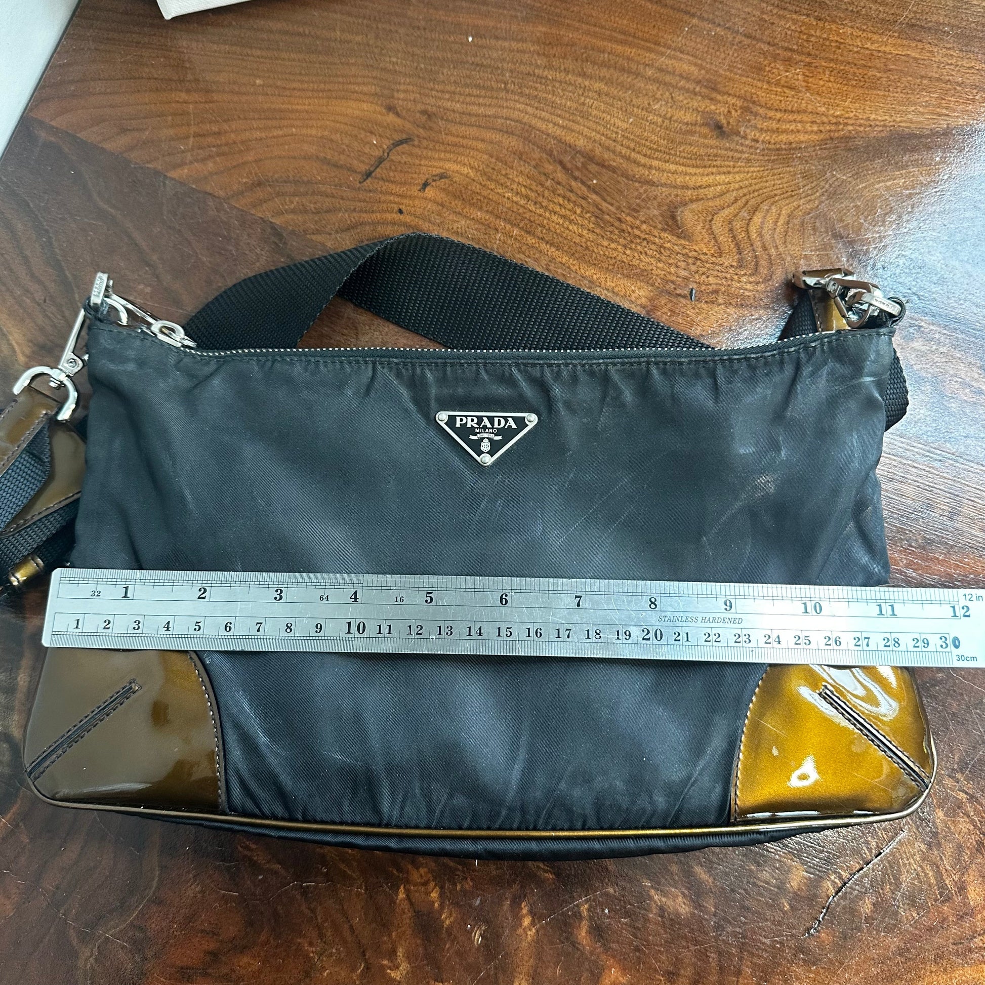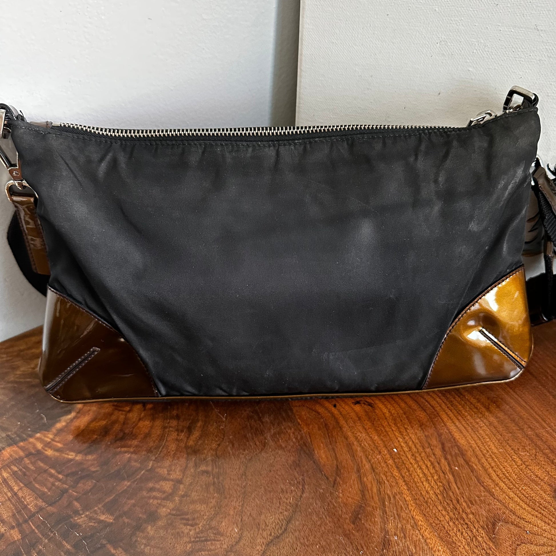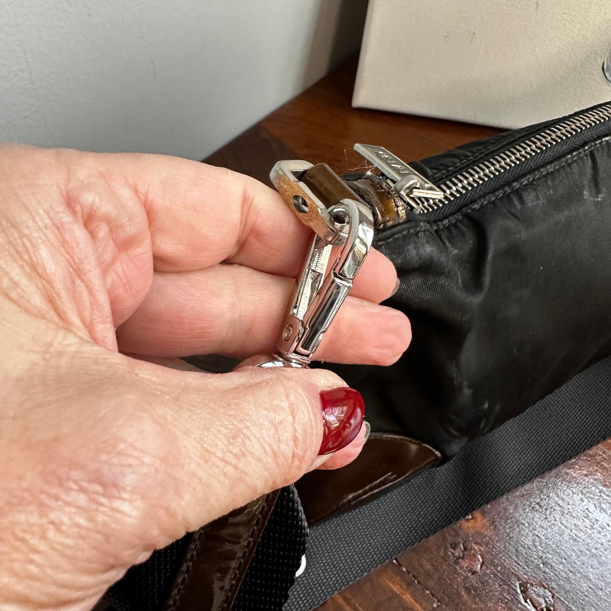 This Prada bag is black nylon and a bronze patent leather, and is the perfect size, coming in at 11" wide by 6.5" tall and about 2" deep. It has a large roomy interior with a smaller interior zippered pocket. The zipper pull was boring so I added a new (old) one that looks so much better. The strap hardware was damaged, so I had to remove it and replace it with new silver hardware. I left the Prada-embossed D-rings on the bag to connect it to. The strap is super comfortable, with a minimum of 13" drop, perfect for tucking this little Prestige Totes under your arm.