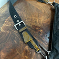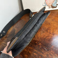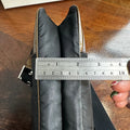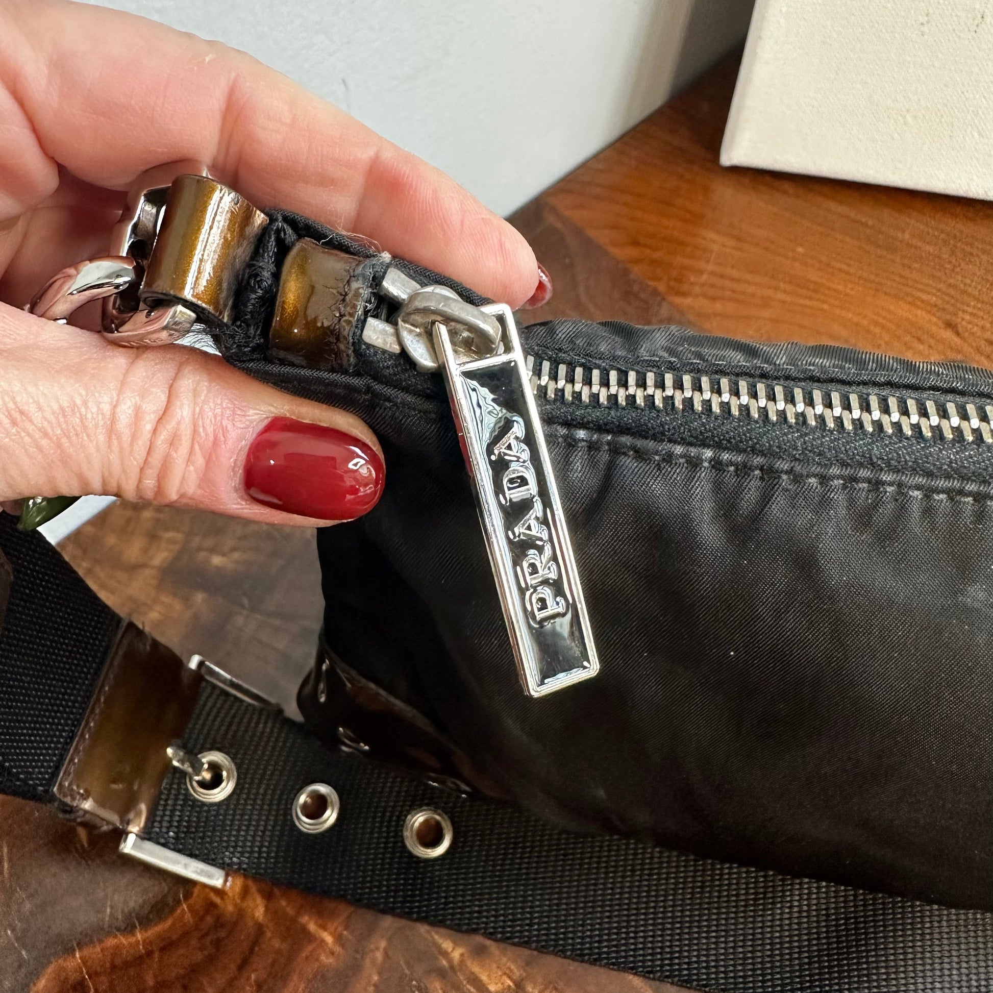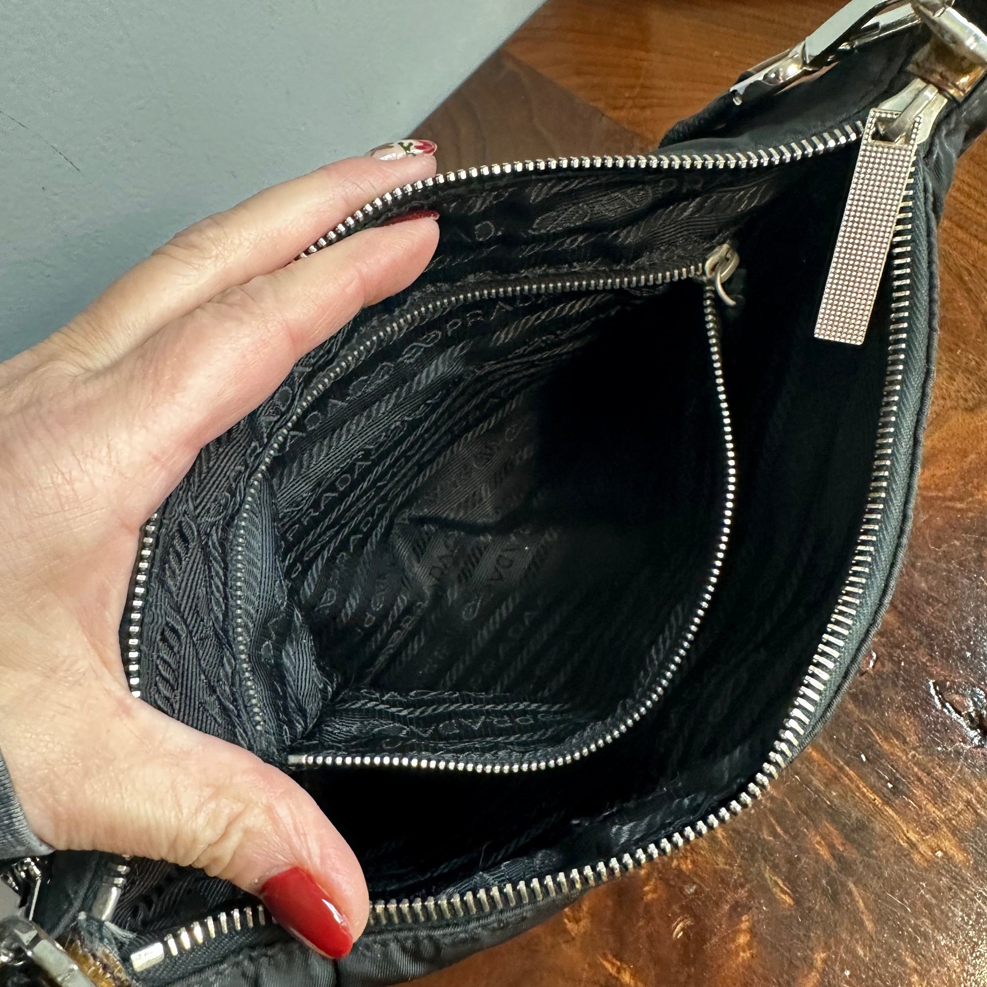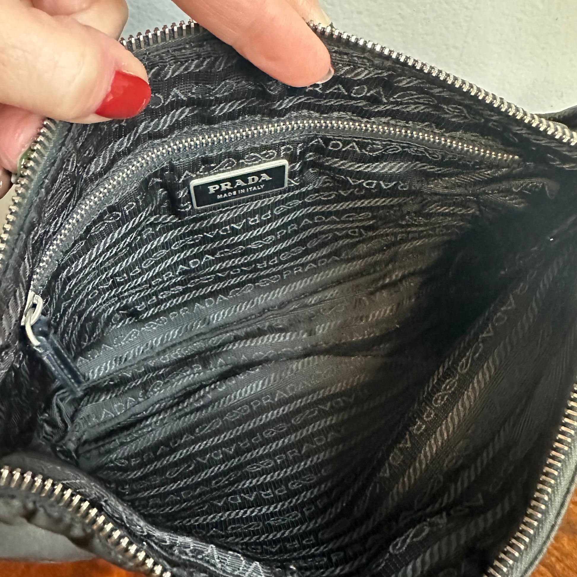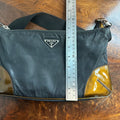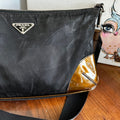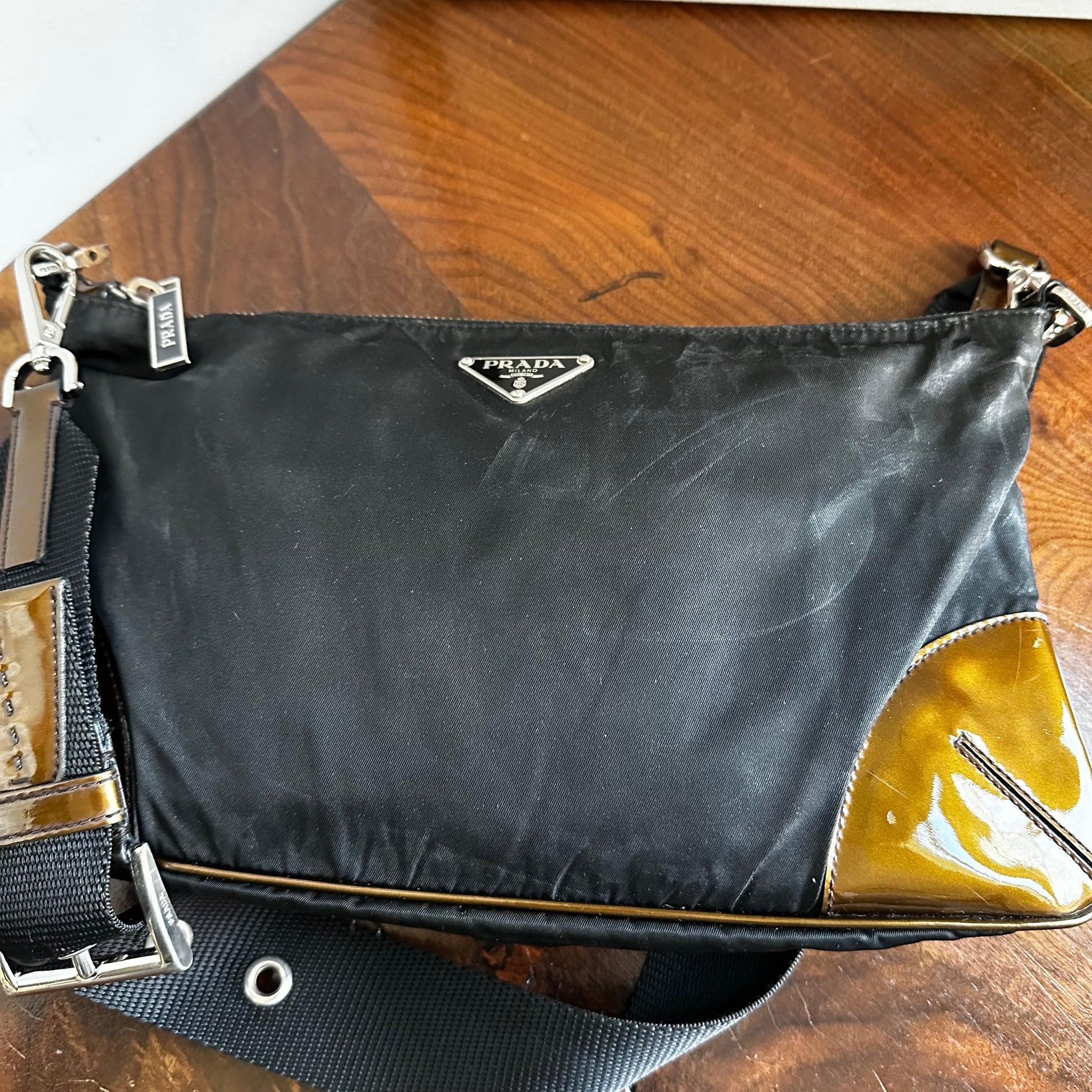 This Prada bag is black nylon and a bronze patent leather, and is the perfect size, coming in at 11" wide by 6.5" tall and about 2" deep. It has a large roomy interior with a smaller interior zippered pocket. The zipper pull was boring so I added a new (old) one that looks so much better. The strap hardware was damaged, so I had to remove it and replace it with new silver hardware. I left the Prada-embossed D-rings on the bag to connect it to. The strap is super comfortable, with a minimum of 13" drop, perfect for tucking this little Prestige Totes under your arm.