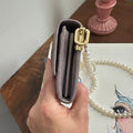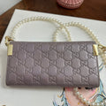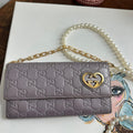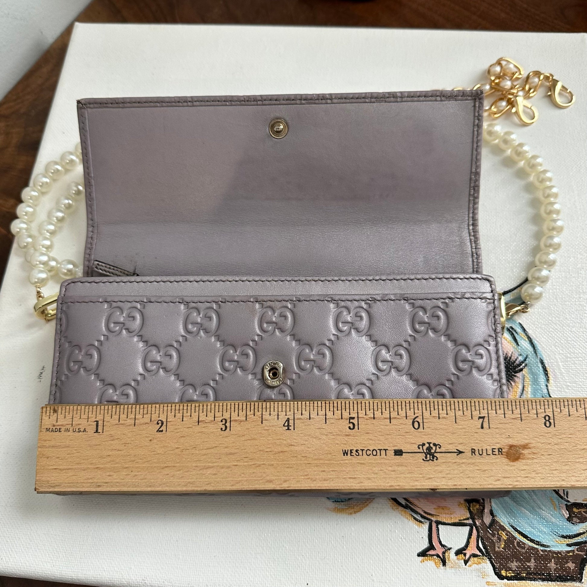 The entire wallet was thoroughly cleaned and the leather was touched up and re-conditioned. Guccissima leather is sooooo beautiful!! The metal GG heart on the front is a bit worn but still looks great. The inside is super clean. The snap has been bent, but it still functions great. The wallet opens wide and has credit card slots on both sides, with a zippered pocket in the middle. It will fit an iPhone 14Pro. I've added side D-rings to the bag and attached an adorable pearl strap. One of them is 39" long, but if you hook both together, it's 48" long. She's gonna be a great Valentine's Day bag!