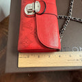 This wallet opens with a beautiful silver clasp that is in great shape, with barely any scratches. It has several areas for credit cards, one slot for bills, and a large zipper pocket for change, keys, etc. The entire wallet was thoroughly cleaned and redyed to the beautiful red it is. There is a little bit of wear on the edges (see pics). I've recoated the edges black where the edging had faded. She looks gorgeous now! I've added silver d-rings to the back and attached a black and silver crossbody chain that is 48" long. (I also have this strap in matching red (see last pic) if you’d prefer…just send a note when checking out).