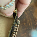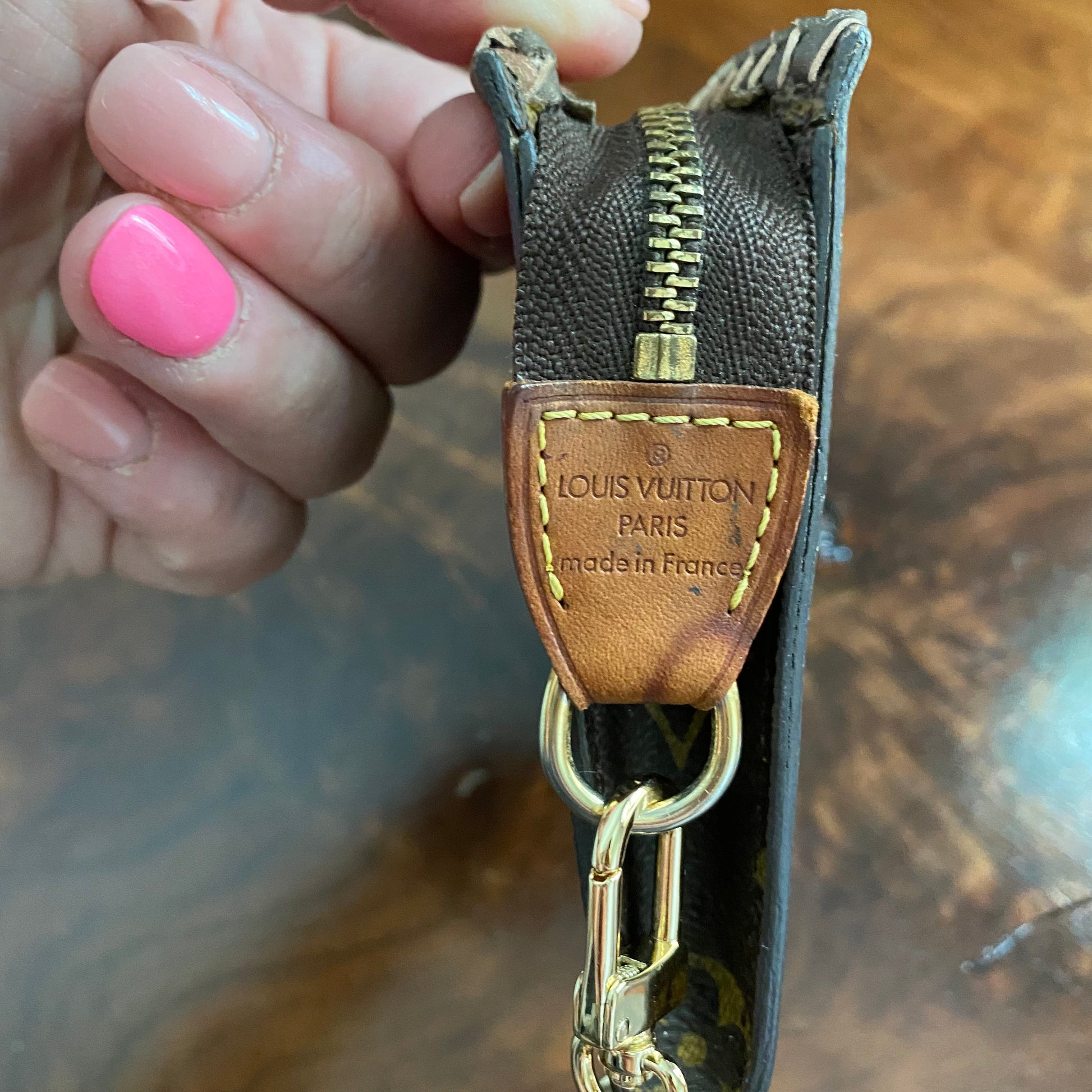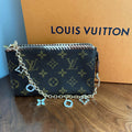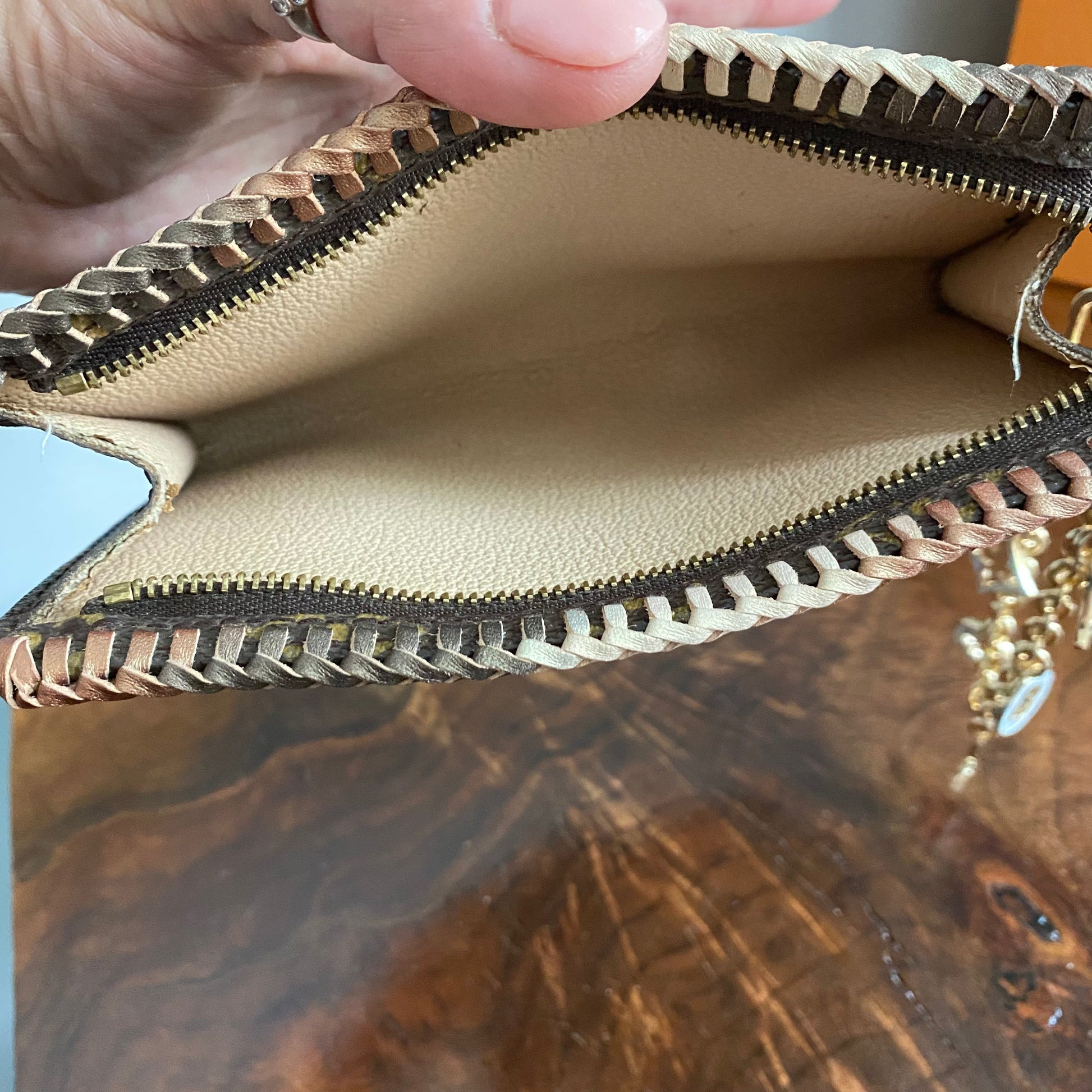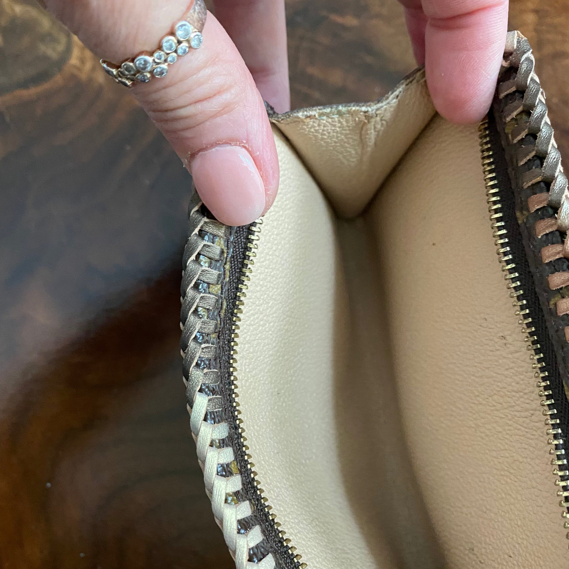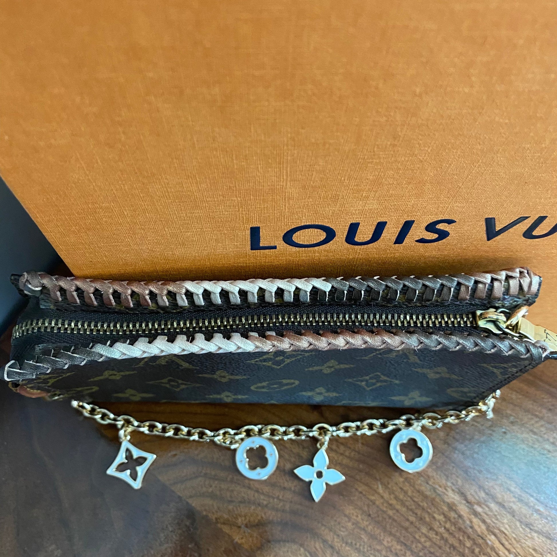 The top edge is an ombre brown leather lace which has been stitched by hand. I added an "LV-like" chain that's perfect for carrying. I can switch out the chain to a longer/different one if you'd like, just message me to get options!!