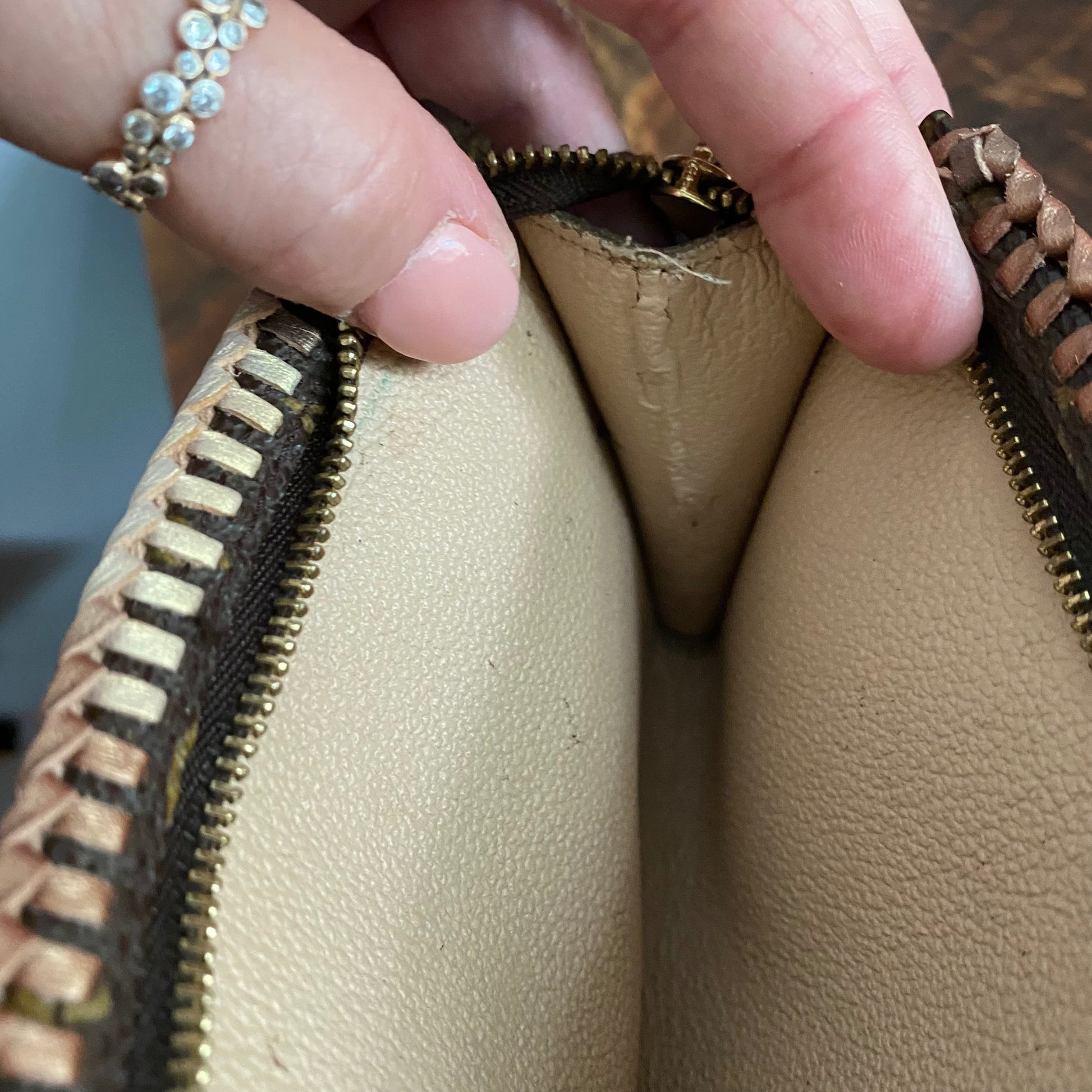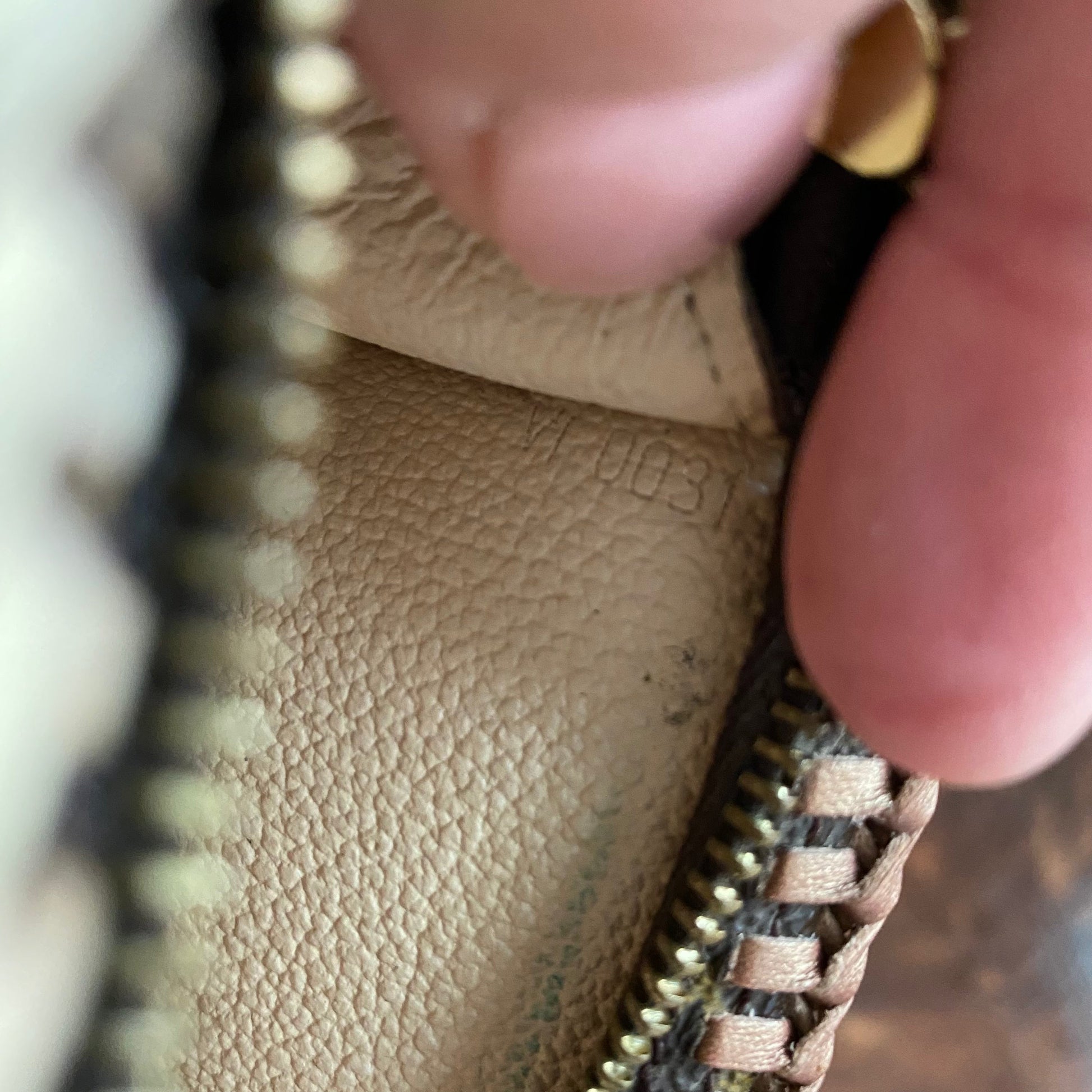About Vuittonite: Prior to 1997, Louis Vuitton lined many of its bags with a vinyl-like material known as Vuittonite. It was used (and patented) by Louis Vuitton because its resistance to water makes it easy to clean. Unfortunately, when exposed to high heat or humidity, Vuittonite begins to deteriorate and peel away from the edges of the bag. Over time, it becomes increasingly sticky, forming a residue (which, in extreme cases, is black in color) that transfers to anything placed inside the bag. If your Vuittonite is starting to get sticky, try putting some talcum powder inside, lightly coating it. It works!!!