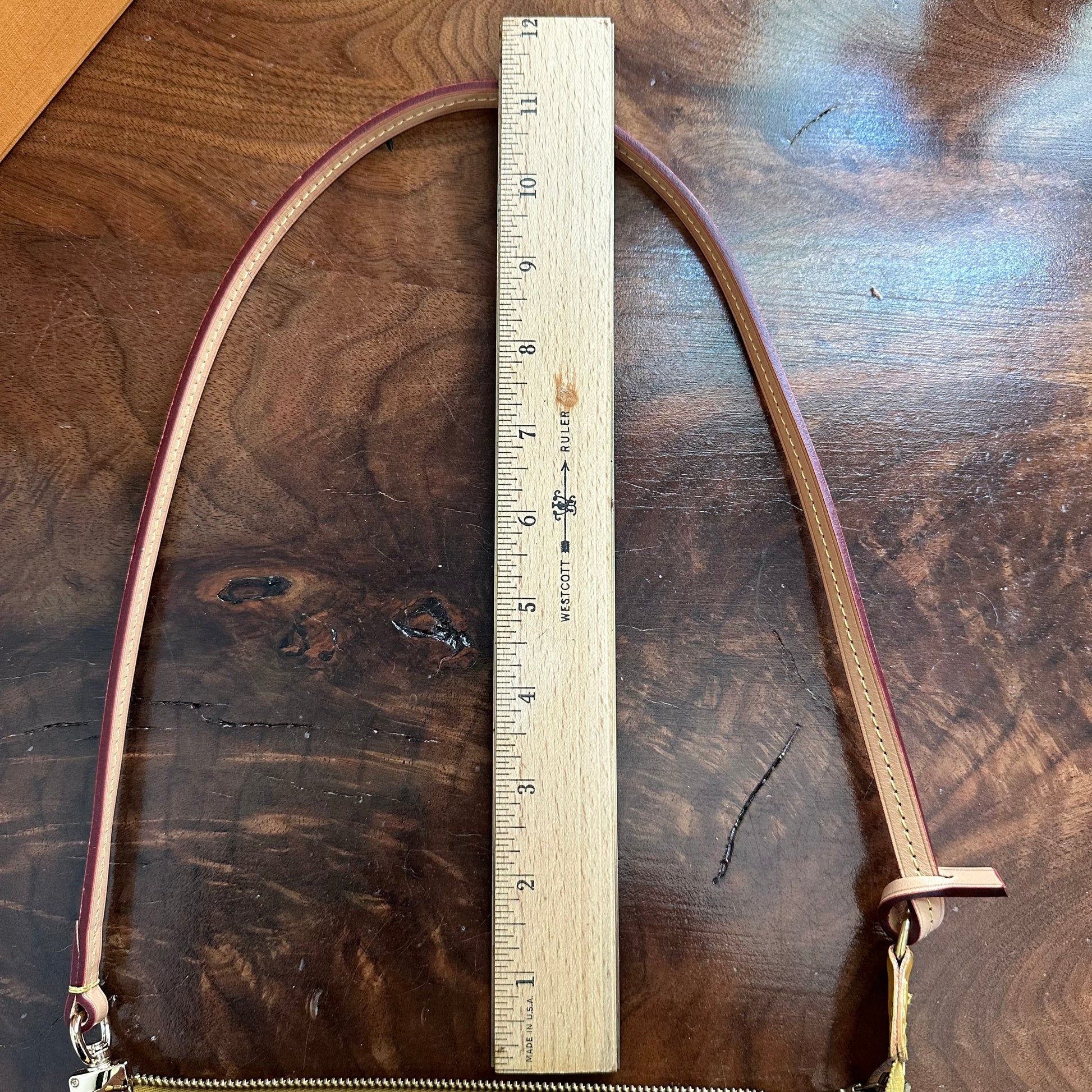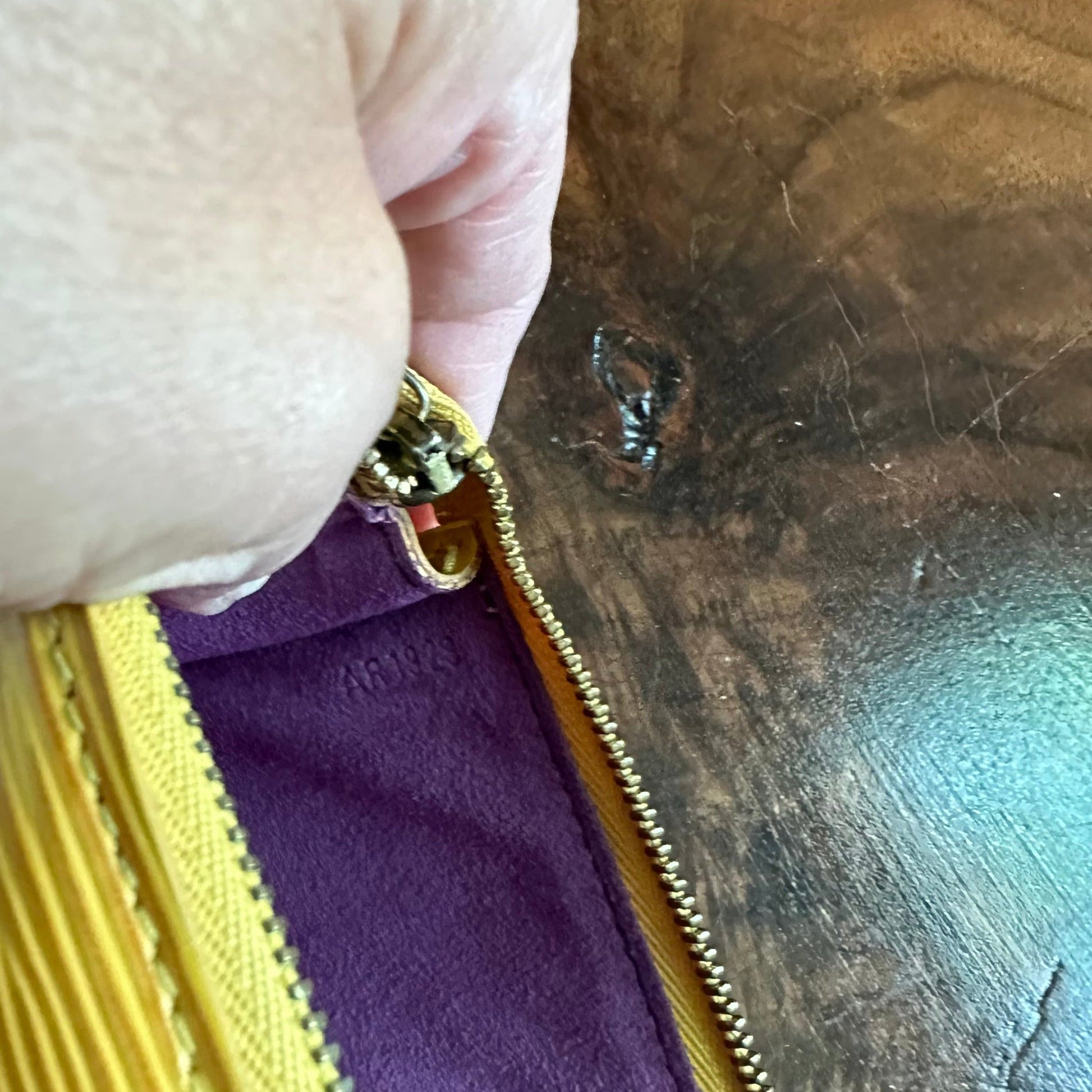 This bag’s exterior leather is in great shape. The edges were a bit worn, so I custom mixed the edge coat to match the bag. They look phenomenal now! The inside has a beautiful pop of purple!! LOVE IT! The original strap was damaged so I've replaced it with a vachetta one that's a little longer. The strap has an 11" drop, perfect for carrying over your shoulder. The zipper pull is a little tarnished, but still works great.