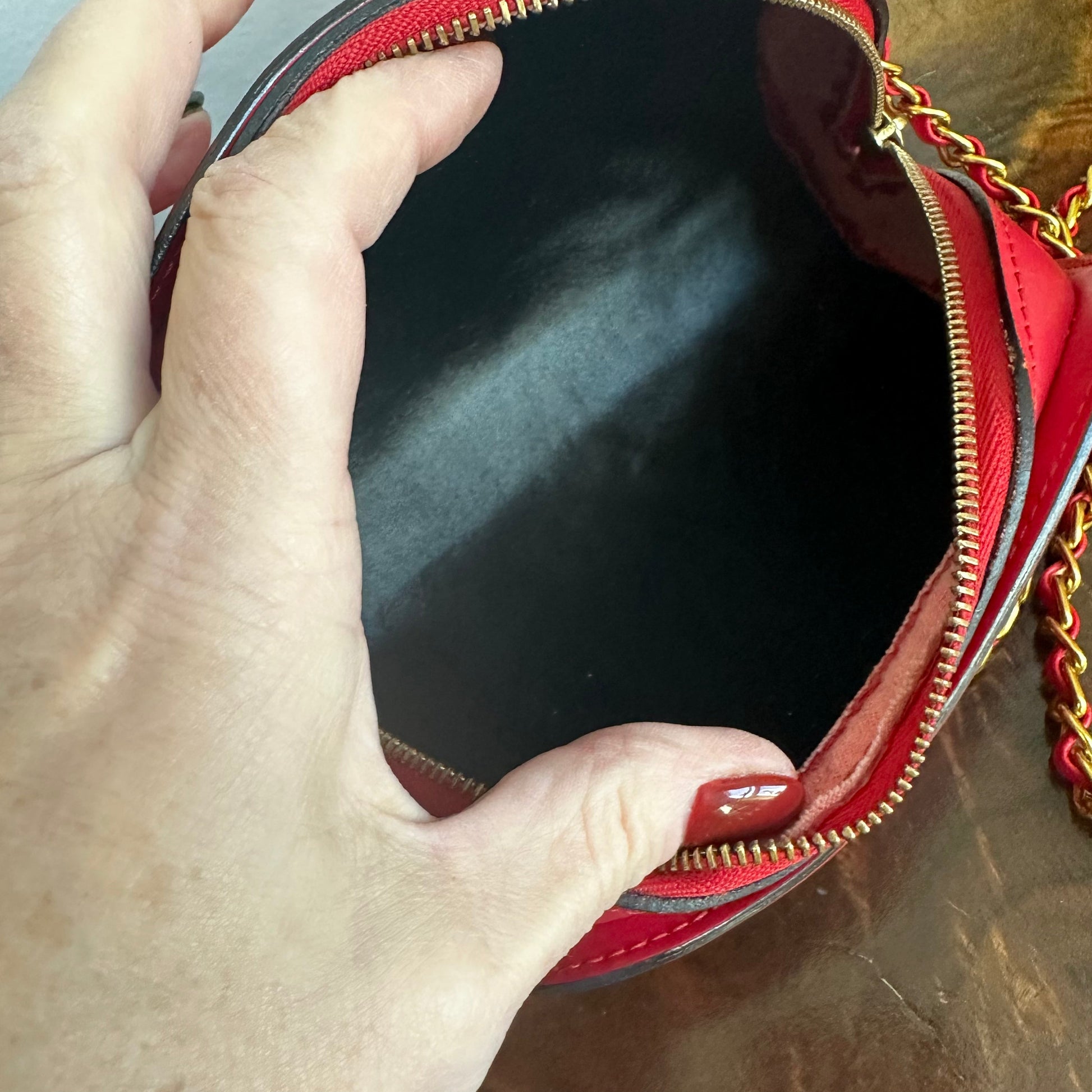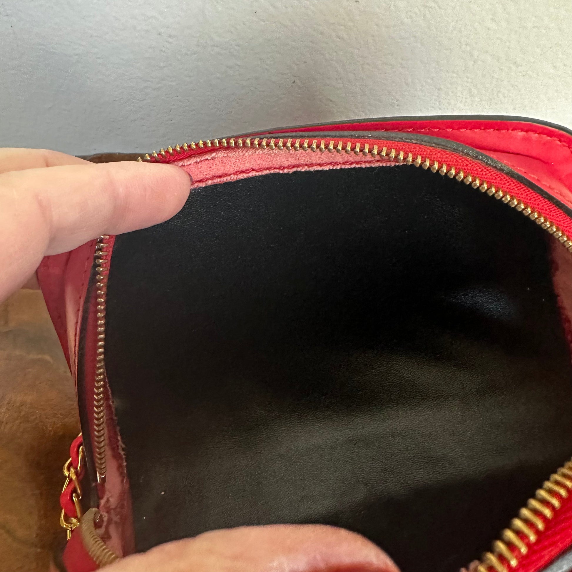 The outside has been cleaned, re-dyed red, and then conditioned. She looks amazing!!! The inside was extremely sticky and could not be cleaned, so I removed it and replaced it with a piece of pleather that can easily be wiped out. I added two brass D-rings to the back and a beautiful brass chain and red leather strap. The strap is 47".