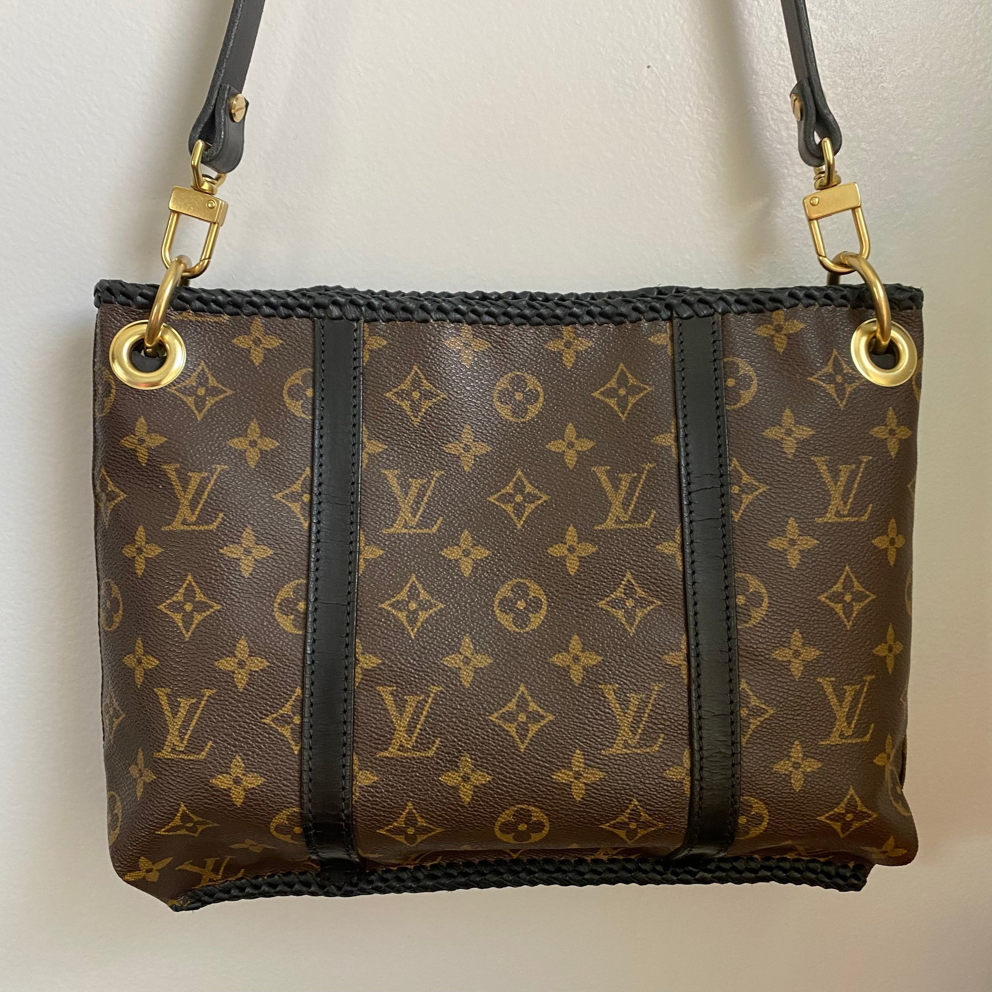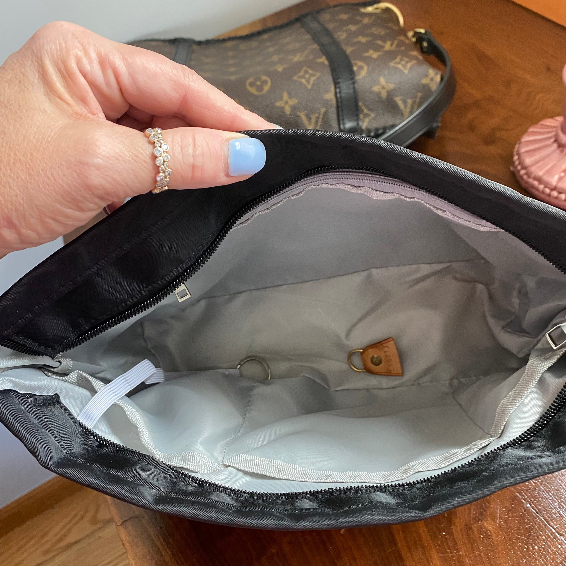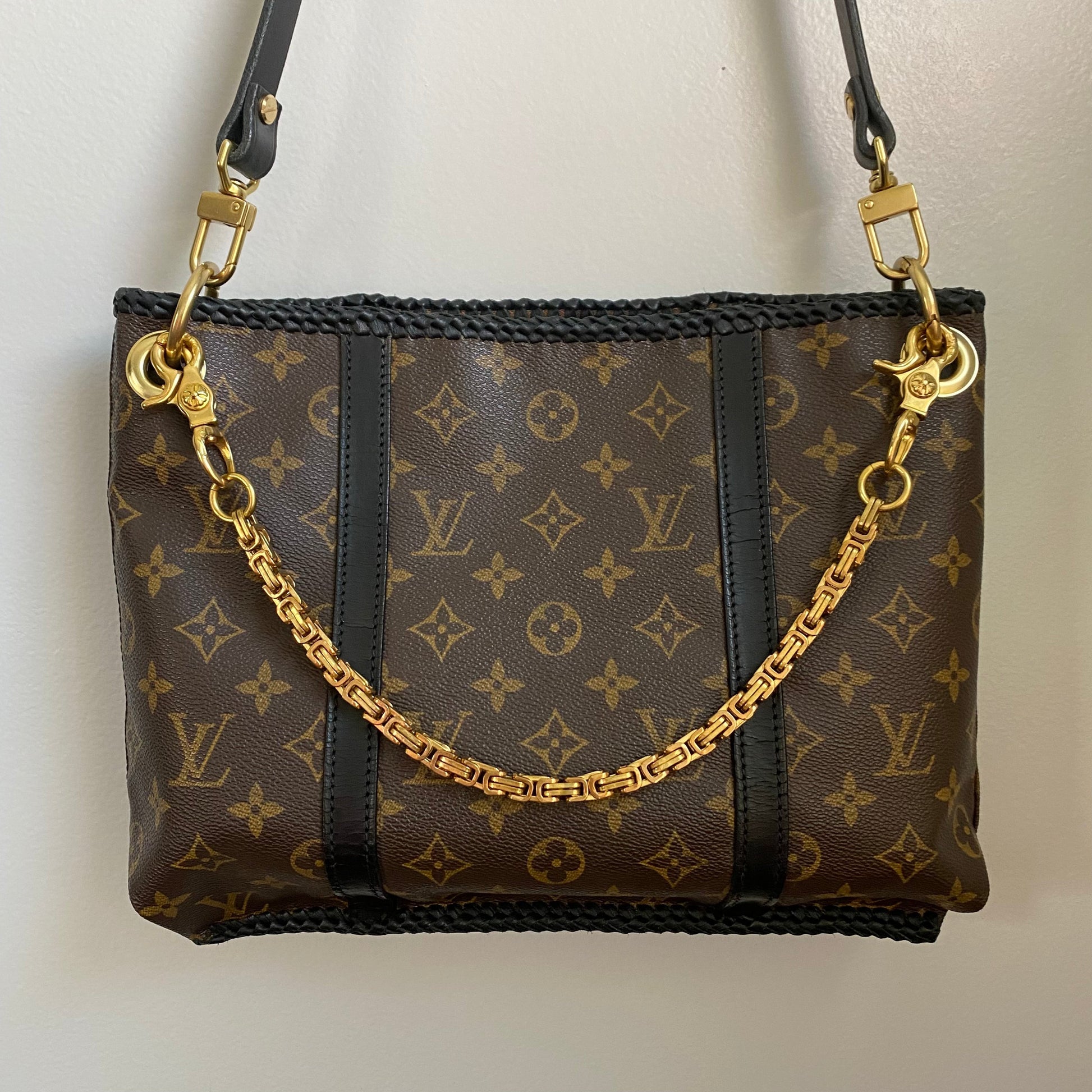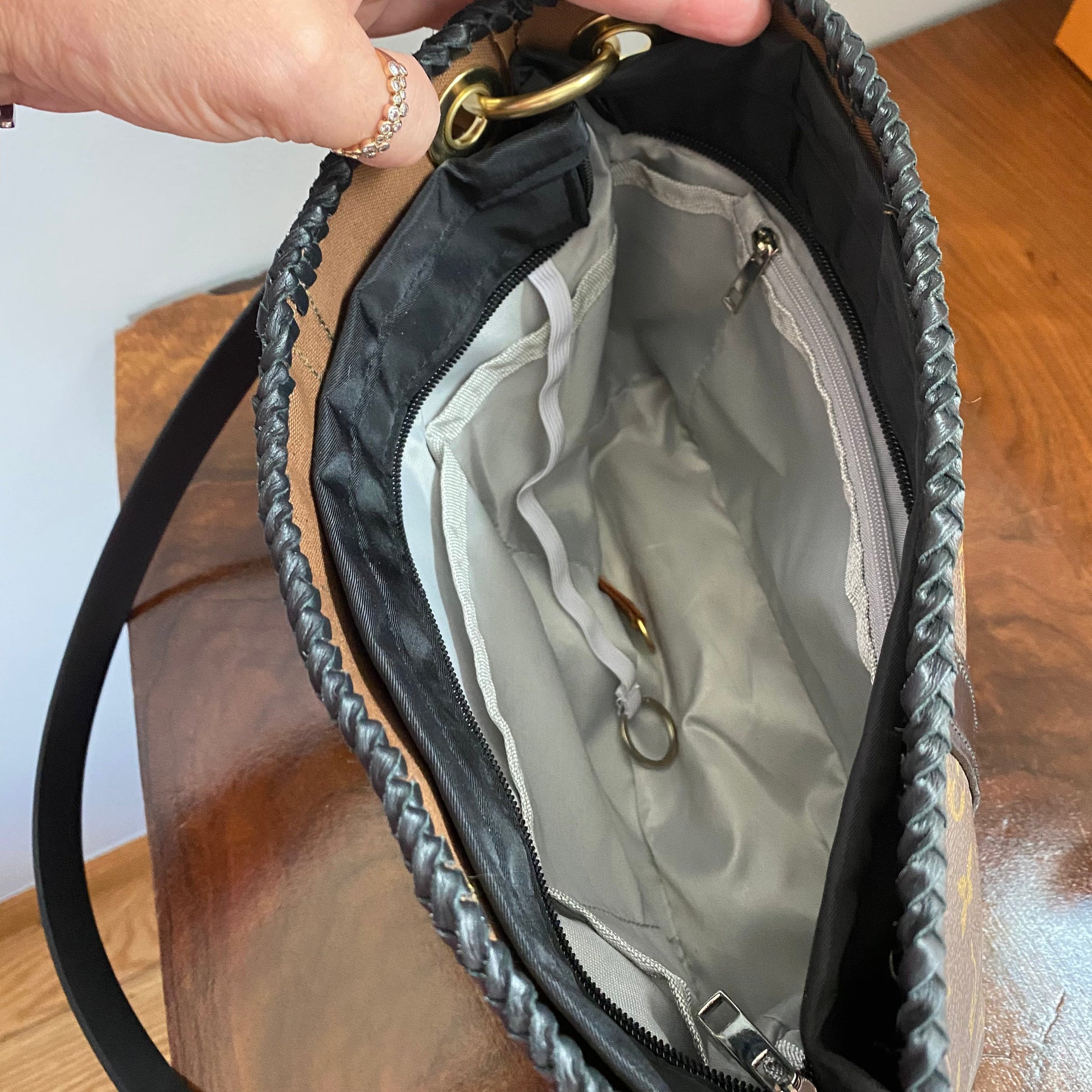 The bag's canvas is in really good shape! The interior was not in as good of shape, so I've removed it, leaving the bare canvas. In doing that, I had to cut out the bag's date code, but I will include it in the bag (date code FL0041 means it was made in France in April of 2001). Because it has such a nice roomy interior, I've added a multipurpose organizer that fits perfect inside. The organizer can be removed if desired. It has a lot of pockets and a zipper that secures all of your goodies inside. If you'd like me to add a magnetic snap to the top of the bag, I can, just reach out after purchase. I've added a new black leather shoulder strap that has a drop of 13" and a shorter brass chain for visual interest. Both can be used as straps for the bag, and both can be removed if you want to add a favorite of your own.