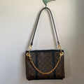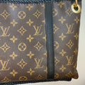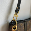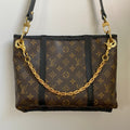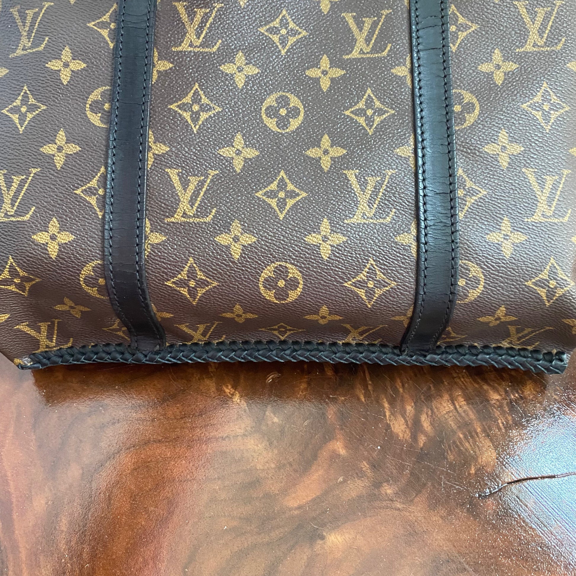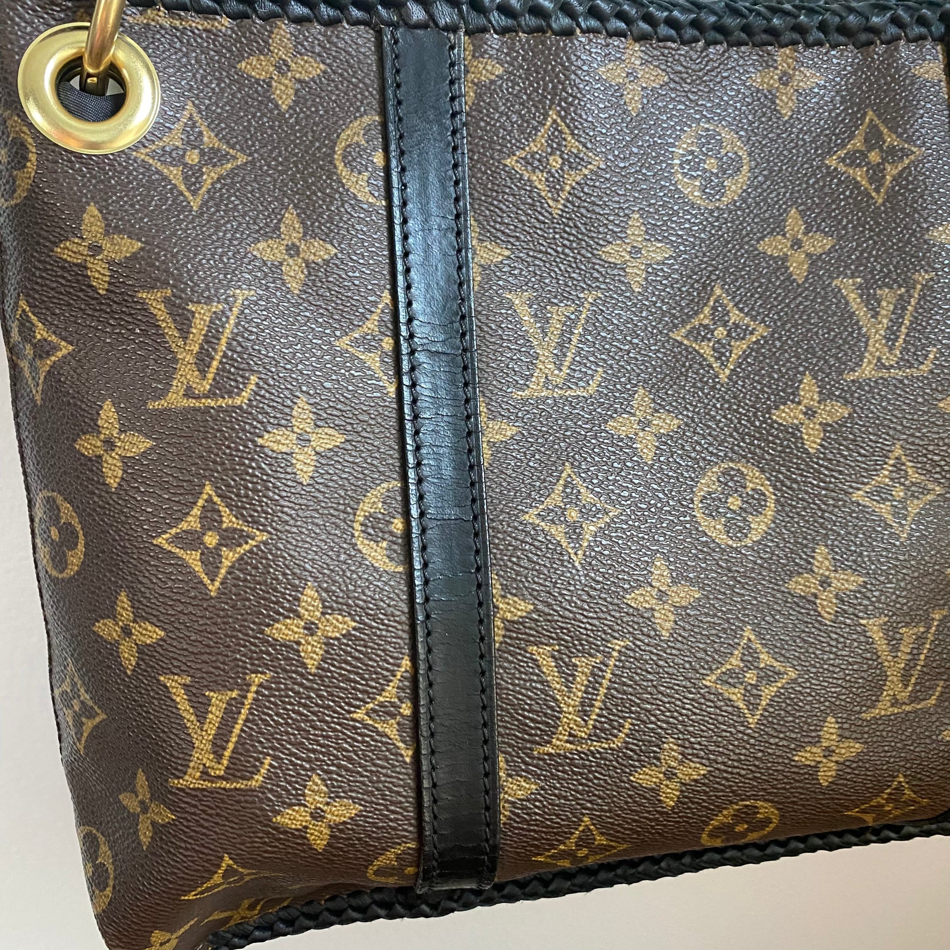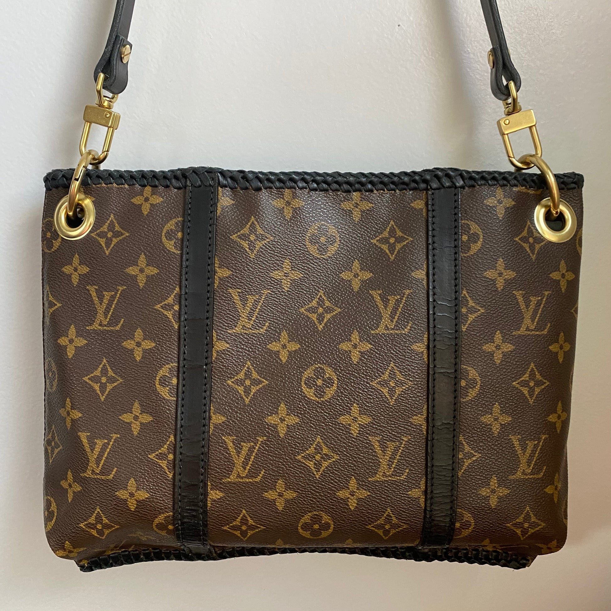 The bag's canvas is in really good shape! The interior was not in as good of shape, so I've removed it, leaving the bare canvas. In doing that, I had to cut out the bag's date code, but I will include it in the bag (date code FL0041 means it was made in France in April of 2001). Because it has such a nice roomy interior, I've added a multipurpose organizer that fits perfect inside. The organizer can be removed if desired. It has a lot of pockets and a zipper that secures all of your goodies inside. If you'd like me to add a magnetic snap to the top of the bag, I can, just reach out after purchase. I've added a new black leather shoulder strap that has a drop of 13" and a shorter brass chain for visual interest. Both can be used as straps for the bag, and both can be removed if you want to add a favorite of your own.