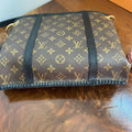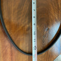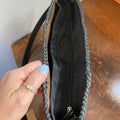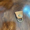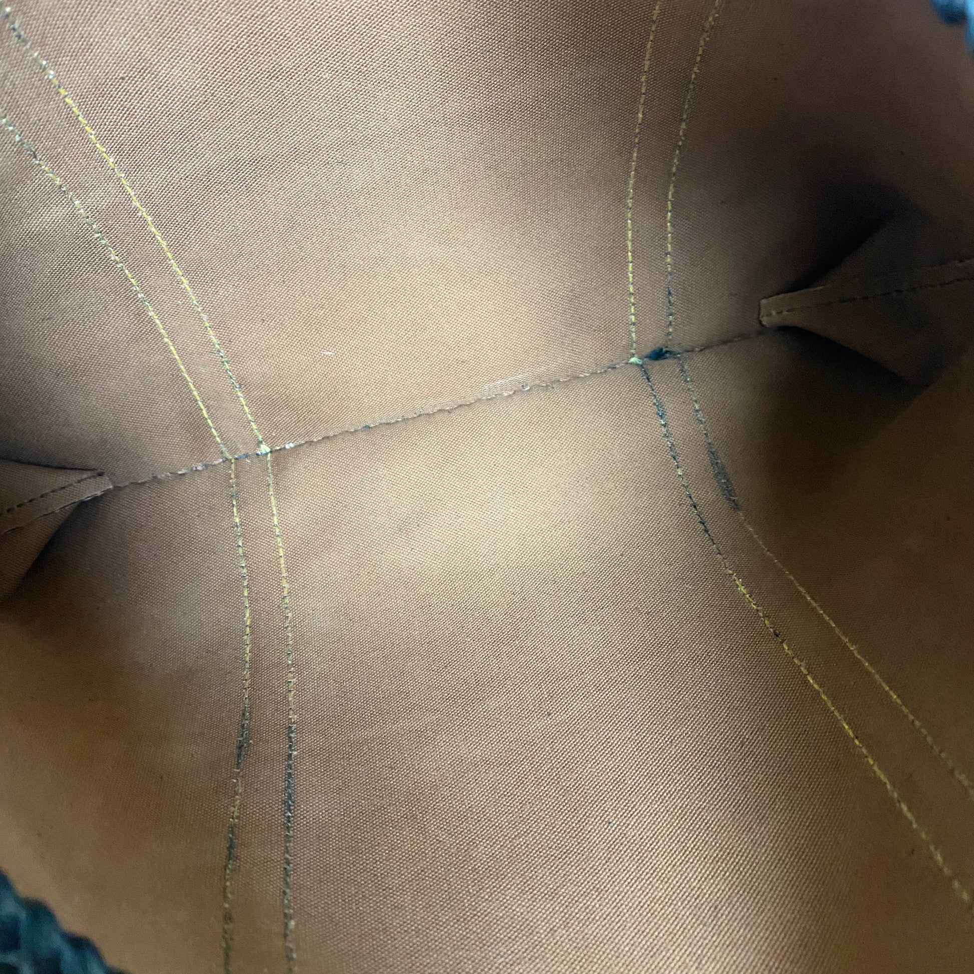 I took the bottom off the bucket bag and sewed it together with a nice fold on the ends with black leather lace. The vachetta is in decent shape (some cracking), and it was all dyed black and conditioned. I love the black stripes on this bag! The top was also cut and resewn ?by hand with black leather lace.