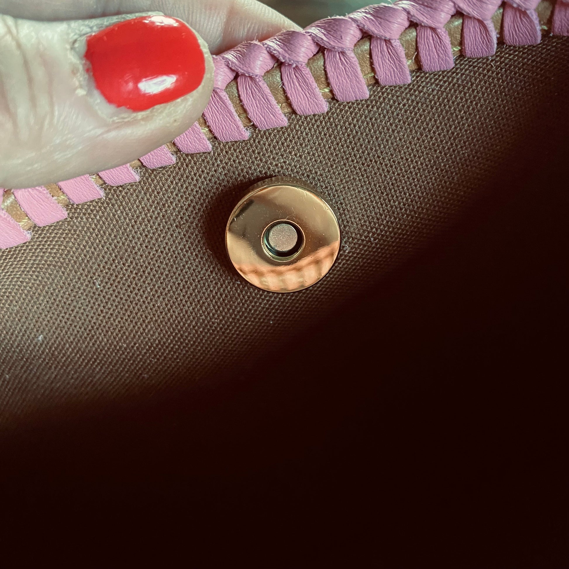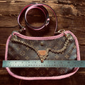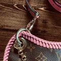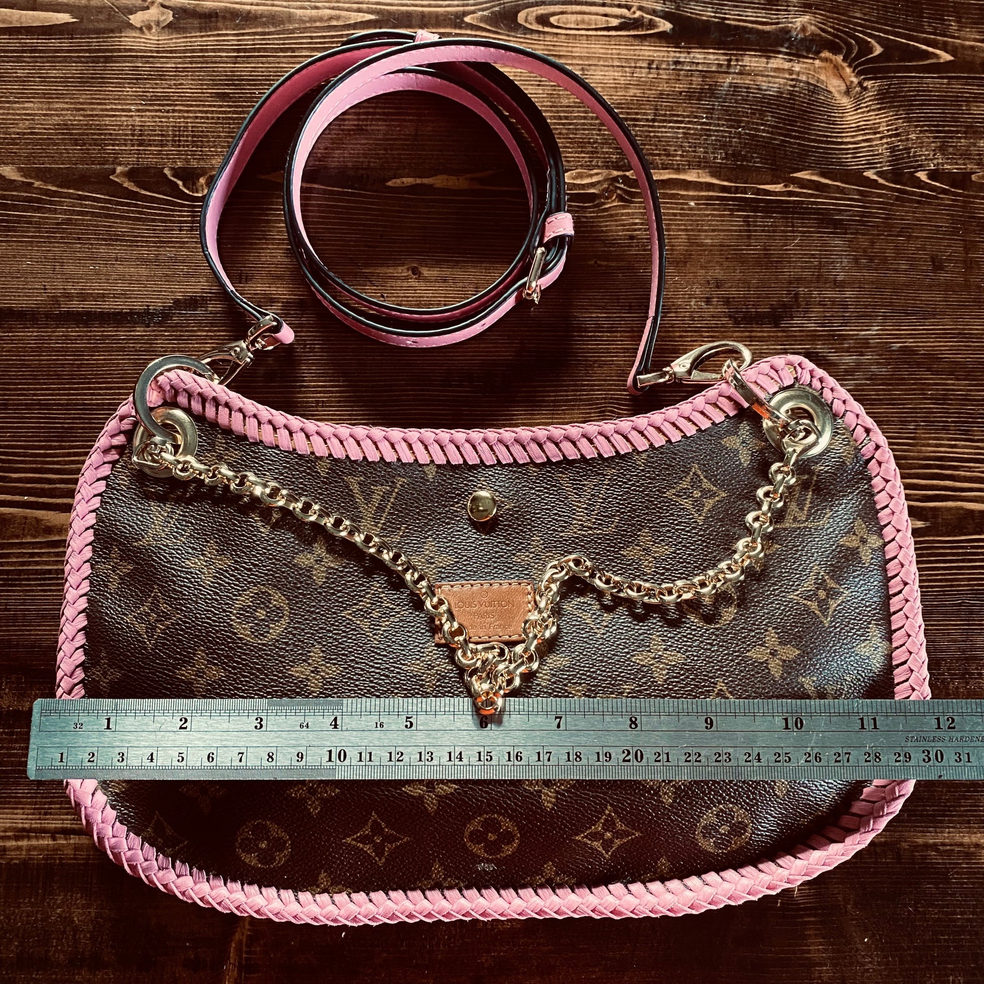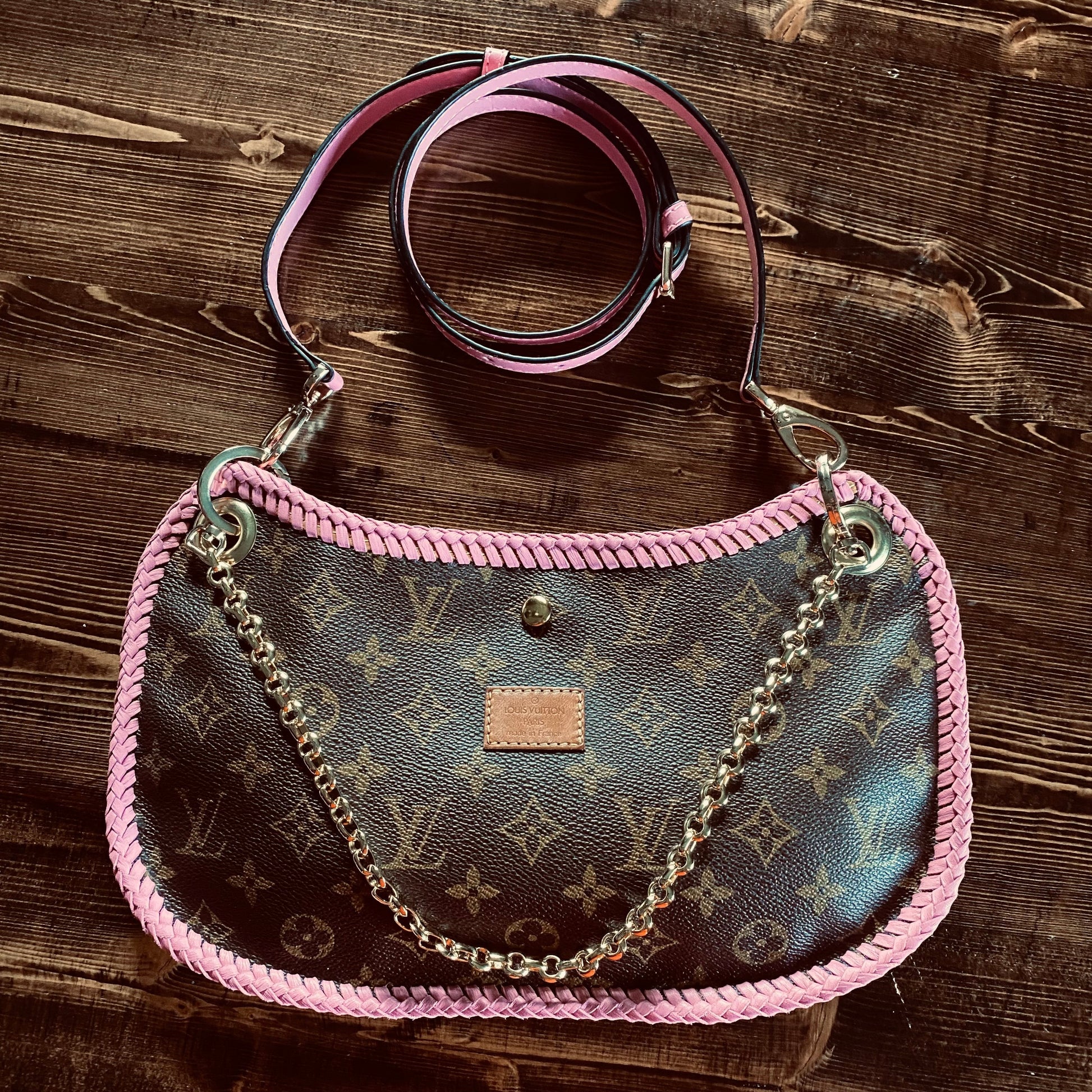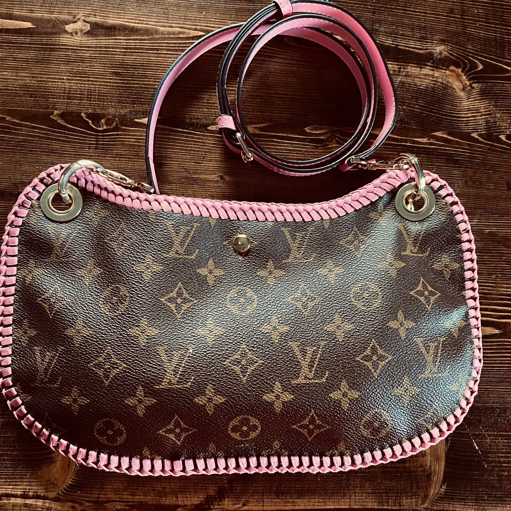 This one-of-a-kind piece is gorgeous in pink and is the first one I've made in this color! The "Louis Vuitton " leather patch on the front is pristine, and I've added pink leather braiding to the outside edges which has been stitched by hand. All of the hardware is gold plated. There is a gold button magnetic snap that helps keep all of your items secure. There are no interior pockets. The adjustable pink leather strap (39-48") is perfect for wearing crossbody or as a shoulder bag. There is also a super cute short gold chain that adds a level or interest, along with a cool way to carry over your wrist when you remove the pink one!!