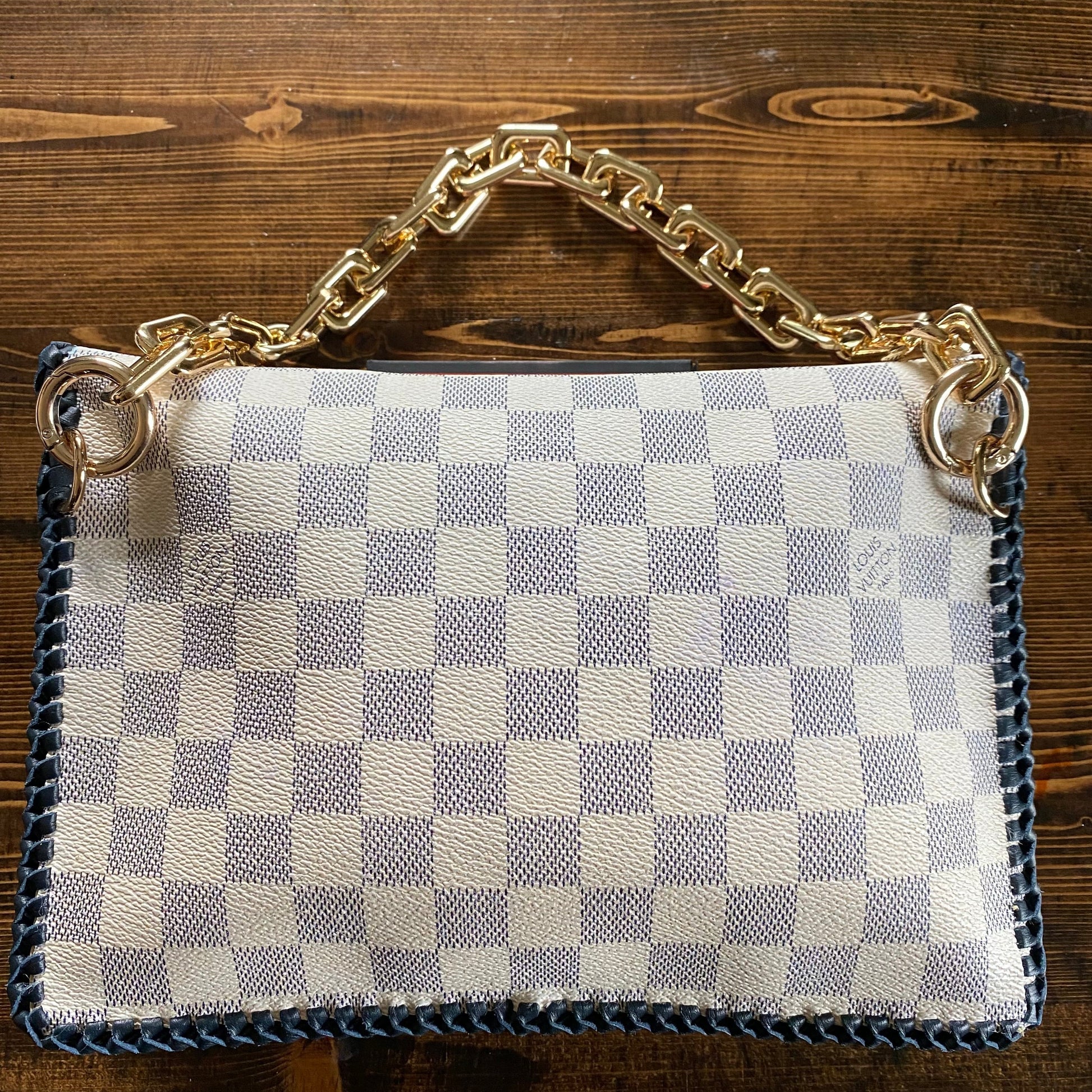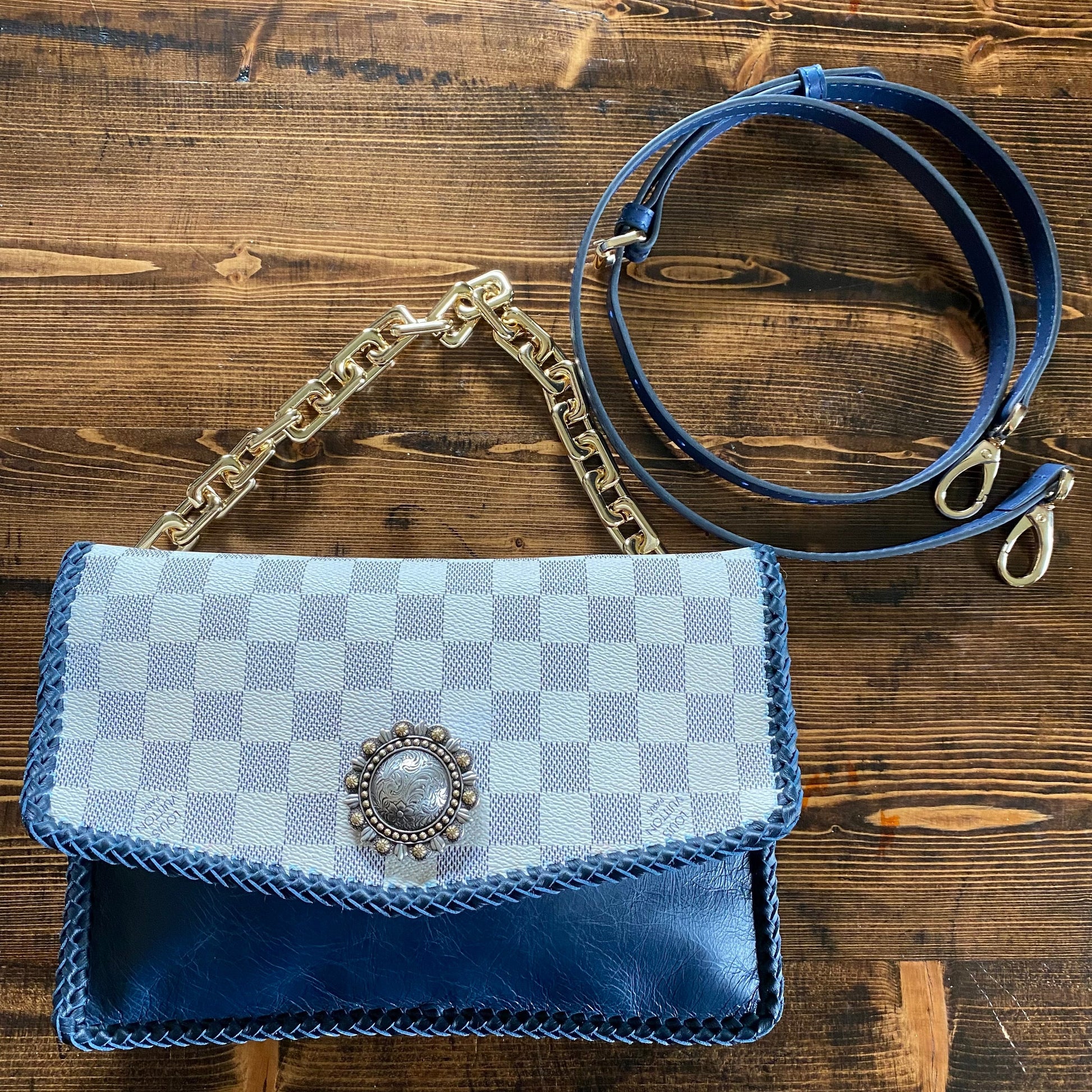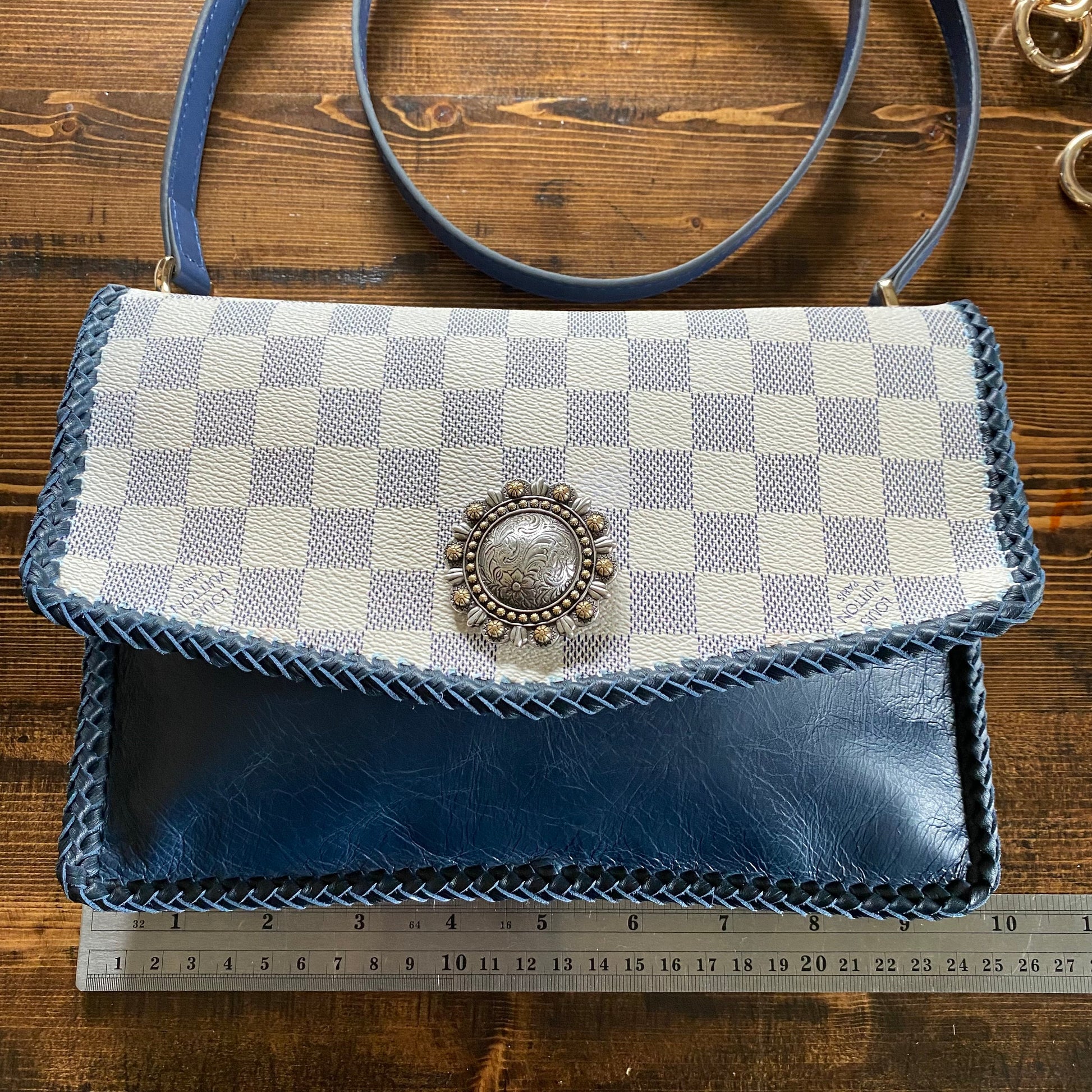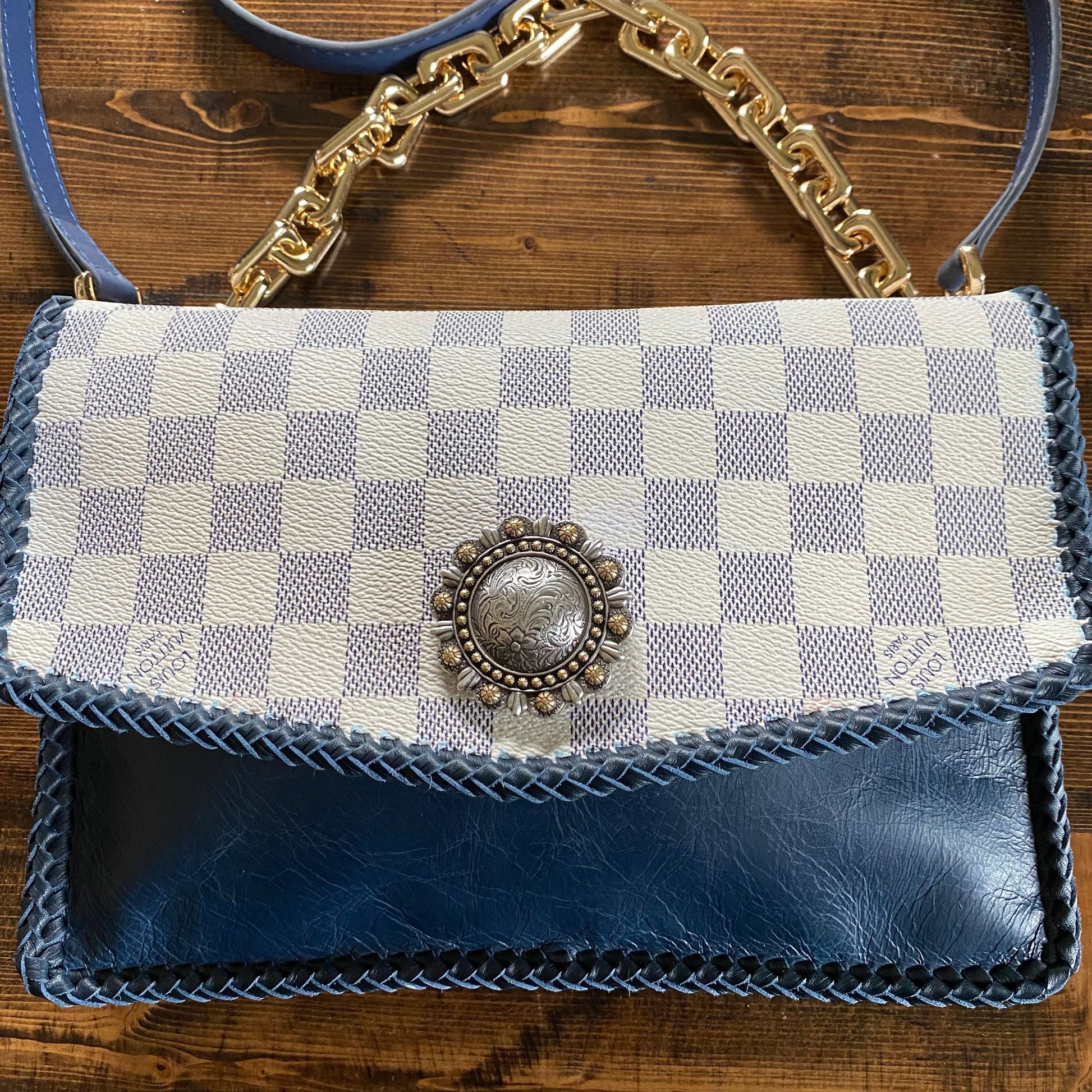 An LV Damier Azur bag was used along with a gorgeous soft blue leather! The Azur is in decent shape, but does have some marks on it, please see pictures below. The entire bag is lined with a cream colored vegan leather. The outside edge is navy leather lace which has been stitched by hand. There are two brass D-Rings that hold the navy adjustable leather strap (from 39-48"). Remove that strap and add the fun chunky gold chain strap over your arm. A beautiful gold/silver concho hides a snap, keeping your belongings secure. (The concho may be switched out if desired, just contact me immediately after ordering, or add a note to the checkout page.)