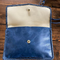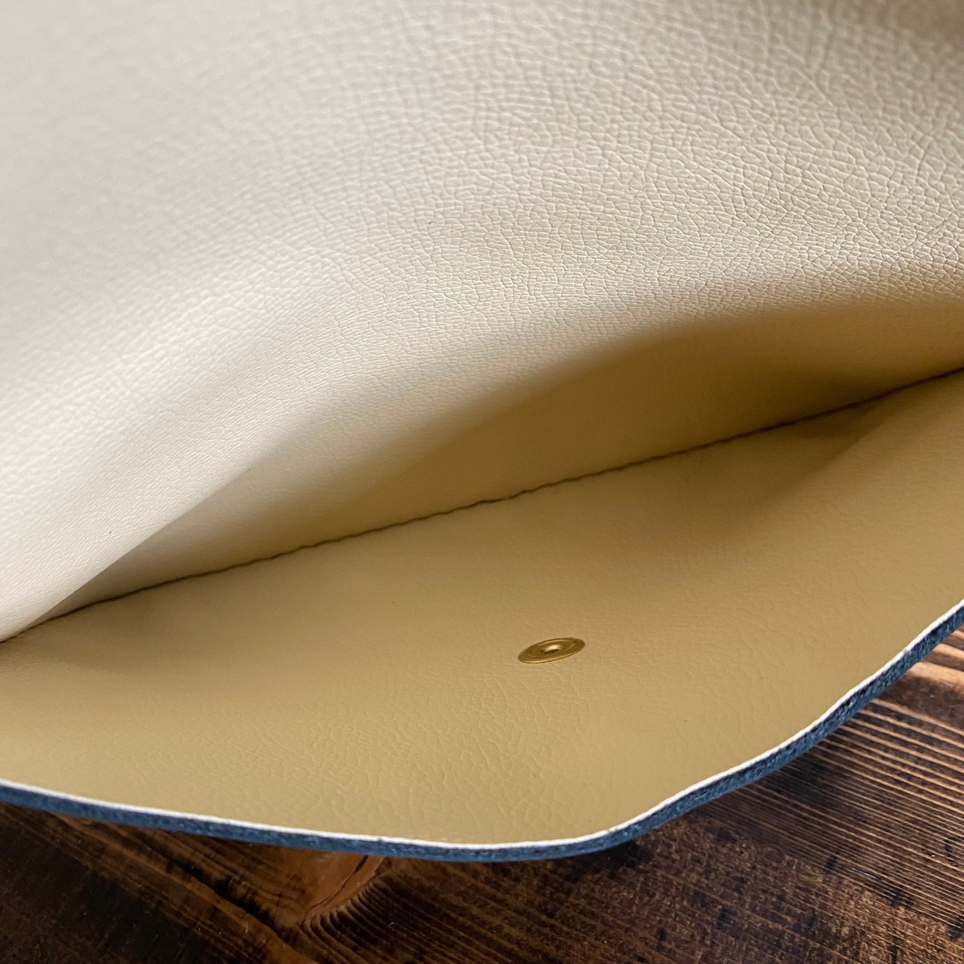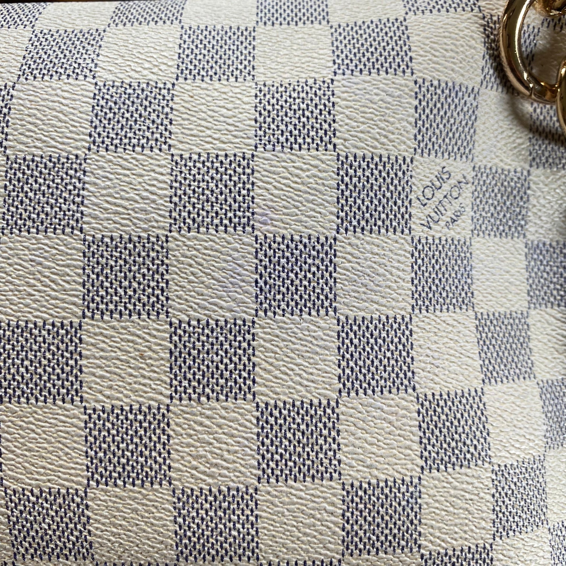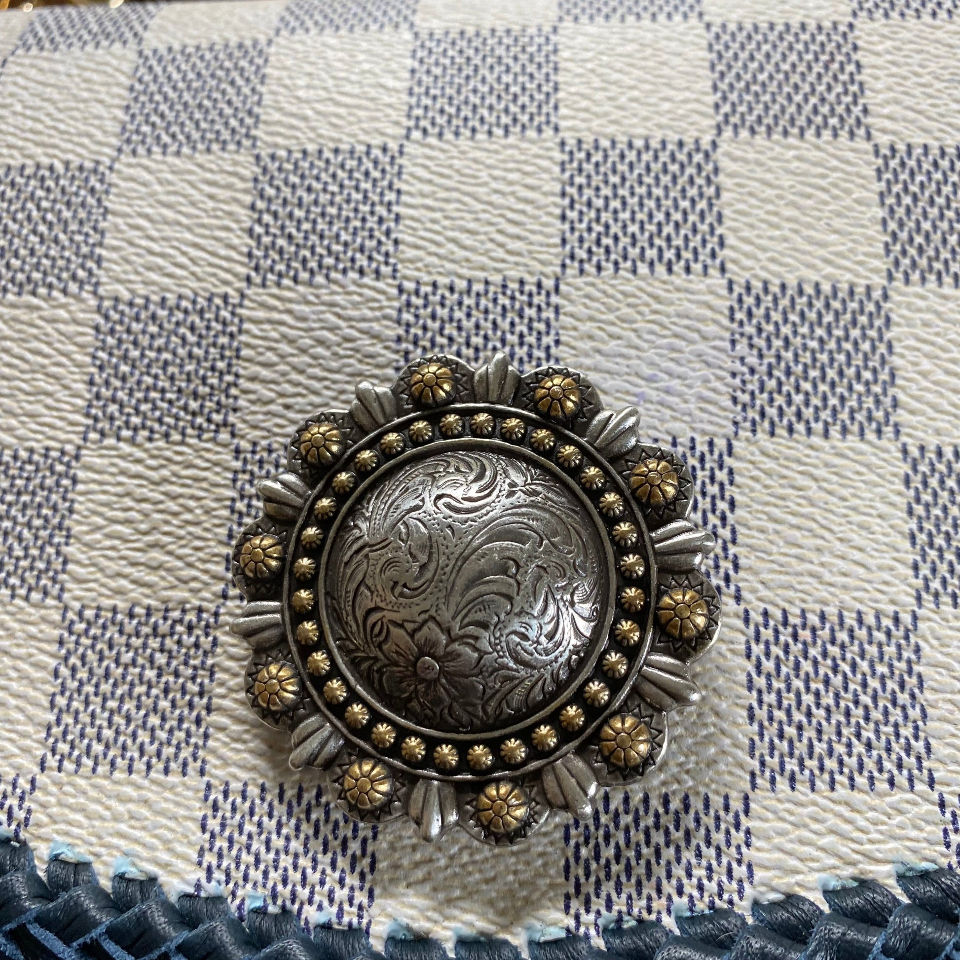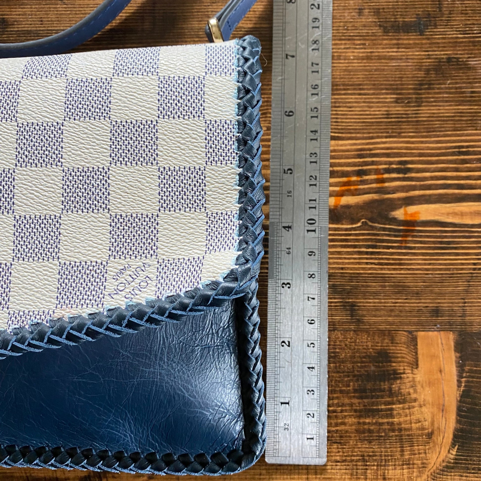 An LV Damier Azur bag was used along with a gorgeous soft blue leather! The Azur is in decent shape, but does have some marks on it, please see pictures below. The entire bag is lined with a cream colored vegan leather. The outside edge is navy leather lace which has been stitched by hand. There are two brass D-Rings that hold the navy adjustable leather strap (from 39-48"). Remove that strap and add the fun chunky gold chain strap over your arm. A beautiful gold/silver concho hides a snap, keeping your belongings secure. (The concho may be switched out if desired, just contact me immediately after ordering, or add a note to the checkout page.)
