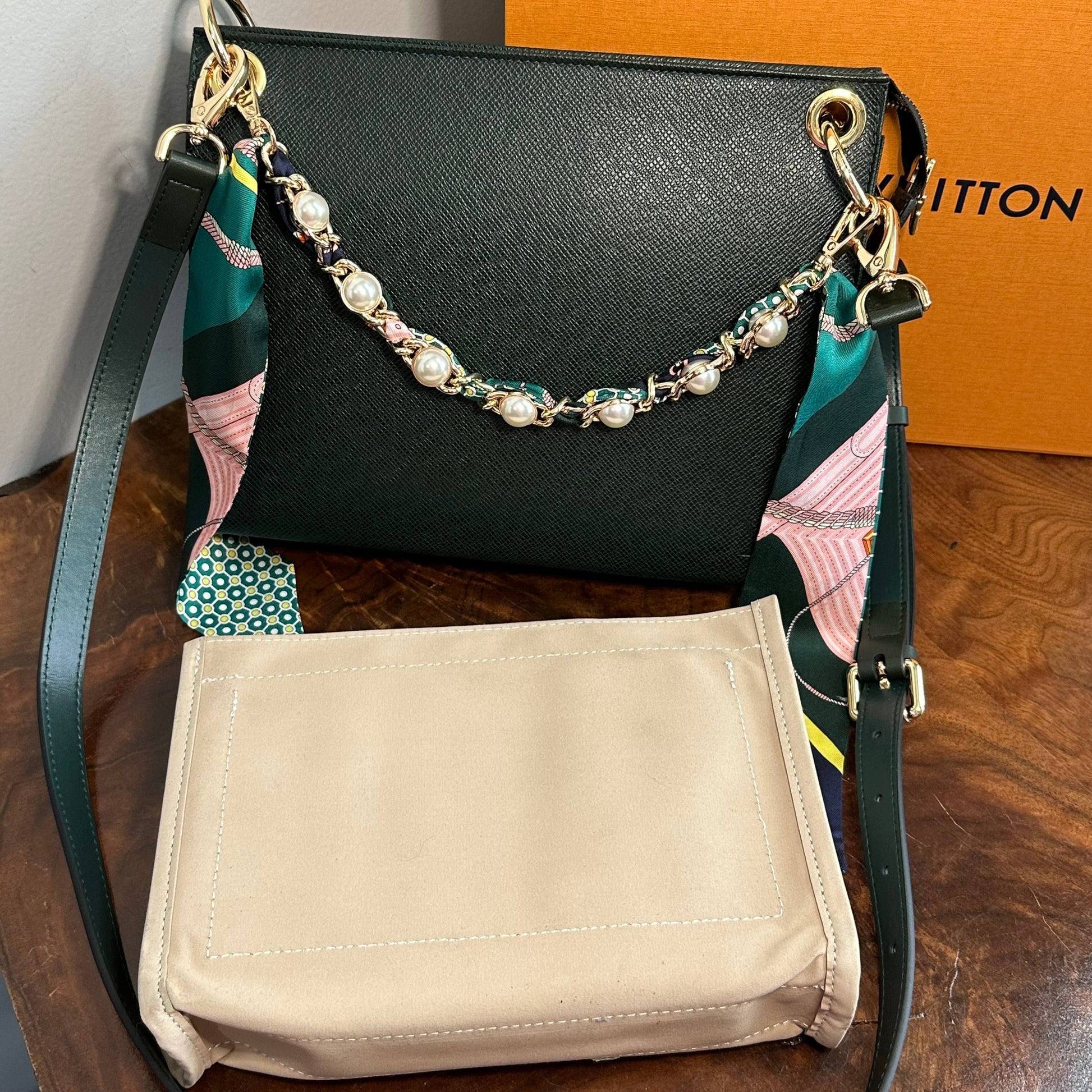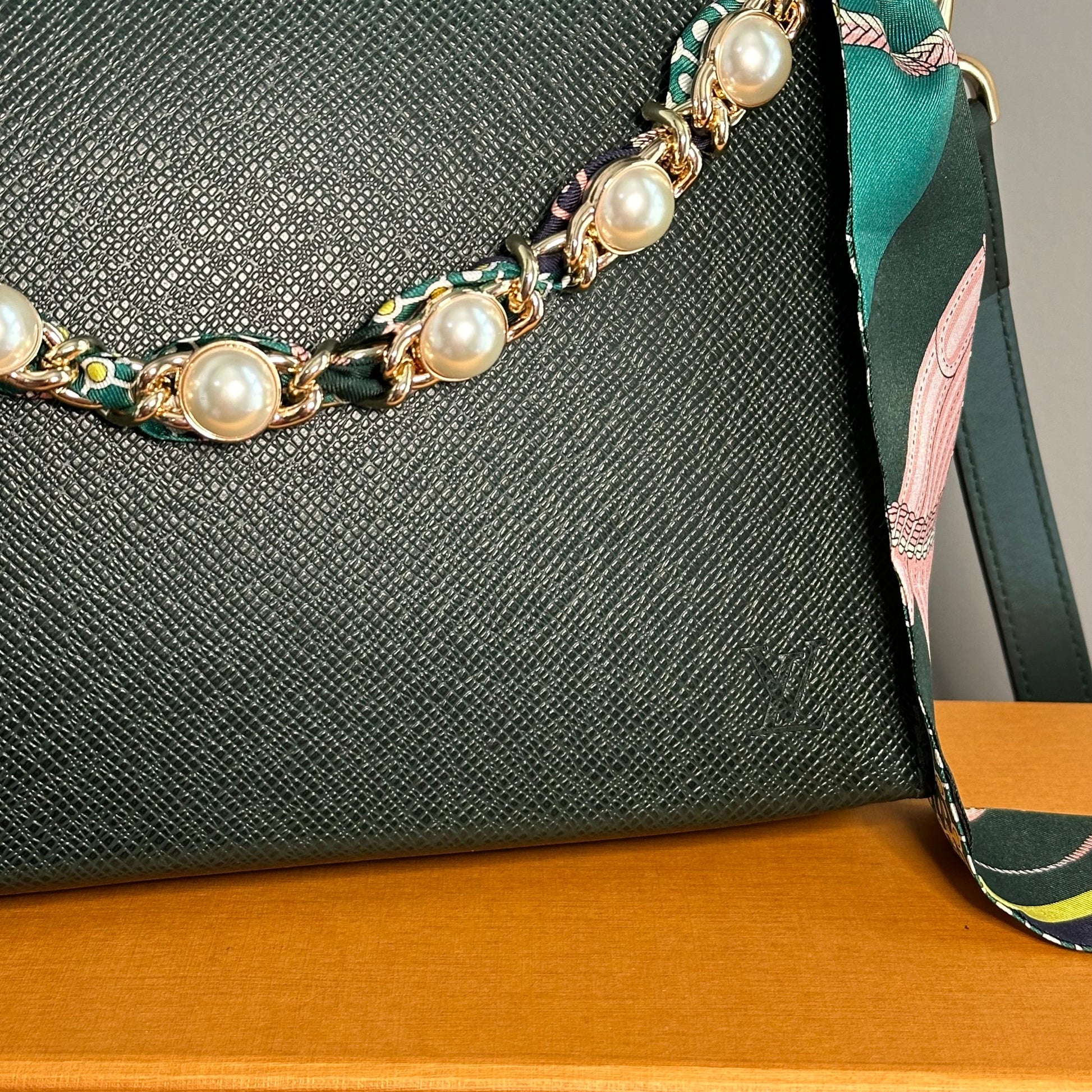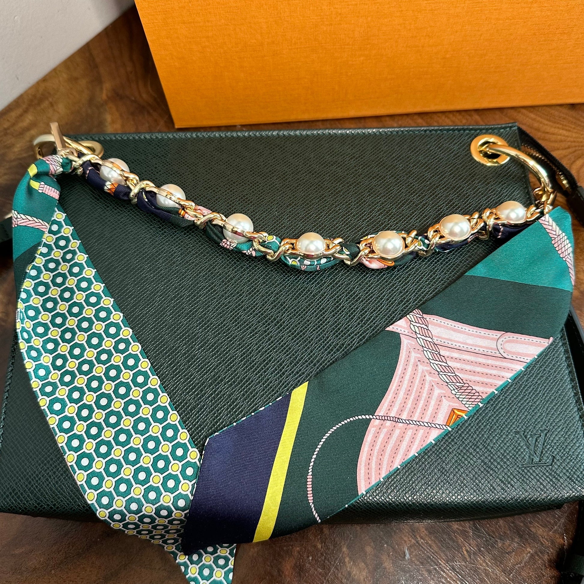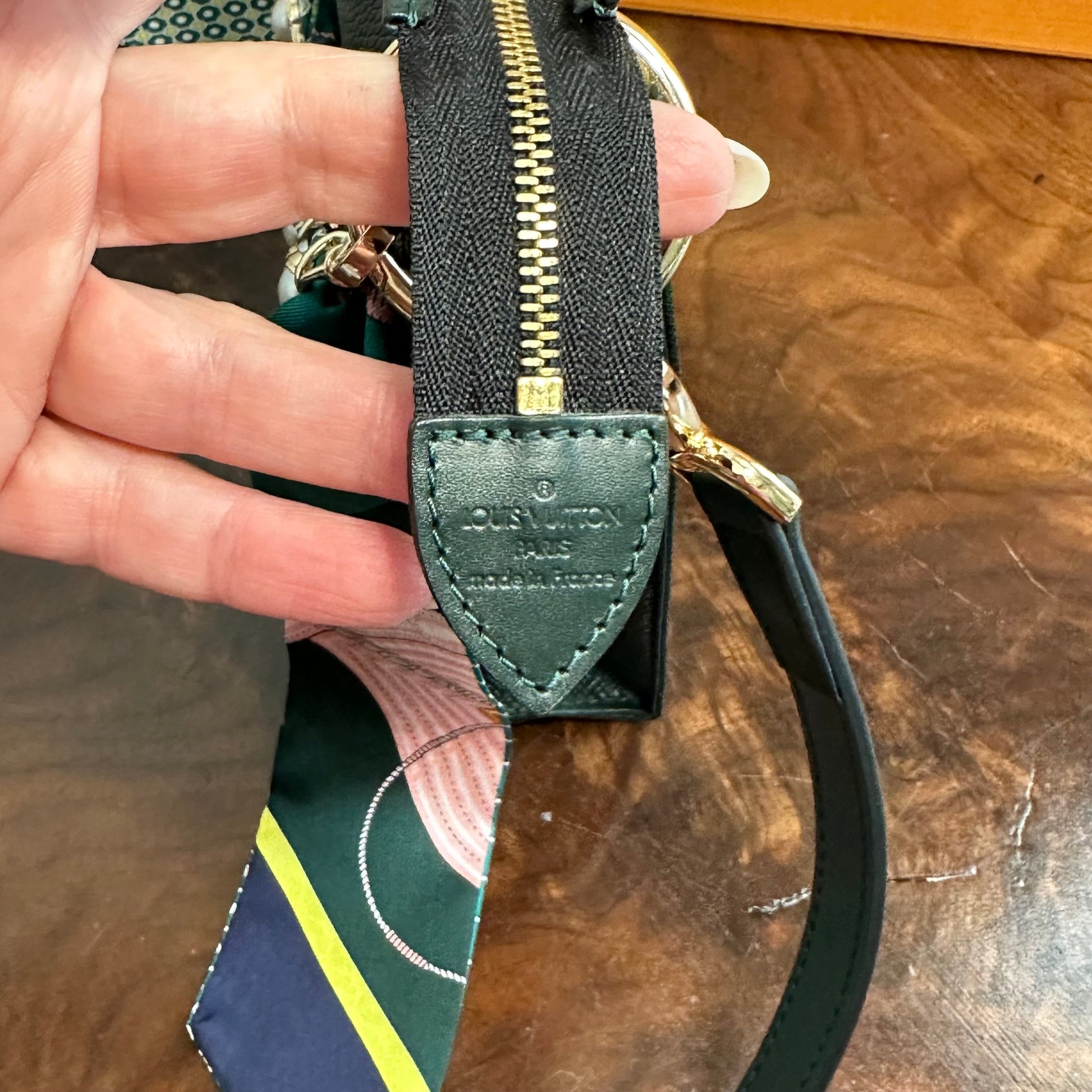 Brass eyelets were added to the corners of the bag so that the brass rings could easily go through them. When the rings are folded down, the zipper is opened easily. There are two straps included with this bag!! The longer adjustable dark green leather strap is perfect to wear crossbody (39.5-51") and blends seamlessly with the LV leather. Or, feel free to remove it and carry the bag with the beautiful shorter gold/pearl strap that has a matching silk scarf woven into it. I'm OBSESSED!!! Both straps can be removed if you have one you'd prefer carrying with it.