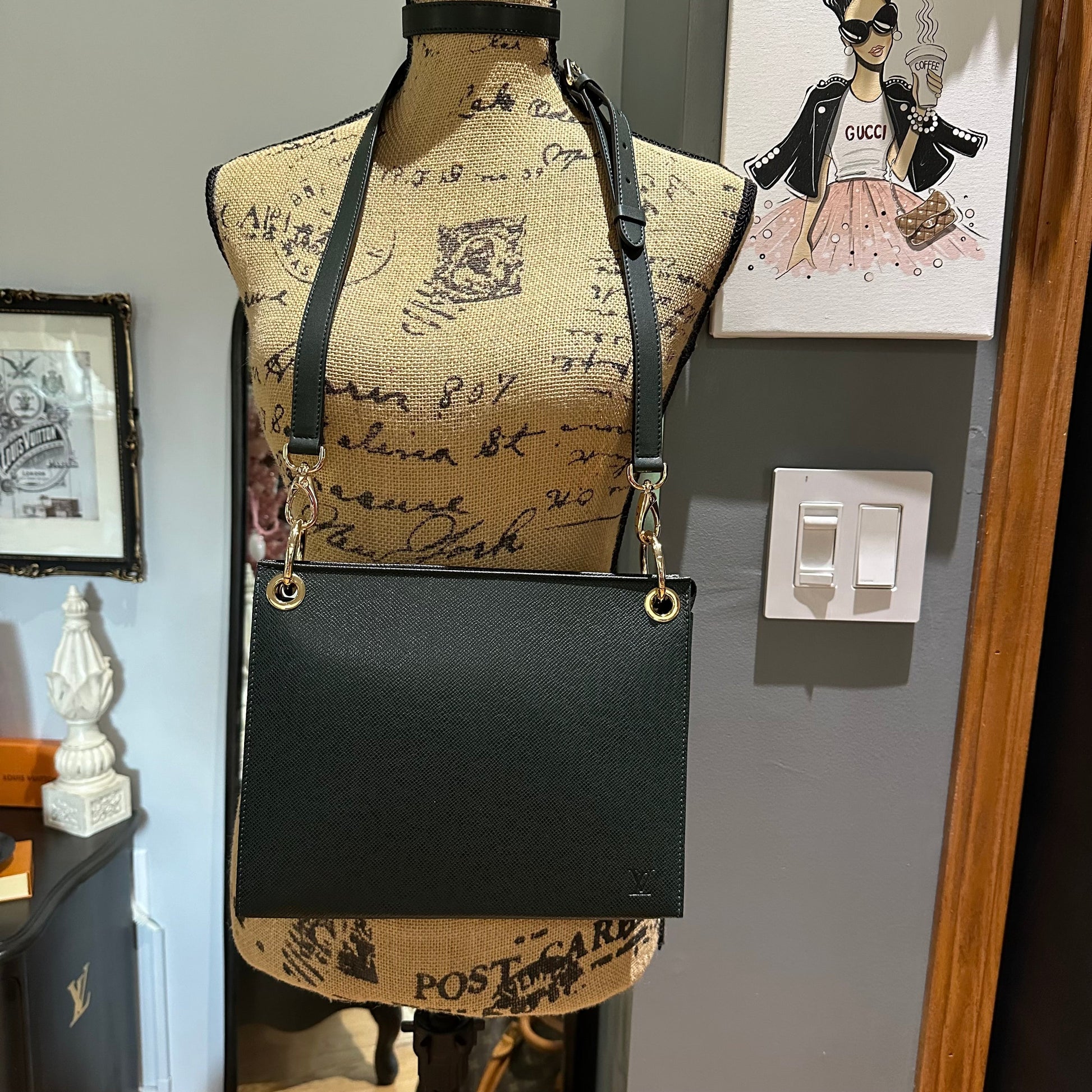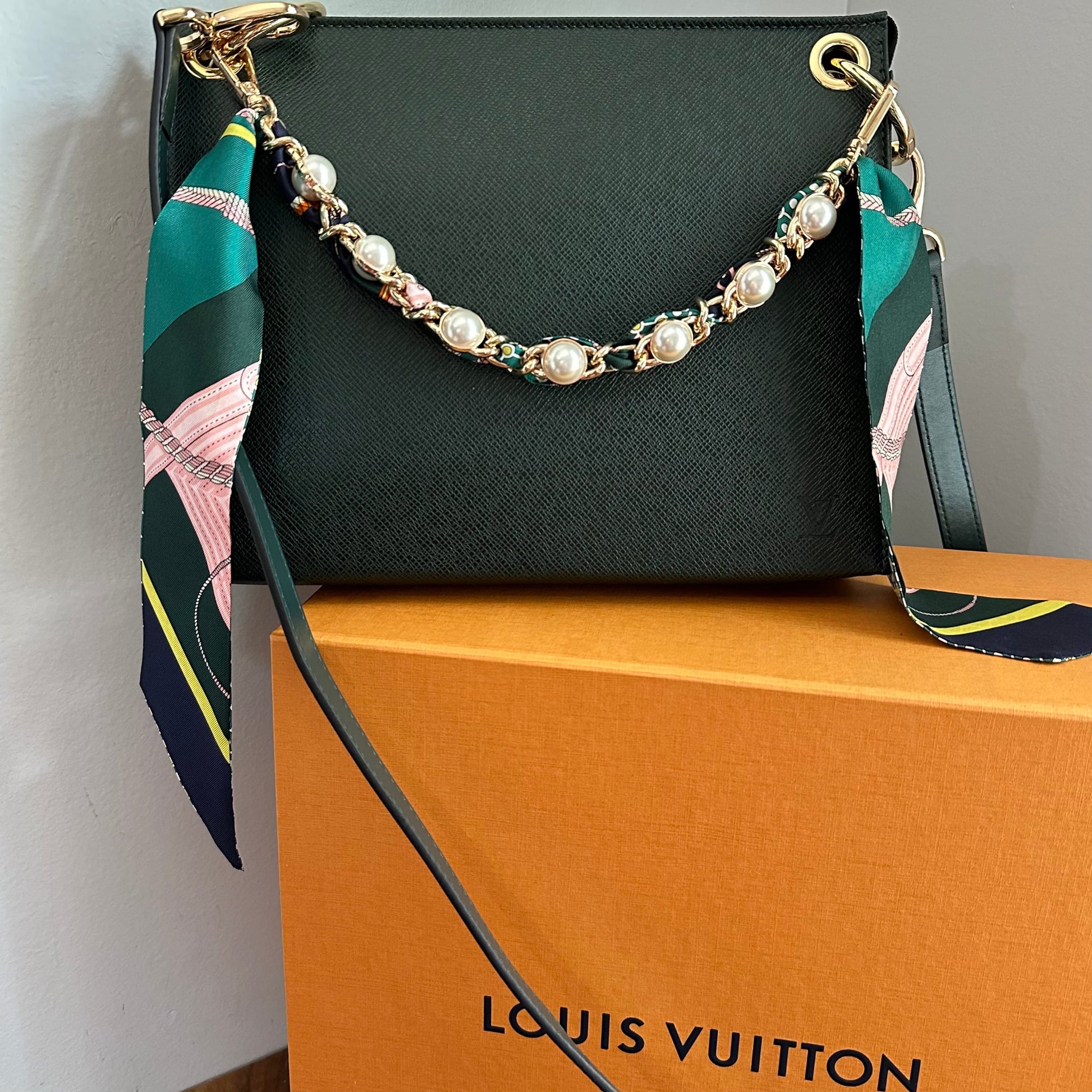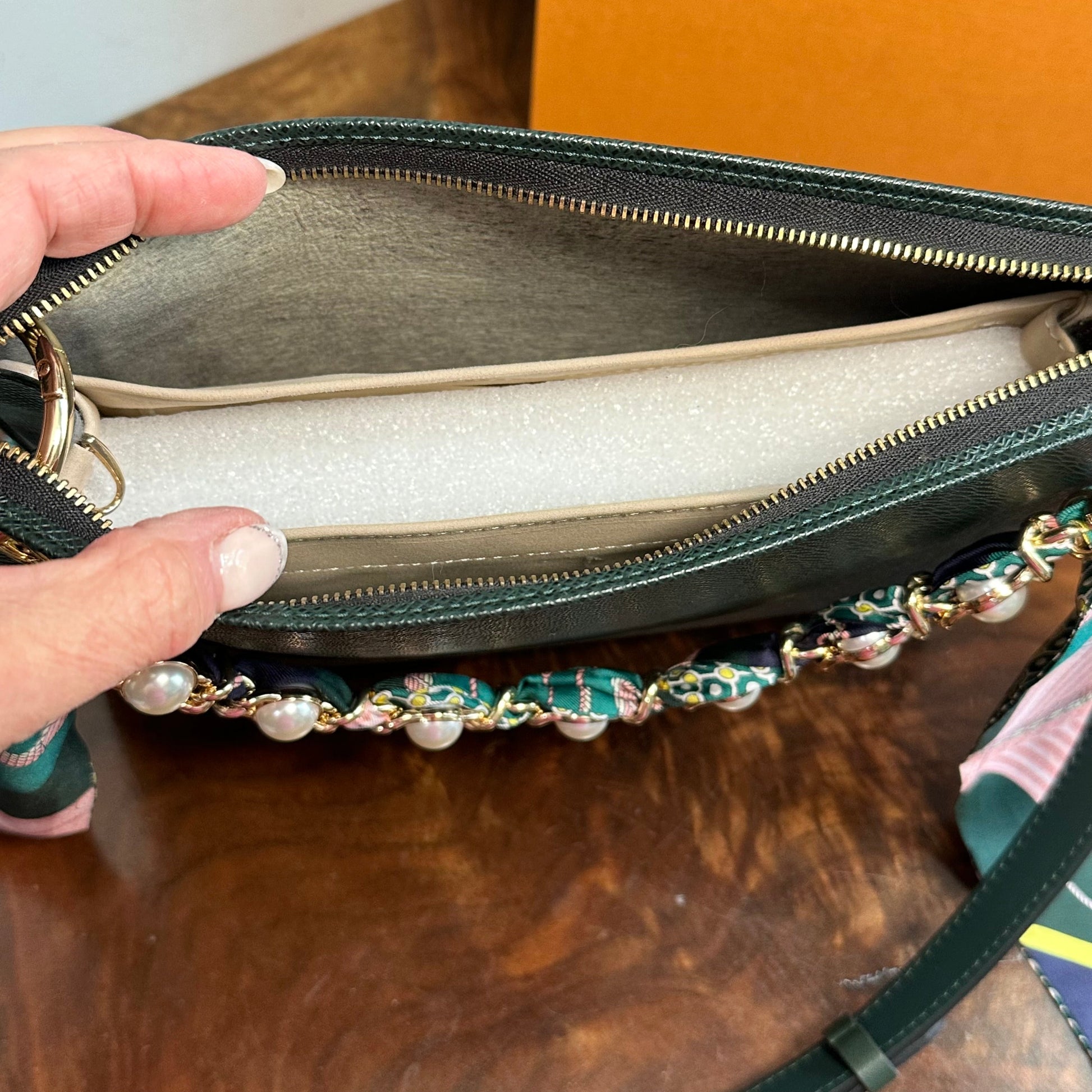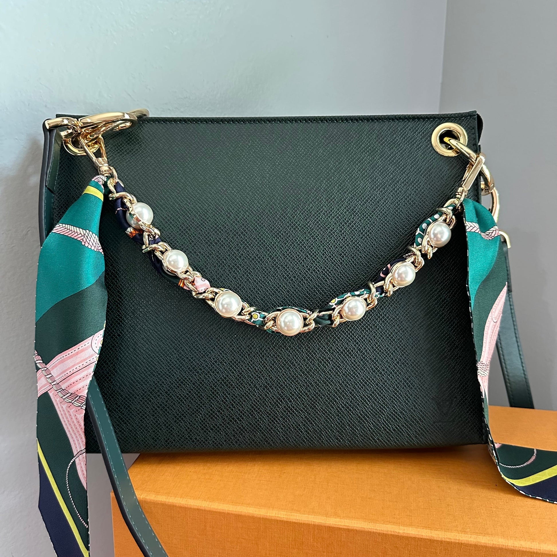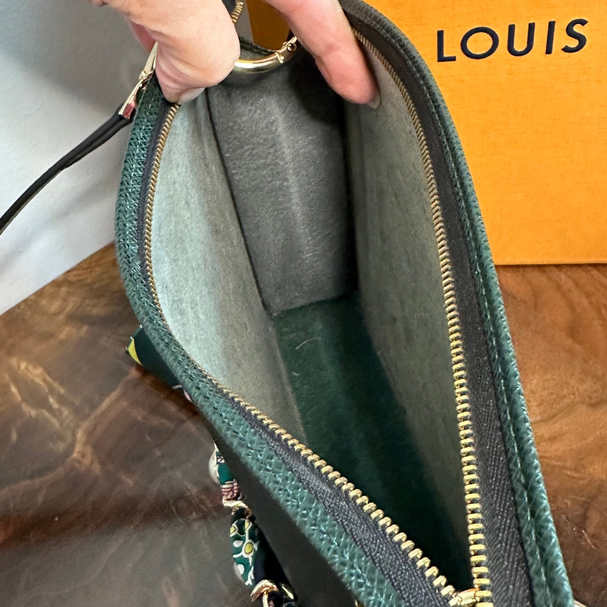 Brass eyelets were added to the corners of the bag so that the brass rings could easily go through them. When the rings are folded down, the zipper is opened easily. There are two straps included with this bag!! The longer adjustable dark green leather strap is perfect to wear crossbody (39.5-51") and blends seamlessly with the LV leather. Or, feel free to remove it and carry the bag with the beautiful shorter gold/pearl strap that has a matching silk scarf woven into it. I'm OBSESSED!!! Both straps can be removed if you have one you'd prefer carrying with it.