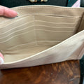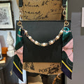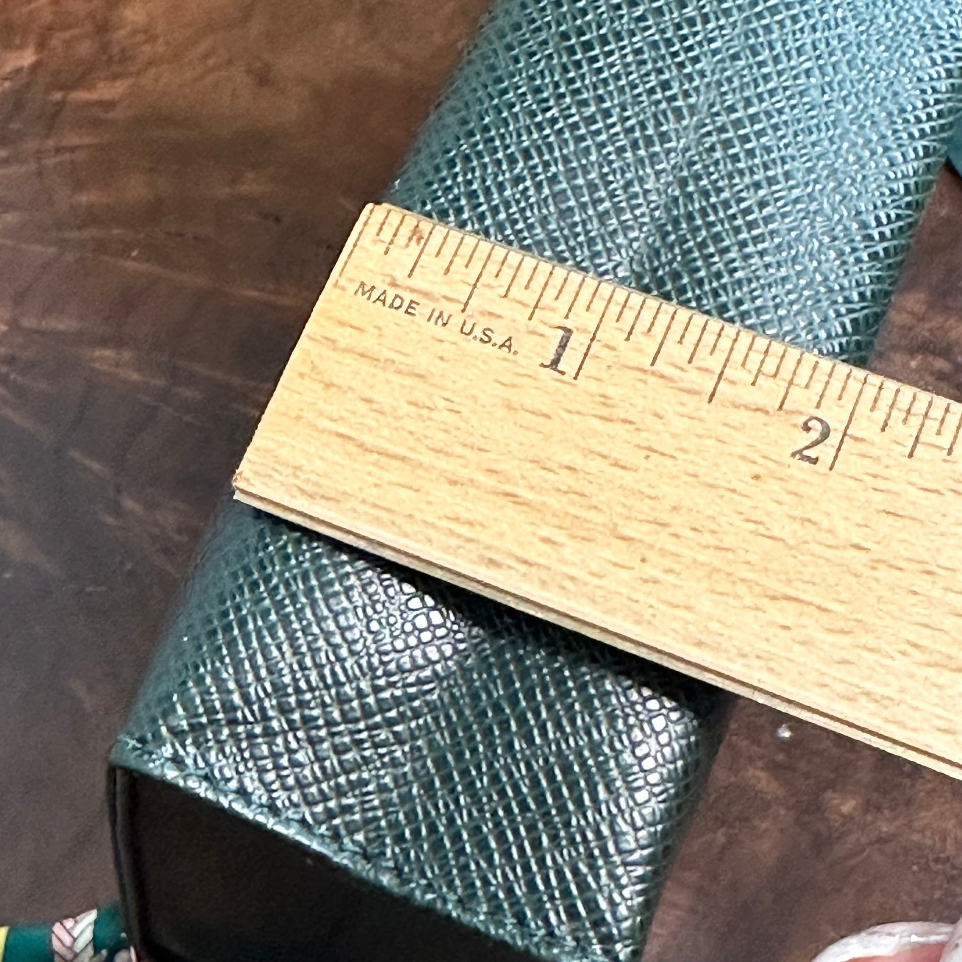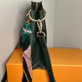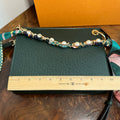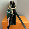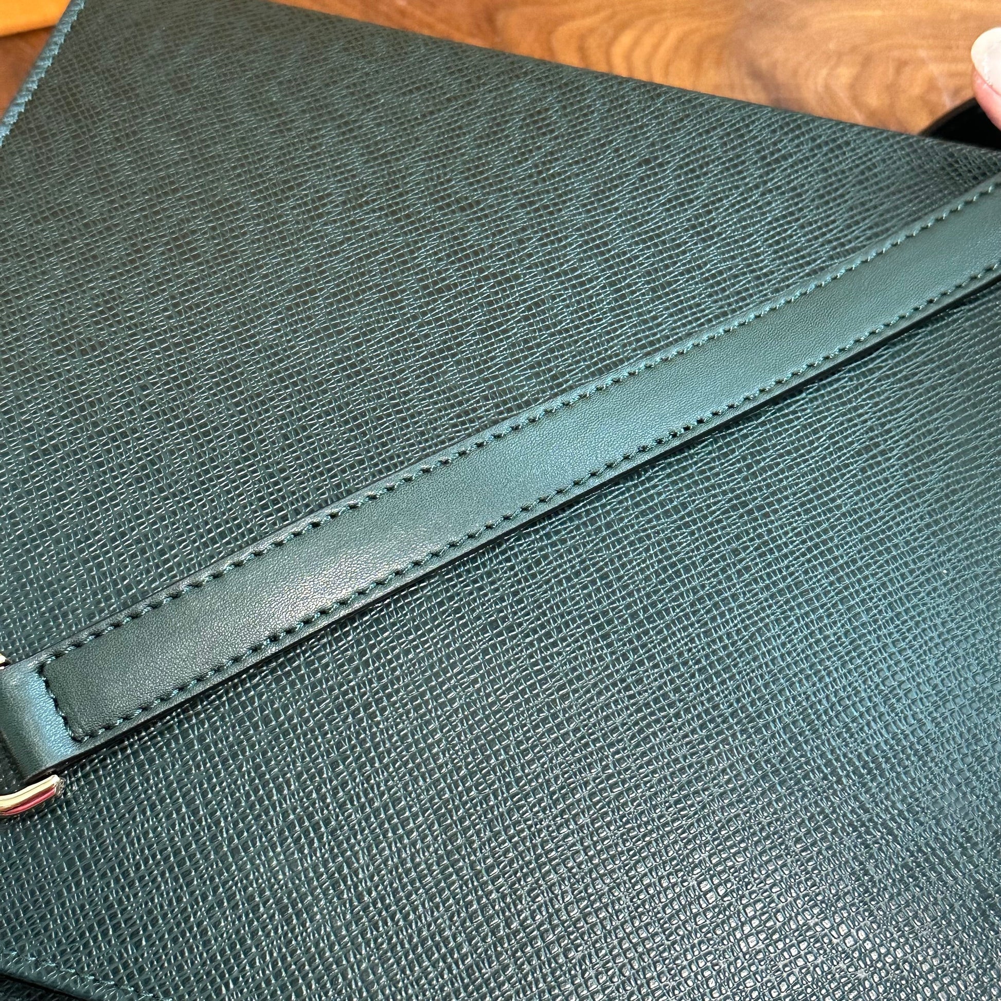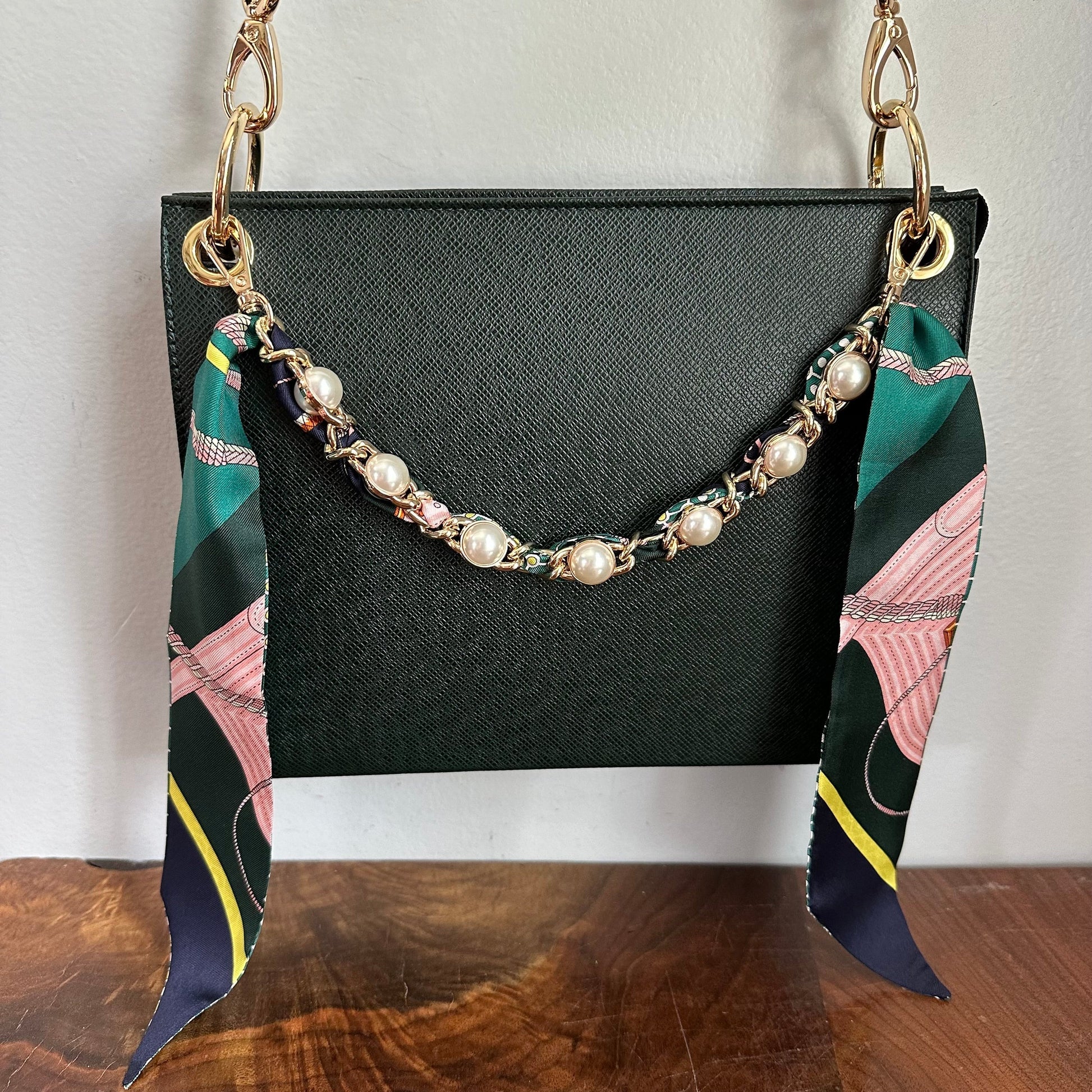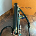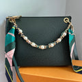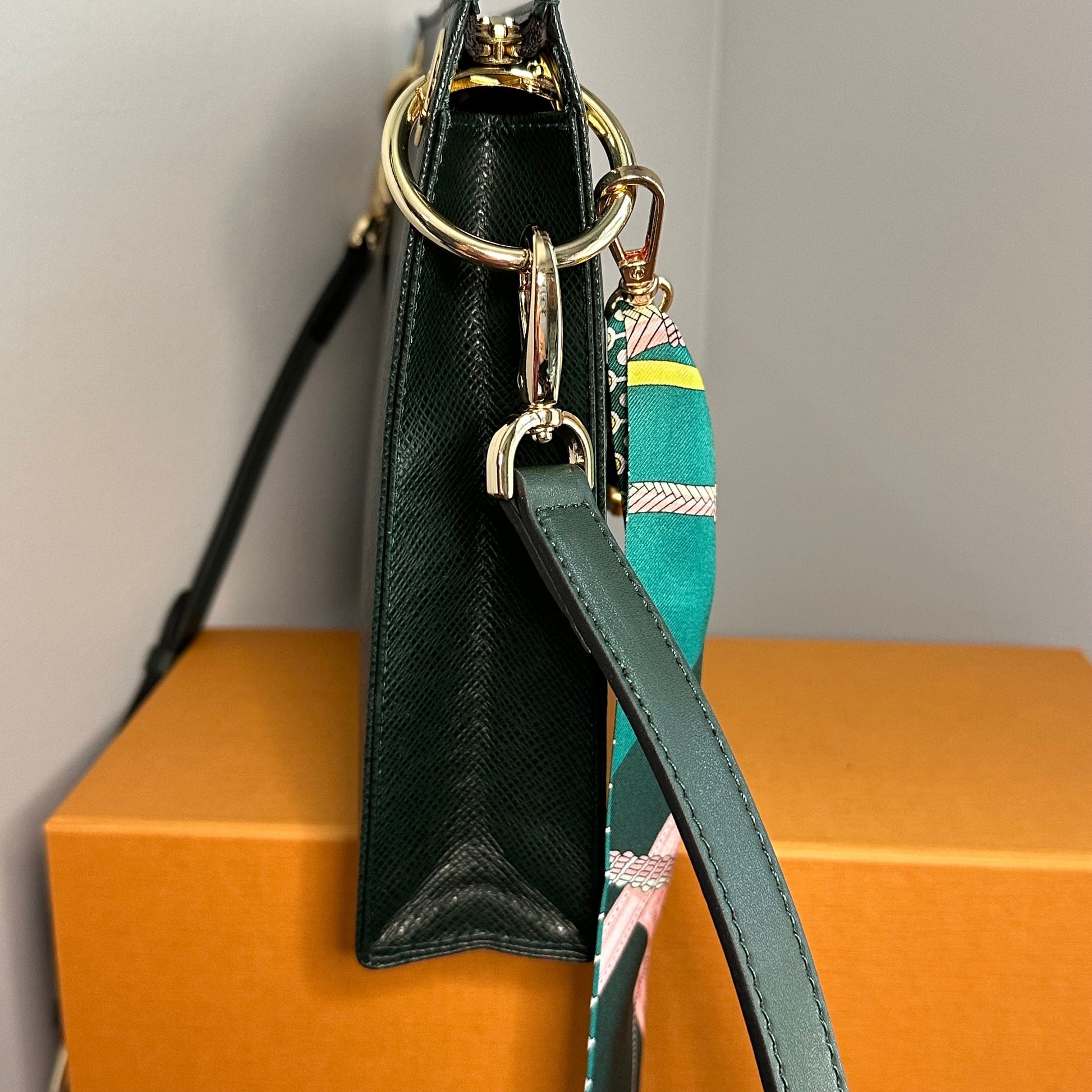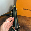 Brass eyelets were added to the corners of the bag so that the brass rings could easily go through them. When the rings are folded down, the zipper is opened easily. There are two straps included with this bag!! The longer adjustable dark green leather strap is perfect to wear crossbody (39.5-51") and blends seamlessly with the LV leather. Or, feel free to remove it and carry the bag with the beautiful shorter gold/pearl strap that has a matching silk scarf woven into it. I'm OBSESSED!!! Both straps can be removed if you have one you'd prefer carrying with it.