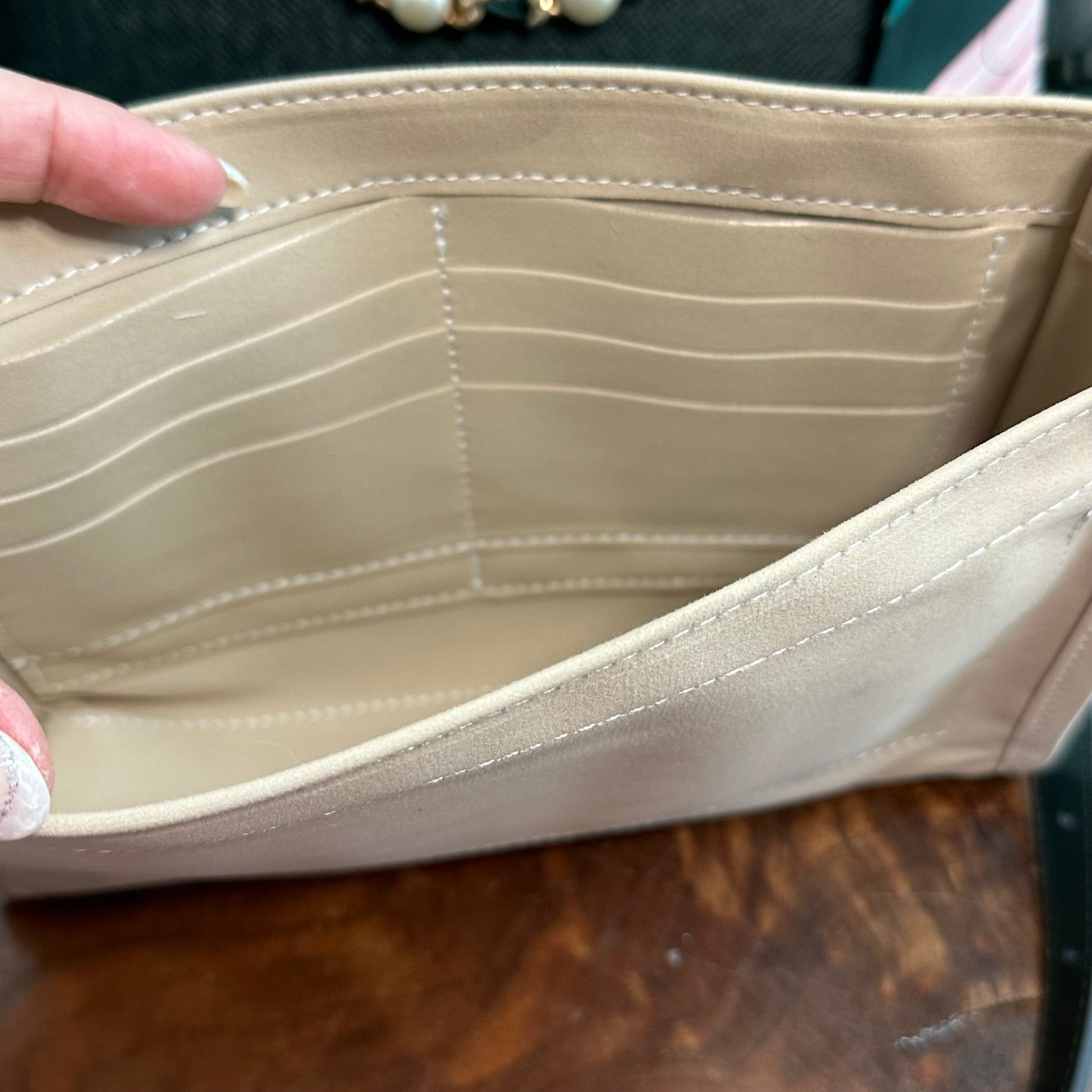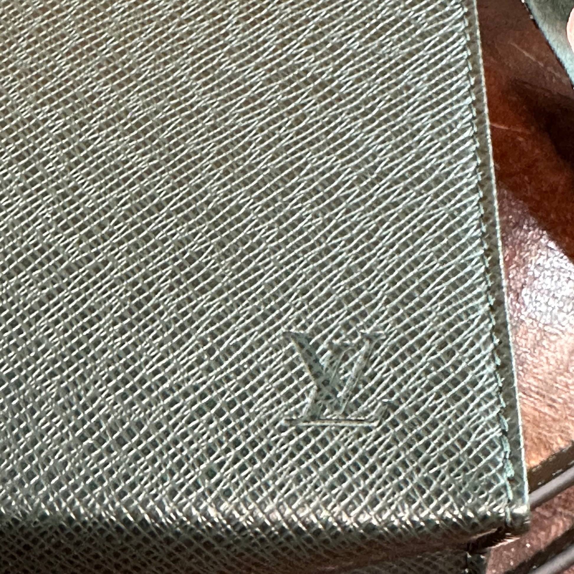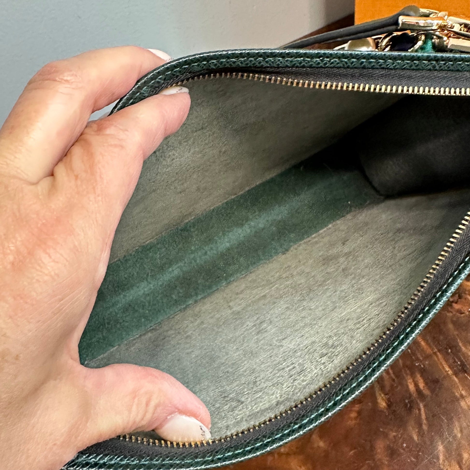 The bag's exterior taiga leather is beautiful and the zipper is fully functional. I've tucked the end with the LV tag inside just to lend itself to this style. The interior was Vuittonite and was super sticky and flaky, so that layer was removed. There was no legible date code in the Vuittonite. But don't mind the look of the interior, because I’ve included a beautiful organizer in the bag, which helps keeps its structure, and makes sure your goodies stay organized.