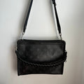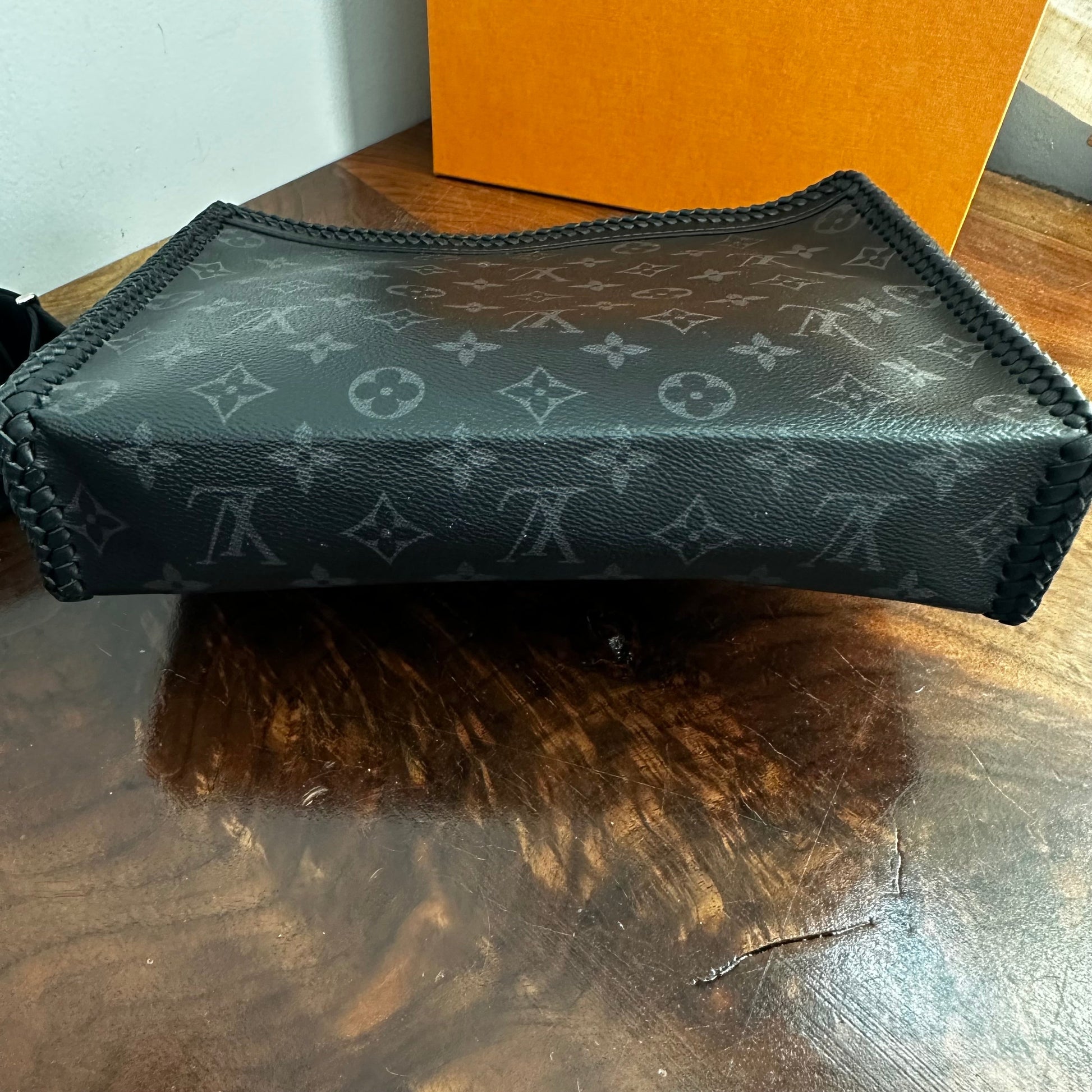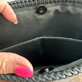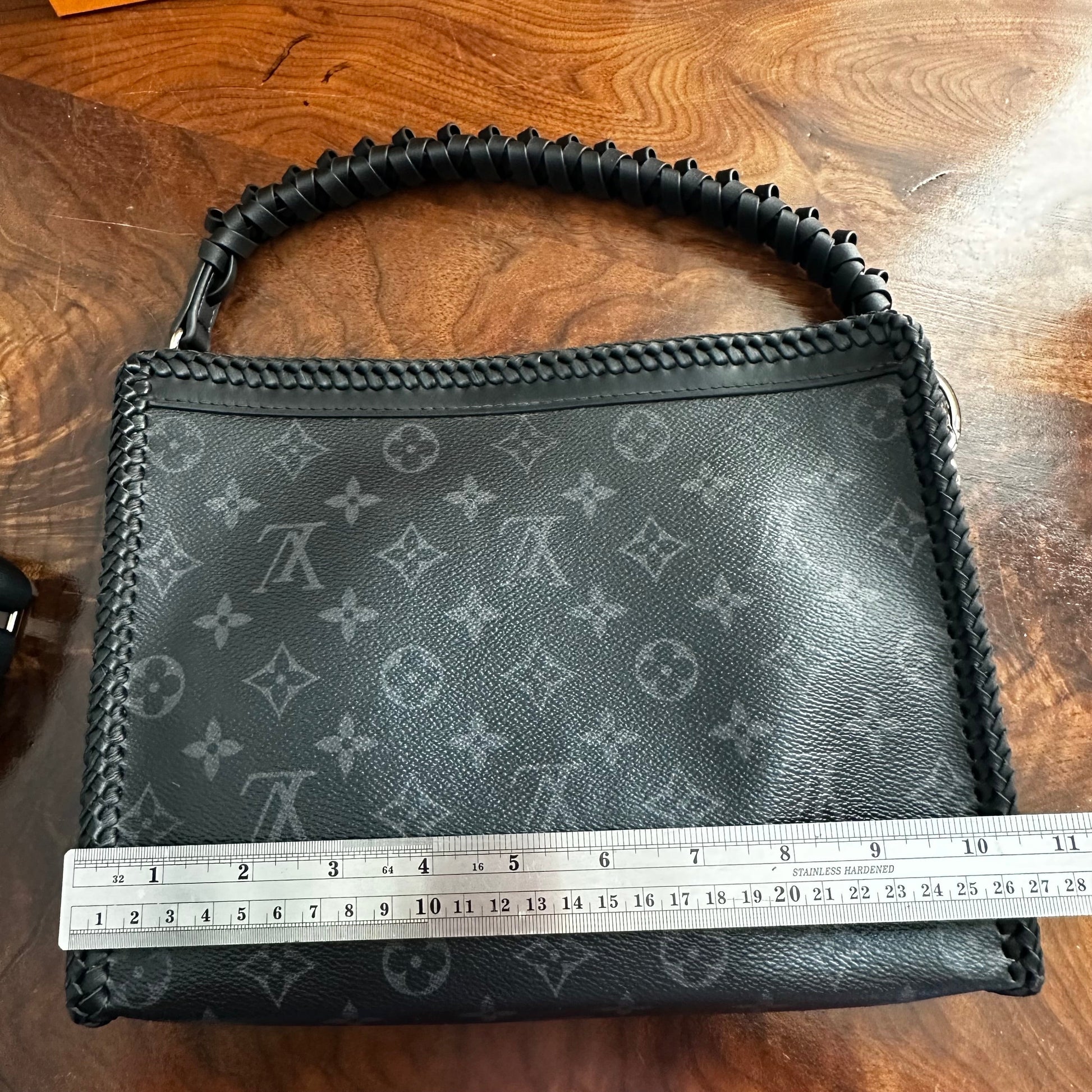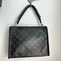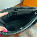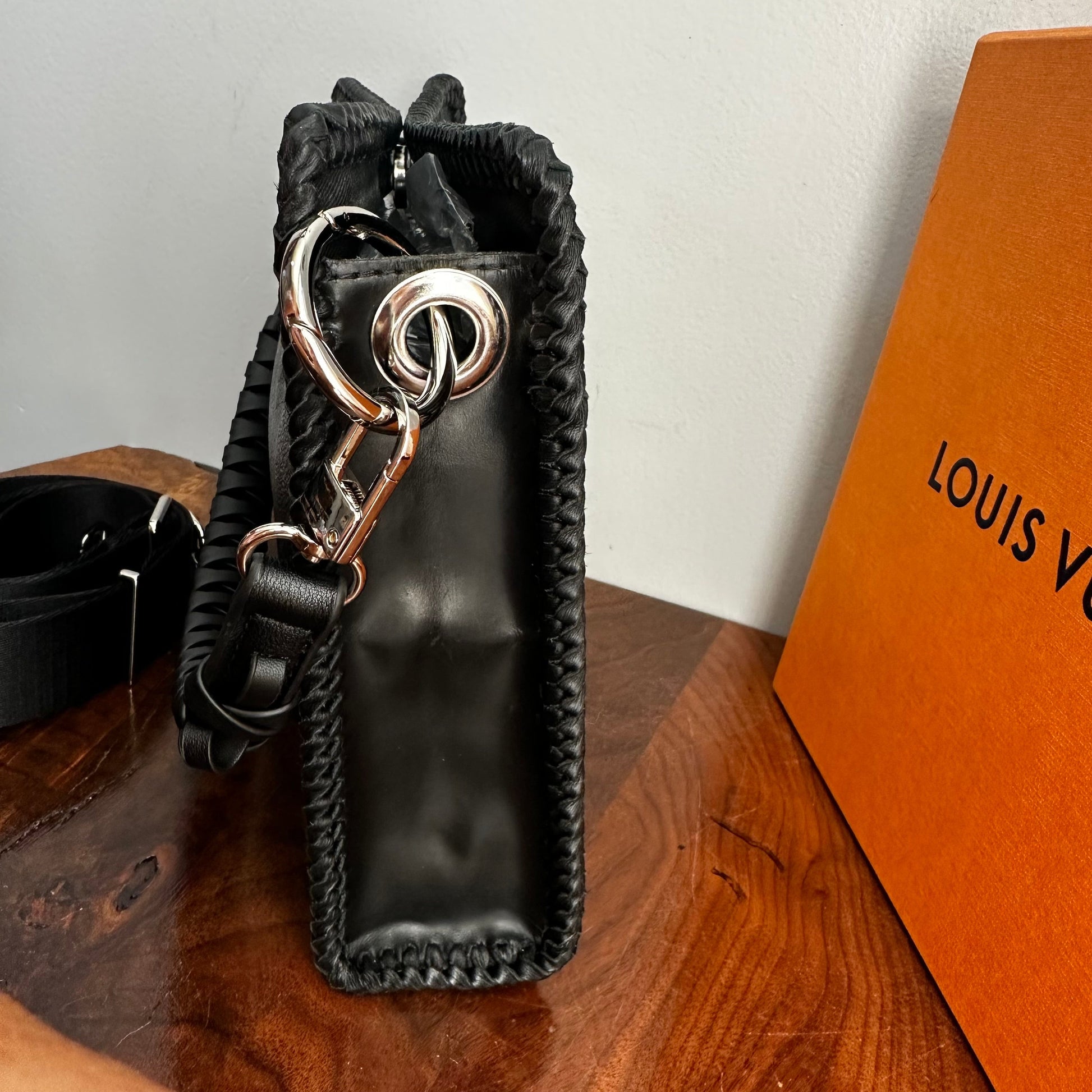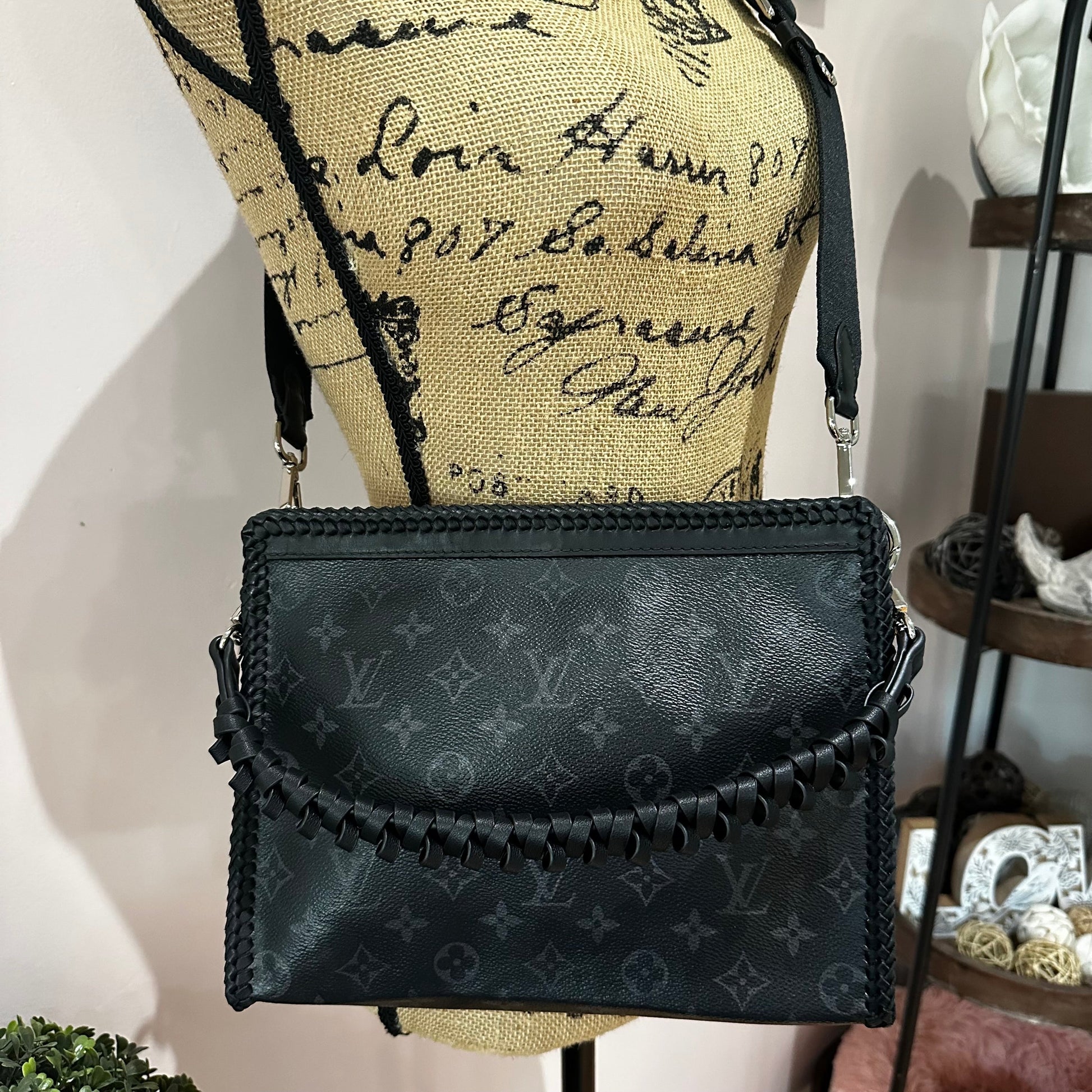 The bag's exterior monogram is in great condition with just slight wear! The sides had worn so I've hand braided all outside edges with a black leather lace. This makes her stand out for sure!!! The top zipper was removed as it was no longer functional. The interior is the original black canvas and still has the credit card slots, a pocket and a large roomy interior. a cream leather that has a few marks on it, but is clean. There's also a simple graphite-colored magnetic snap at the top of the bag to keep your items inside.