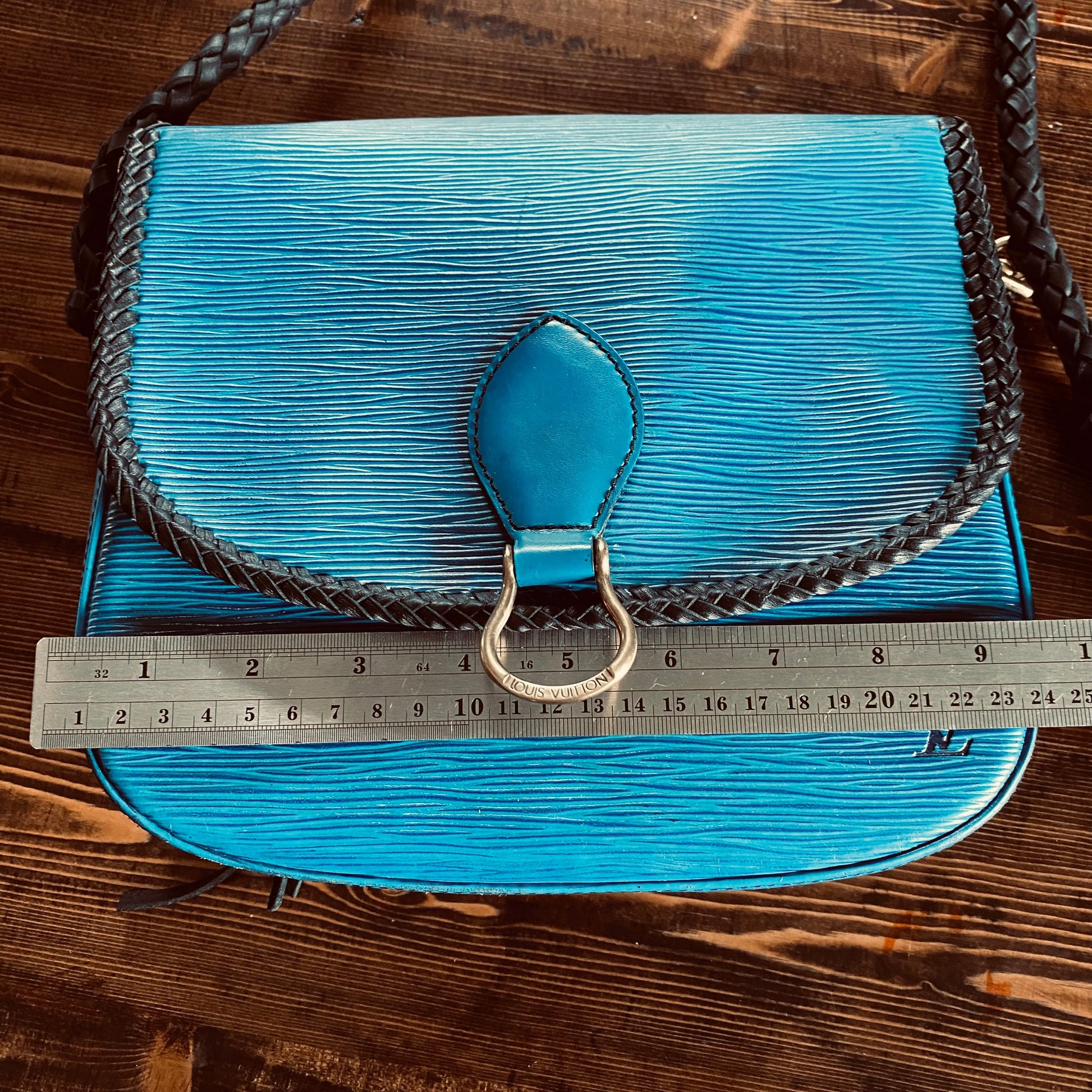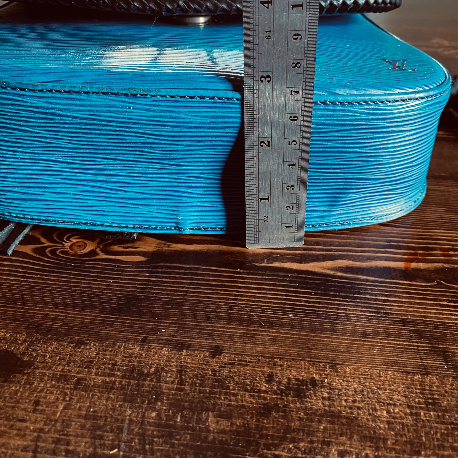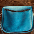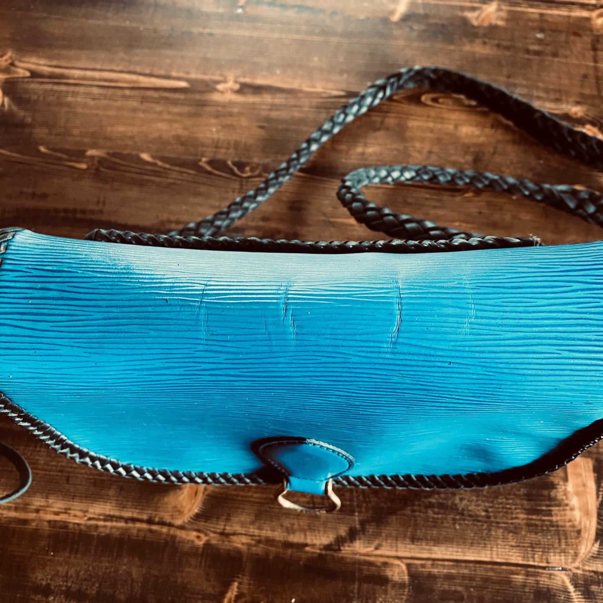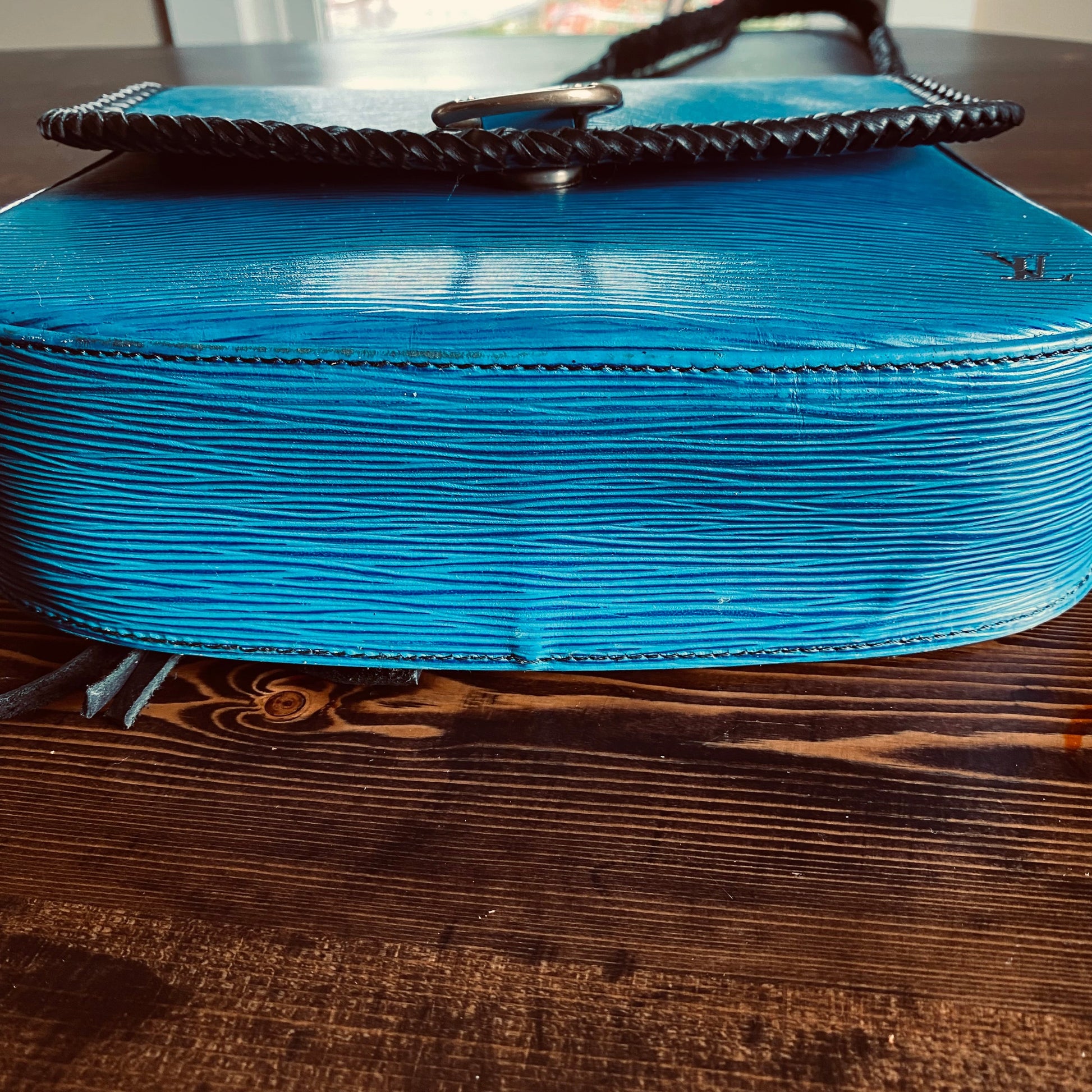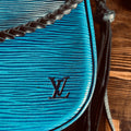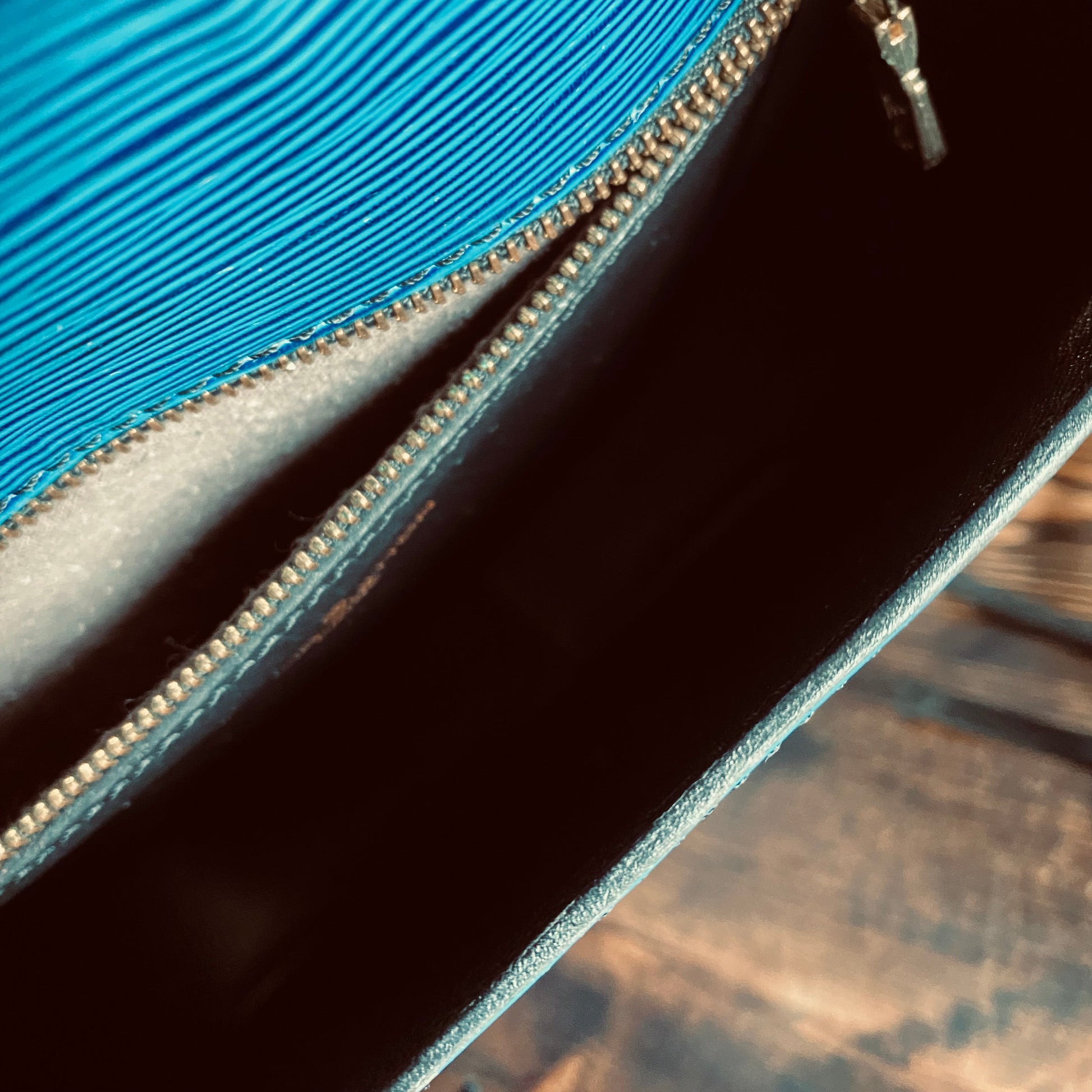 I've added black leather braiding to the outside of the front flap and also the back pocket. This bag has got enough room for just the right amount of things, coming in at W 9.4 x H 8.3 x D 2.8 ". The Toledo Blue Epi leather is in good shape. There are some creases in it, but no tears. Because both pockets contained sticky Vuittonite (see below), I've cleaned them thoroughly. They are no longer sticky, and are just soft flannel. There is one small zippered pocket inside and an envelope pocket in the back that is 5" tall (perfect for your phone!). I replaced the strap with a braided 6-strand black leather one is the perfect length to wear crossbody (47.5"). It has a flat section that sits comfortably across your body, and then moves into a round section towards the antique brass clasp, and then ends in fringe (may be trimmed to your liking).
