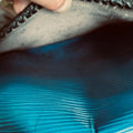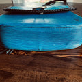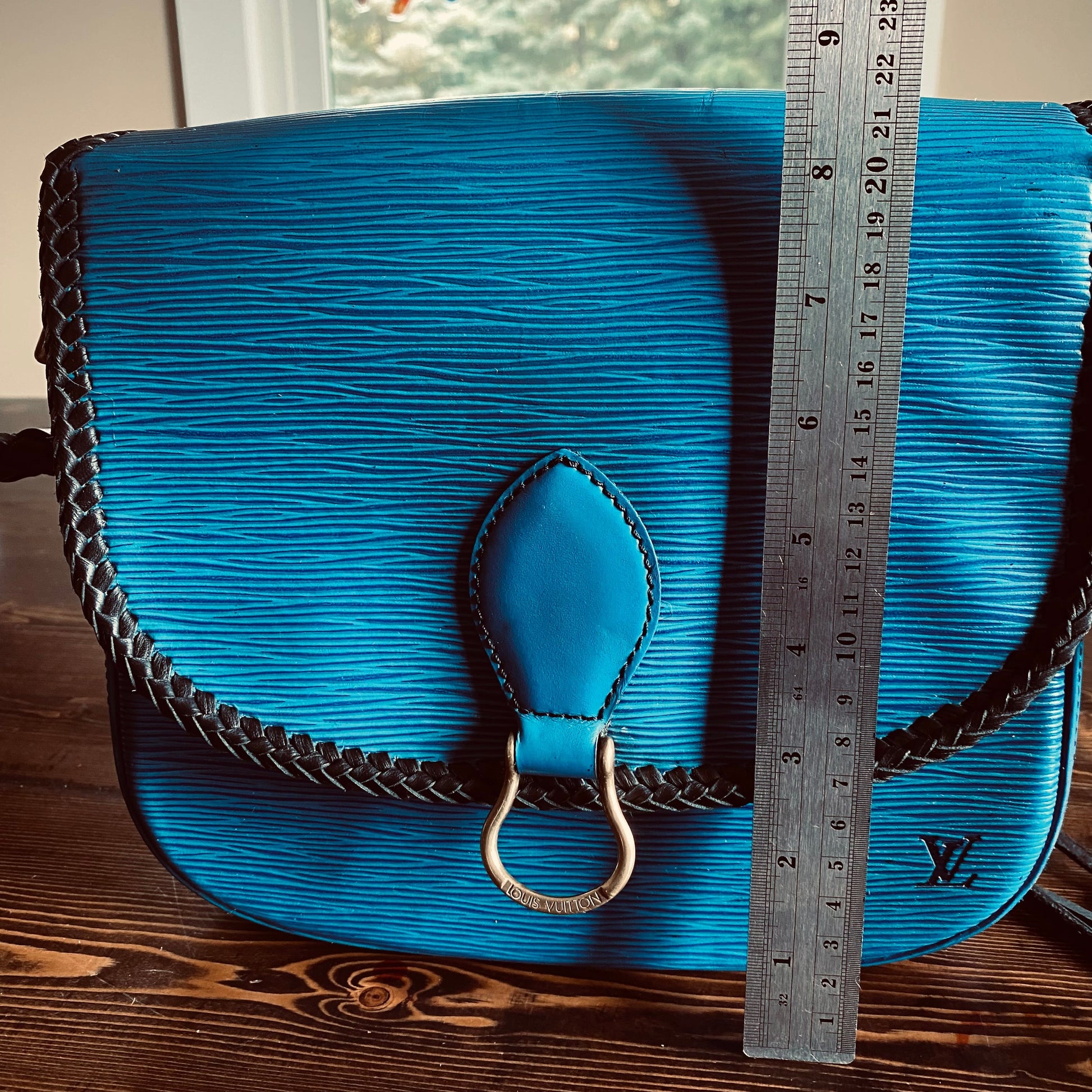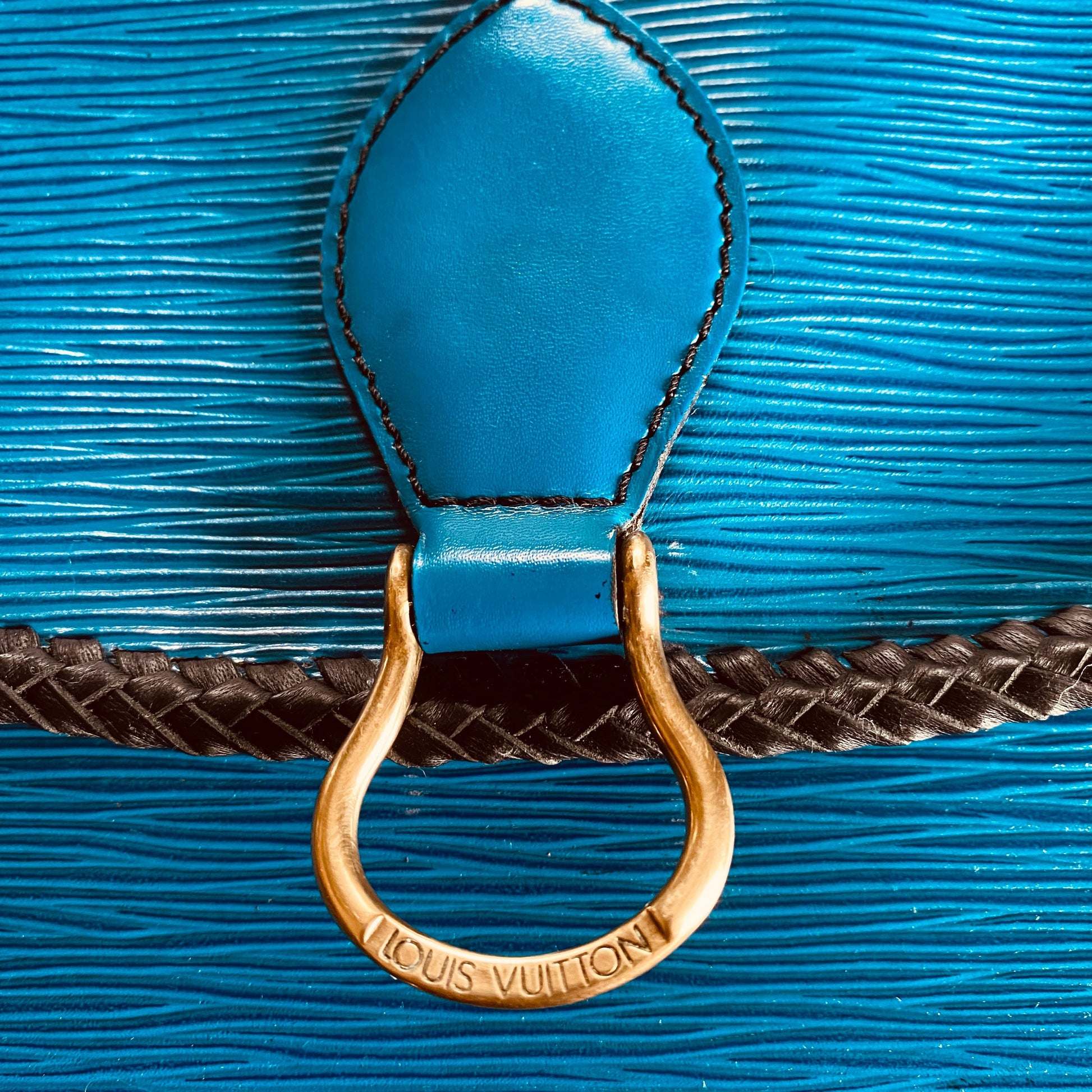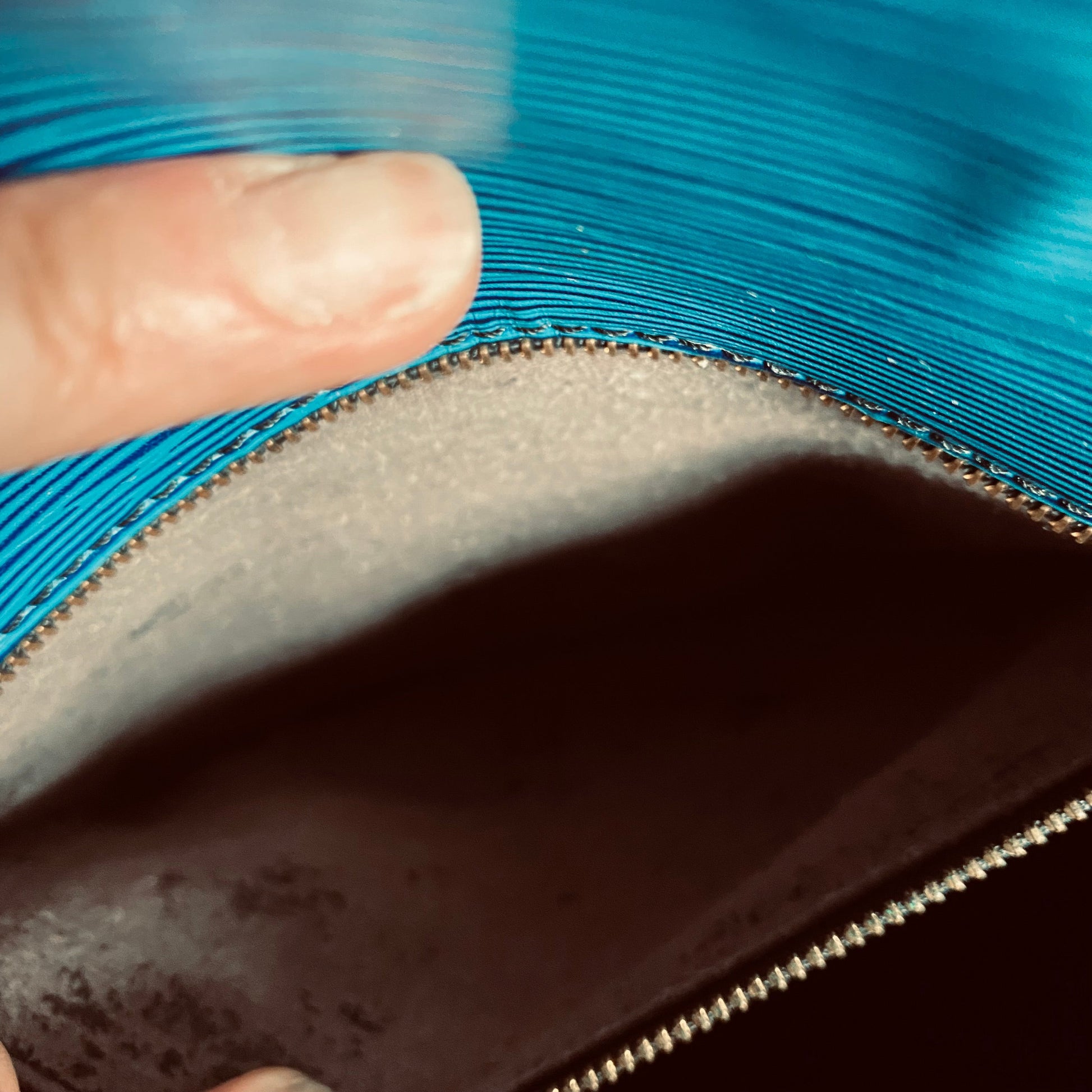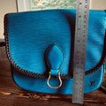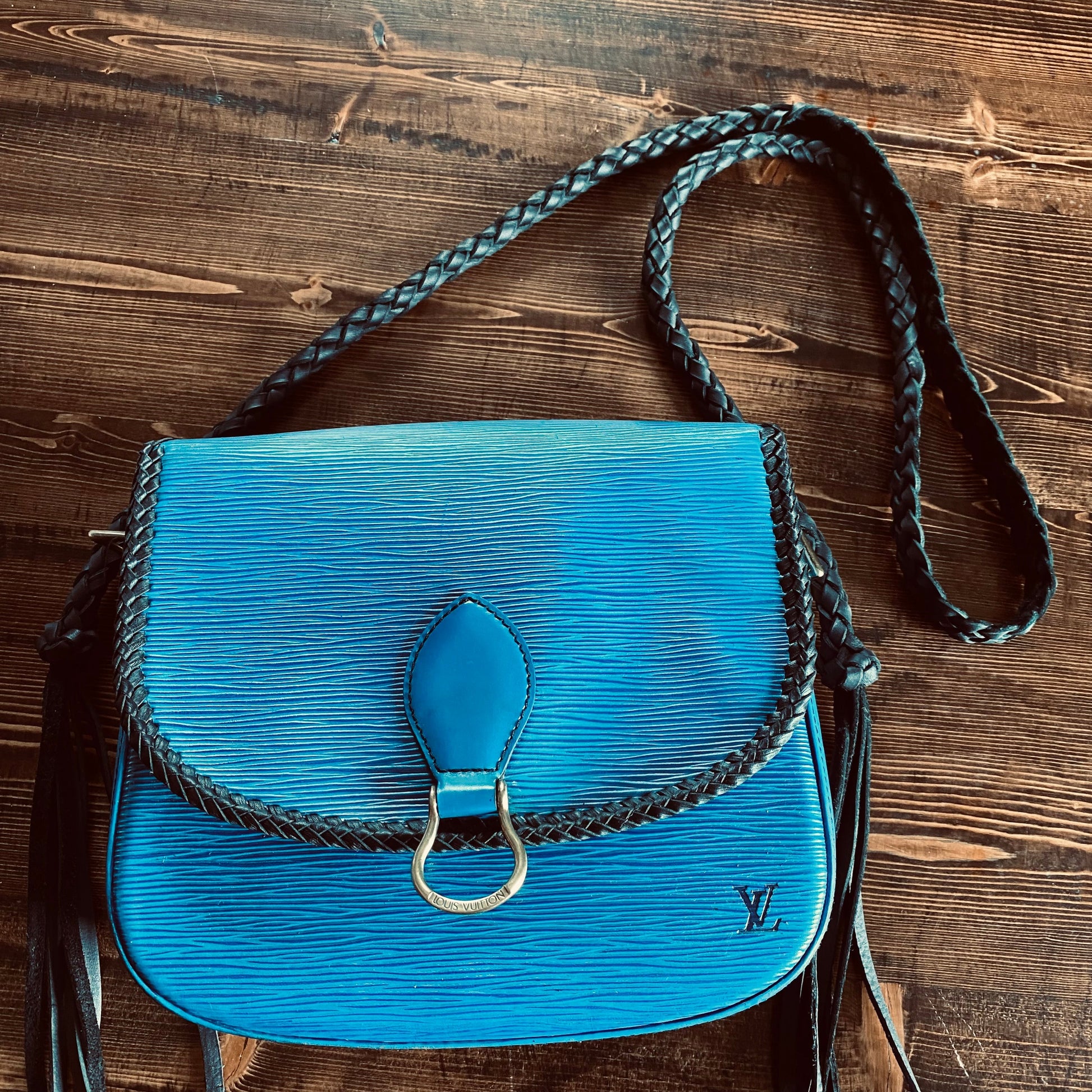 I've added black leather braiding to the outside of the front flap and also the back pocket. This bag has got enough room for just the right amount of things, coming in at W 9.4 x H 8.3 x D 2.8 ". The Toledo Blue Epi leather is in good shape. There are some creases in it, but no tears. Because both pockets contained sticky Vuittonite (see below), I've cleaned them thoroughly. They are no longer sticky, and are just soft flannel. There is one small zippered pocket inside and an envelope pocket in the back that is 5" tall (perfect for your phone!). I replaced the strap with a braided 6-strand black leather one is the perfect length to wear crossbody (47.5"). It has a flat section that sits comfortably across your body, and then moves into a round section towards the antique brass clasp, and then ends in fringe (may be trimmed to your liking).