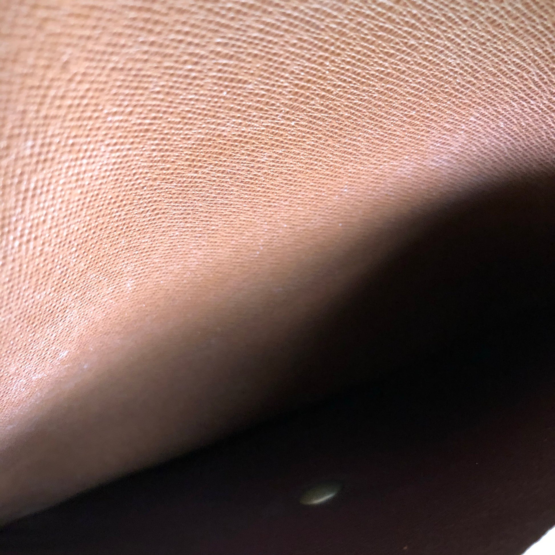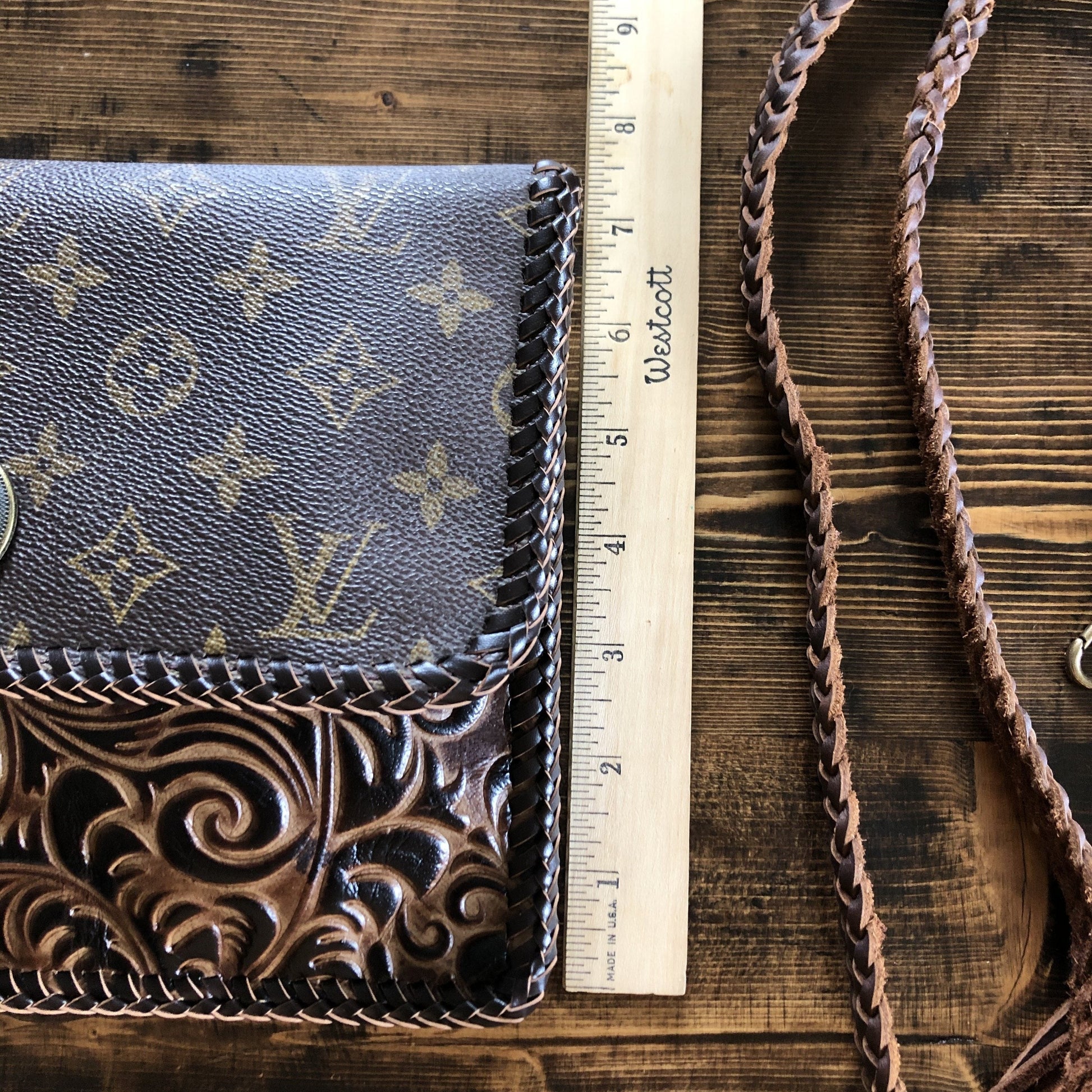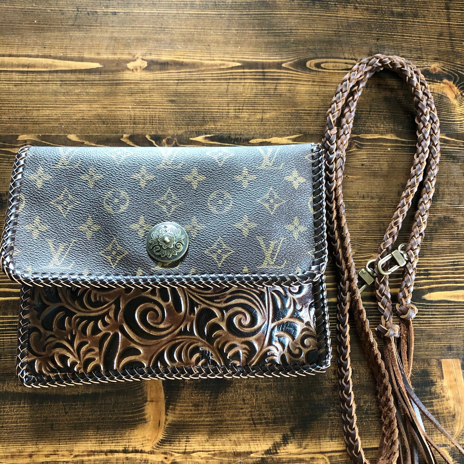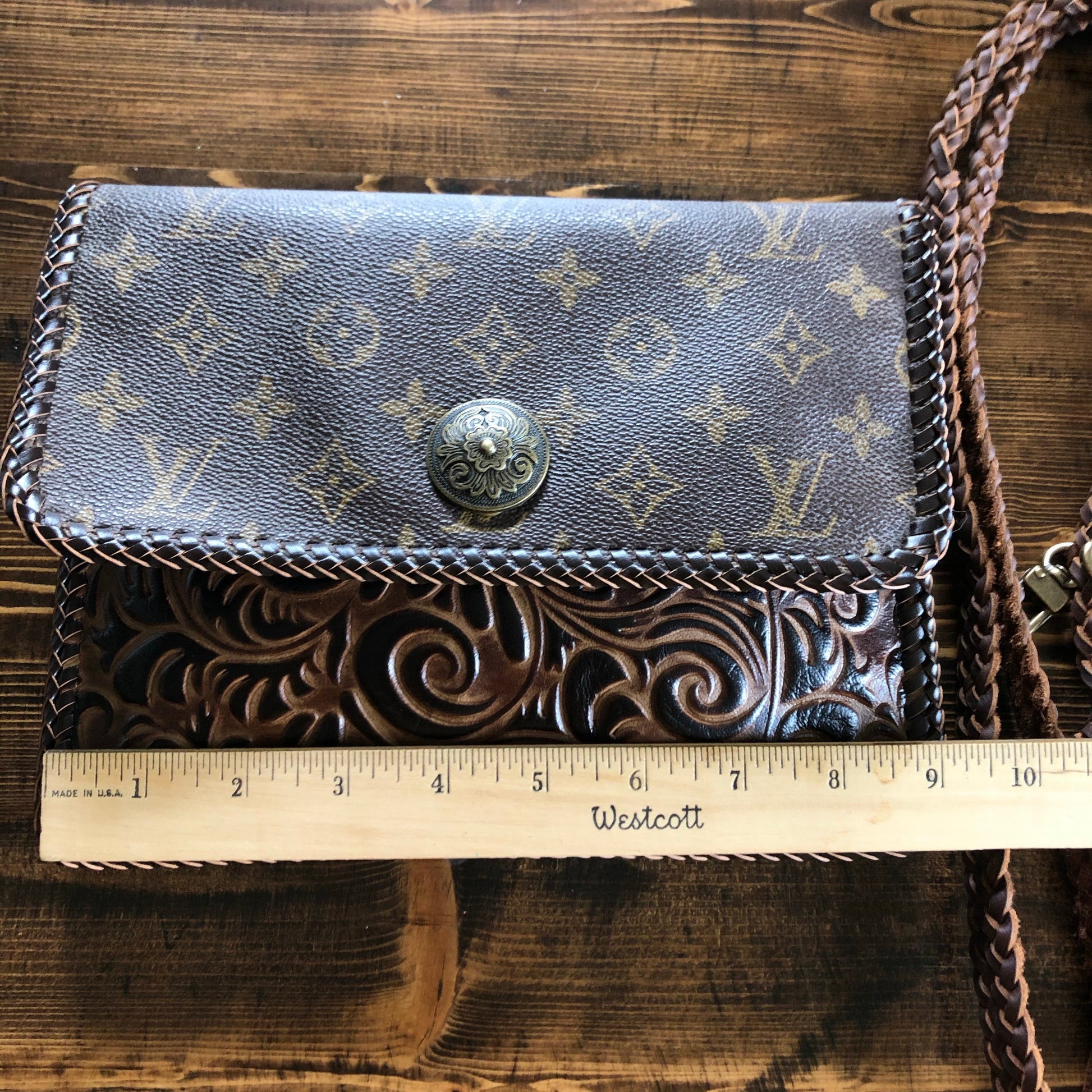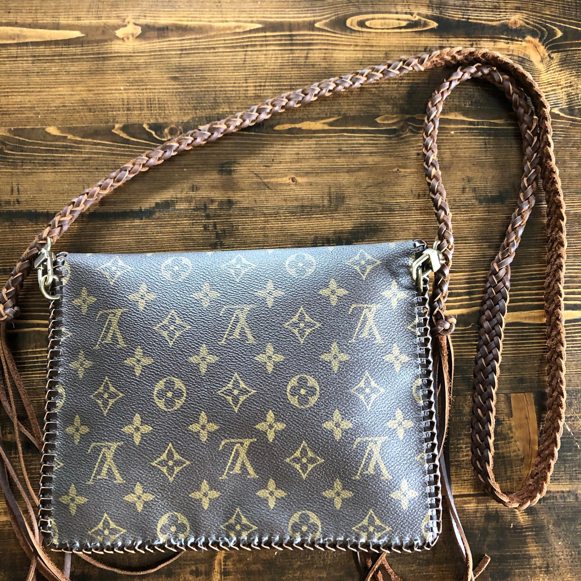 The LV canvas still has its brown leather backing, and the embossed leather is lined with vegan leather to make it more substantial. This crossbody/clutch (9"W x 7"H) is stitched by hand with brown leather lace. There is one compartment in the interior. There is a 6-strand brown braided leather strap that is flat where it sits across your body, and round towards the clasp. It is 48.5" long and has a small amount of fringe that can be trimmed down if desired. If you remove the strap, you'll have a gorgeous fashionable clutch. All of the hardware on this bag is brass with an antique bronze finish, including thePrestige Totes looking concho clasp that hides the magnetic snap.