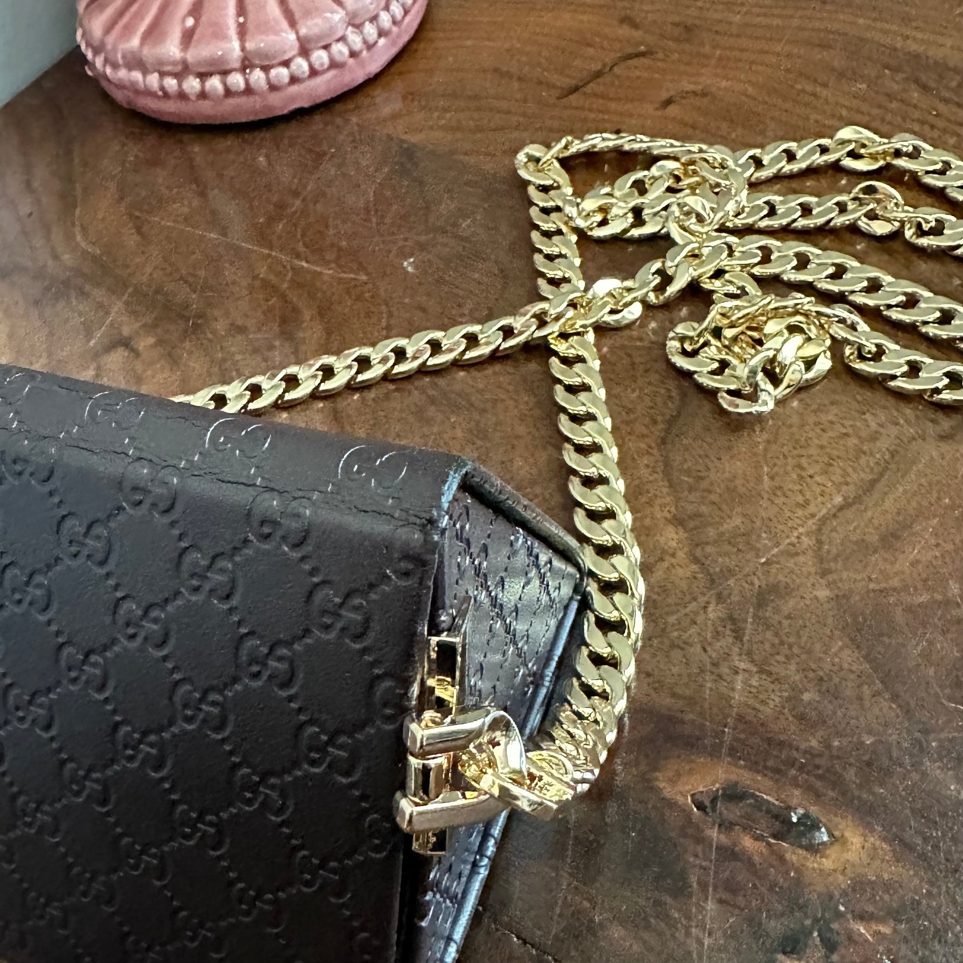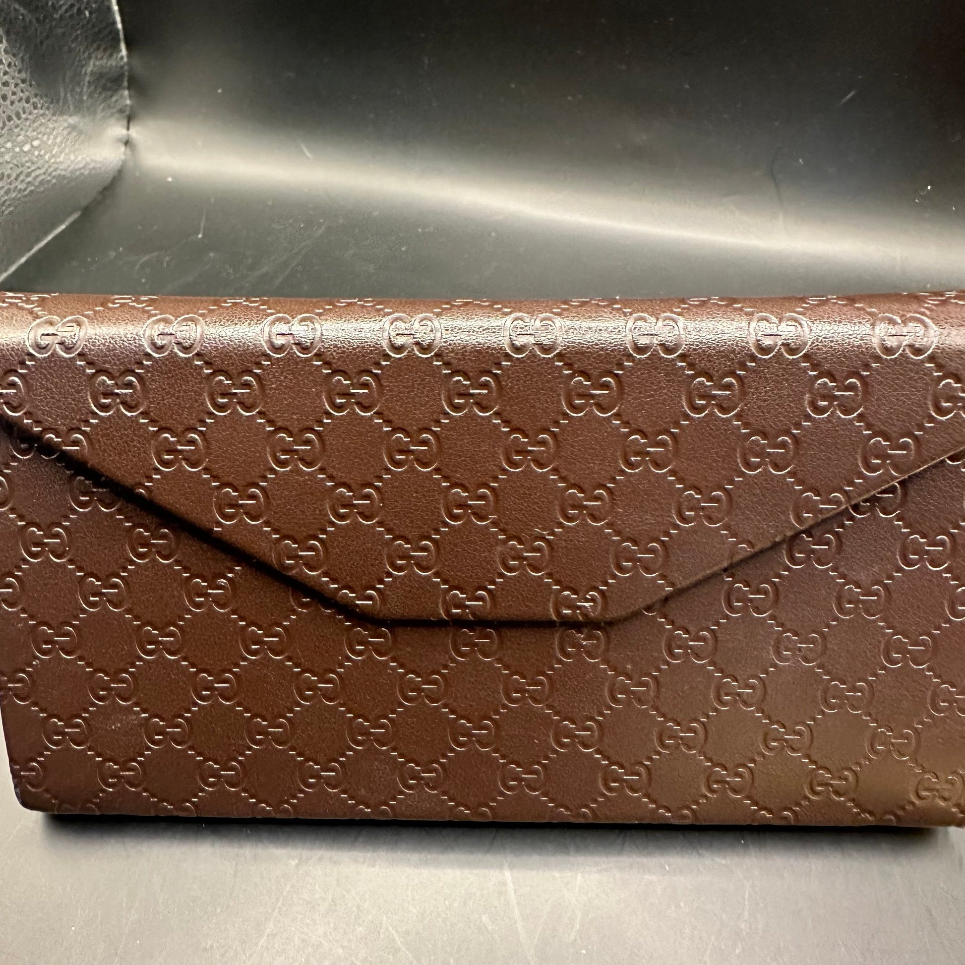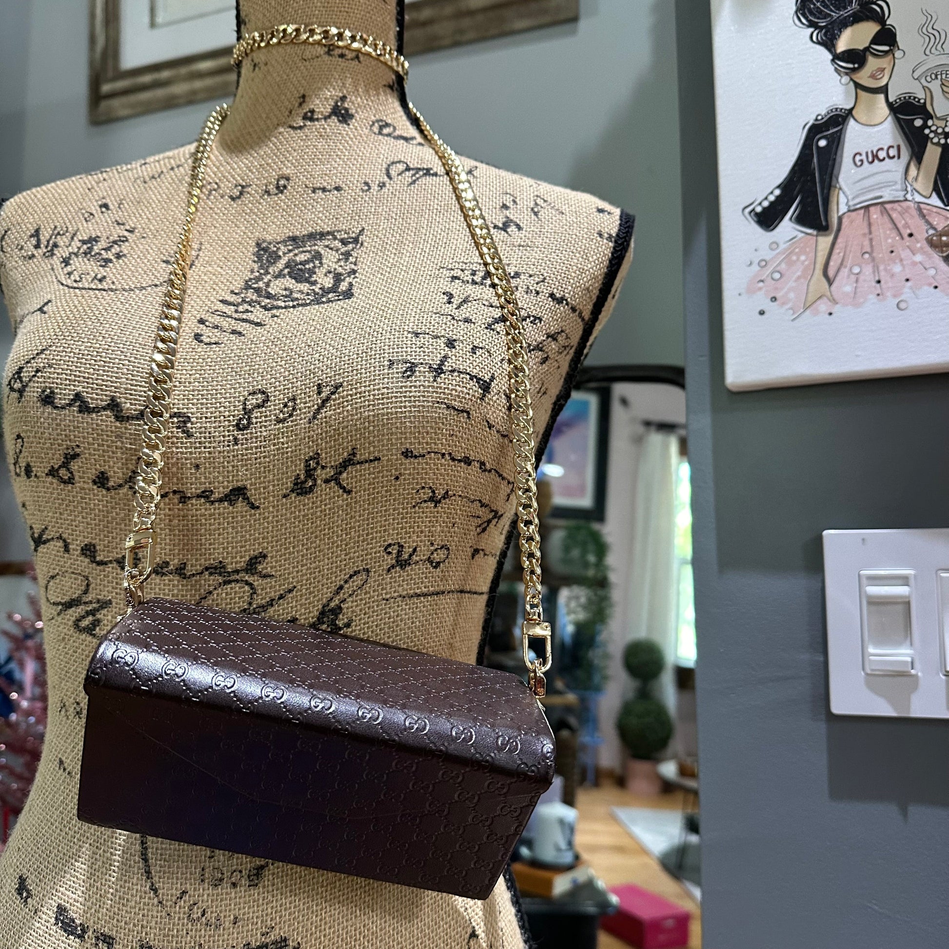 This is actually an Gucci leather eyeglass case that has been repurposed into a crossbody bag. This one is the "larger sized" glasses case and fits a few more things. I just had to try it! The exterior leather is in decent shape, but there are a few wear marks on the corners that I've touched up (please see pics). The interior is flannel and is clean. I've added gold D-rings to the sides of the case that hold the 47" crossbody chain strap.