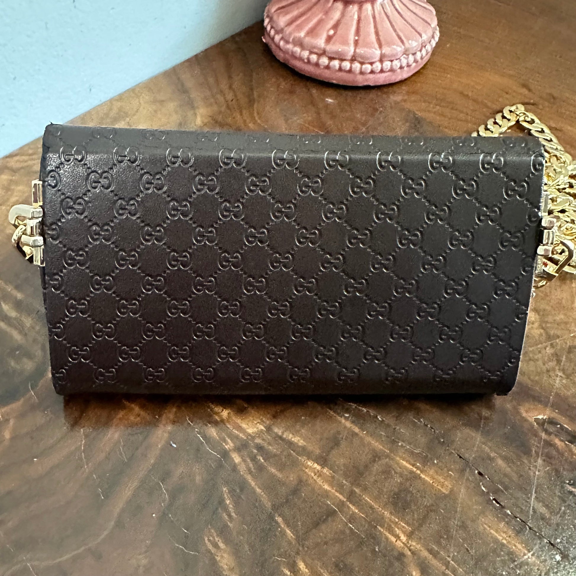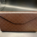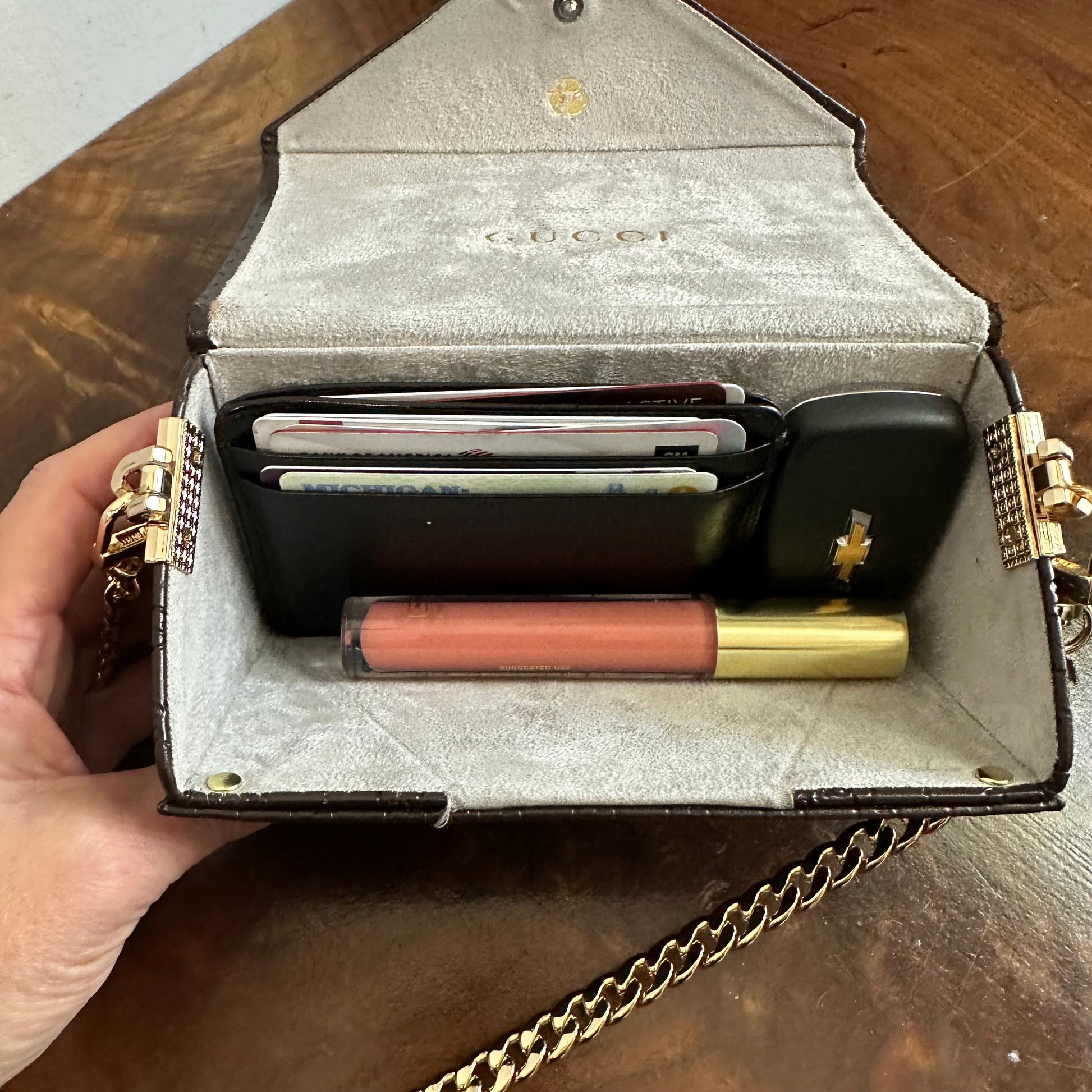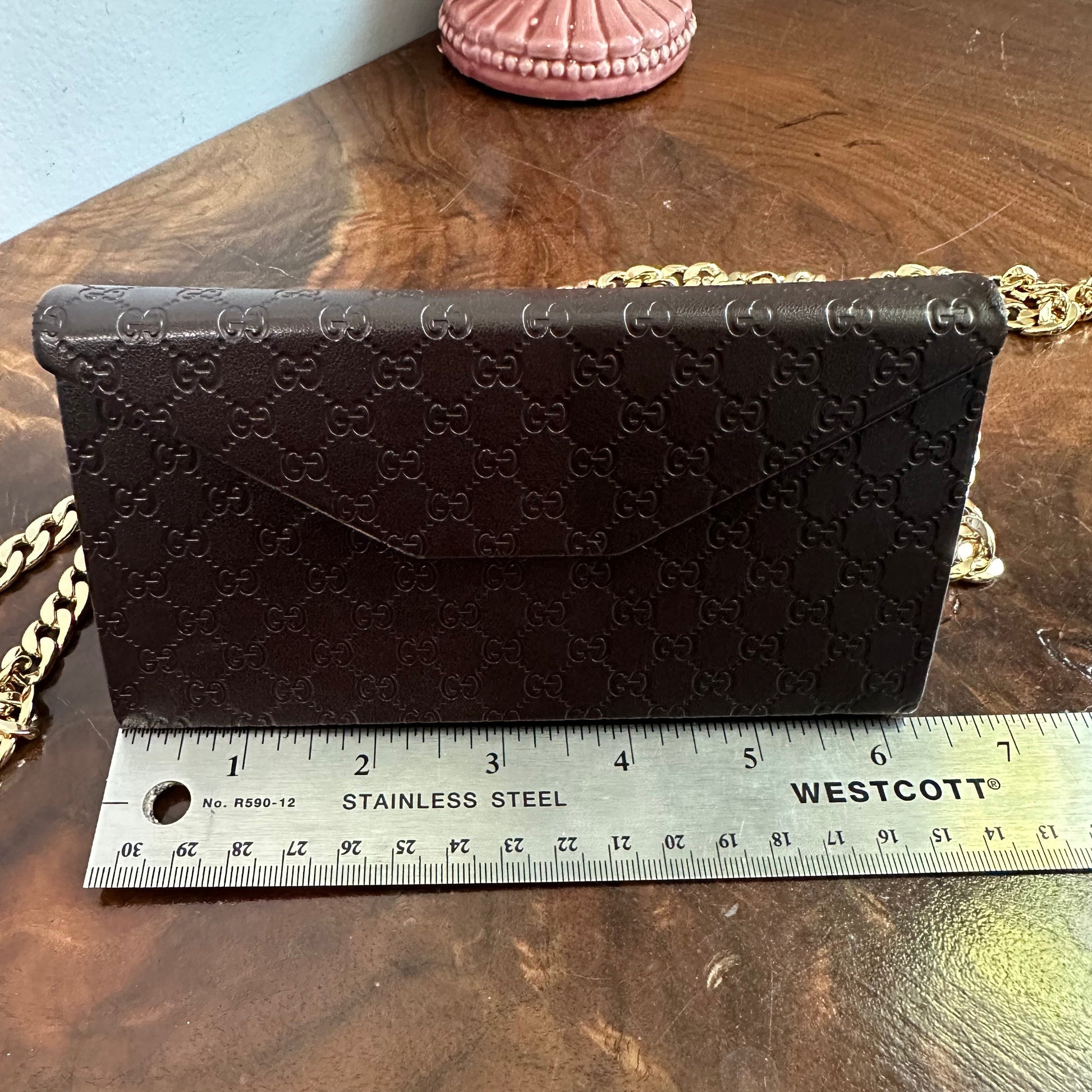 This is actually an Gucci leather eyeglass case that has been repurposed into a crossbody bag. This one is the "larger sized" glasses case and fits a few more things. I just had to try it! The exterior leather is in decent shape, but there are a few wear marks on the corners that I've touched up (please see pics). The interior is flannel and is clean. I've added gold D-rings to the sides of the case that hold the 47" crossbody chain strap.