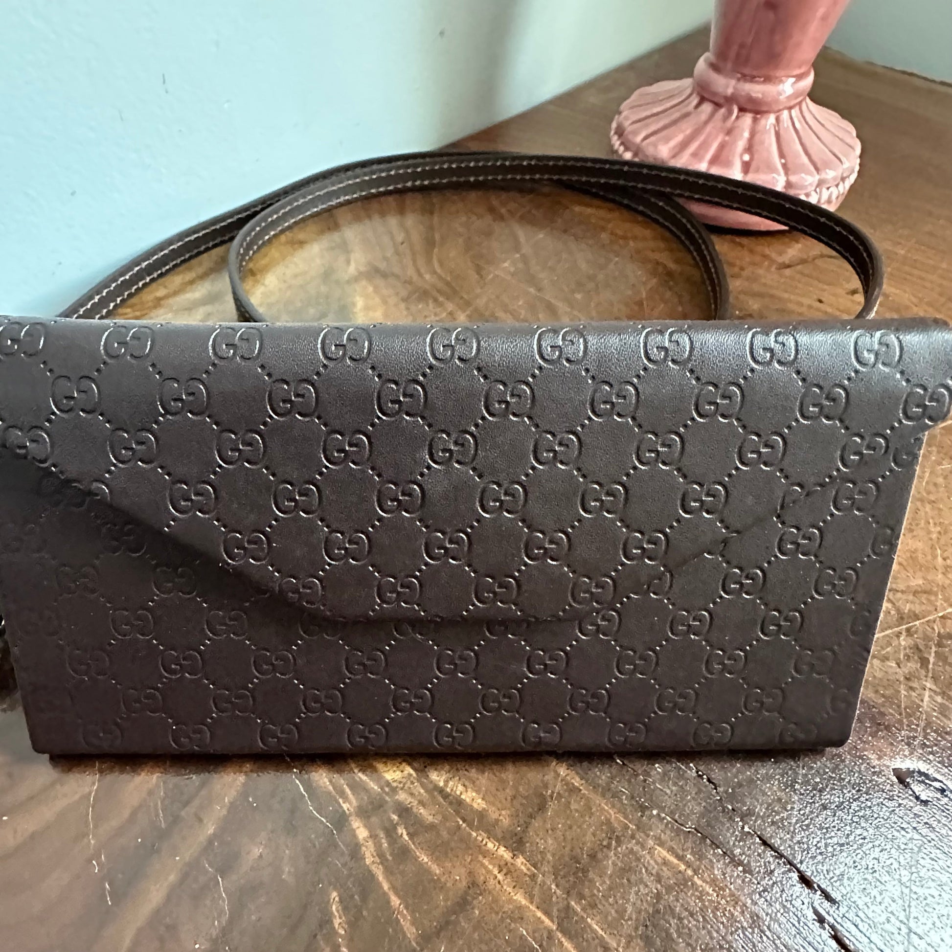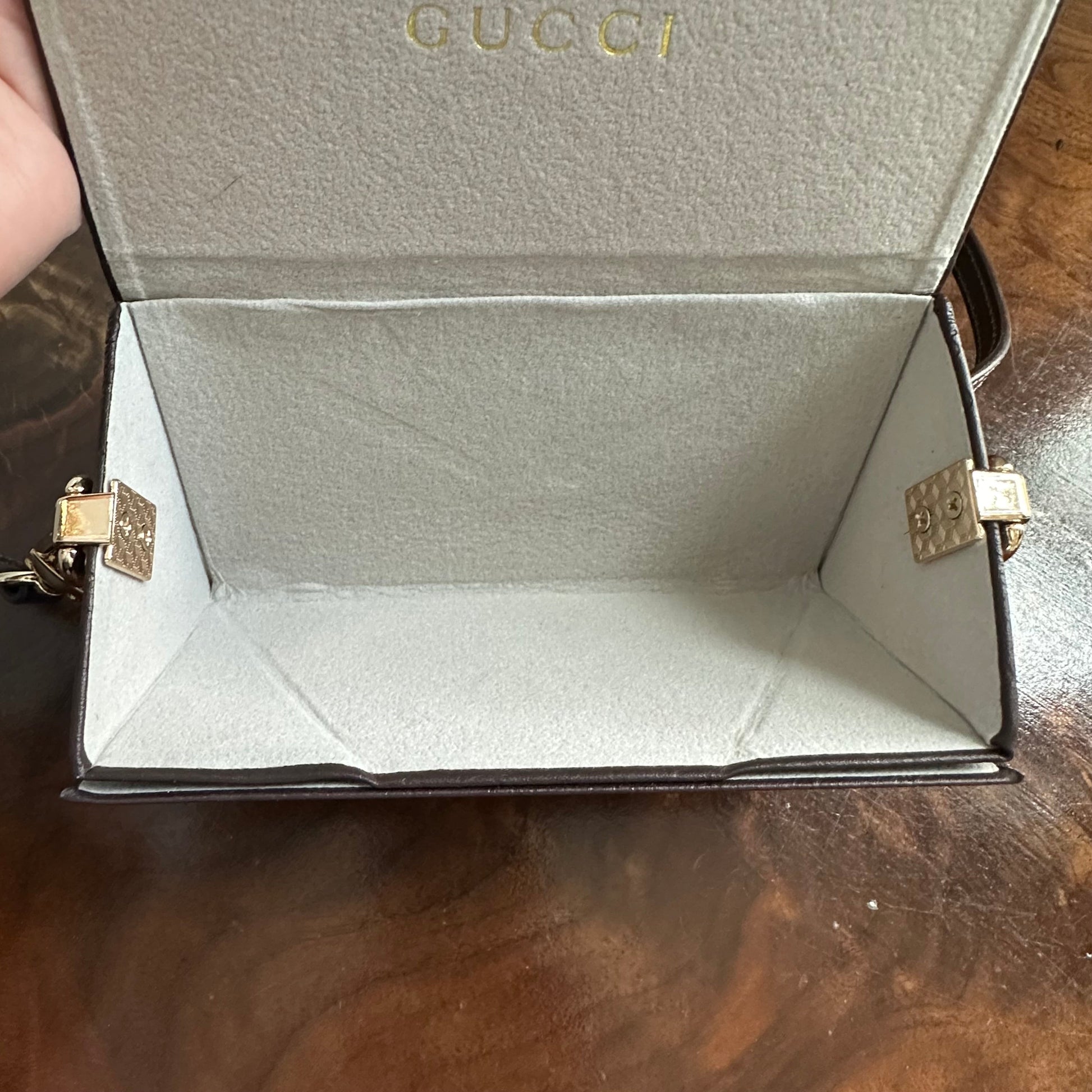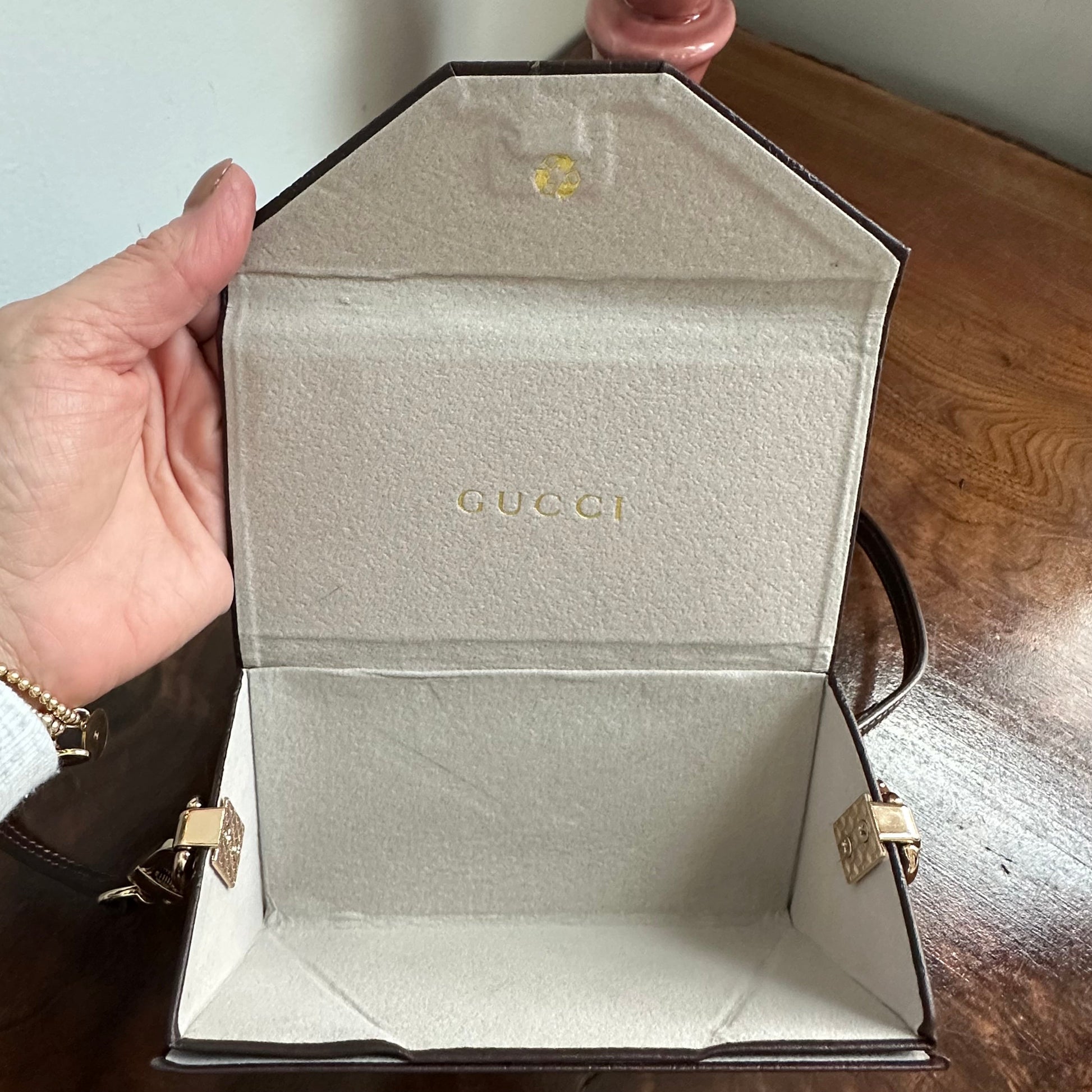 This is actually an Gucci leather eyeglass case that has been repurposed into a crossbody bag. This one is the "larger sized" glasses case and has a hidden magnetic snap, which I LOVE!!! The exterior leather is in excellent shape. The interior is flannel and is clean. I've added gold D-rings to the sides of the case that hold the 44" brown leather crossbody strap.