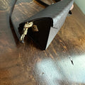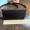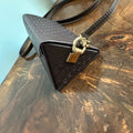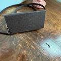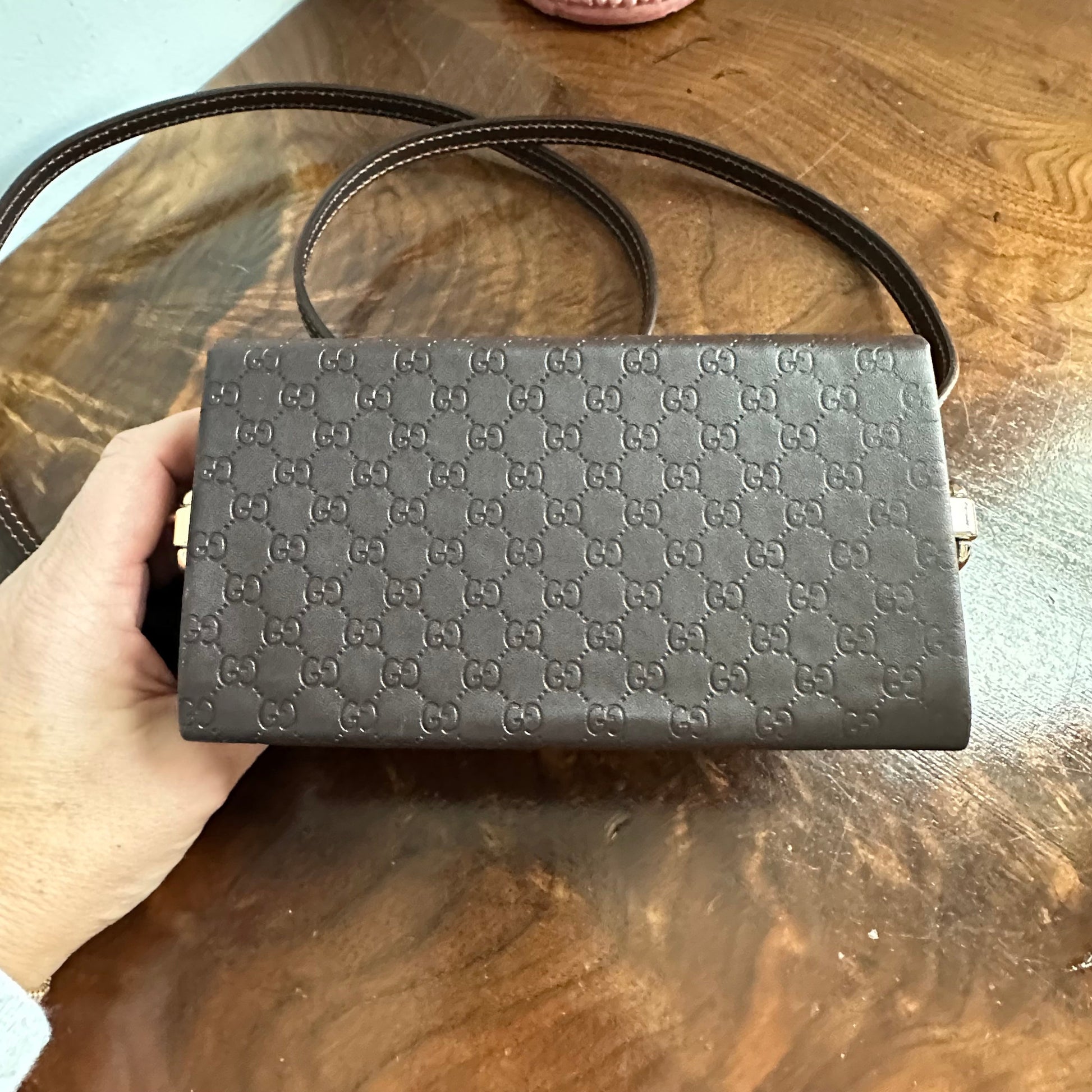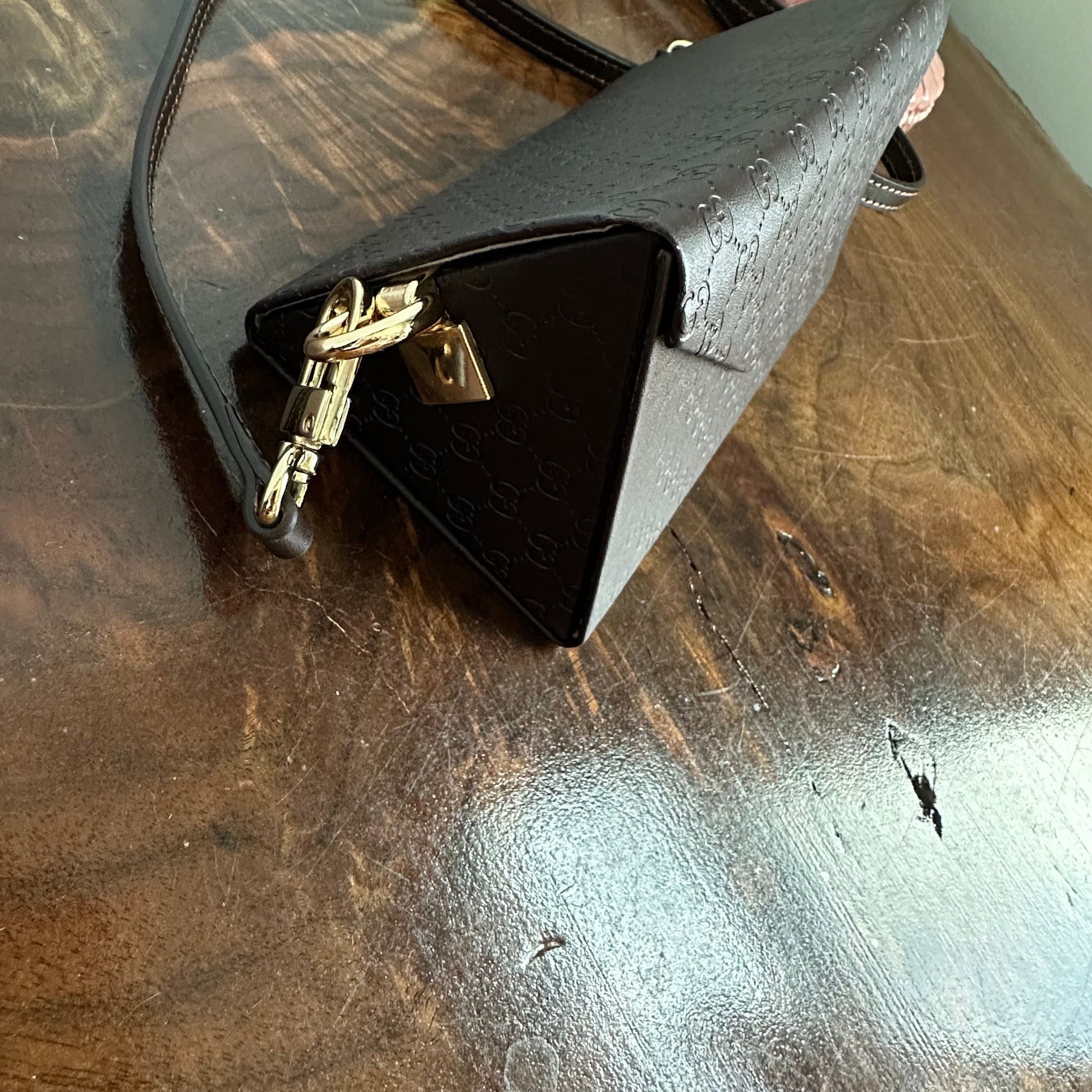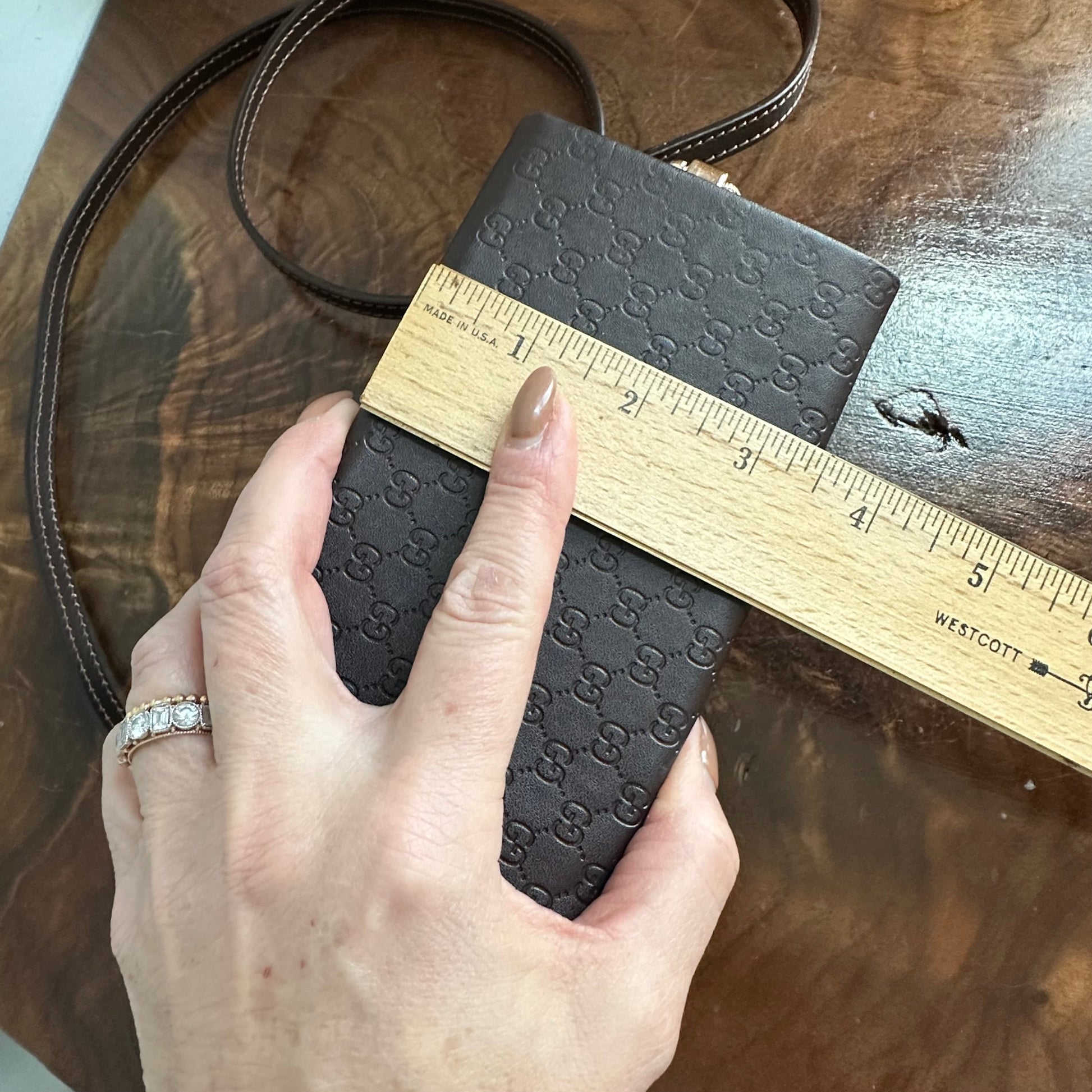 This is actually an Gucci leather eyeglass case that has been repurposed into a crossbody bag. This one is the "larger sized" glasses case and has a hidden magnetic snap, which I LOVE!!! The exterior leather is in excellent shape. The interior is flannel and is clean. I've added gold D-rings to the sides of the case that hold the 44" brown leather crossbody strap.