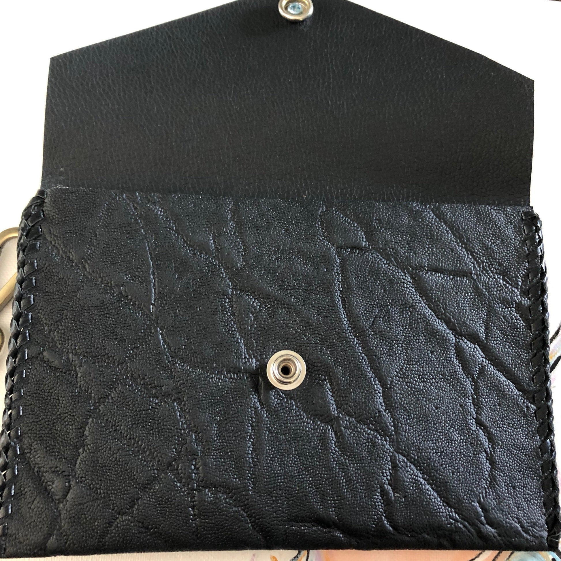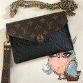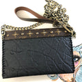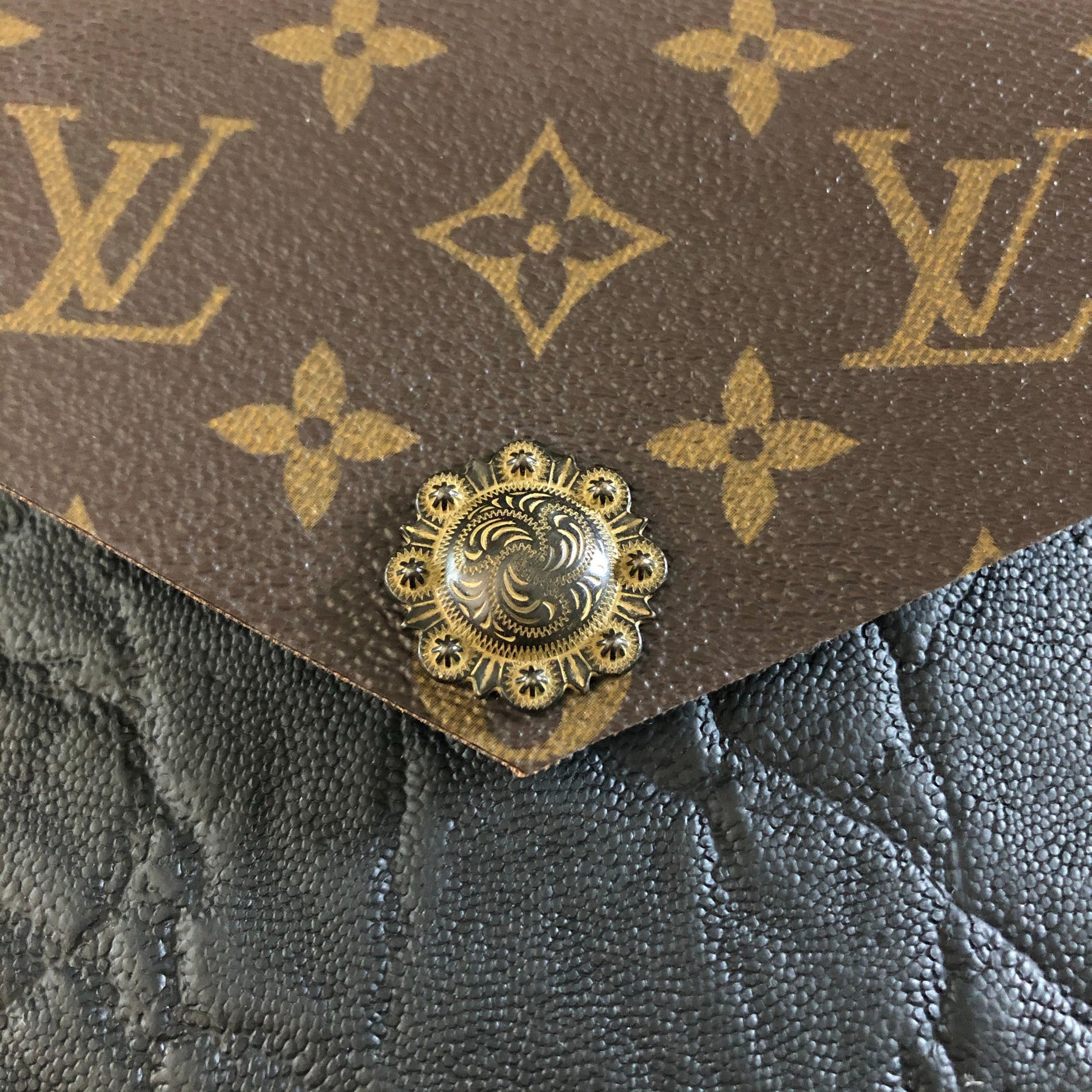 As always, an Louis Vuitton bag was used to create this beautiful little bag. The LV is lined in black leather, which protects it and gives it a nice feel. The back and front is a gorgeous black-embossed leather. The outside edge has been stitched by hand with black leather lace. There are two antique bronze D-rings stitched into the sides on the back that will hold the antique bronze crossbody chain (47"), or the click-n-go wristlet. The wristlet has the quatrefoil print. Perfect for your keys OR your wrist!! Or, take both off and turn this into a beautiful clutch! APrestige Totes style concho snap completes this look.