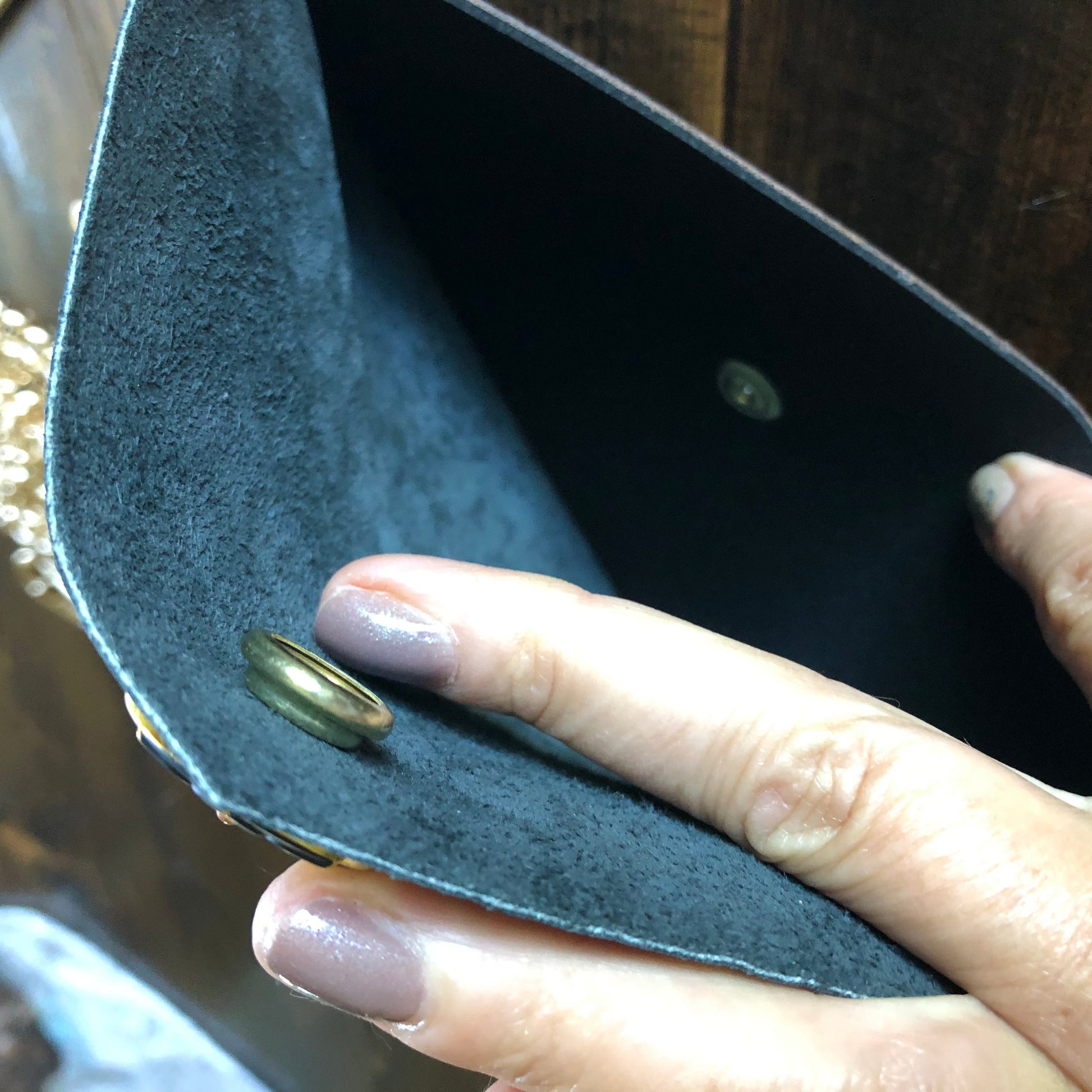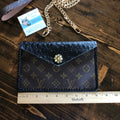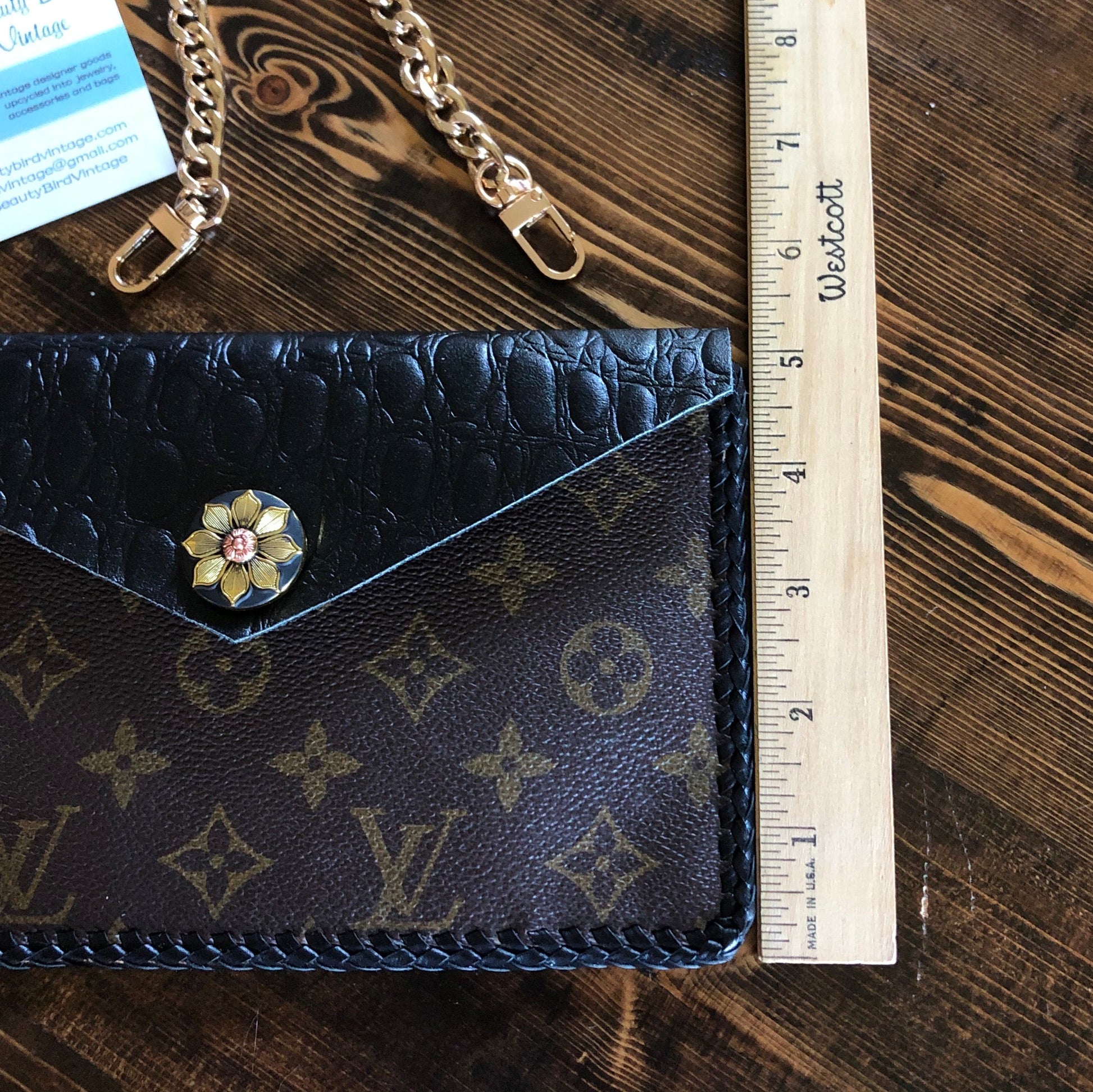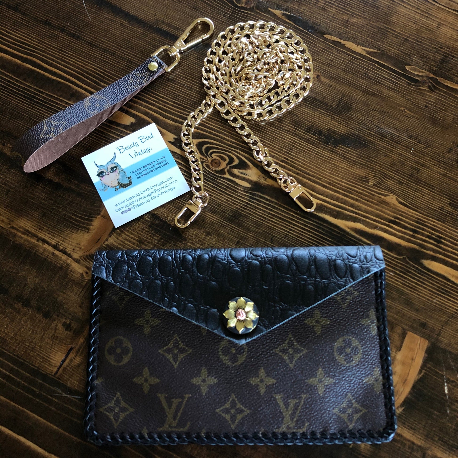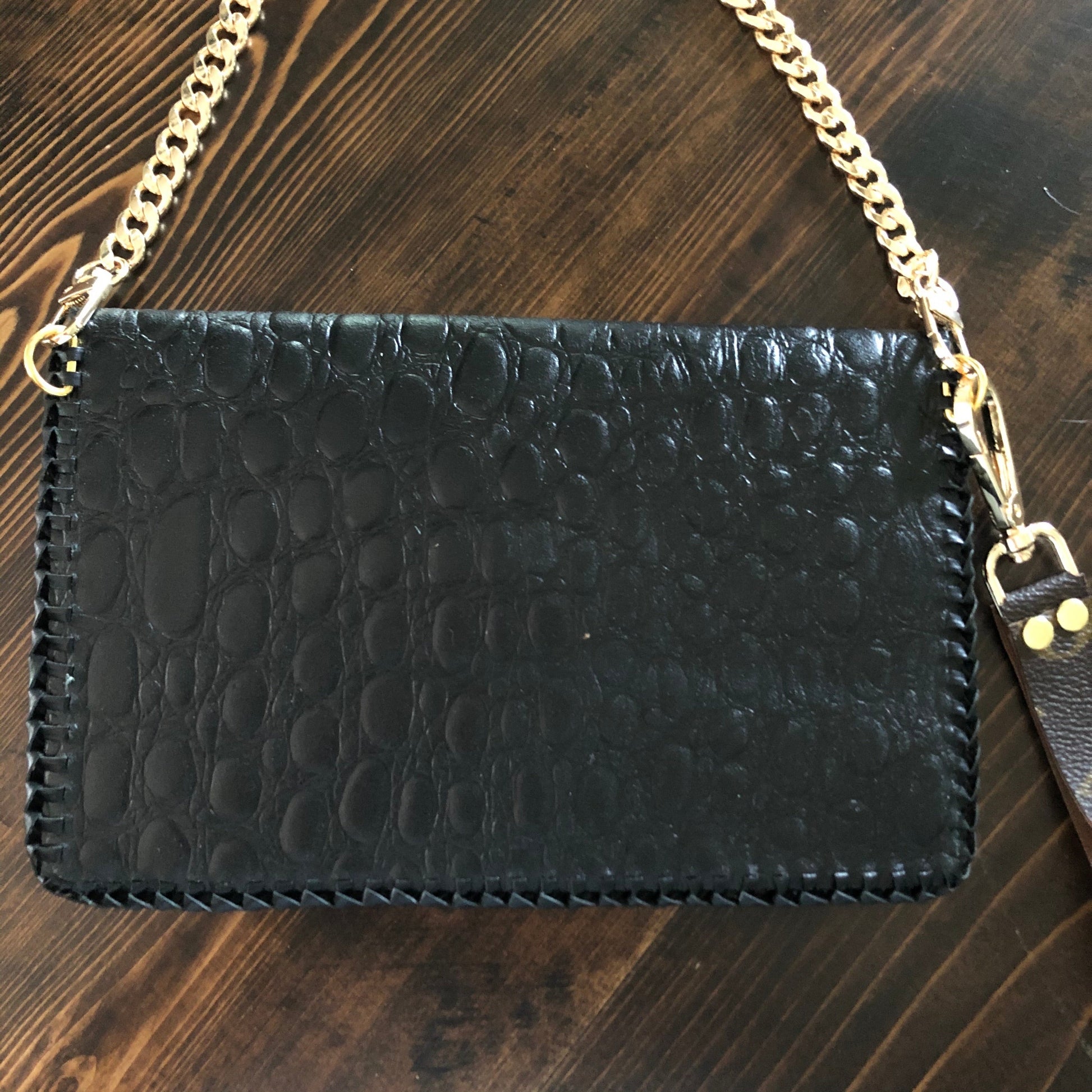 As always, an Louis Vuitton bag was used along with a gorgeous black gator-embossed leather. The outside edge is black leather lace which has been stitched by hand. There are two gold D-Rings that hold either a gold crossbody chain or the click-n-go wristlet. Remove them both and carry it as a clutch. APrestige Totes flower snap completes this look.