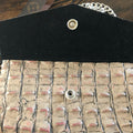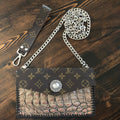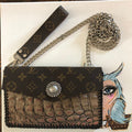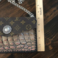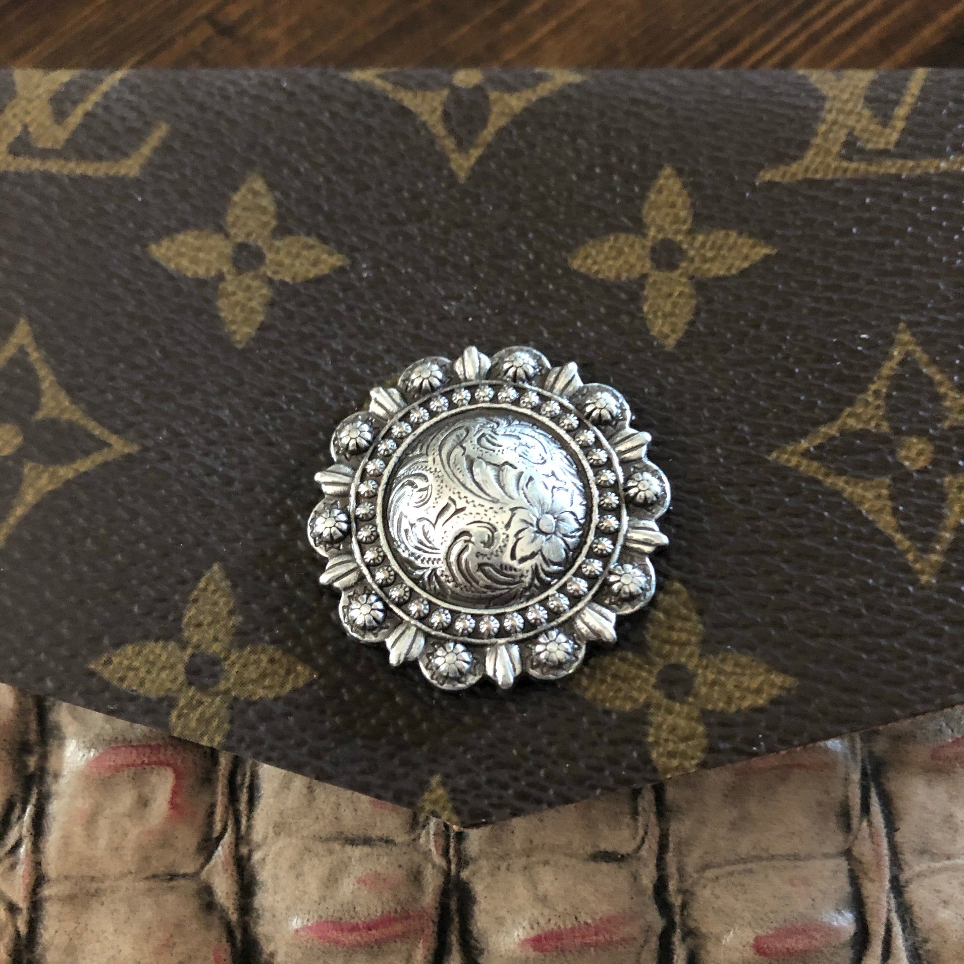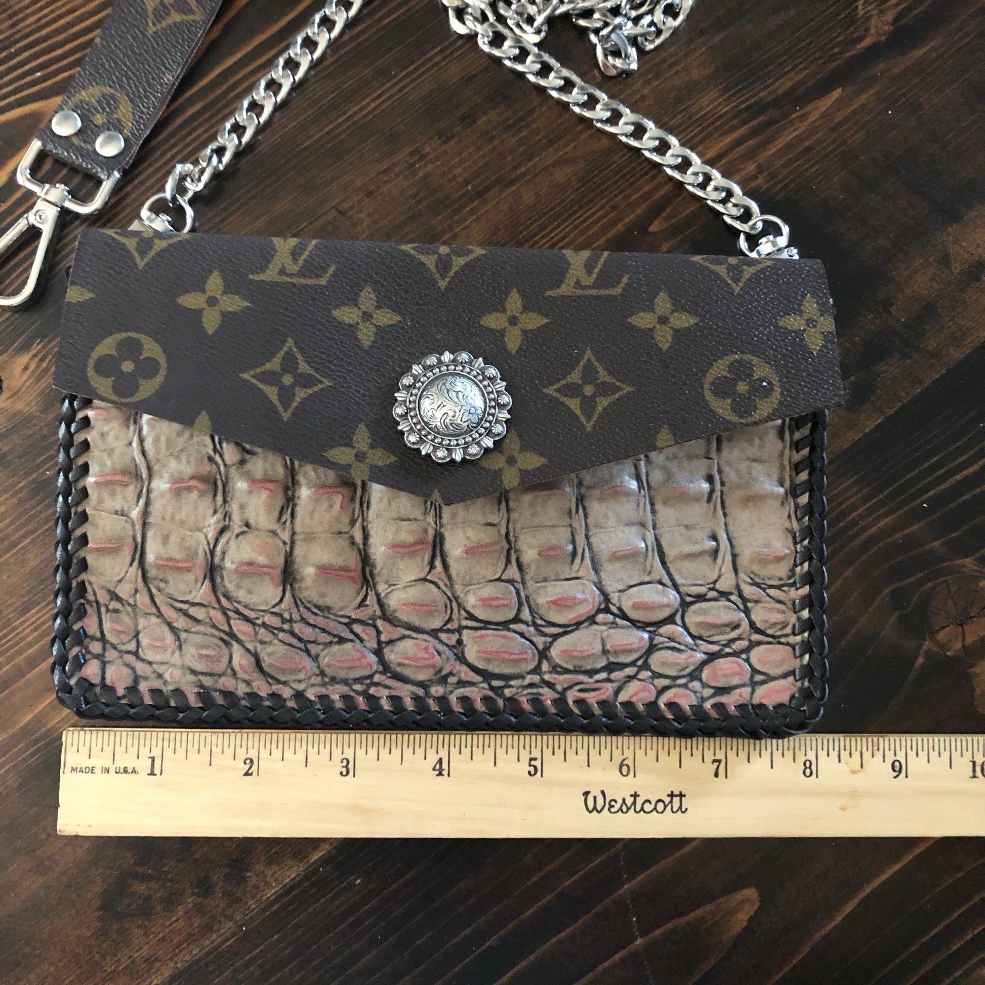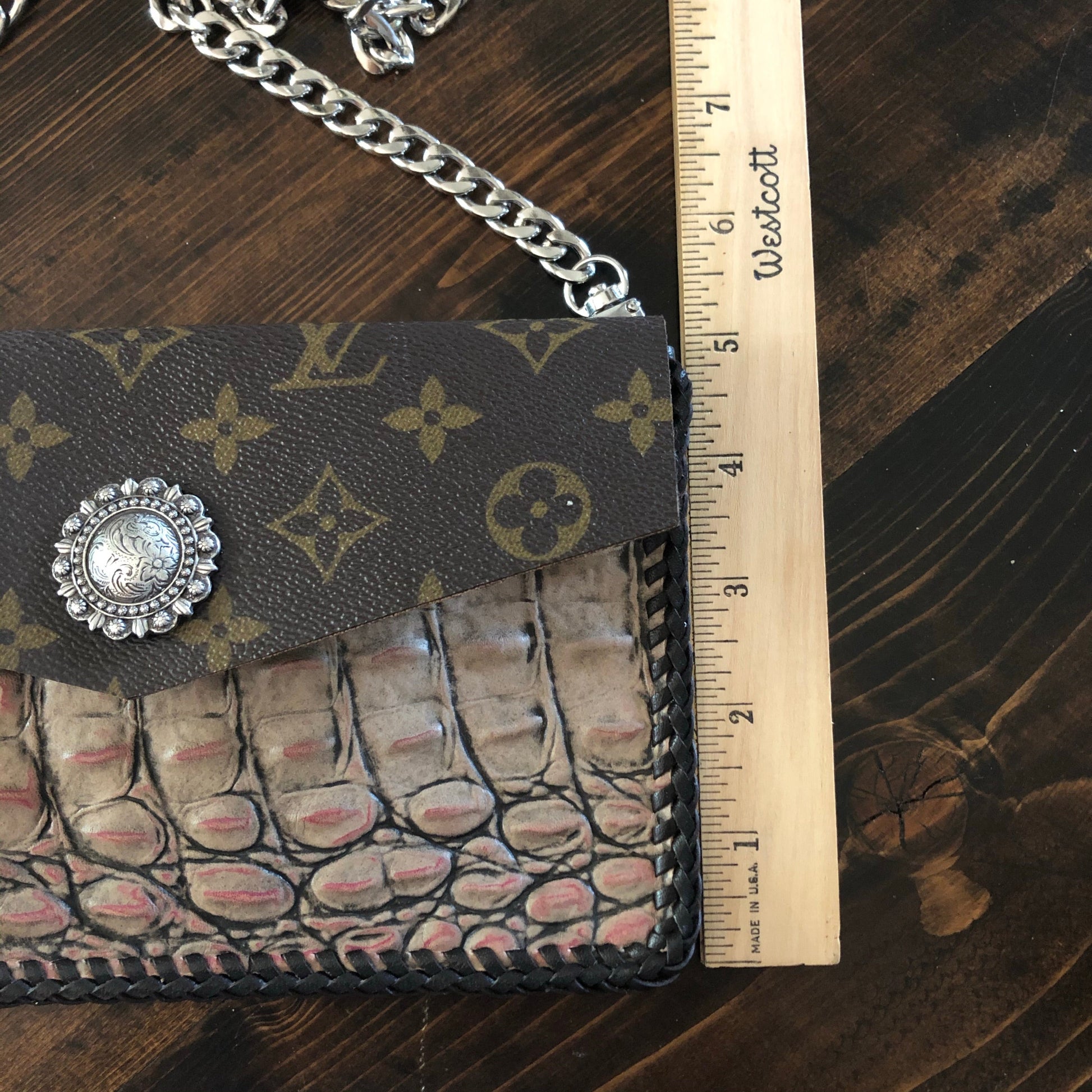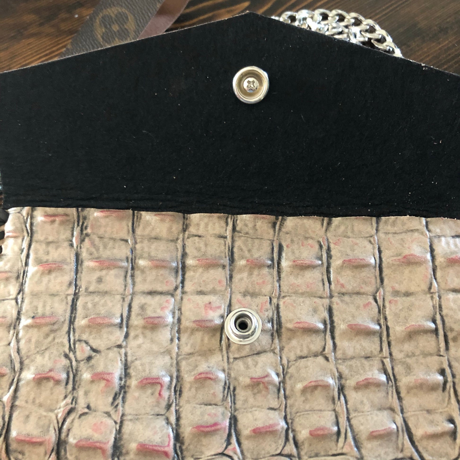 As always, an Louis Vuitton bag was used to create this beautiful little bag. The LV is lined in felt, which protects it and gives it a nice feel. The front is a gorgeous tan/blush-colored gator-embossed leather! It is STUNNING!!! The outside edge has been stitched by hand with brown leather lace. There are two silver D-rings stitched into the sides on the back that will hold the silver crossbody chain (47"), or the click-n-go wristlet. The wristlet has the quatrefoil print. Perfect for your keys OR your wrist!! Or, take both off and turn this into a beautiful clutch! A silverPrestige Totes style concho snap completes this look.